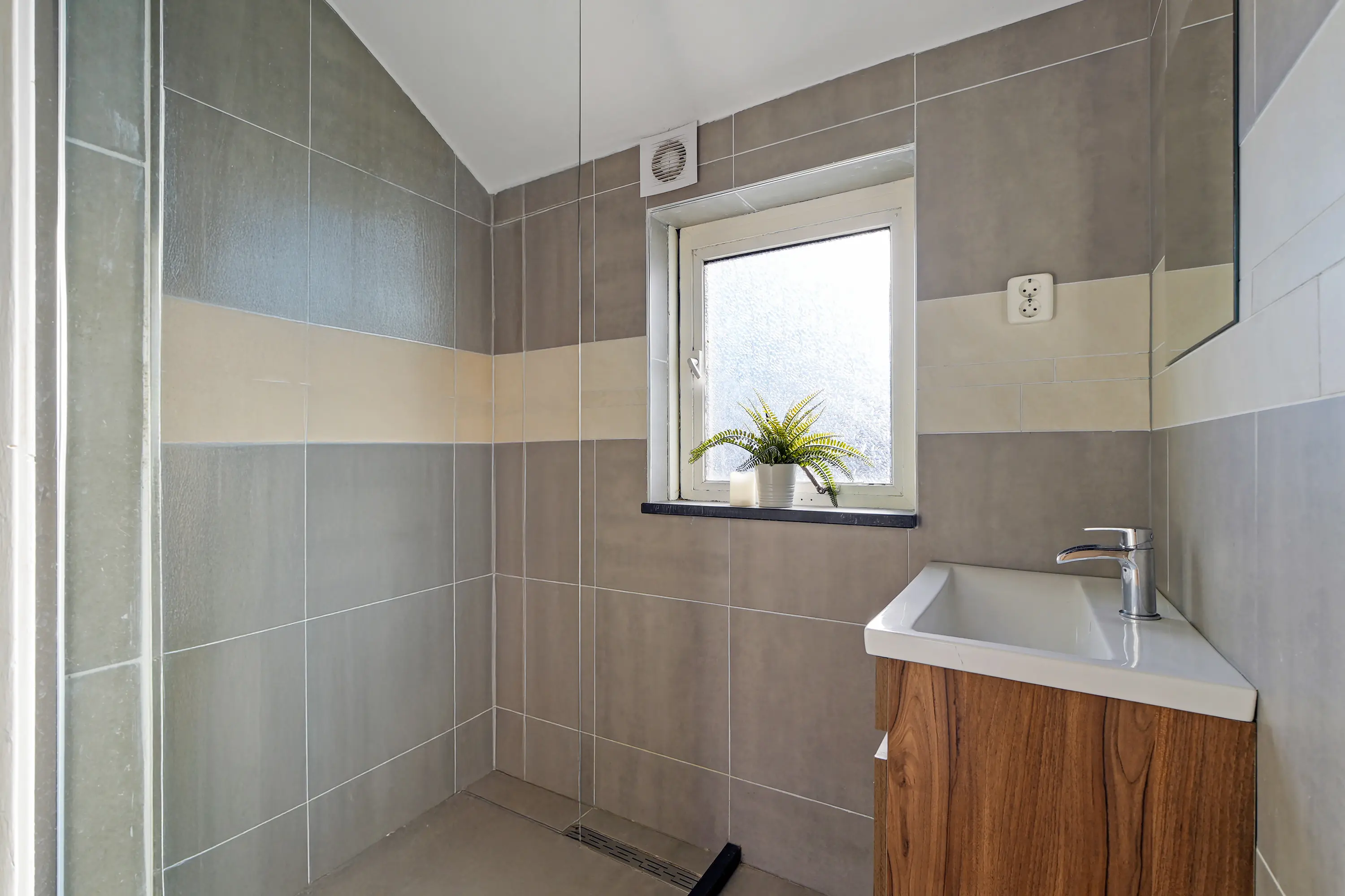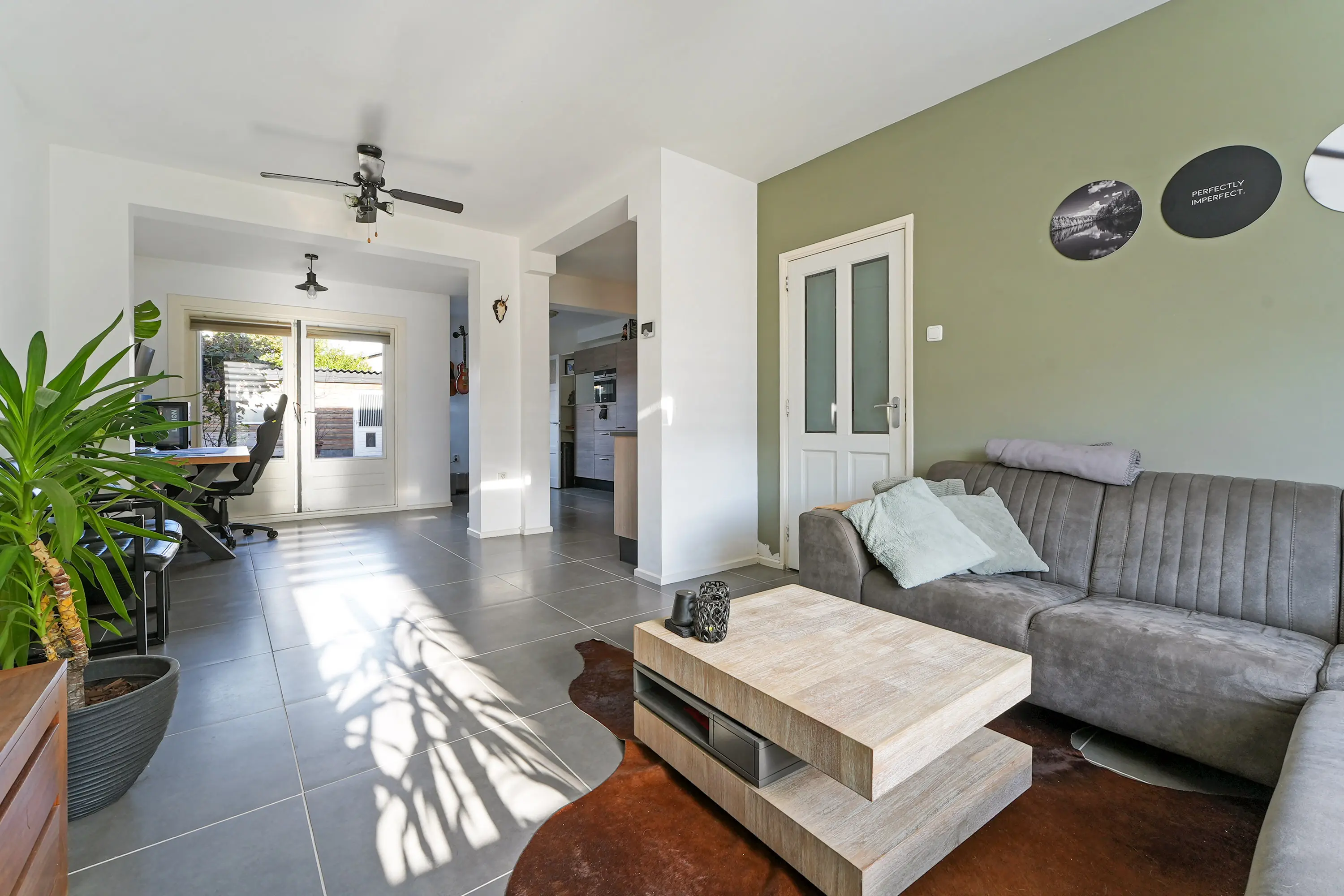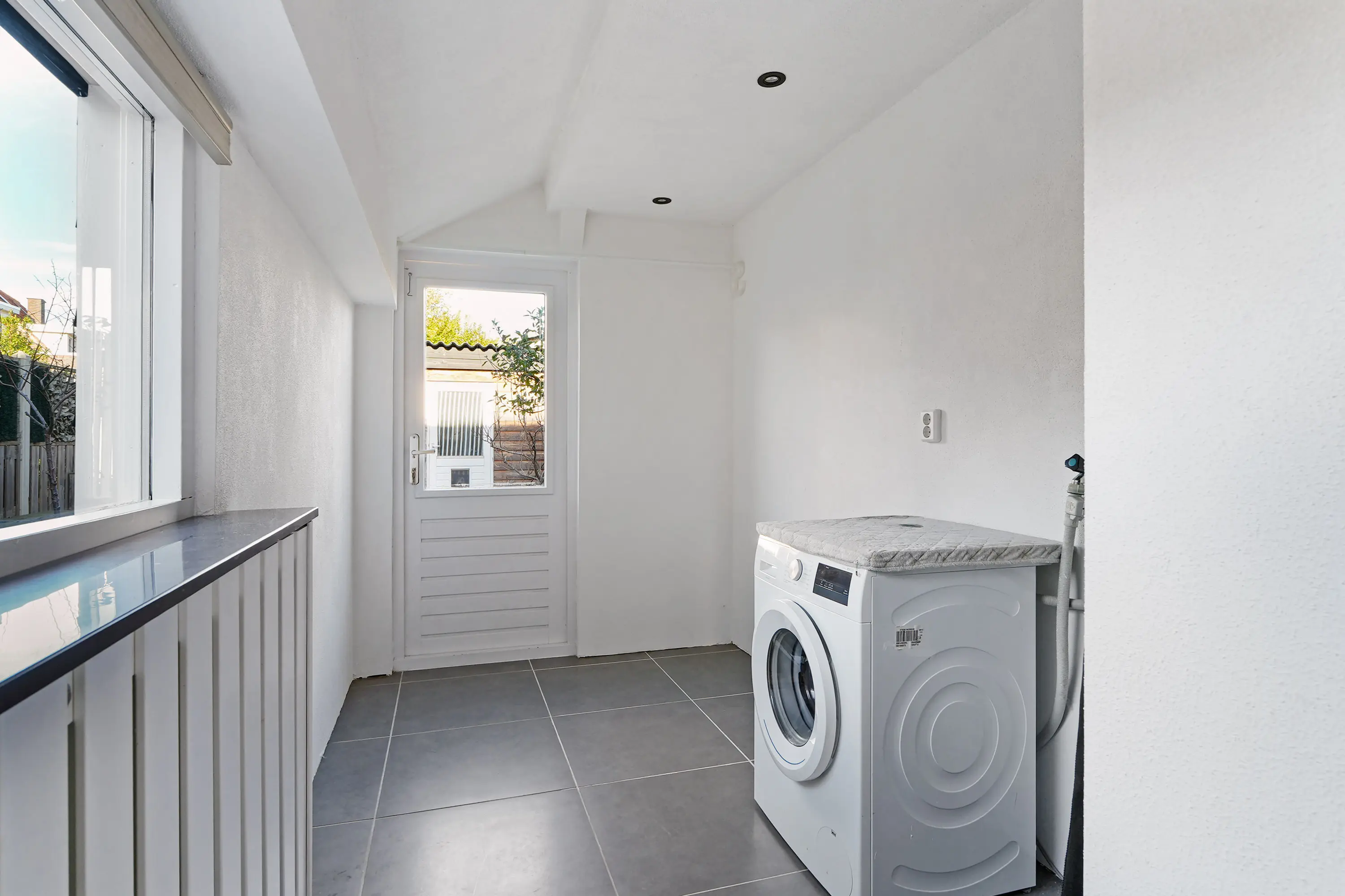 U betreedt de woning via de hal met meterkast, trapopgang en toilet. De woonkamer bevindt zich aan de voorzijde en biedt dankzij de grote raampartijen veel licht en leefruimte. De moderne open keuken (2017) is uitgerust met diverse inbouwapparaten en heeft dubbele openslaande deuren naar de tuin. Aangrenzend bevindt zich de bijkeuken met witgoedaansluitingen en cv-opstelling. Deze ruimte is in 2021 vernieuwd, geïsoleerd en keurig afgewerkt.