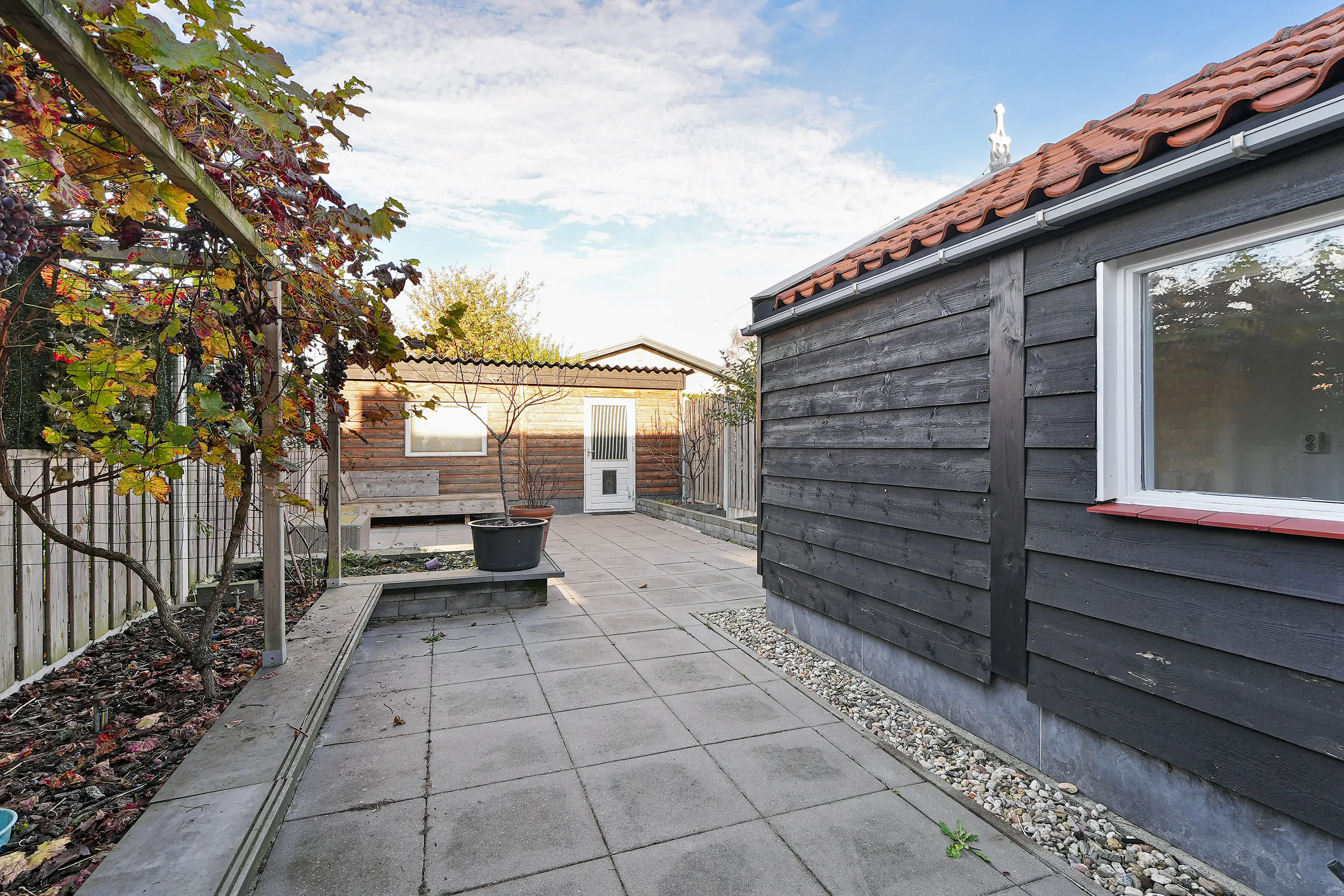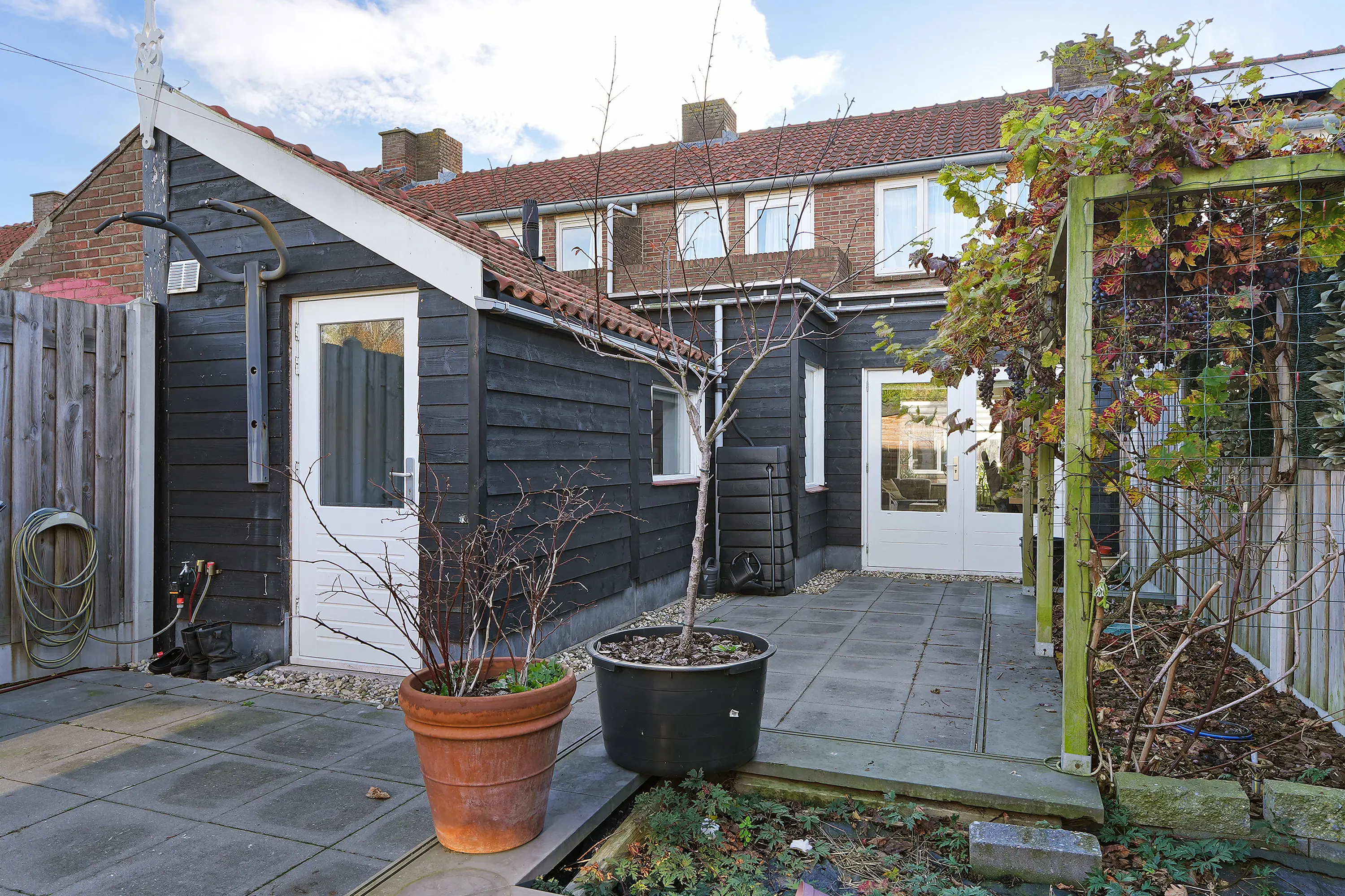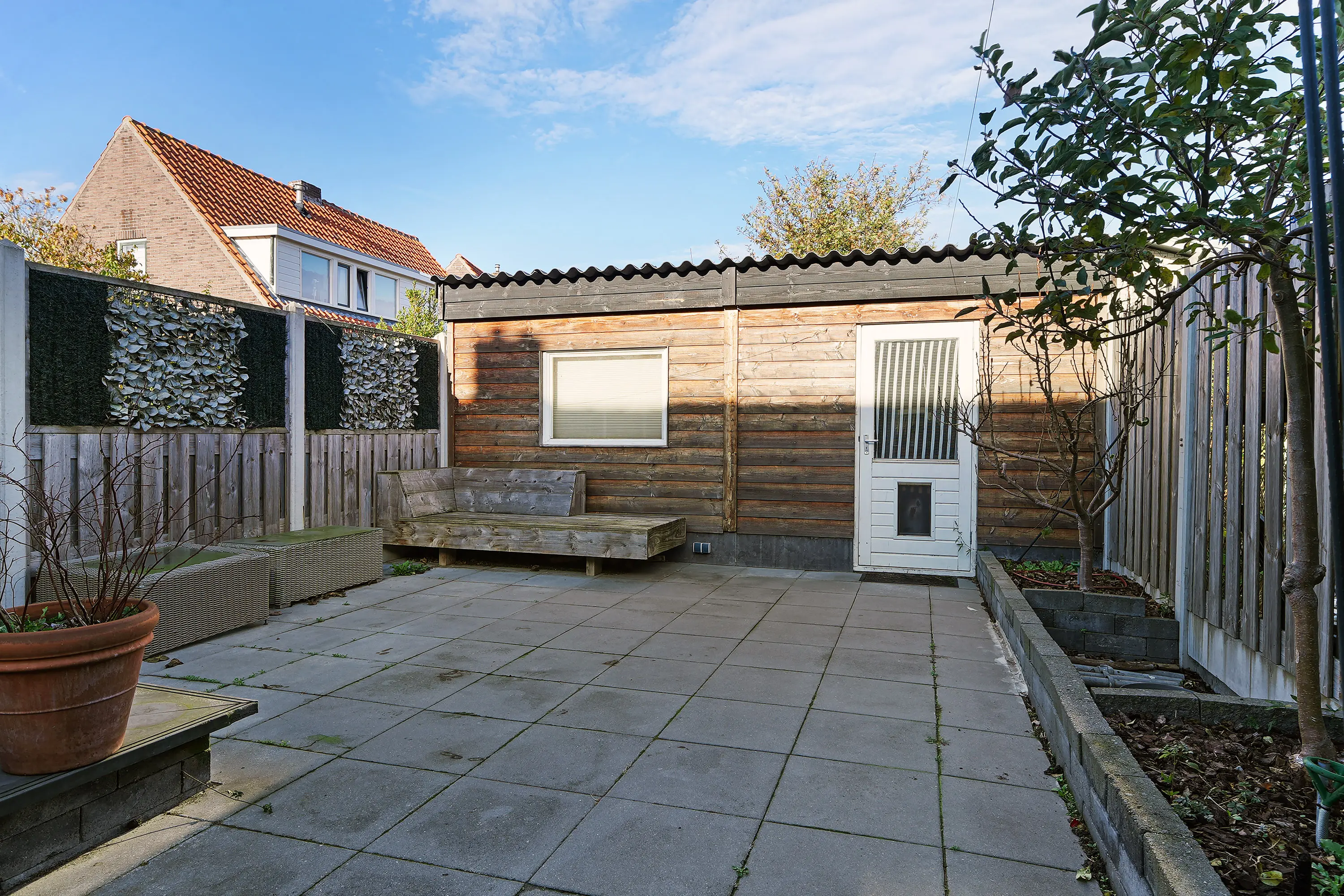 De ruime achtertuin is fraai aangelegd met groene borders, een appel- en perenboom en een druivenplant. Hier kunt u heerlijk genieten van de middag- en avondzon. Achterin bevindt zich een vrijstaande schuur (2018), voorzien van elektra en een brede doorgang naar de achterzijde, ideaal voor het stallen van een scooter of motor. Daarnaast leent de schuur zich uitstekend als hobbyruimte.