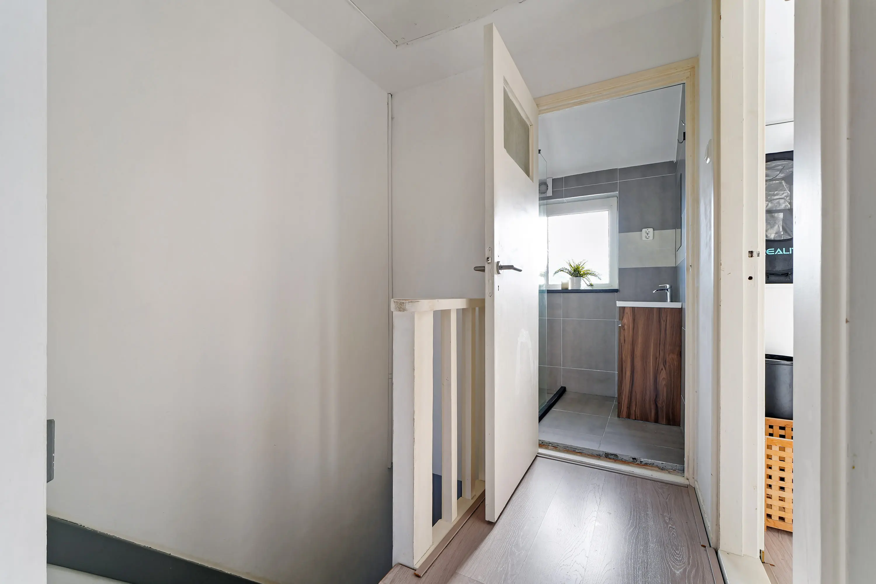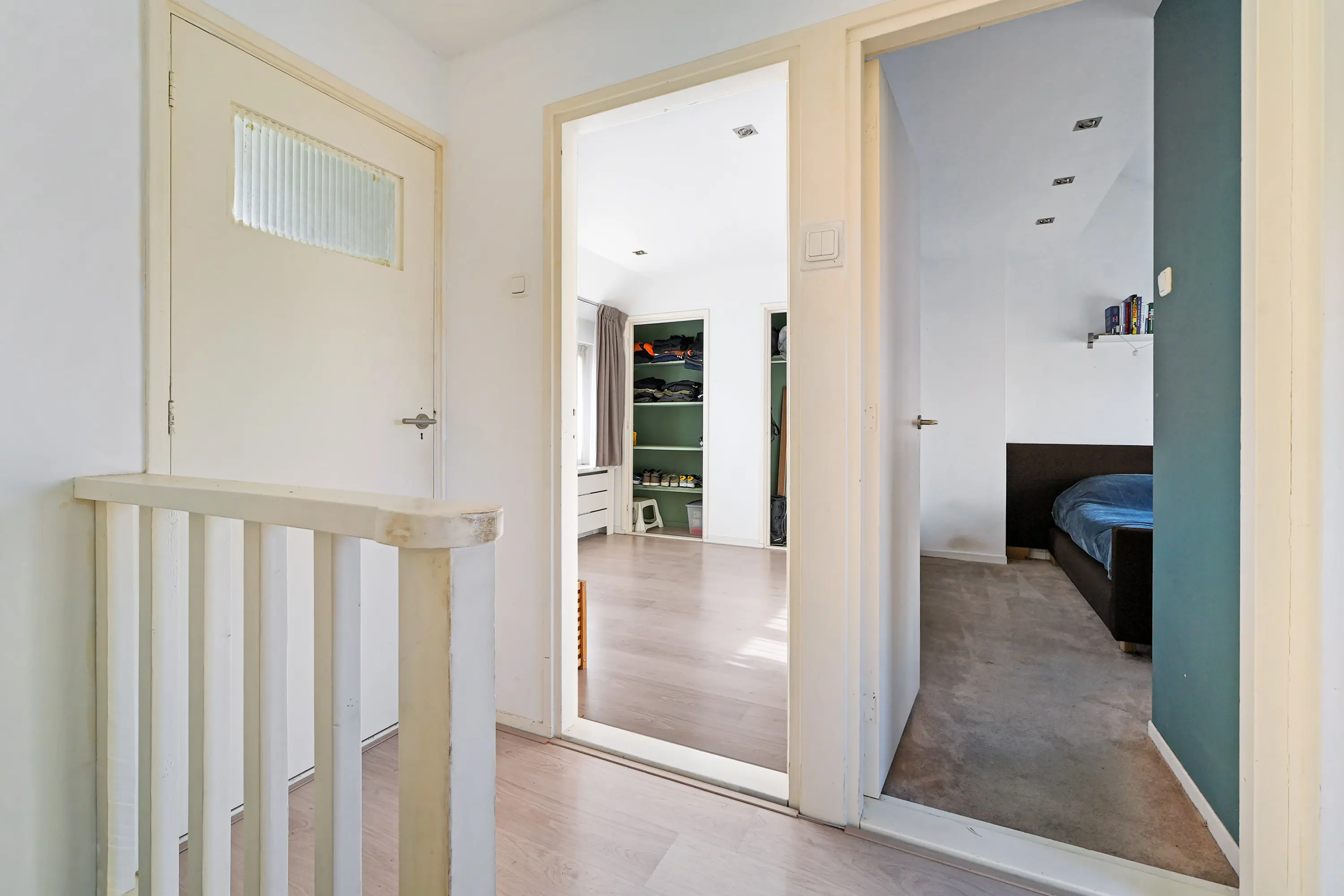 Op de eerste verdieping bevinden zich vier vertrekken: drie slaapkamers en een badkamer. Twee slaapkamers liggen aan de achterzijde, de derde en de badkamer aan de voorzijde. De badkamer beschikt over een douche, wastafel en vloerverwarming. Via de overloop is met een vlizotrap de bergzolder bereikbaar, handig voor extra bergruimte.