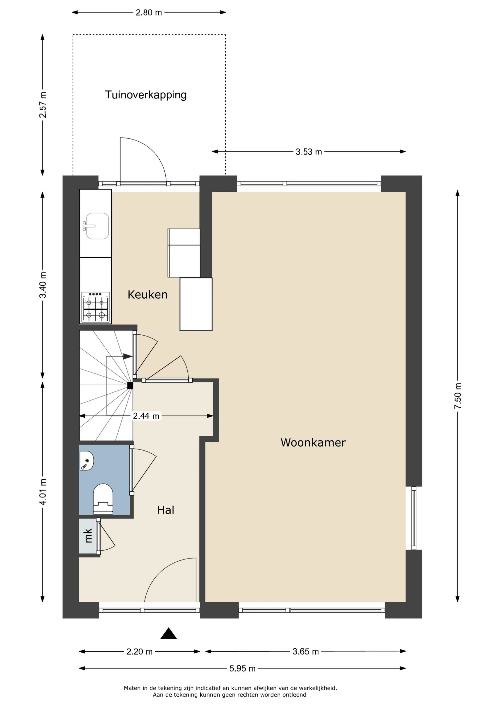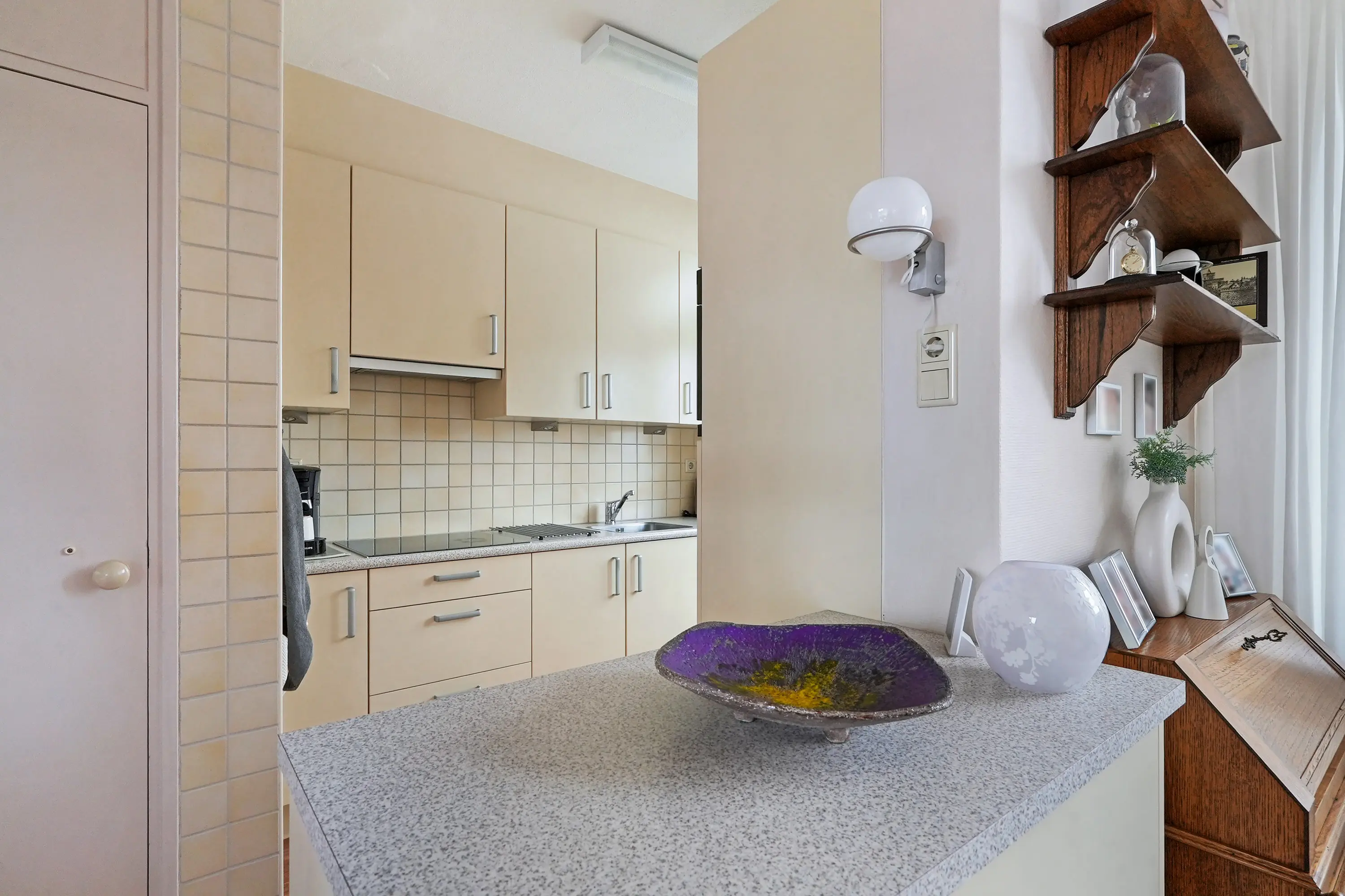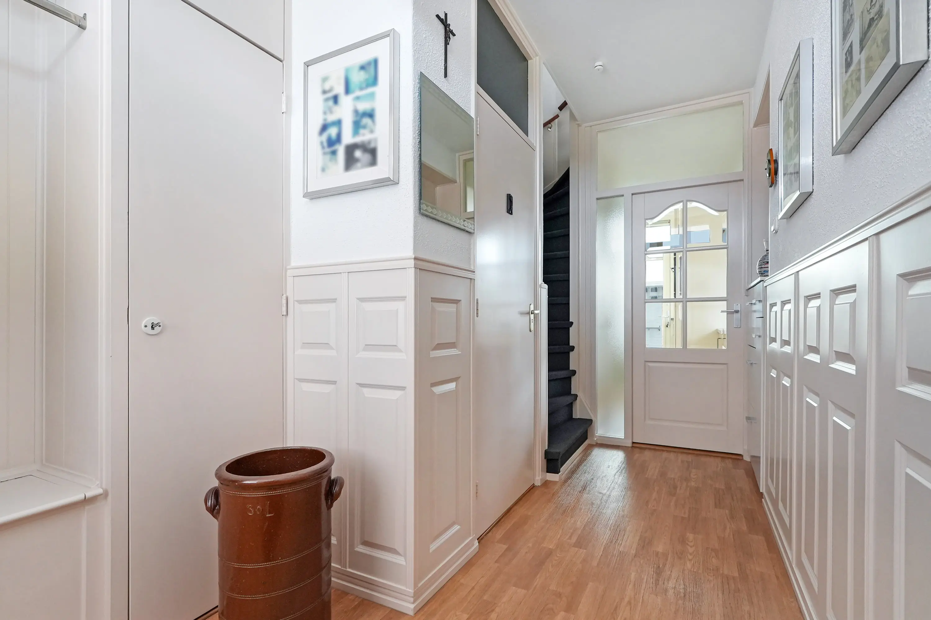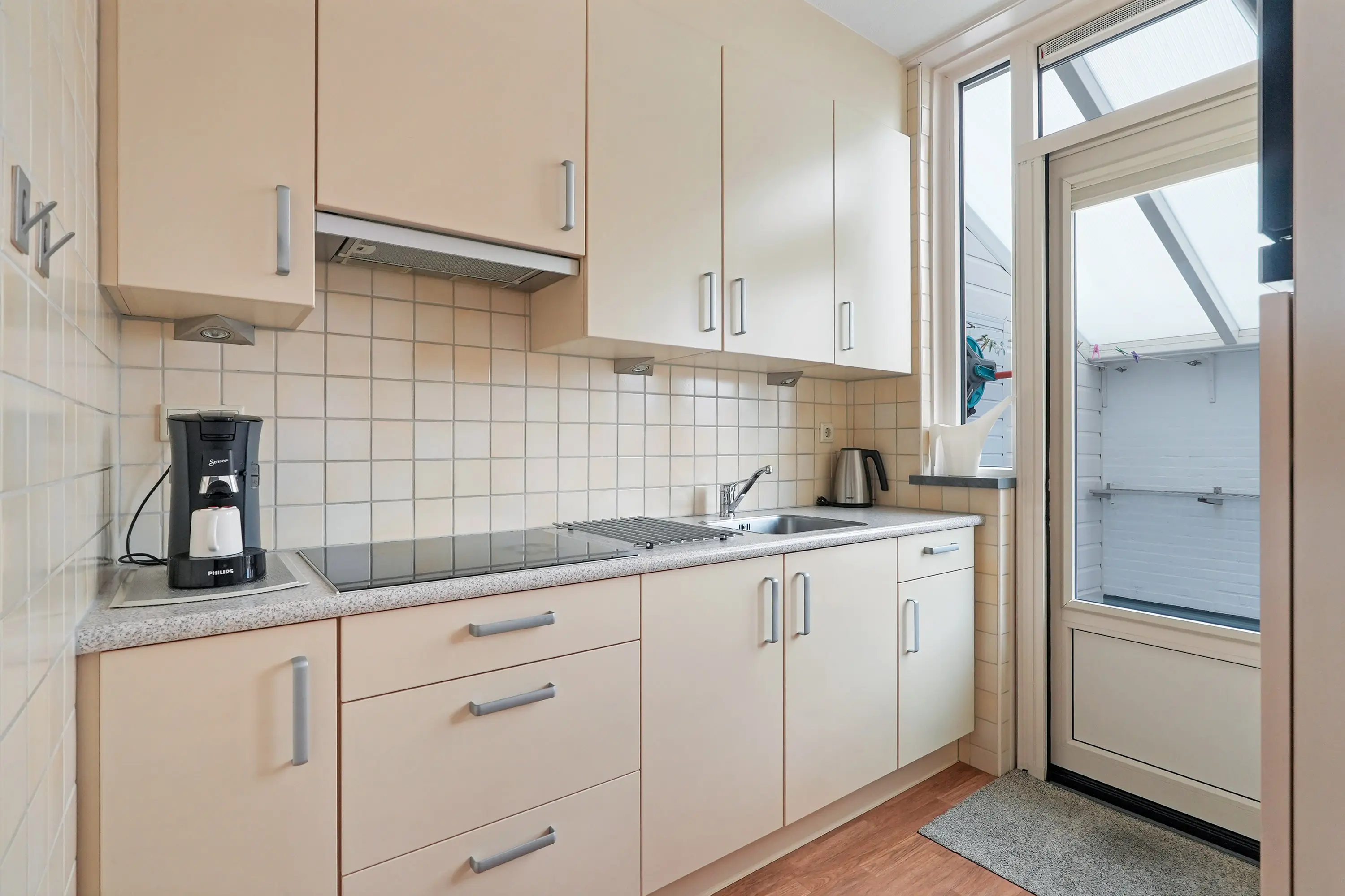 U betreedt de woning via de ruime hal, waar zich de meterkast (vernieuwd, 7 groepen), het toilet, de trapopgang en de trapkast bevinden. Vanuit de hal bereikt u de halfopen keuken, voorzien van diverse inbouwapparatuur zoals een combi-oven, koelkast, inductiekookplaat, afzuigkap en close-in boiler. Vanuit de keuken is er toegang tot de achtertuin.