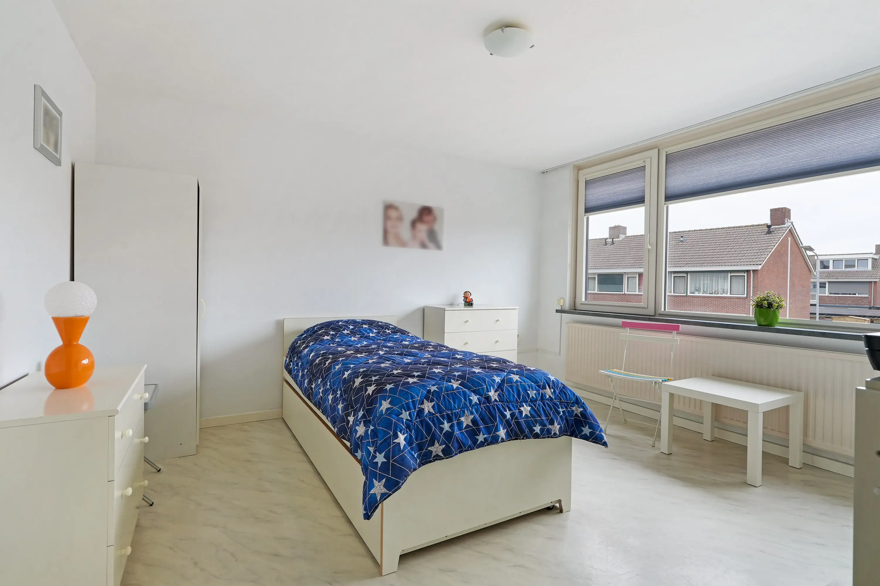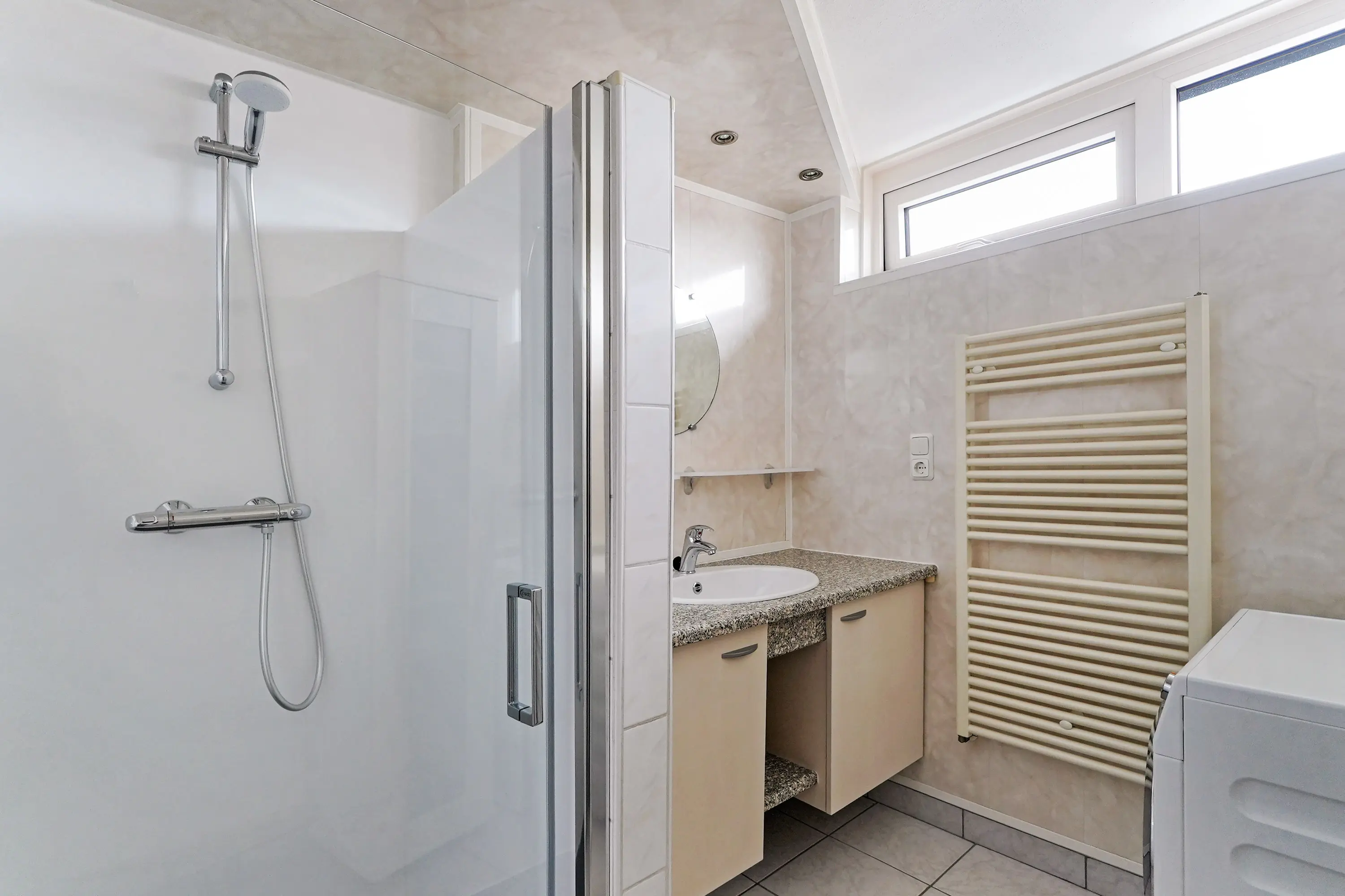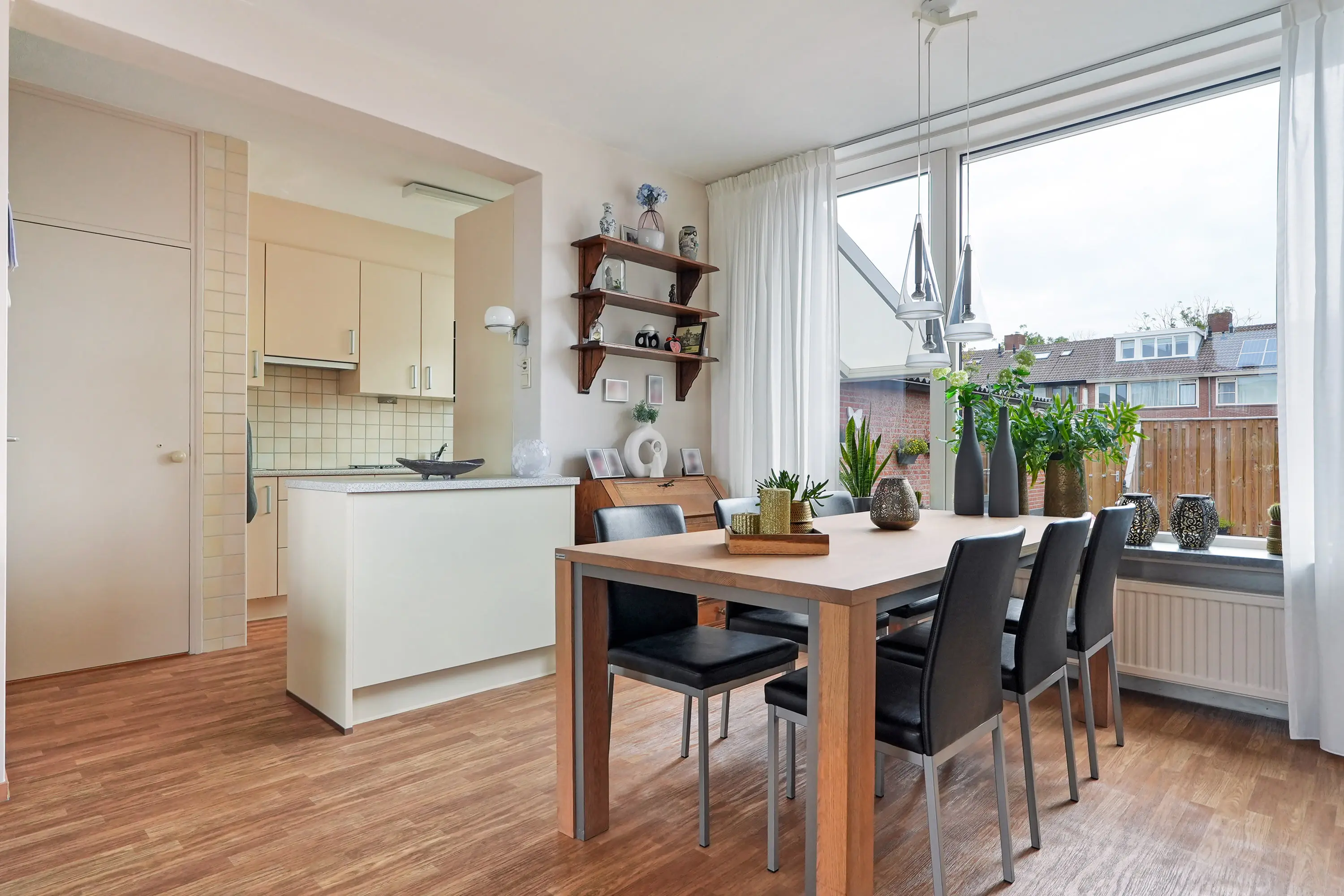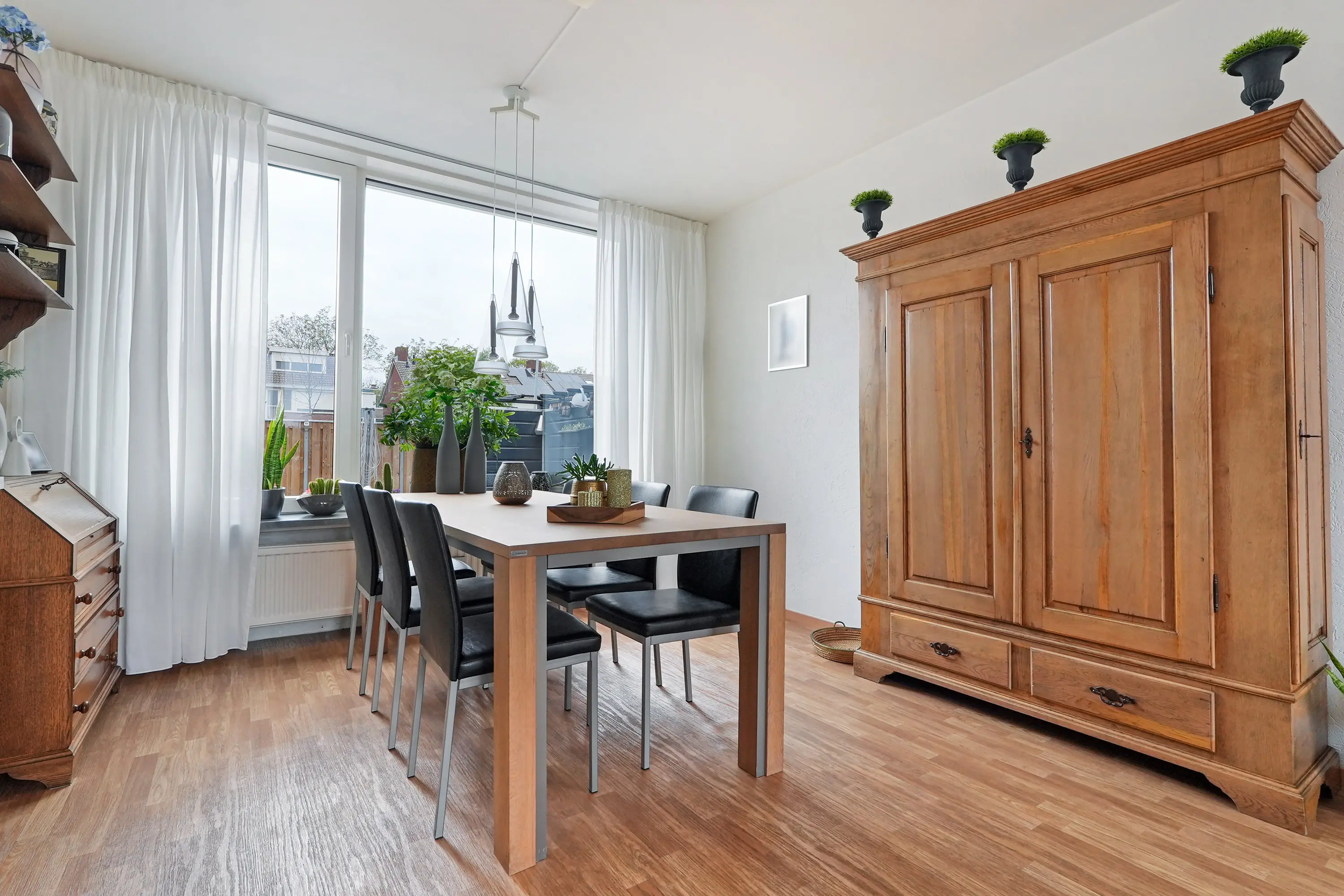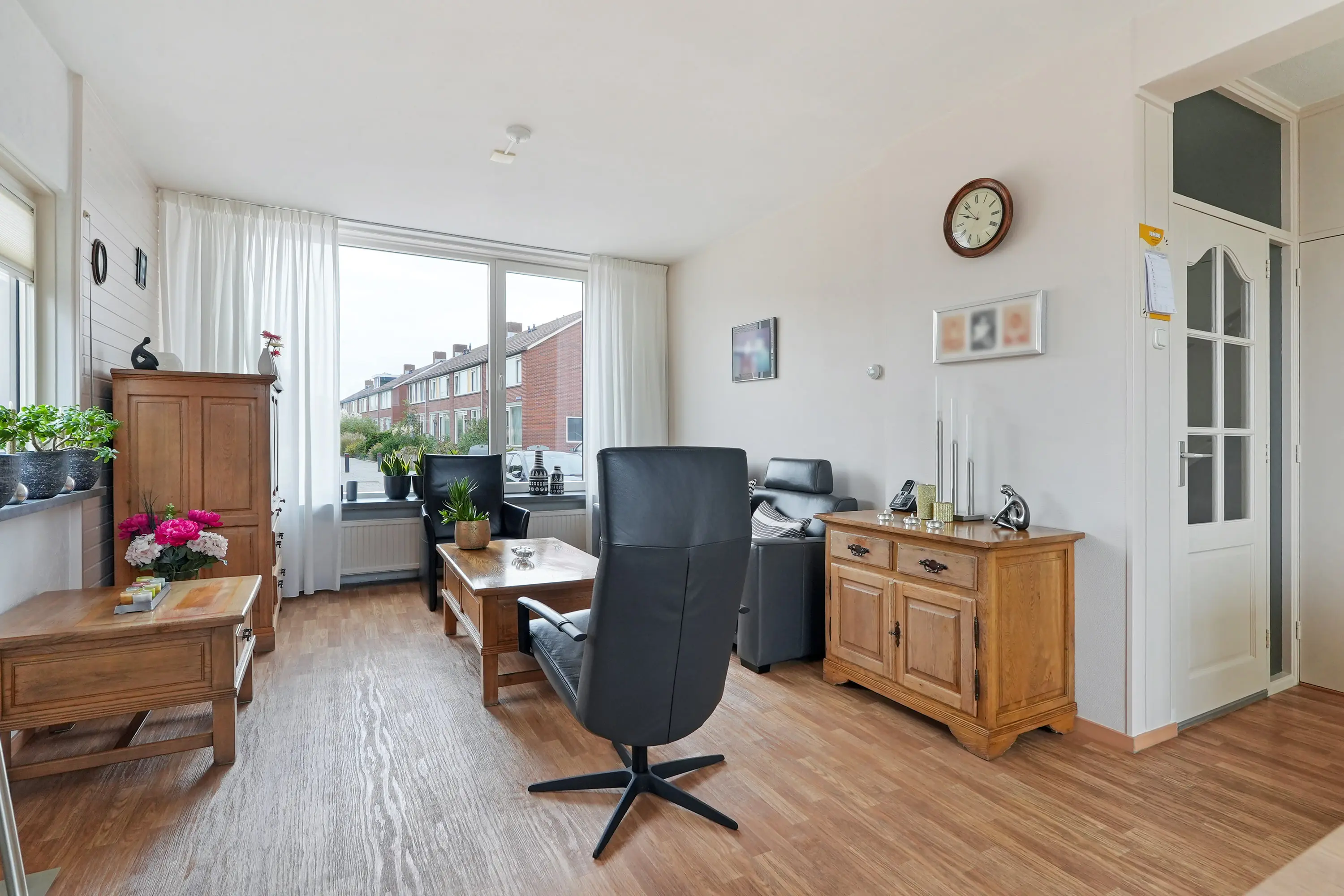 De woonkamer is ruim opgezet en licht dankzij de grote raampartijen, inclusief een zijraam. Aan de voorzijde is een elektrisch bedienbaar zonnescherm aanwezig en aan de achterzijde een rolluik.