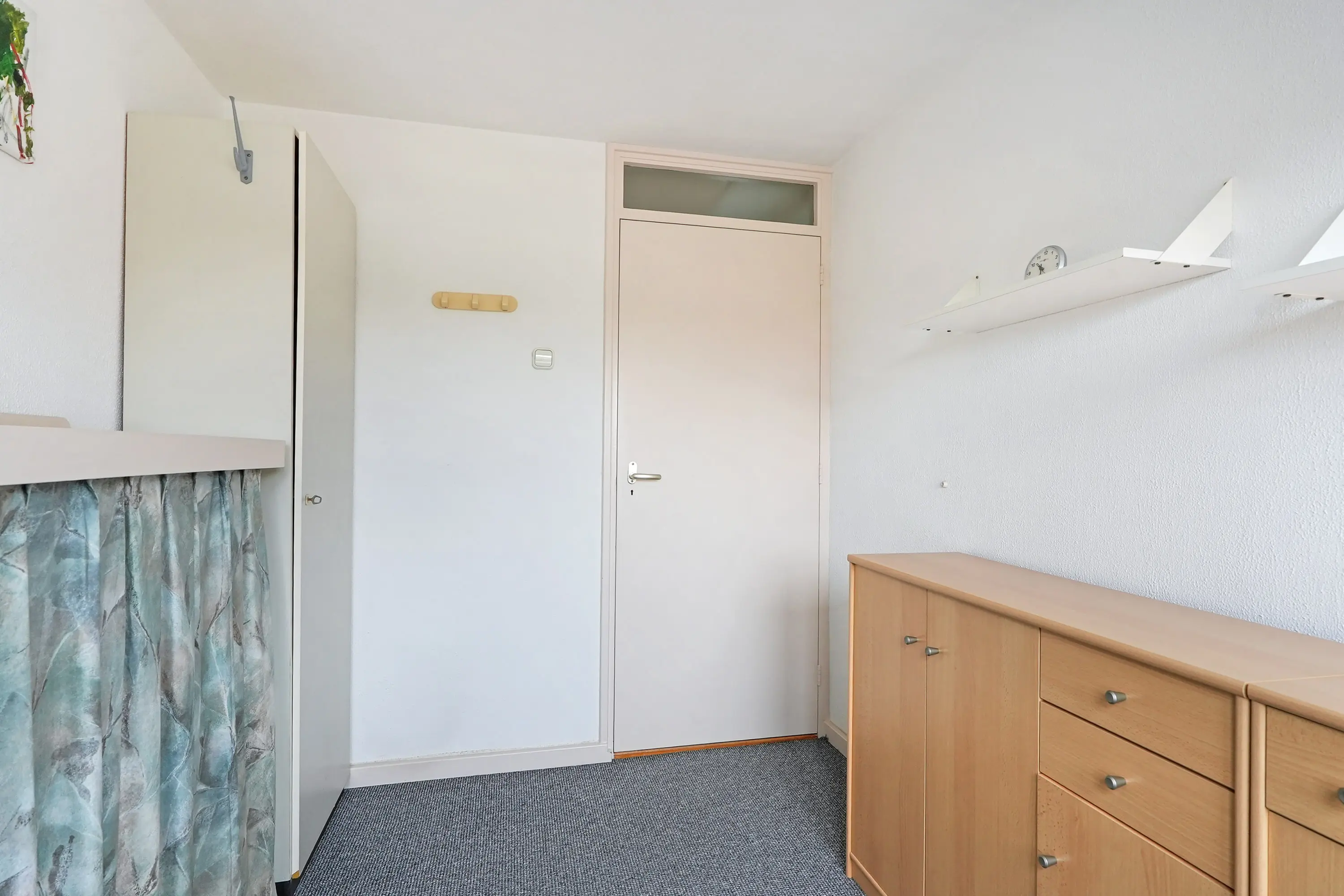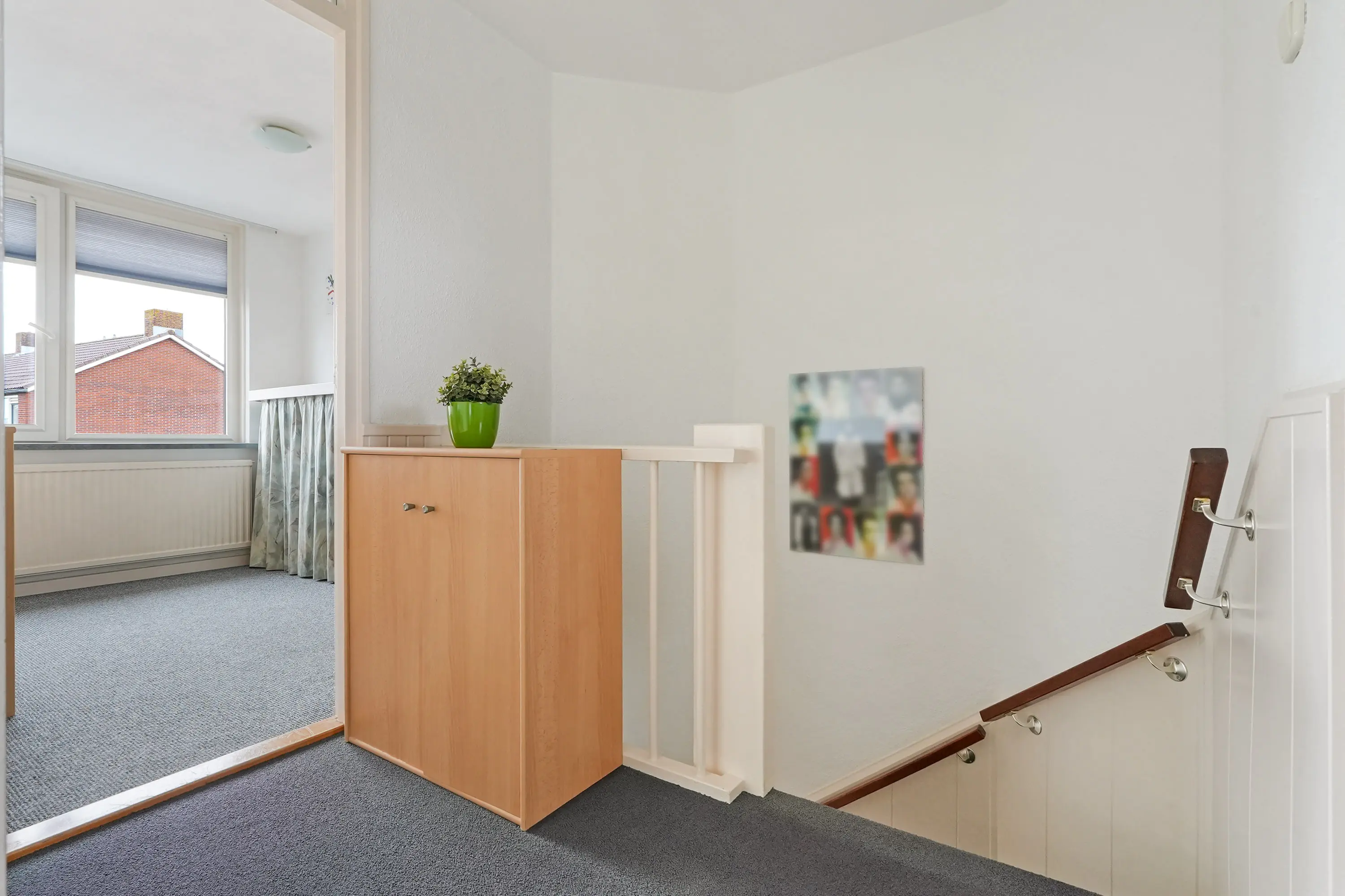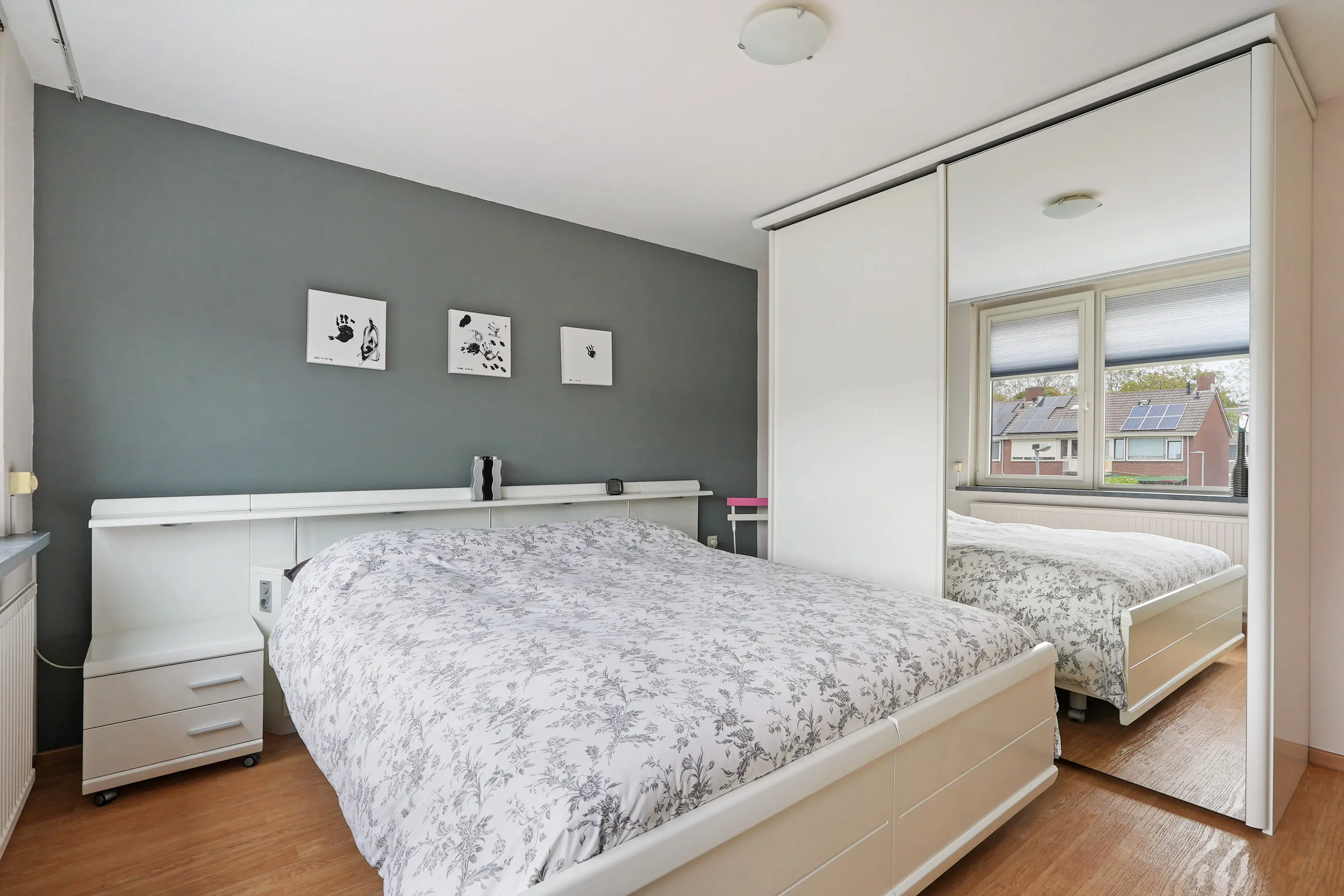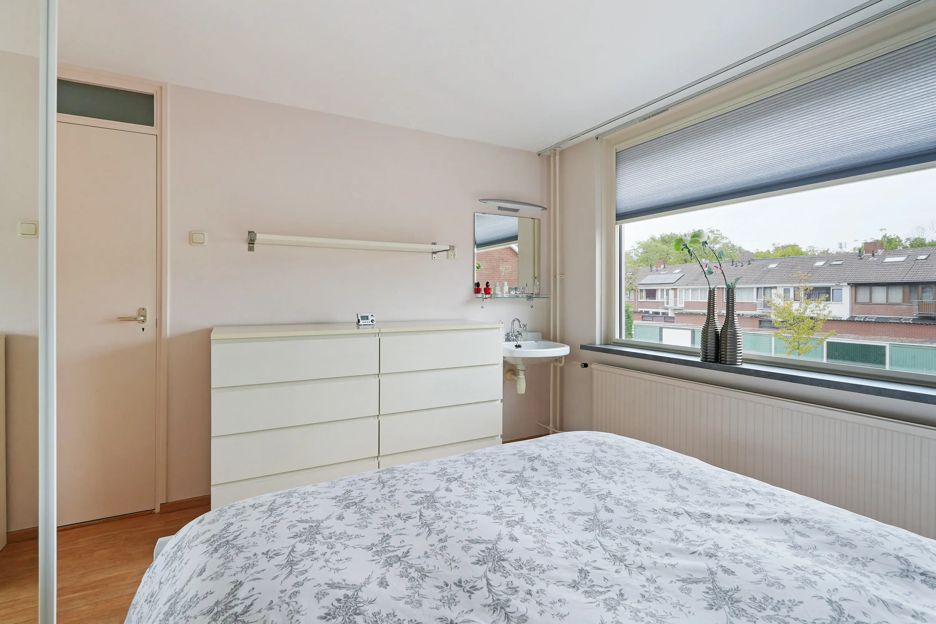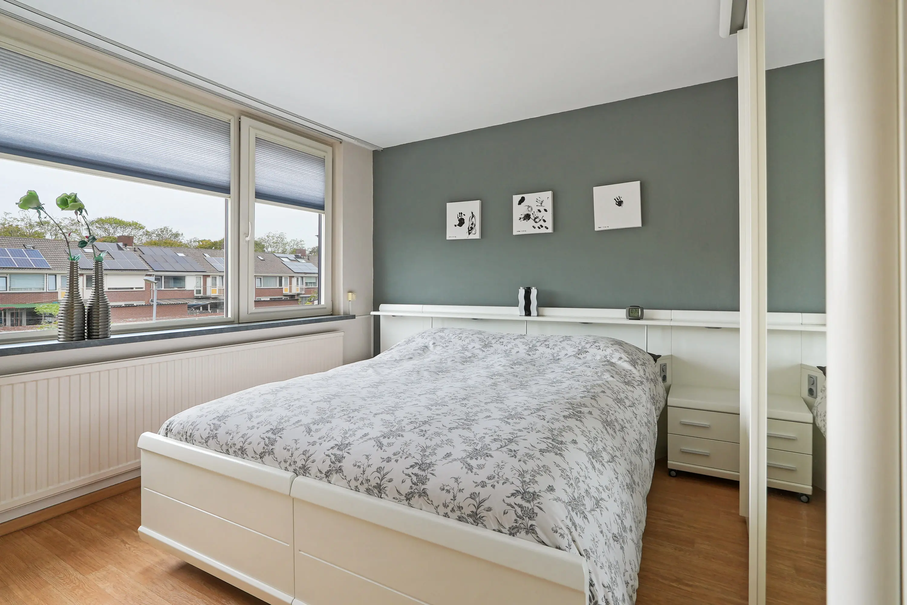 Aan de achterzijde grenst de woning aan een groenstrook met daarachter garageboxen. Aan de voorzijde is volop parkeergelegenheid aanwezig en geniet u vanuit de woonkamer van een fraai uitzicht over het met bomen omzoomde laantje.
