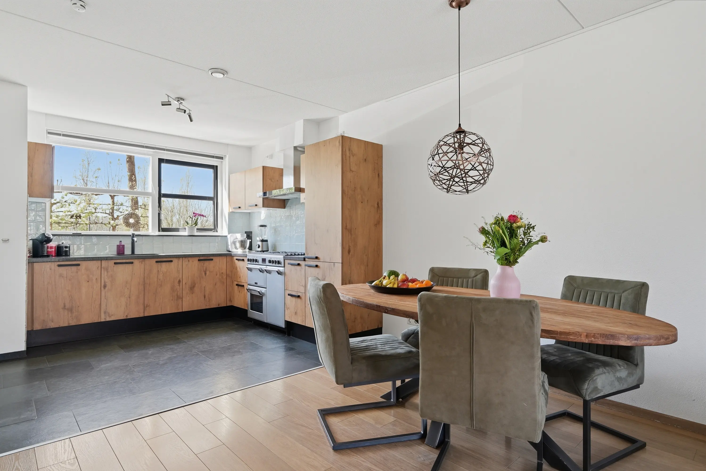 Entree, hal met meterkast, garderobe, toilet en doorgang naar de ruime woonkamer. Bij binnenkomst in de woonkamer treft u de keuken in combinatie met de eethoek aan de voorzijde en aan de tuinzijde de lichte tuingerichte zithoek. Aan de tuinzijde grote raampartijen waardoor u geniet van een ontzettend fijne lichtinval. Vanuit de keuken, die zich aan de straatzijde bevindt, heeft u een fantastisch vrij uitzicht op groen. De keuken is uitgevoerd in een ruime sfeervolle hoekopstelling, met houtlook kastfronten en een donker composieten werkblad. Verder is de keuken uiteraard voorzien van alle wenselijke inbouwapparatuur en het Stoves-fornuis maakt het plaatje compleet. Tussen de zithoek en de woonkeuken bevindt zich een praktische bergkast en de trapopgang naar de 1e verdieping. Vanuit de woonkamer bereikt u de diepe tuin.