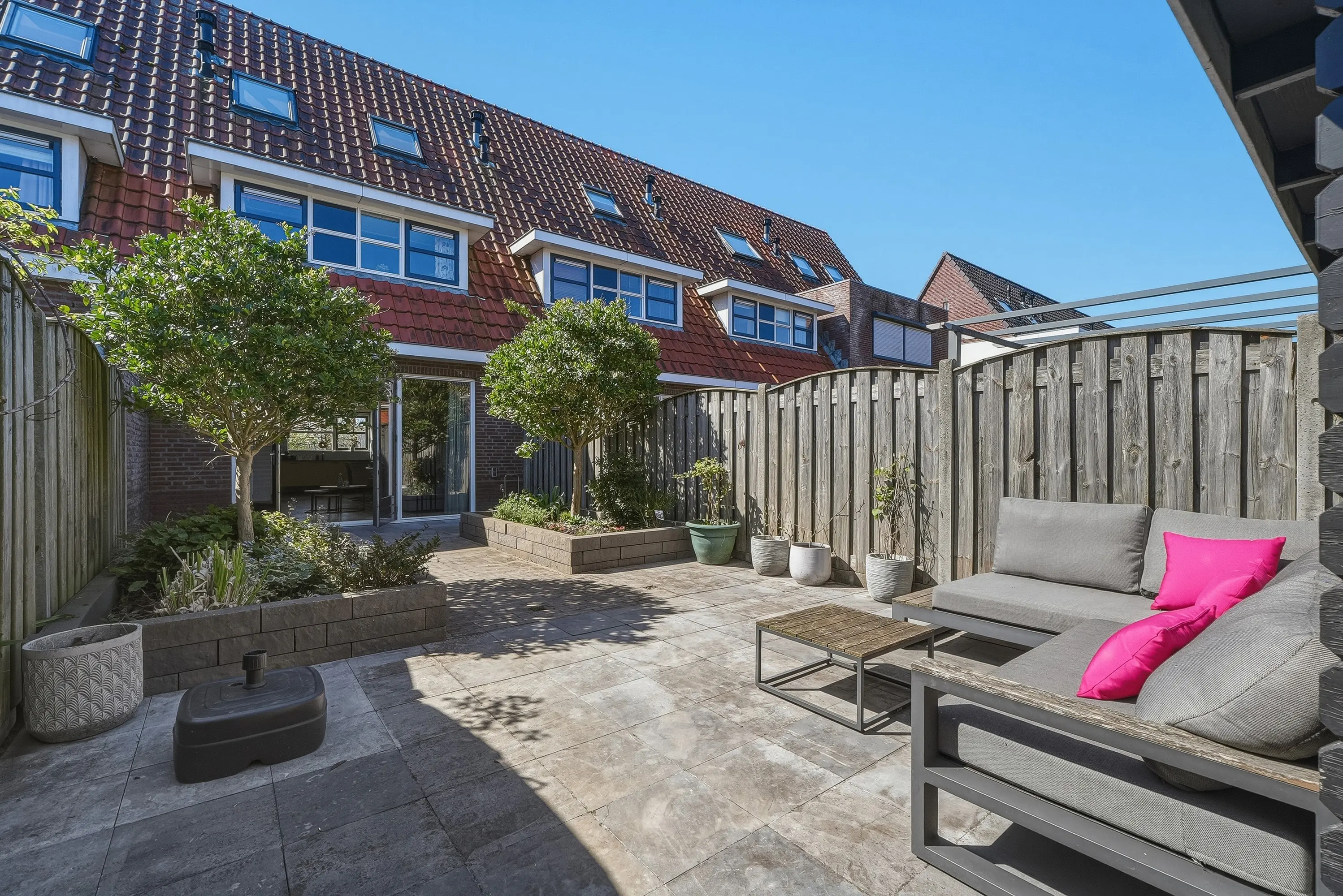 De diepe tuin is keurig aangelegd met aan weerszijden groenborders en voorzien van mooie sierbestrating. Doordat de achtergelegen woningen eveneens over diepe tuinen beschikken, ervaart u een fijne mate van privacy. Achter in de tuin bevindt zich een ruime berging voor bijvoorbeeld het stallen van de fietsen of om lekker te hobbyen. Naast de berging bevindt zich de vrije achterom.