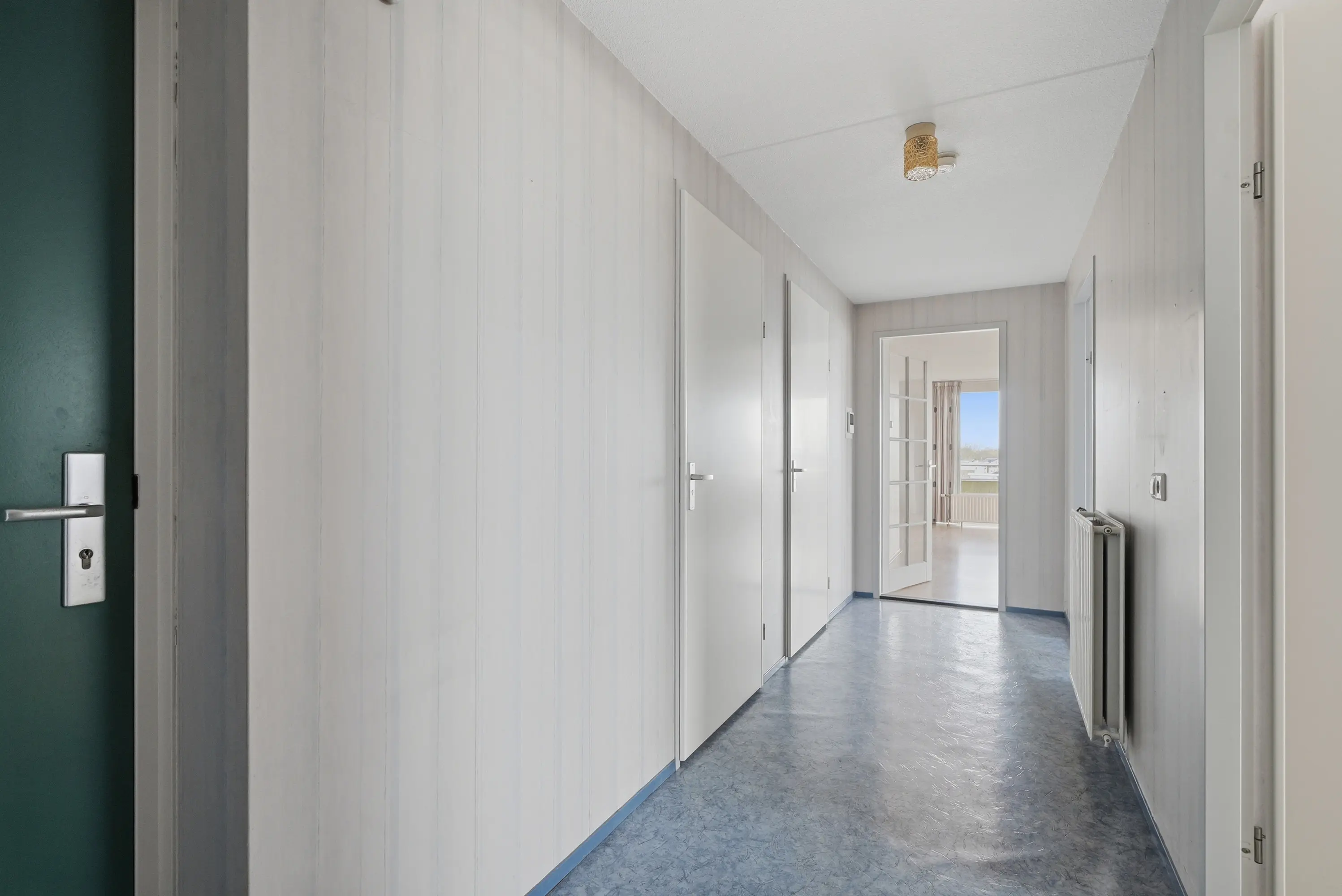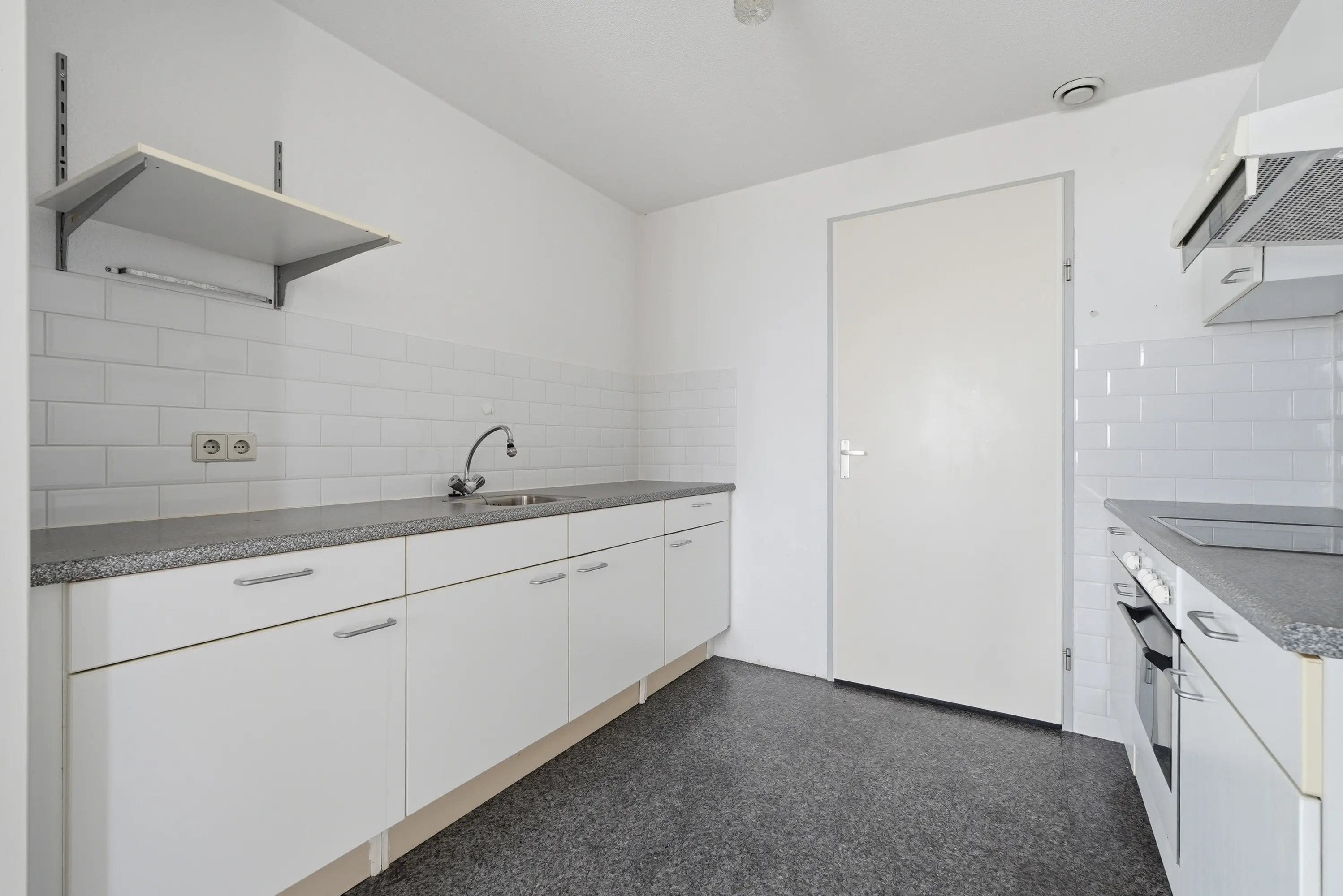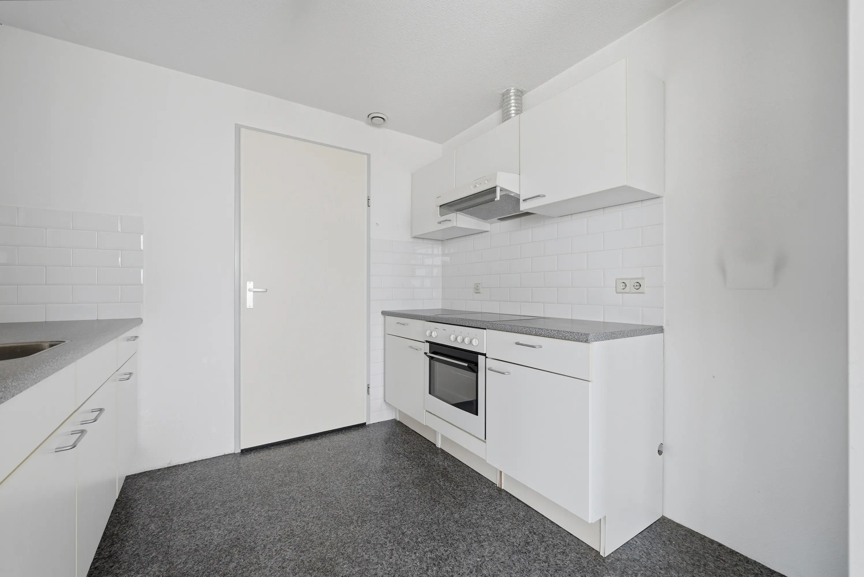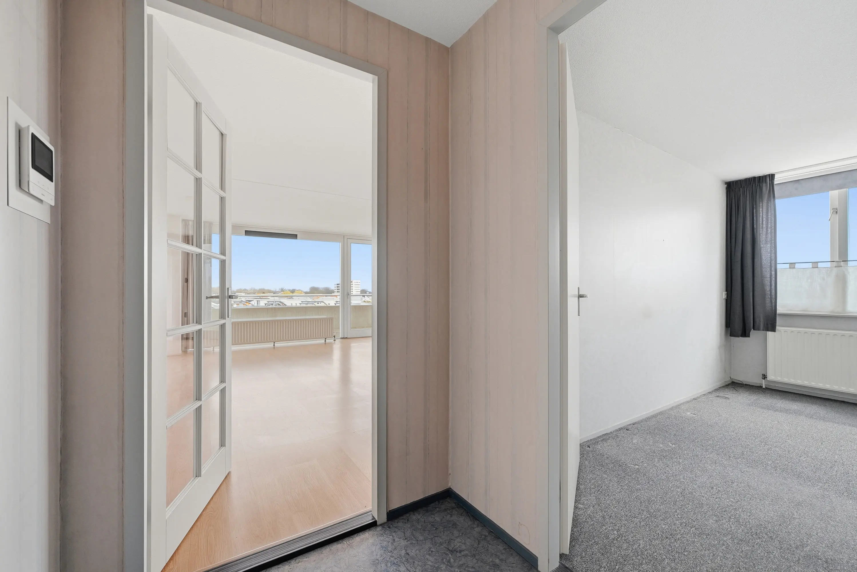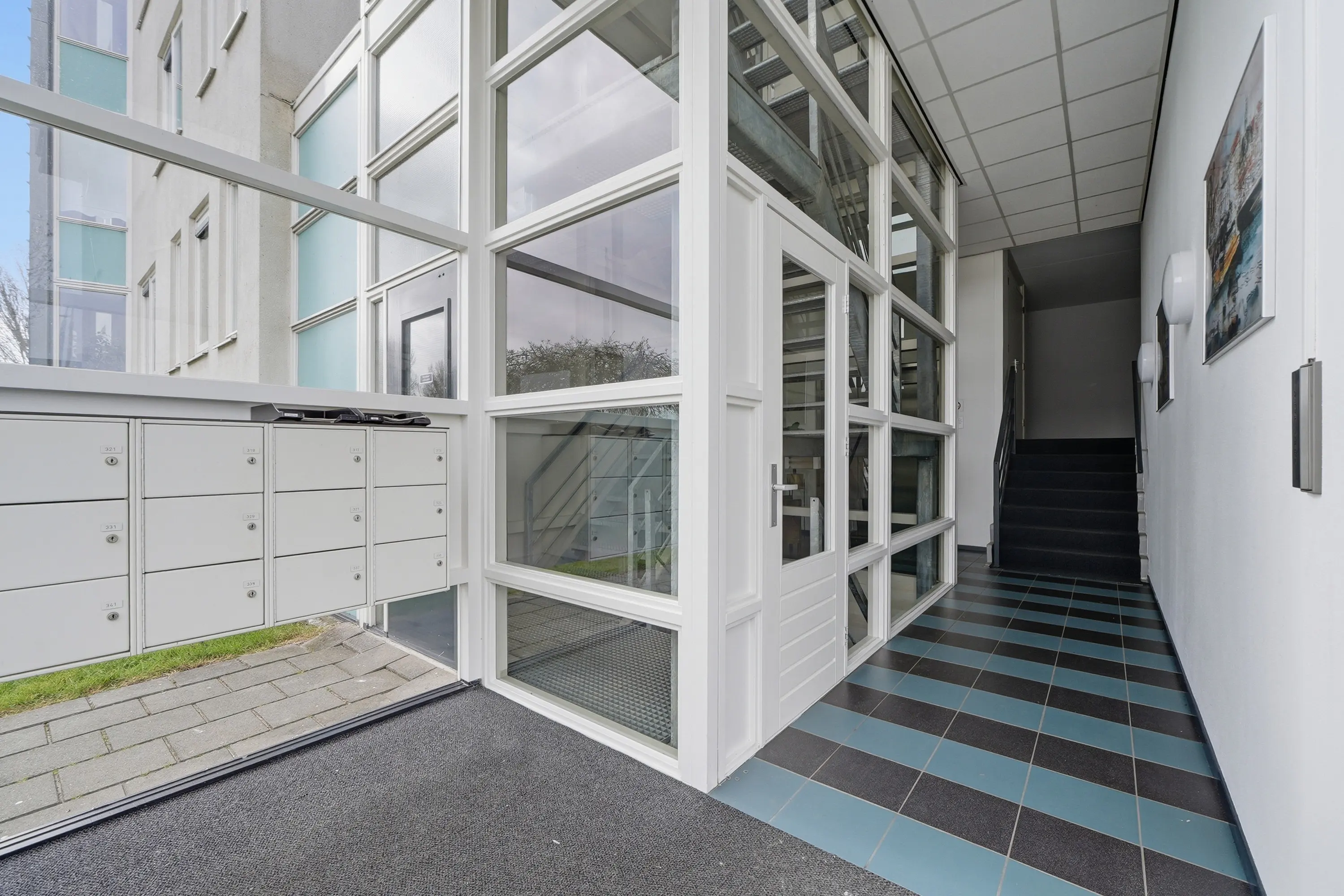 Meterkast, eigen entree en hal met videofooninstallatie, ruime en lichte woonkamer met schuifpui naar het grote balkon, nette open keuken met inbouwapparatuur en aansluitend een praktische bijkeuken/berging met wasmachineaansluiting. Via de hal bereik je de twee mooie slaapkamers, separaat toilet met fonteintje en nette, volledig betegelde badkamer voorzien van douchecabine en wastafel.