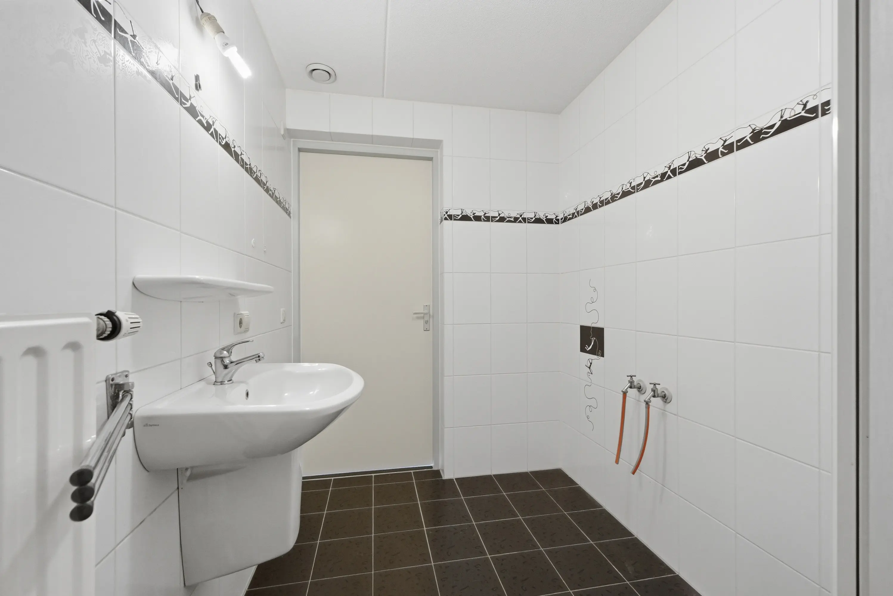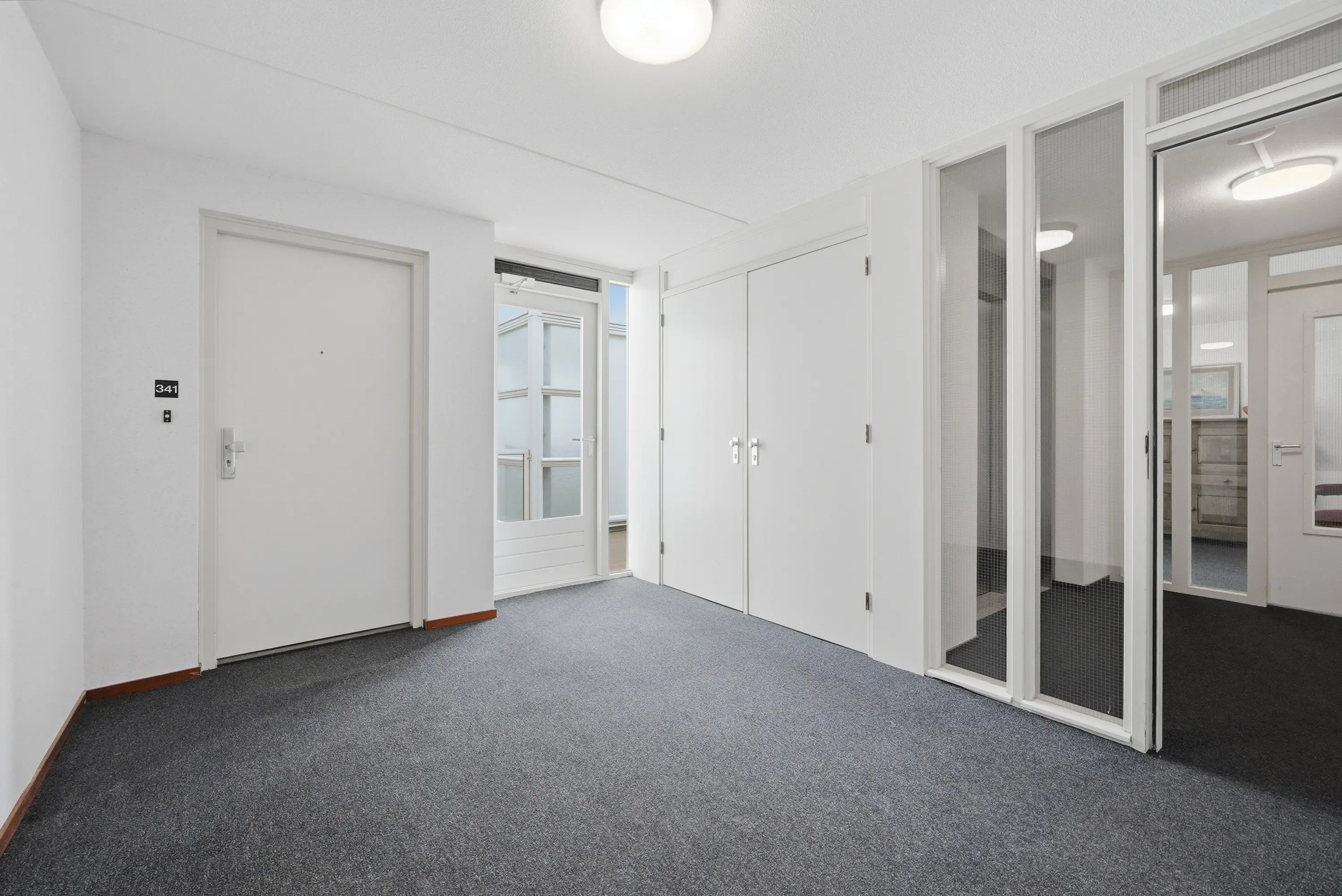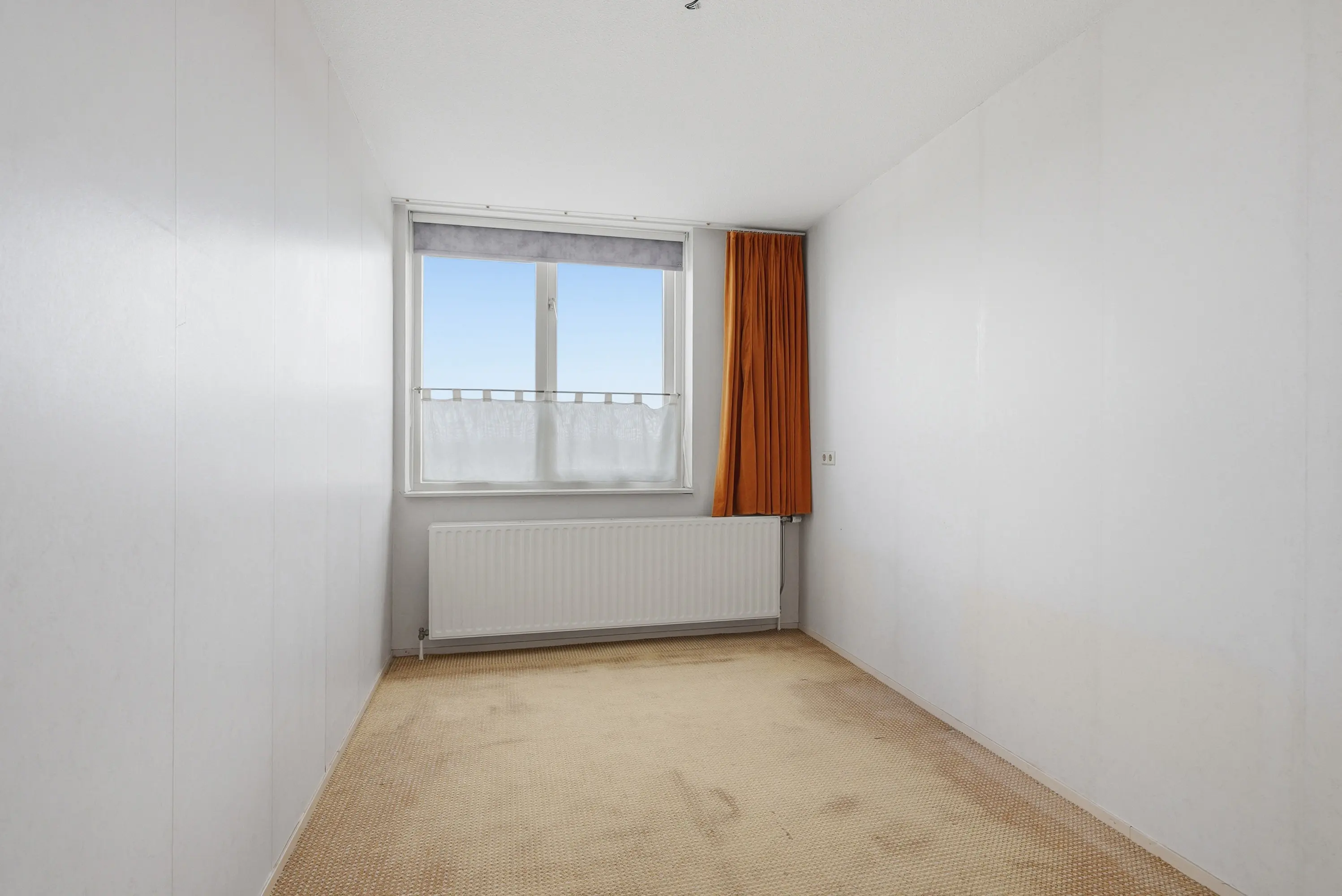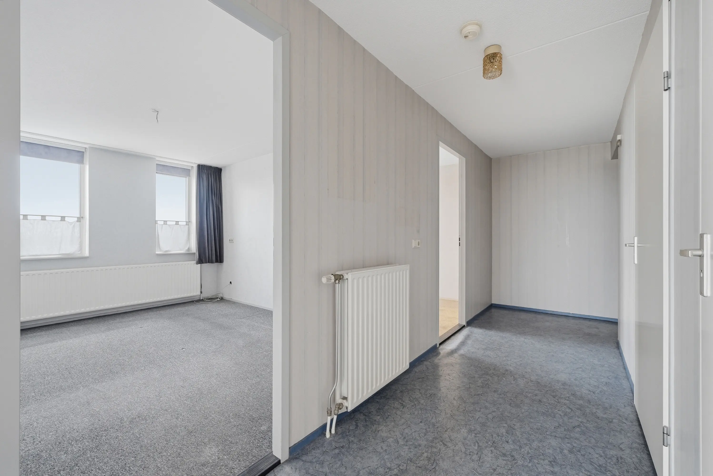 Meterkast, eigen entree en hal met videofooninstallatie, ruime en lichte woonkamer met schuifpui naar het grote balkon, nette open keuken met inbouwapparatuur en aansluitend een praktische bijkeuken/berging met wasmachineaansluiting. Via de hal bereik je de twee mooie slaapkamers, separaat toilet met fonteintje en nette, volledig betegelde badkamer voorzien van douchecabine en wastafel.