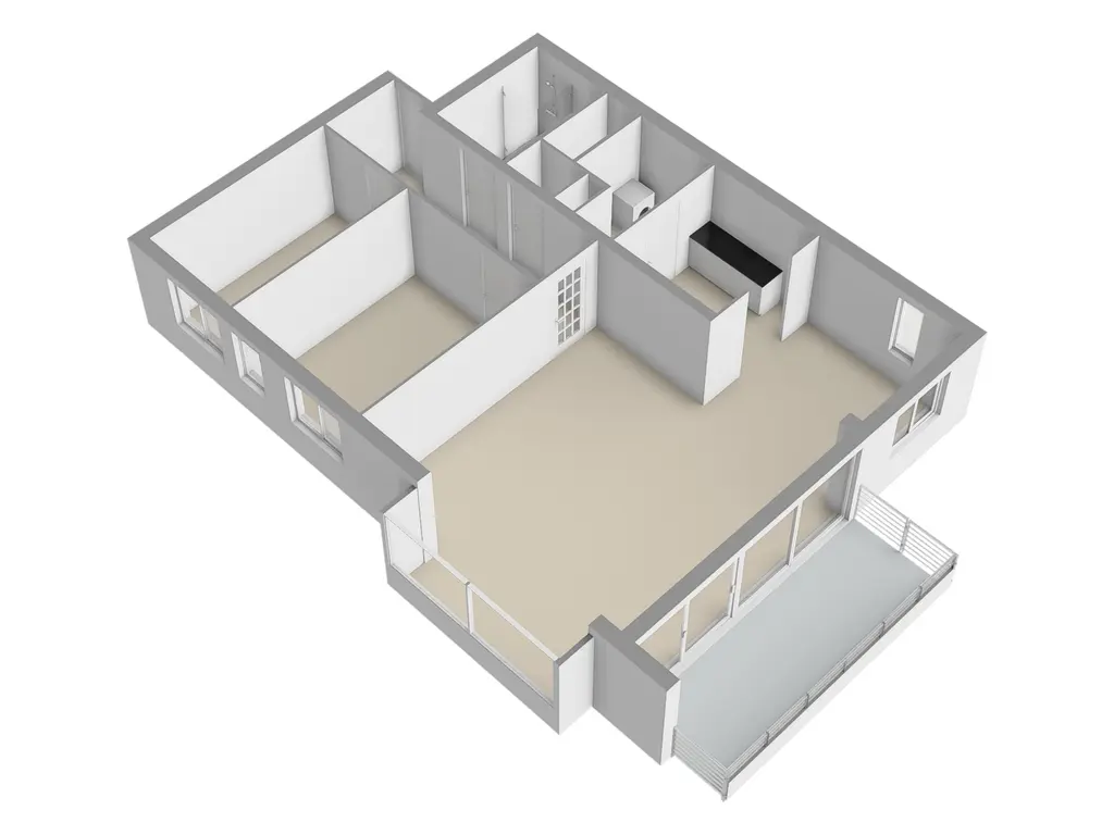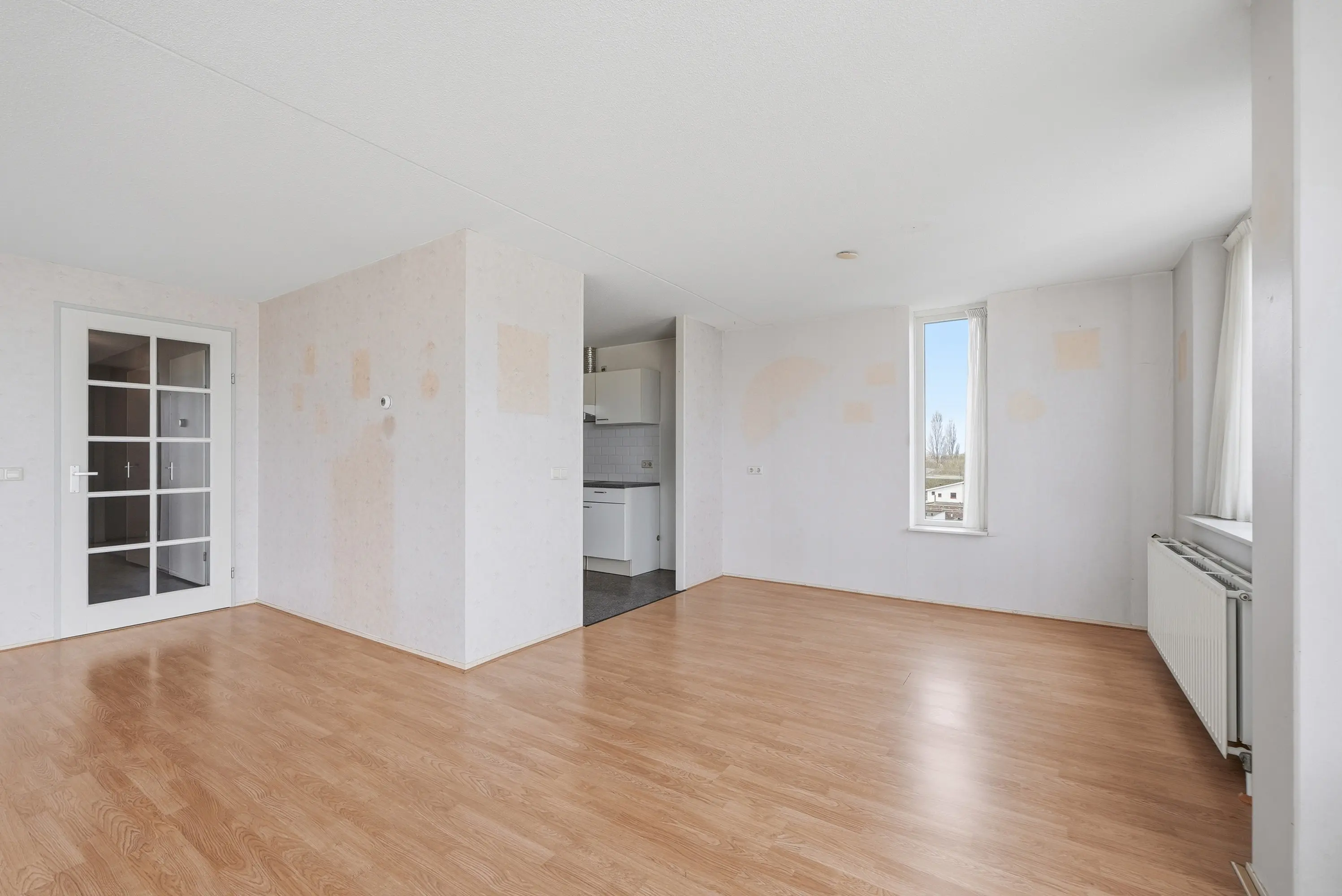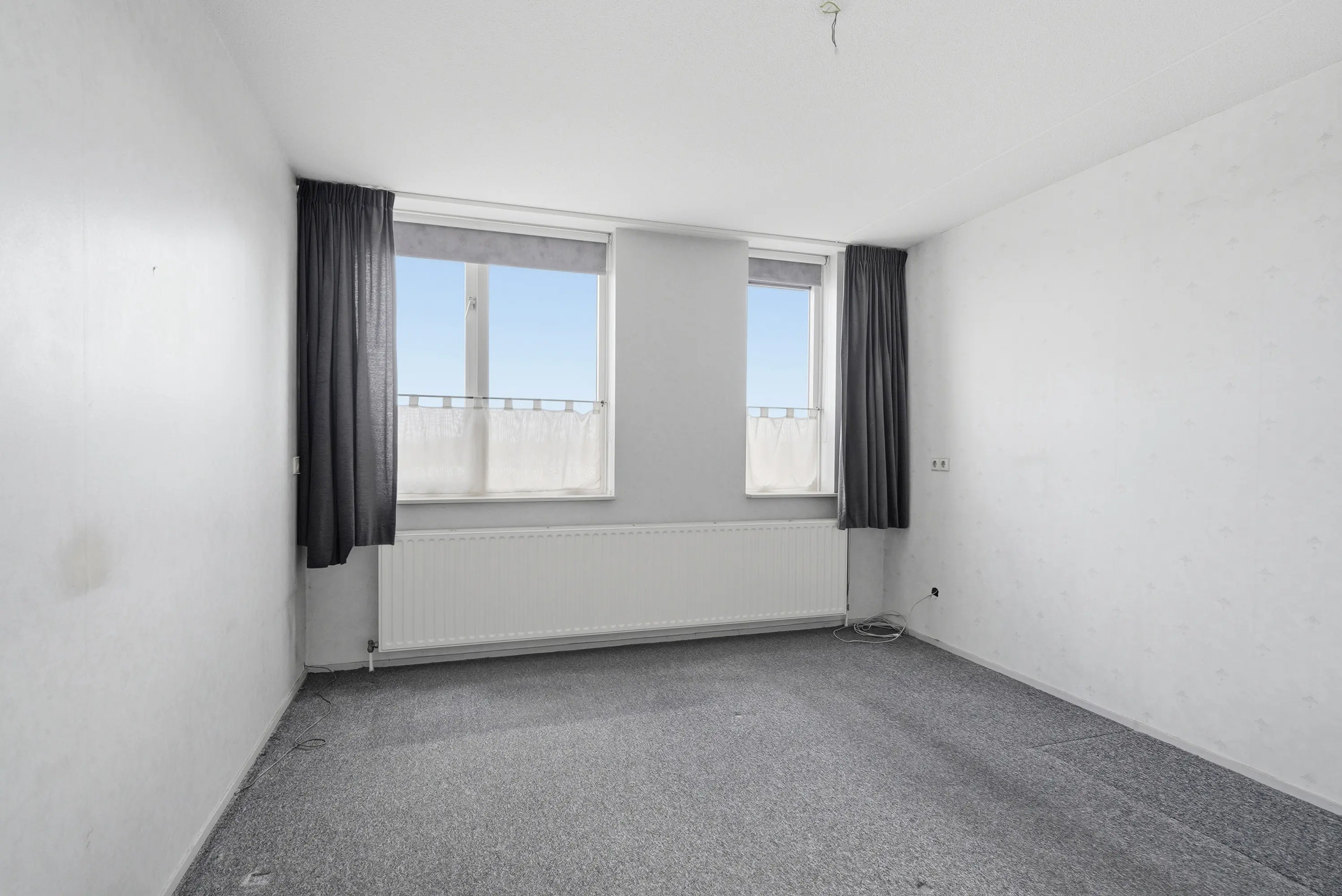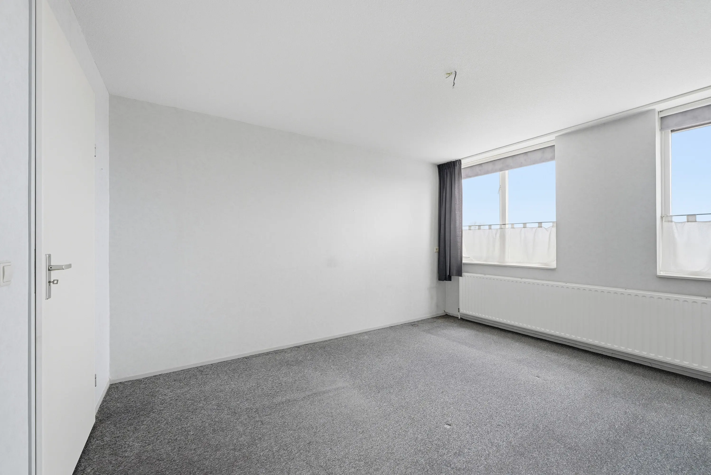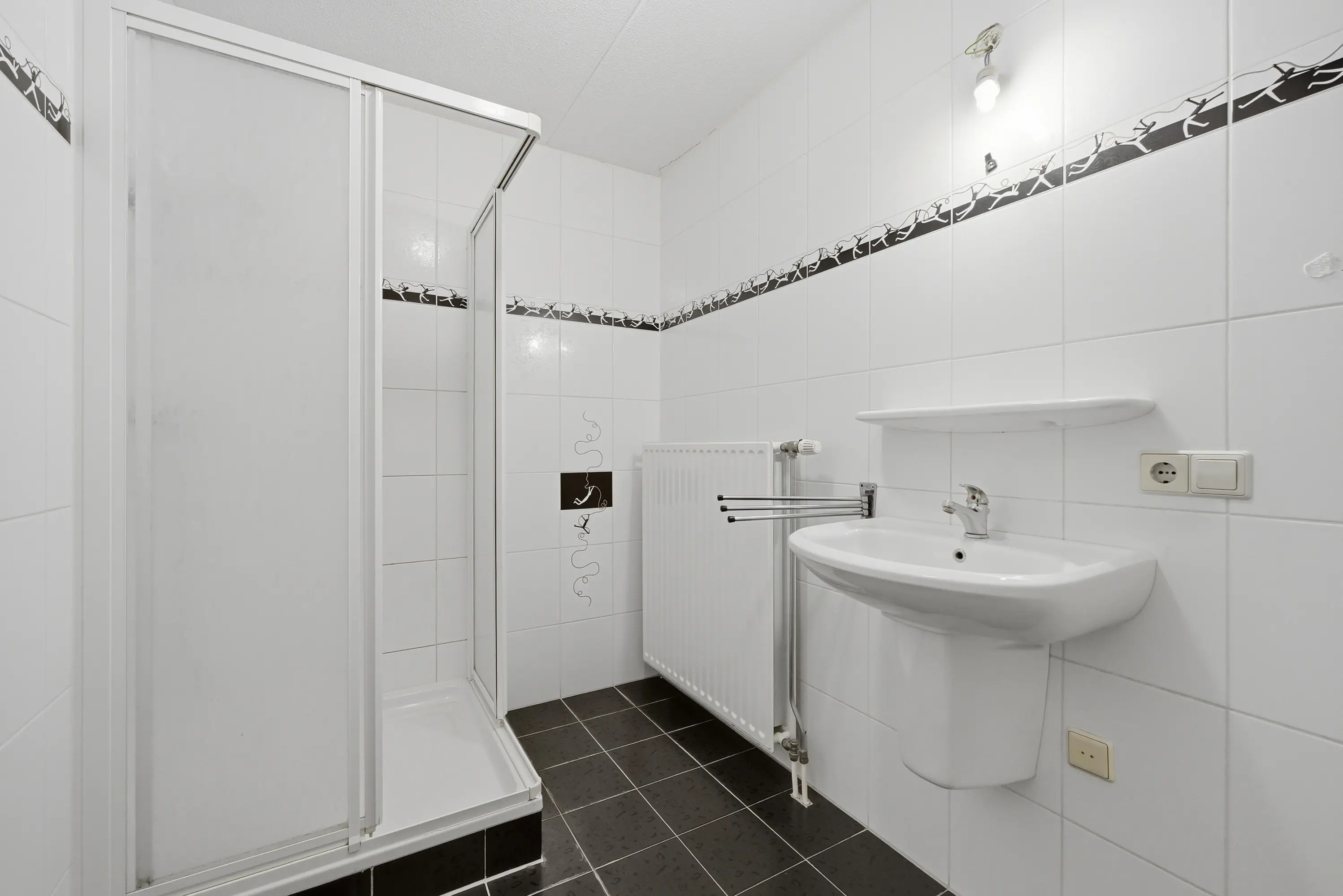 Meterkast, eigen entree en hal met videofooninstallatie, ruime en lichte woonkamer met schuifpui naar het grote balkon, nette open keuken met inbouwapparatuur en aansluitend een praktische bijkeuken/berging met wasmachineaansluiting. Via de hal bereik je de twee mooie slaapkamers, separaat toilet met fonteintje en nette, volledig betegelde badkamer voorzien van douchecabine en wastafel.
