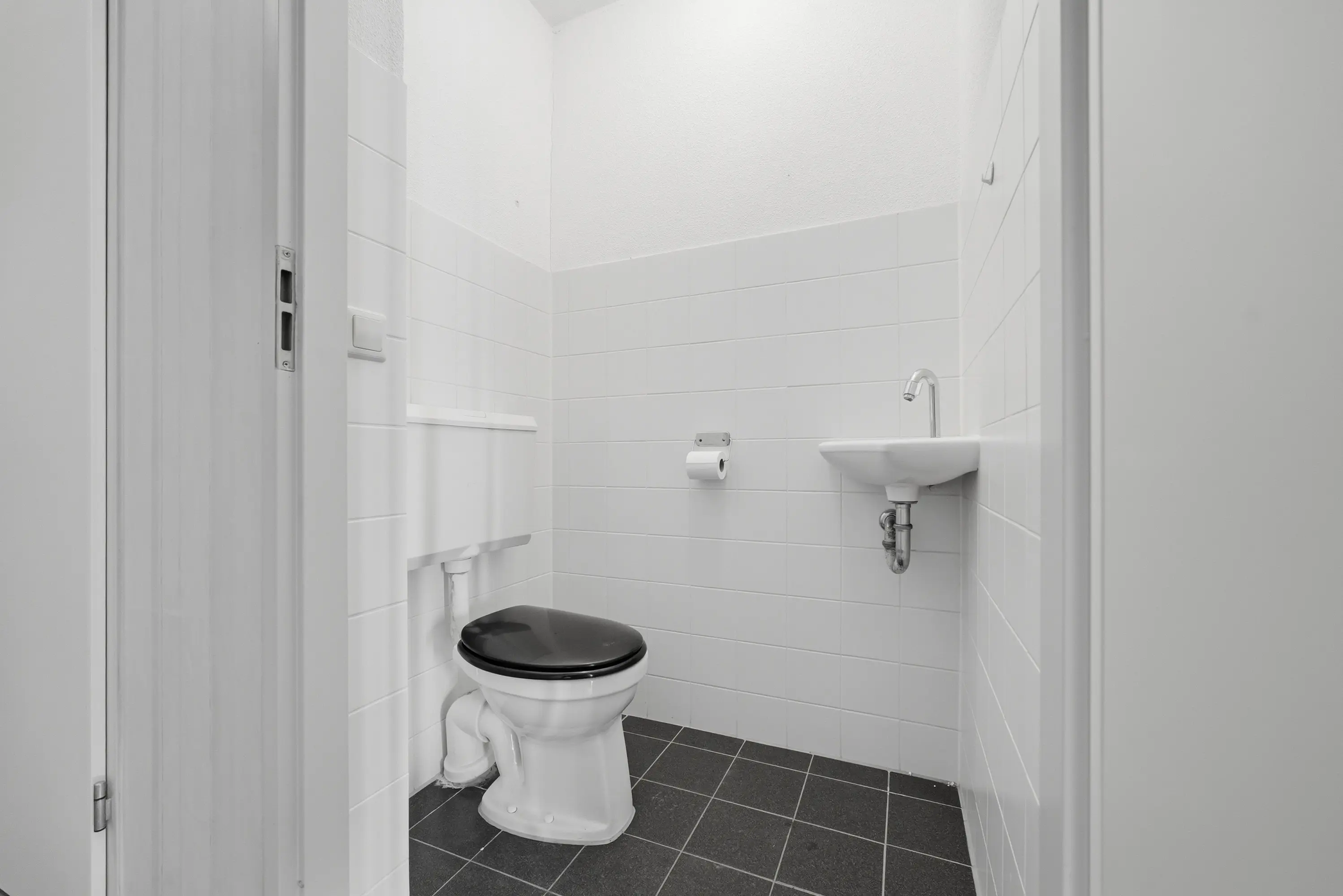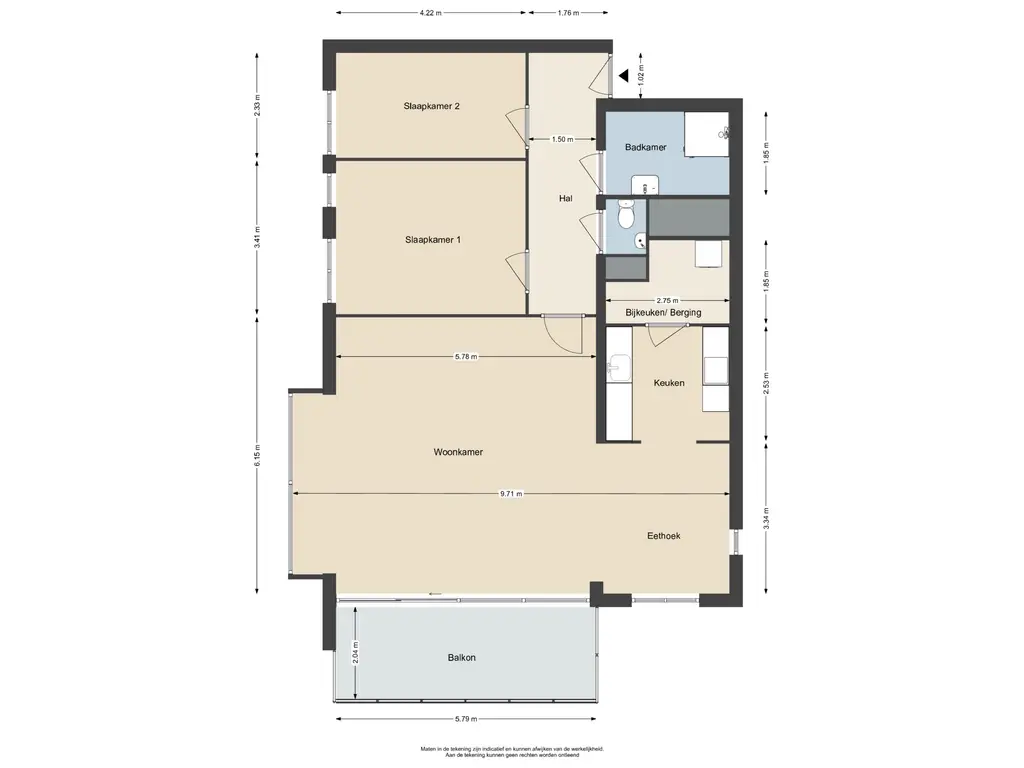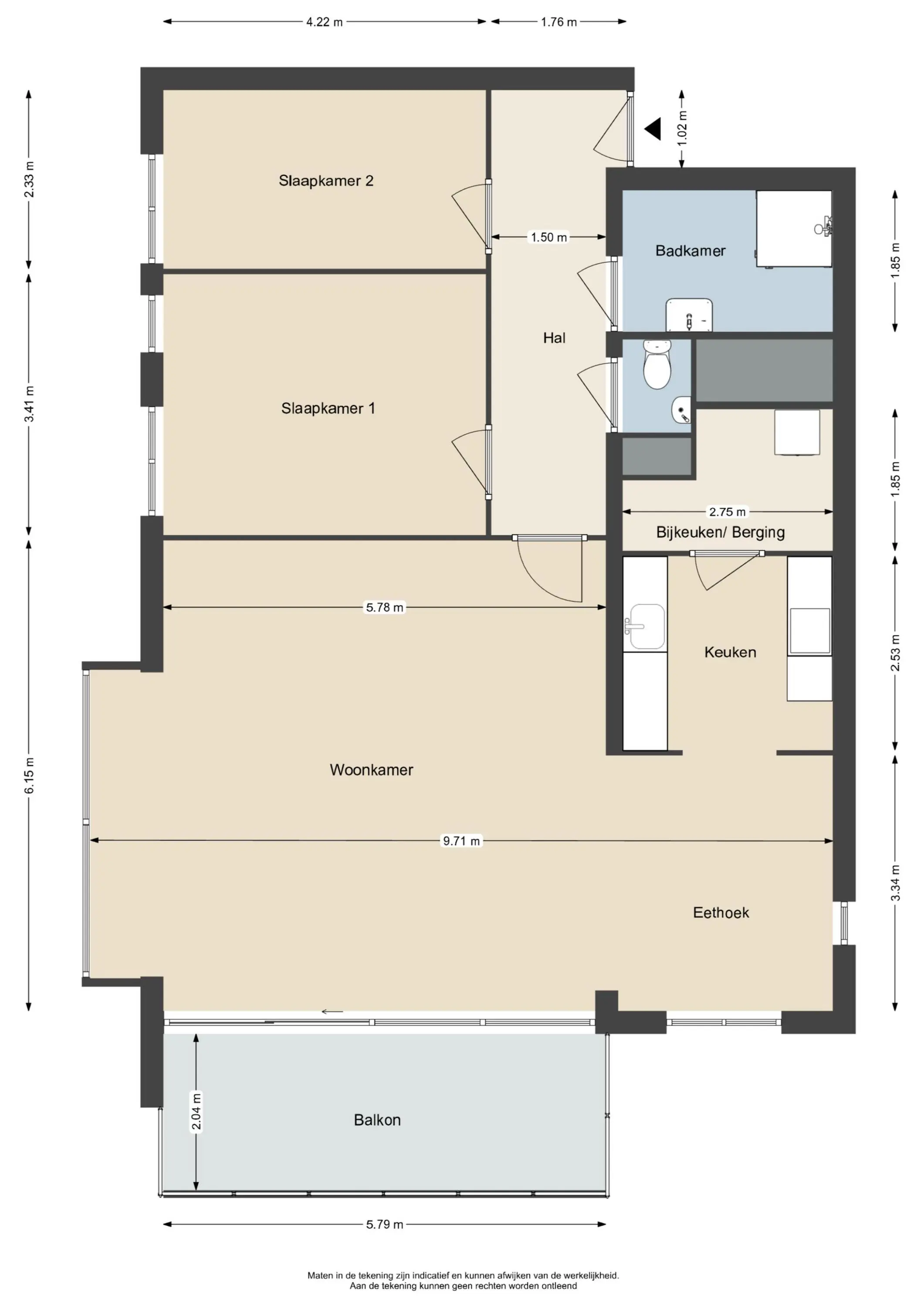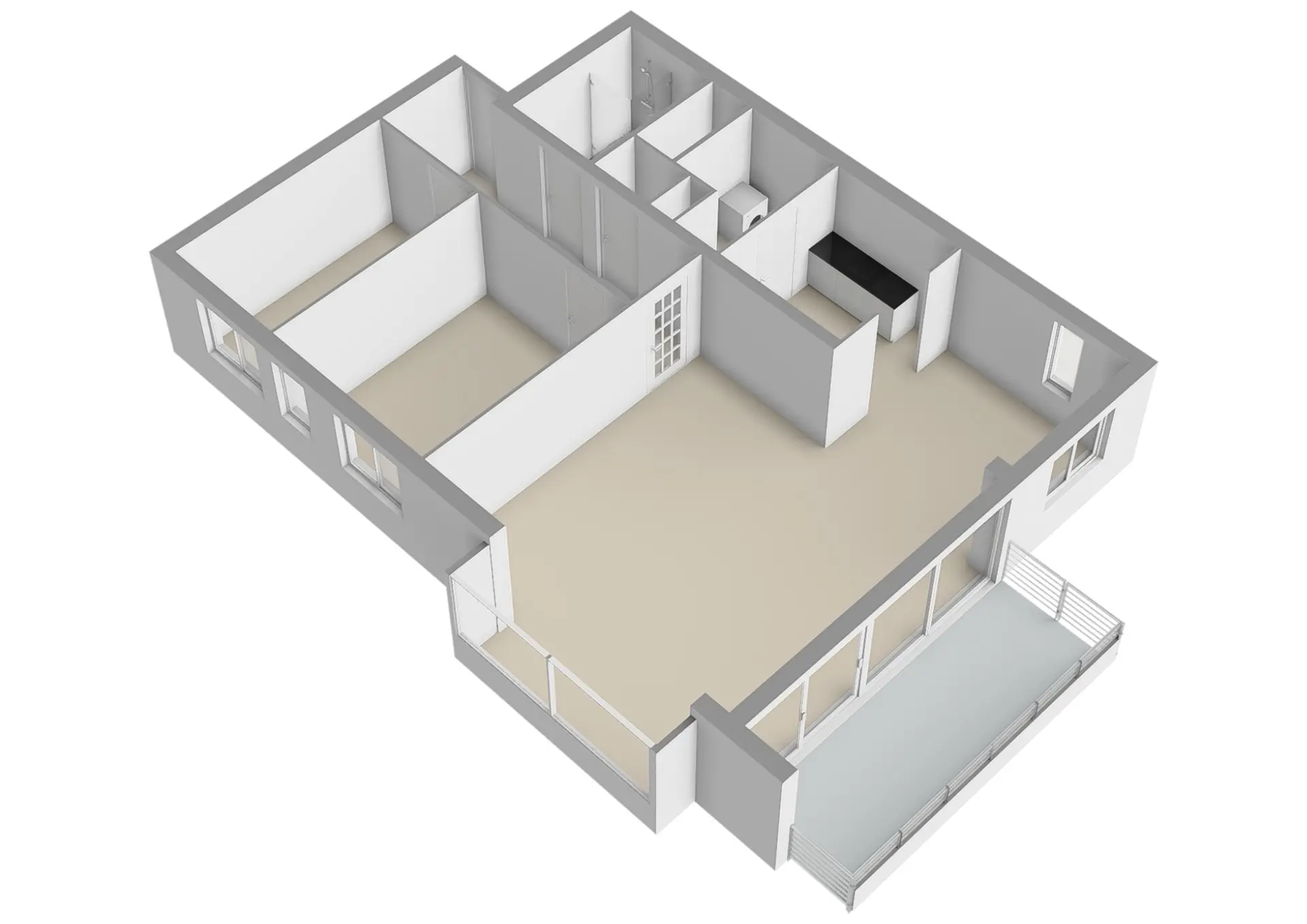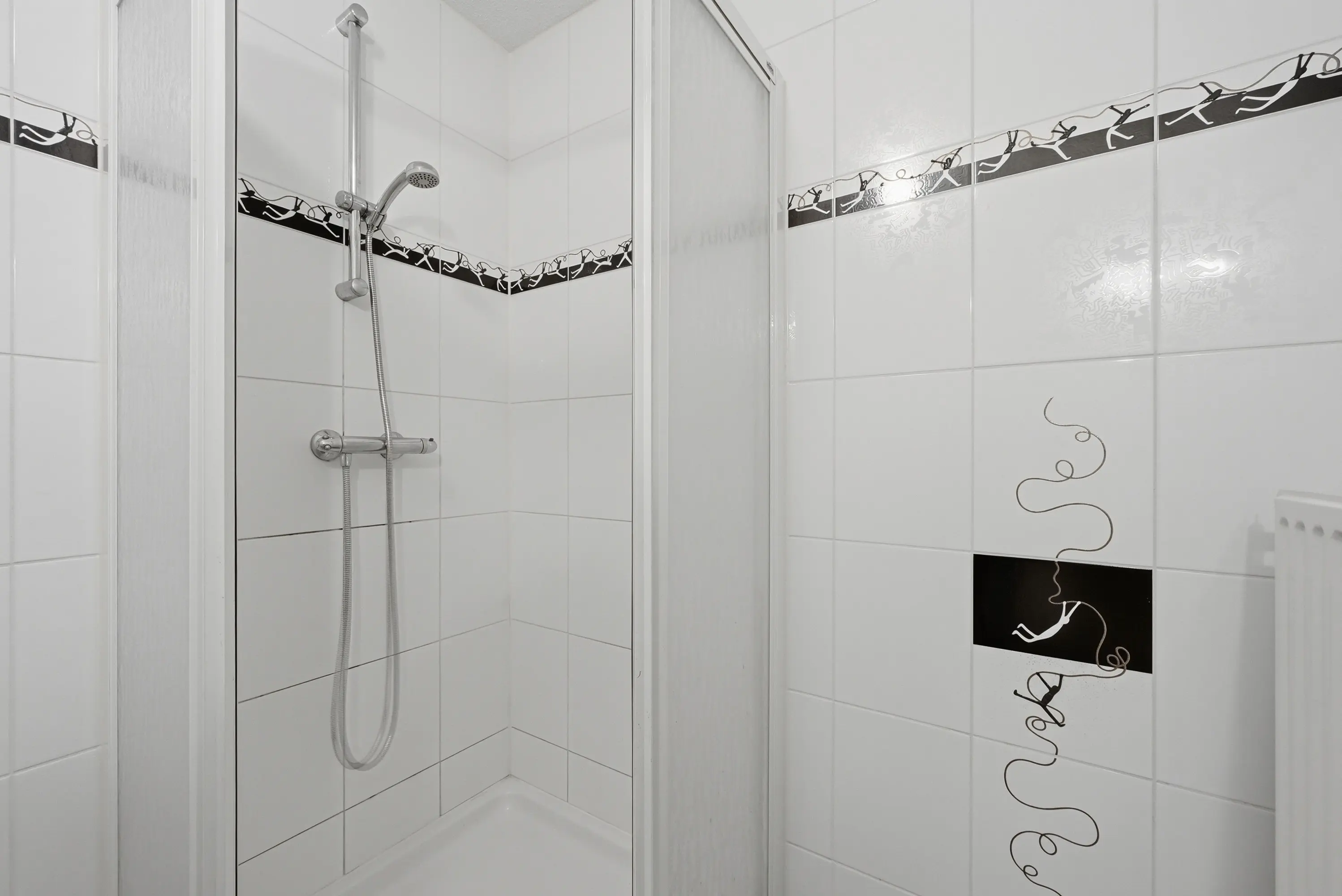 Meterkast, eigen entree en hal met videofooninstallatie, ruime en lichte woonkamer met schuifpui naar het grote balkon, nette open keuken met inbouwapparatuur en aansluitend een praktische bijkeuken/berging met wasmachineaansluiting. Via de hal bereik je de twee mooie slaapkamers, separaat toilet met fonteintje en nette, volledig betegelde badkamer voorzien van douchecabine en wastafel.