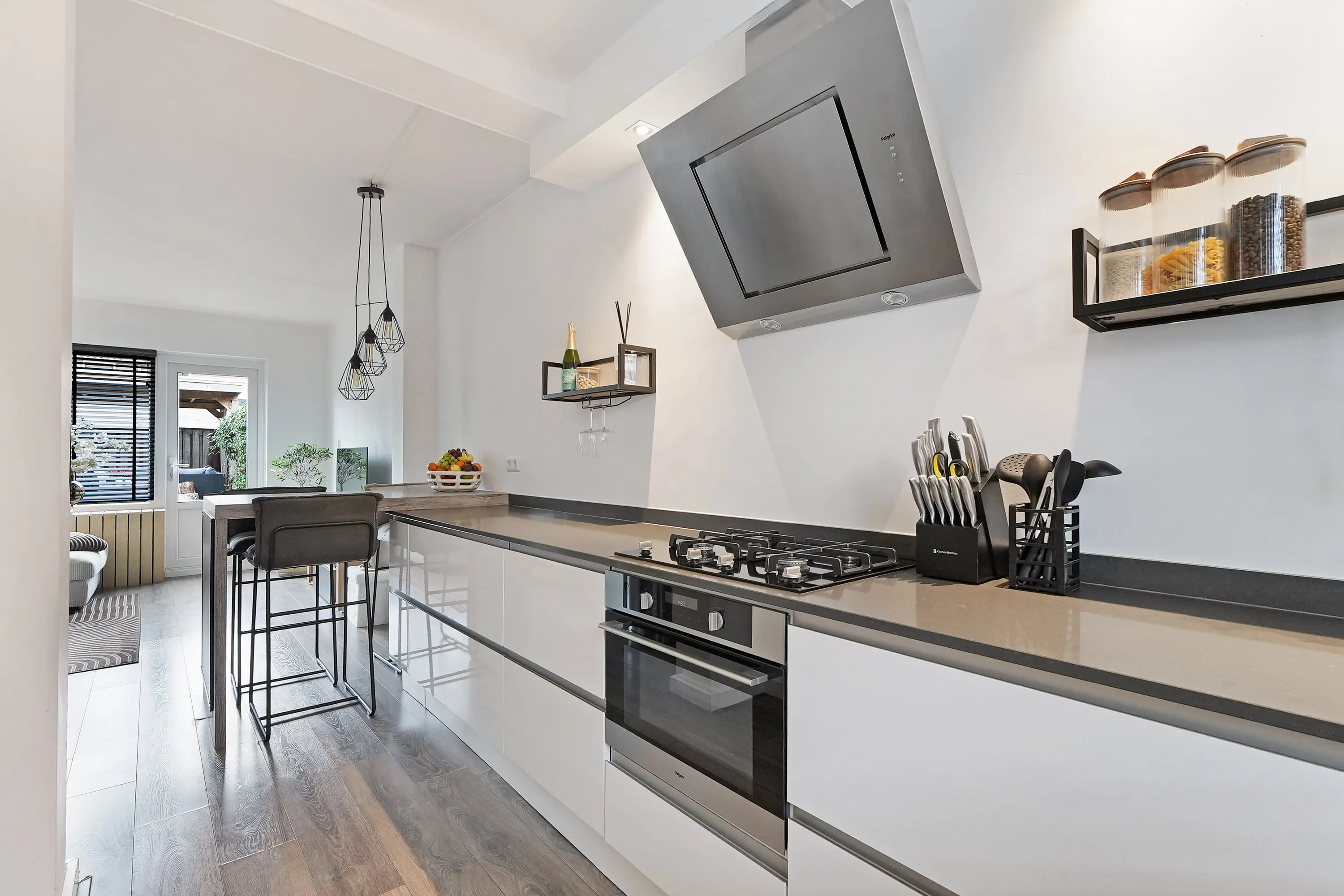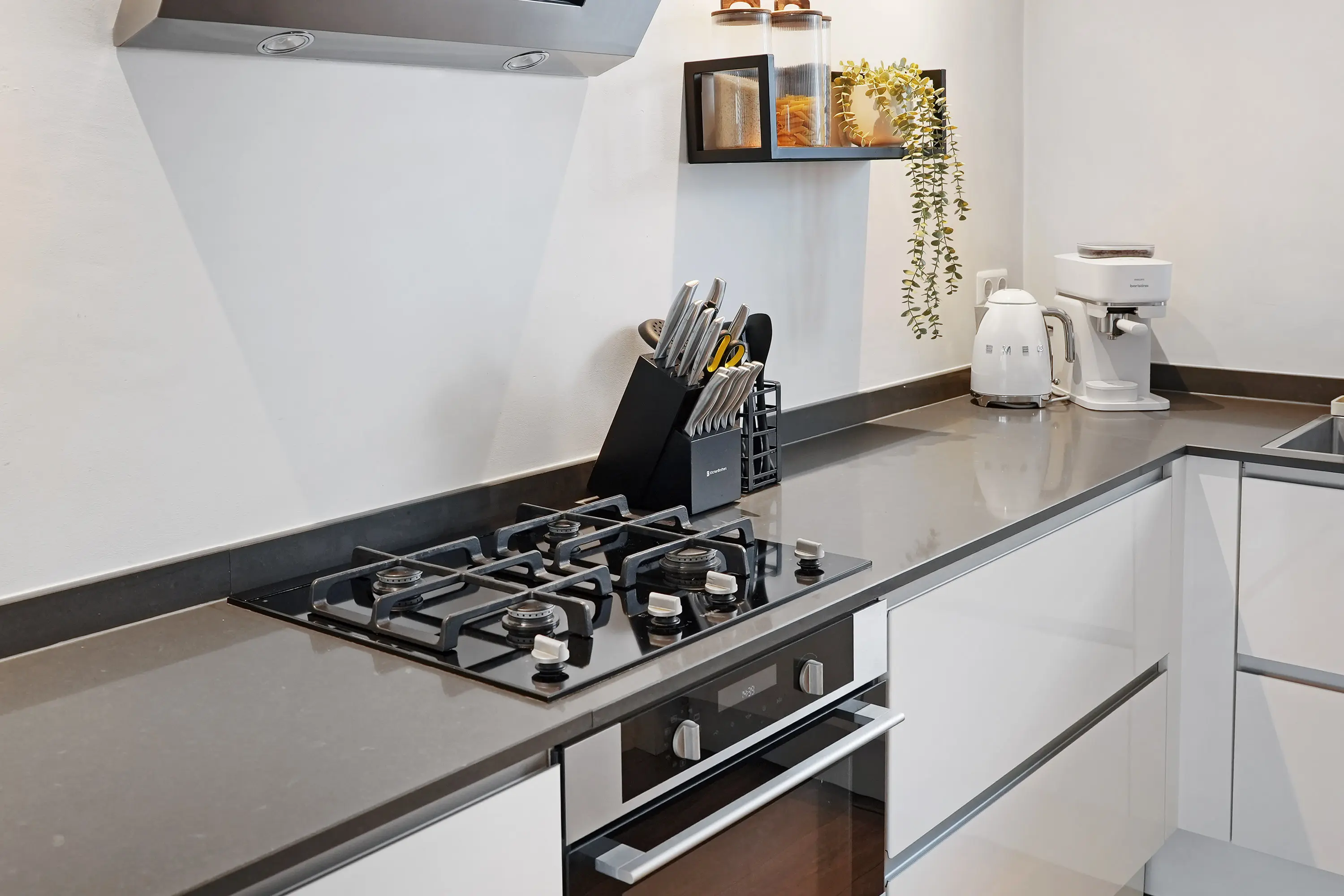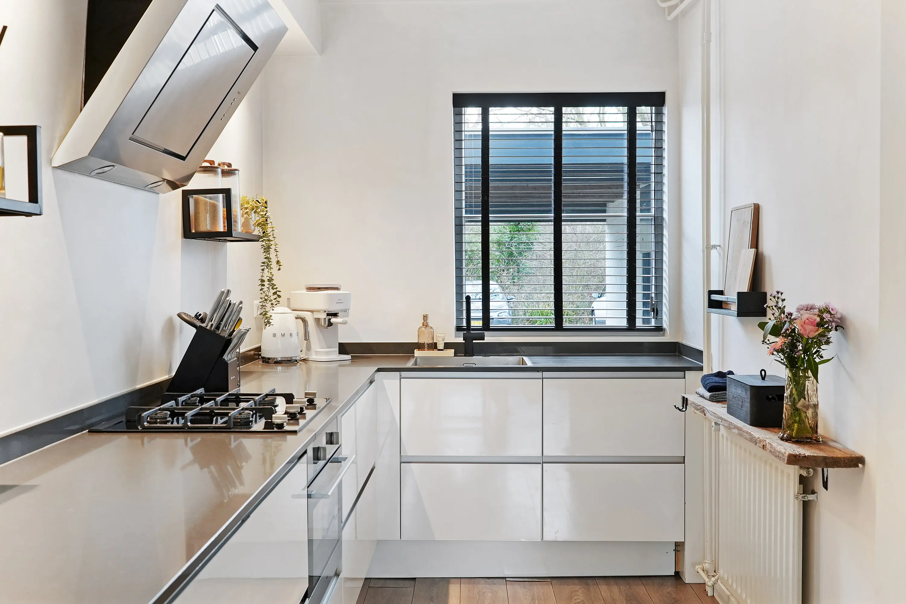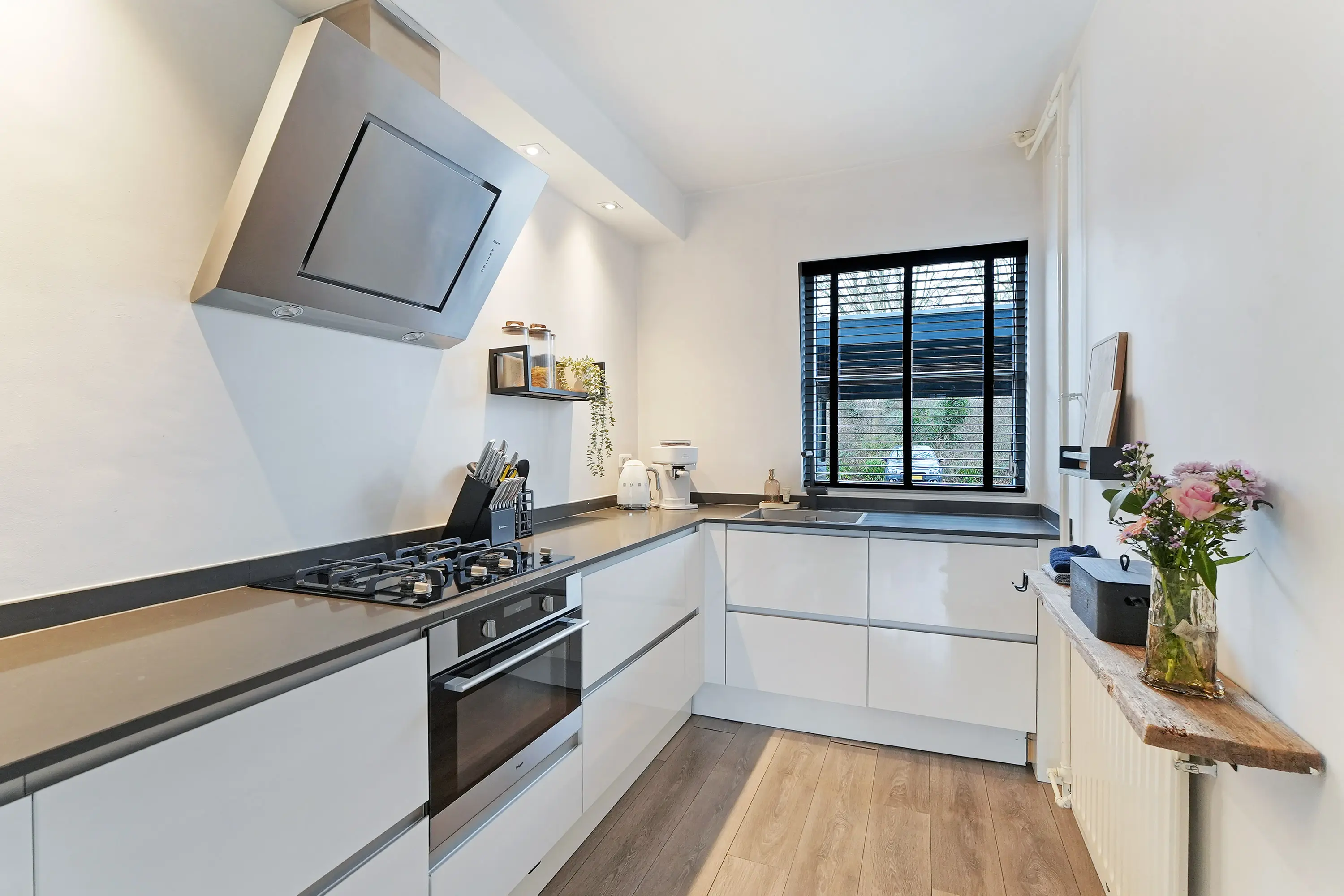 De keuken bevindt zich aan de voorzijde van de woning en is in 2017 volledig vernieuwd. De keuken is uitgerust met een koelkast, spoelbak, designafzuigkap en oven. De moderne, greeploze witte keuken wordt stijlvol gecombineerd met een fraai antraciet werkblad. De woning is de afgelopen jaren grondig gerenoveerd, wat duidelijk zichtbaar is in de verzorgde en moderne afwerking.