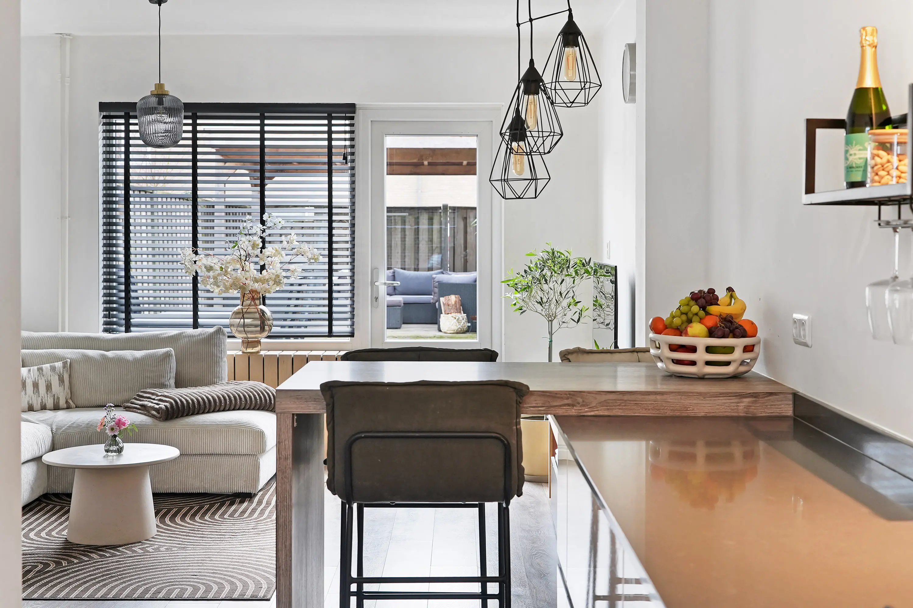 Wat direct opvalt, is het hoge afwerkingsniveau en de prettige hoeveelheid natuurlijke lichtinval. De woonkamer is aan de achterzijde van de woning gesitueerd en biedt uitzicht op de achtertuin. De ruimte is sfeervol en biedt voldoende plaats voor een comfortabele zit- en eethoek. Via de tuindeur heeft u direct toegang tot de tuin, waardoor binnen en buiten mooi in elkaar overlopen.