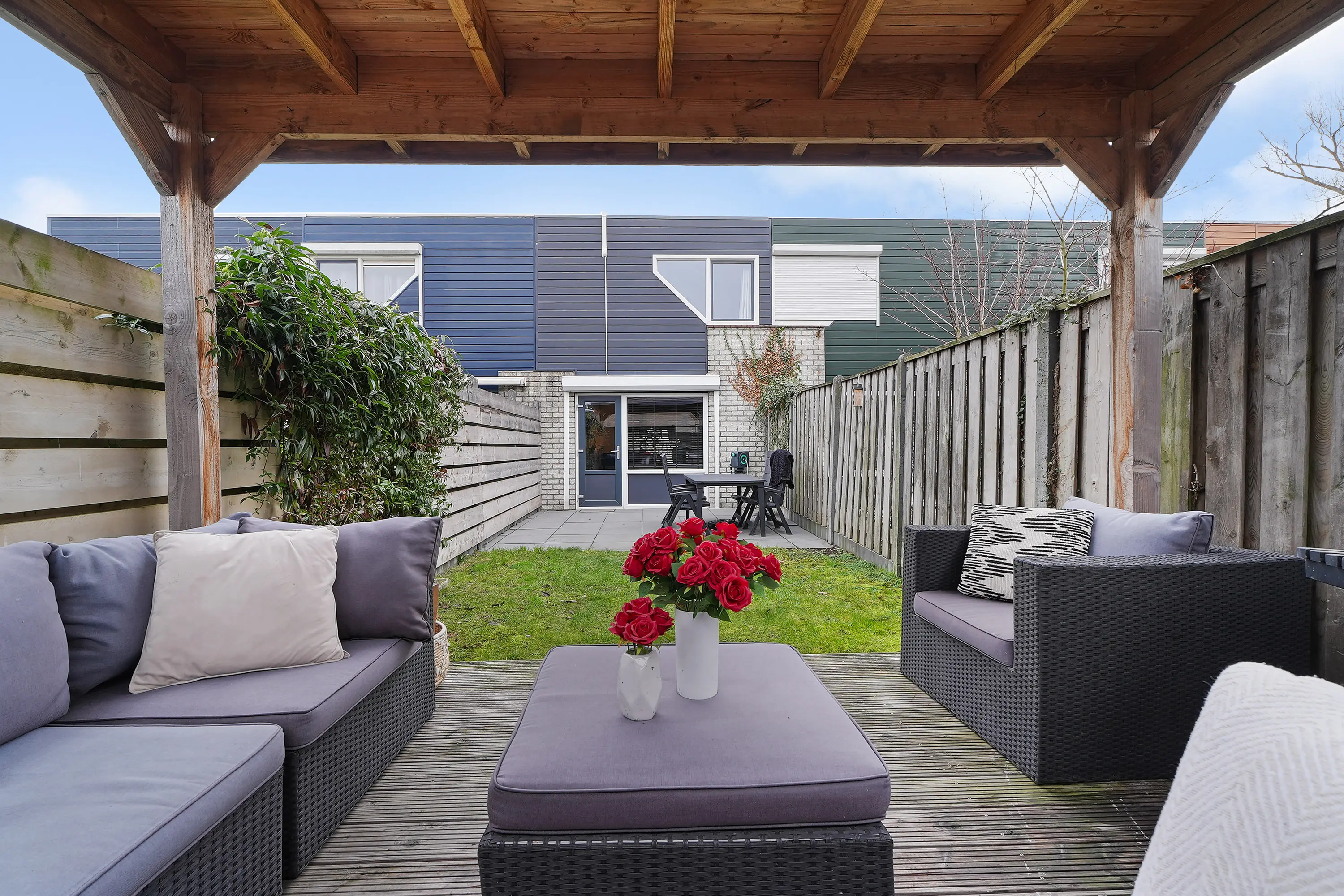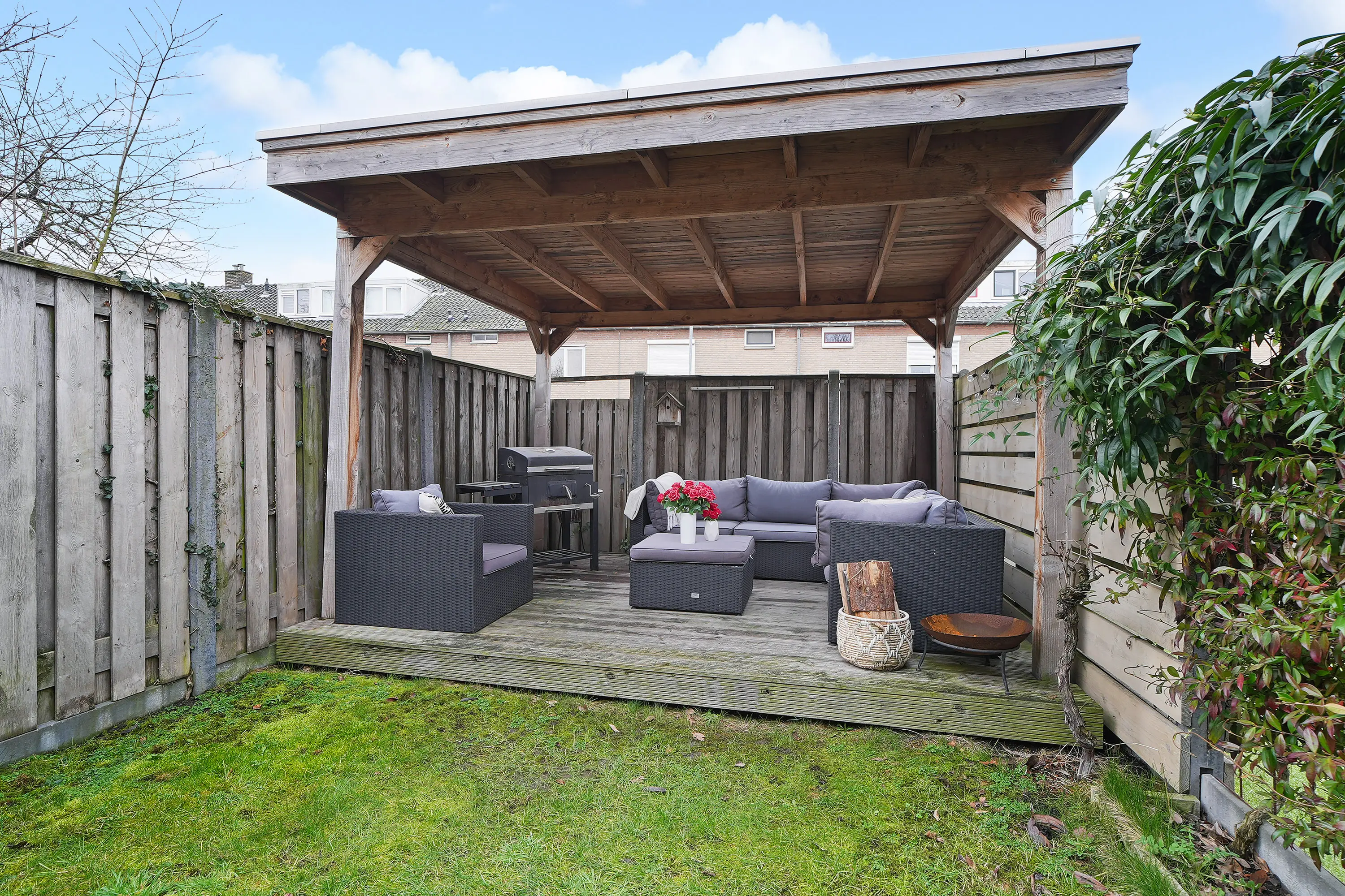 De woning beschikt over een fraaie en zonnige achtertuin, gelegen op het zuidwesten. Dit zorgt voor een optimale zonligging gedurende de dag. De tuin heeft een onderhoudsvriendelijk karakter en is sfeervol ingericht. Achterin de tuin bevindt zich een mooie houten overkapping, waar u het hele jaar door kunt genieten van het buitenleven.