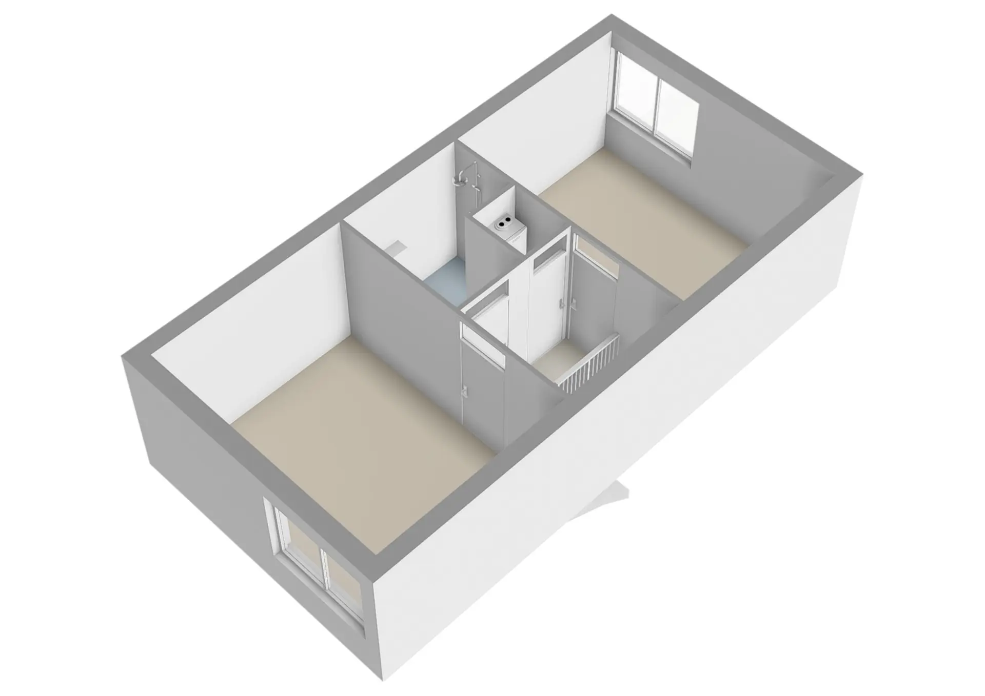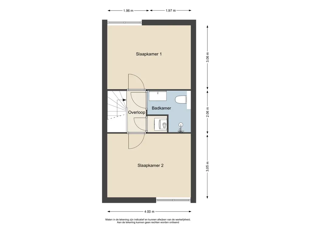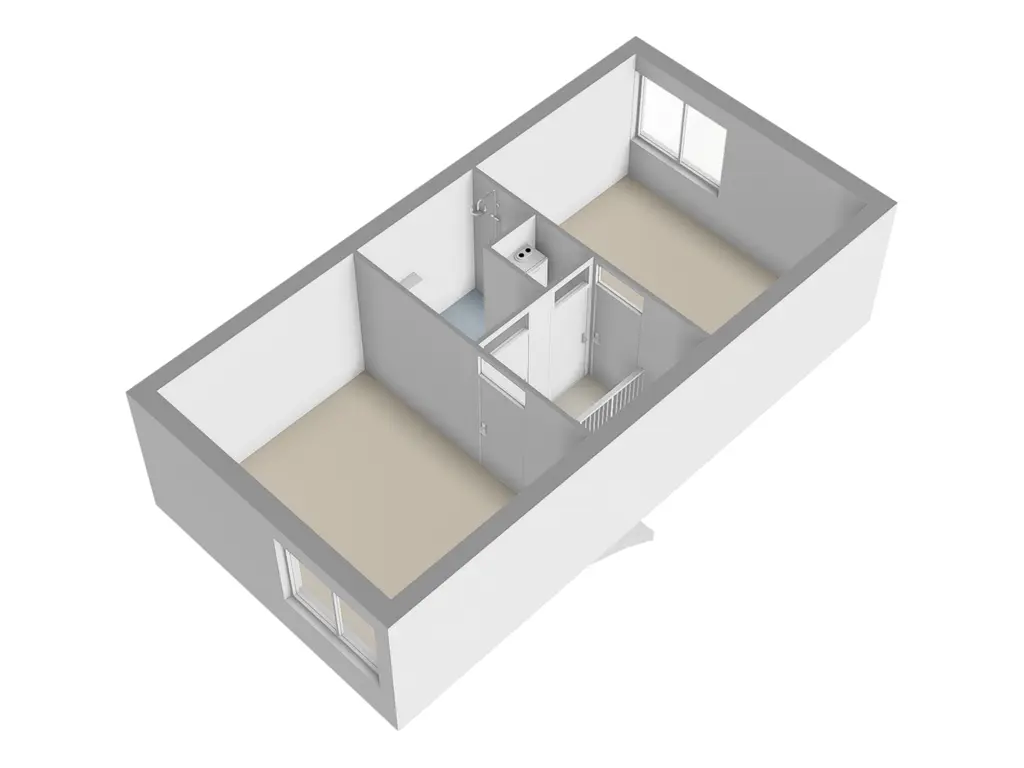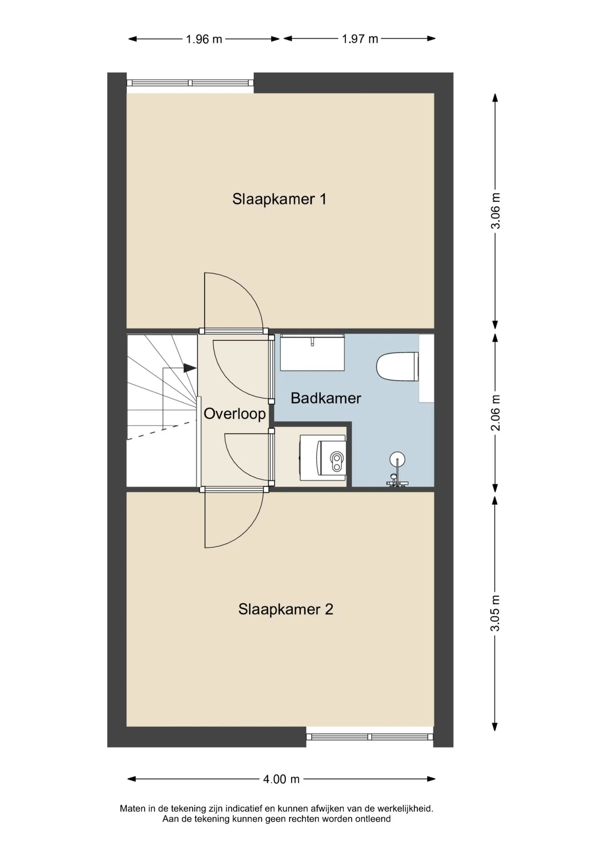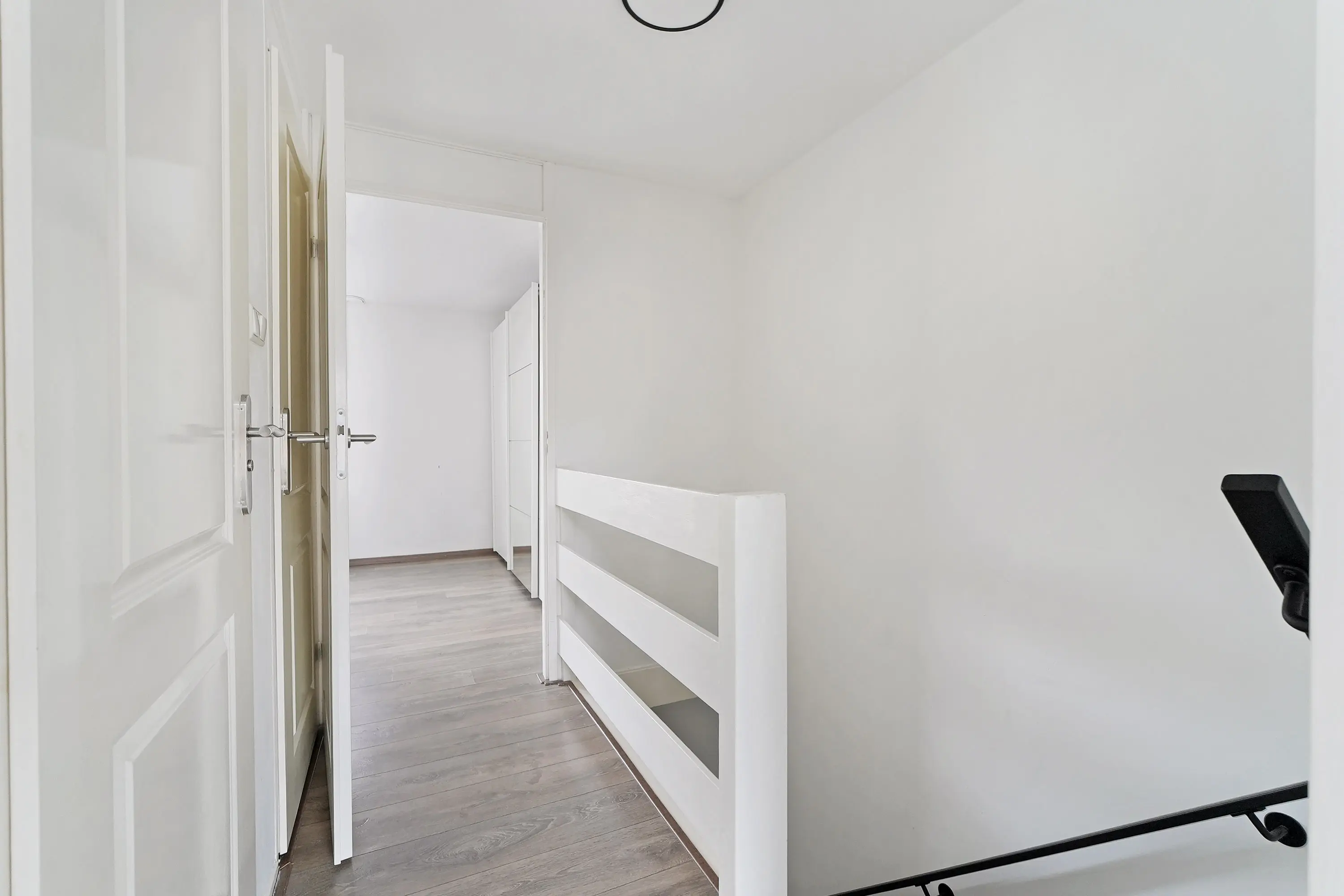 Via de trap in de hal bereikt u de eerste verdieping. Ook deze verdieping is keurig afgewerkt en beschikt over twee ruime slaapkamers, een overloop en een royale badkamer. Dankzij de bouwvorm van de woning zijn er geen schuine wanden aanwezig, waardoor het volledige vloeroppervlak optimaal benut kan worden.