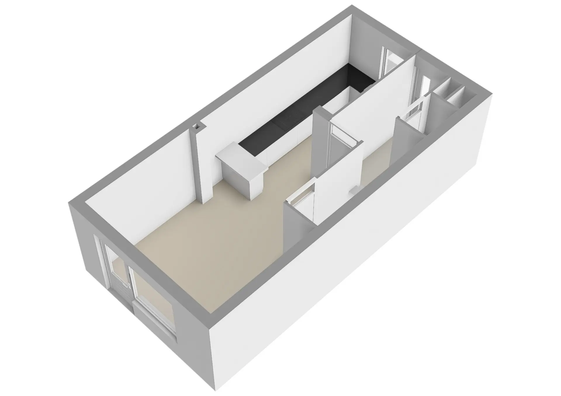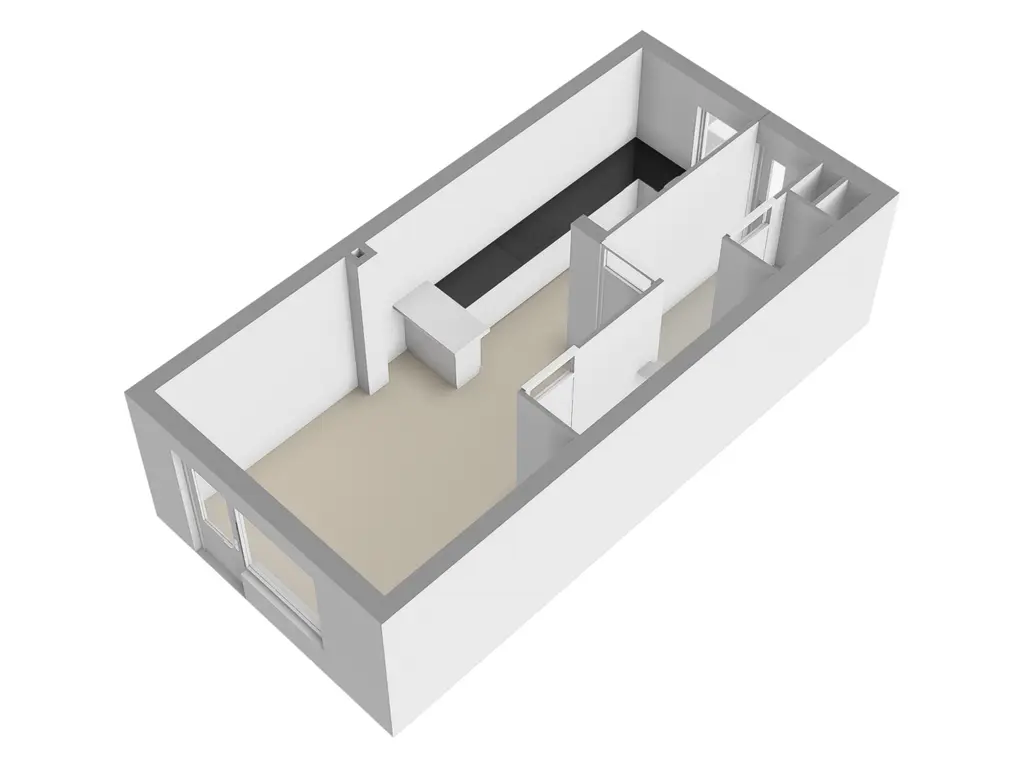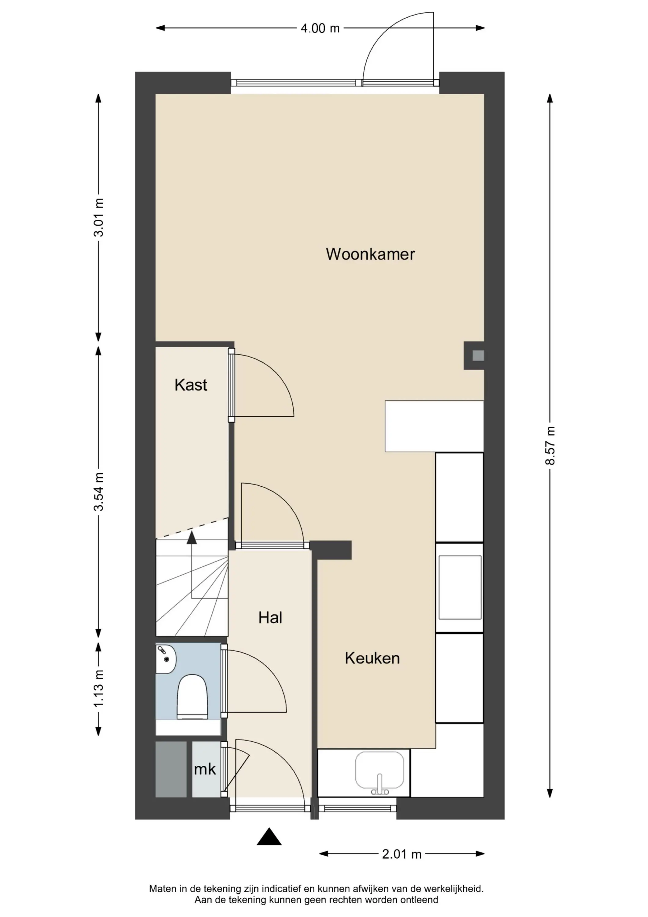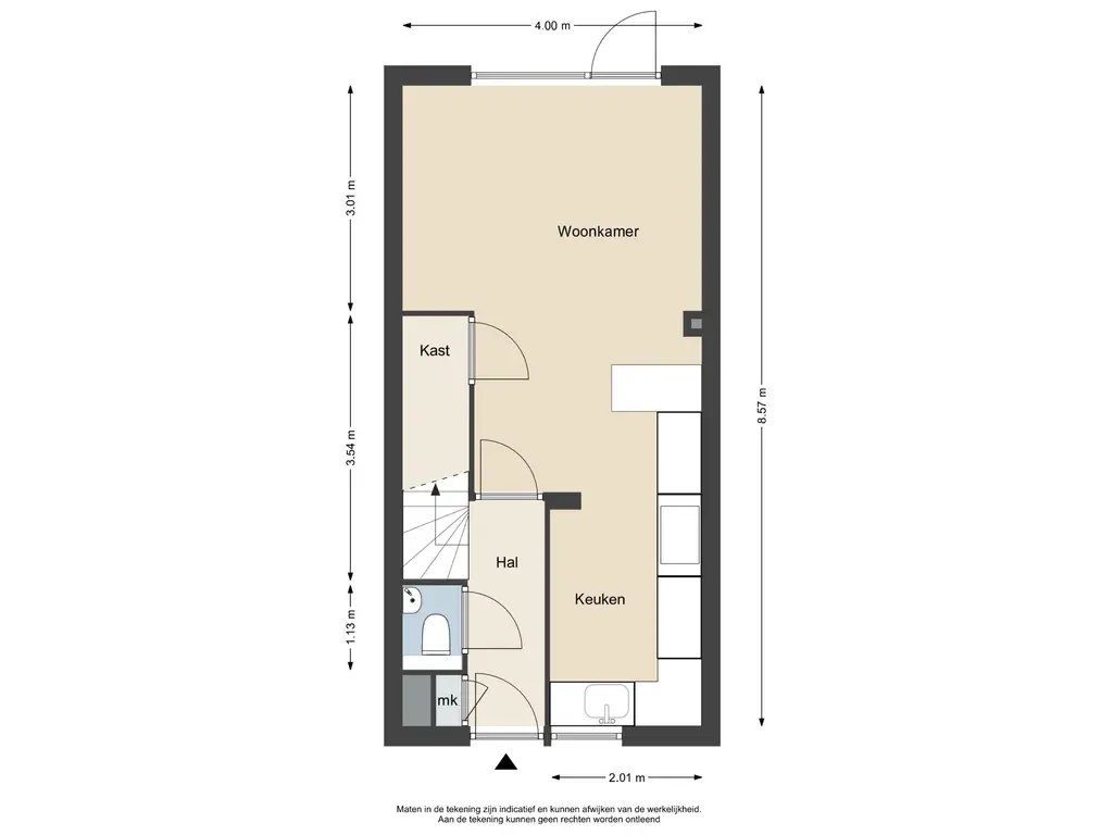 Via de entree komt u in de hal, waar zich de meterkast (voorzien van 7 groepen) en het toilet bevinden. Vanuit de hal heeft u toegang tot de woonkamer.