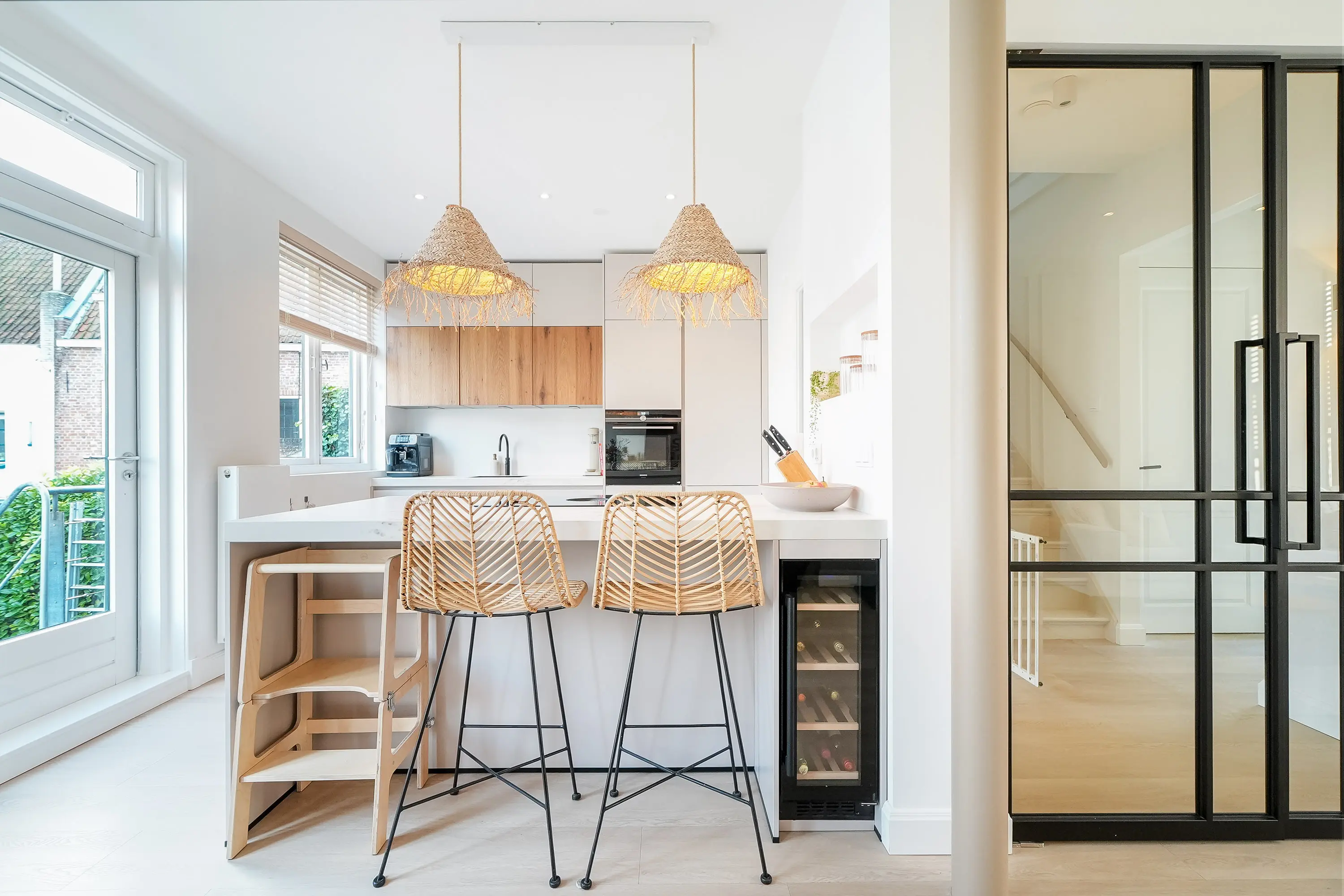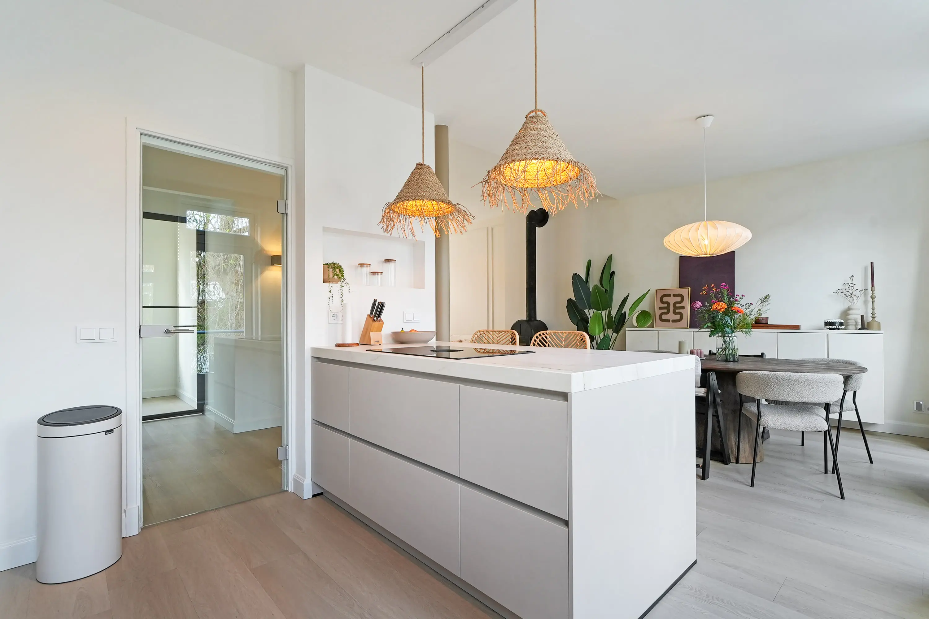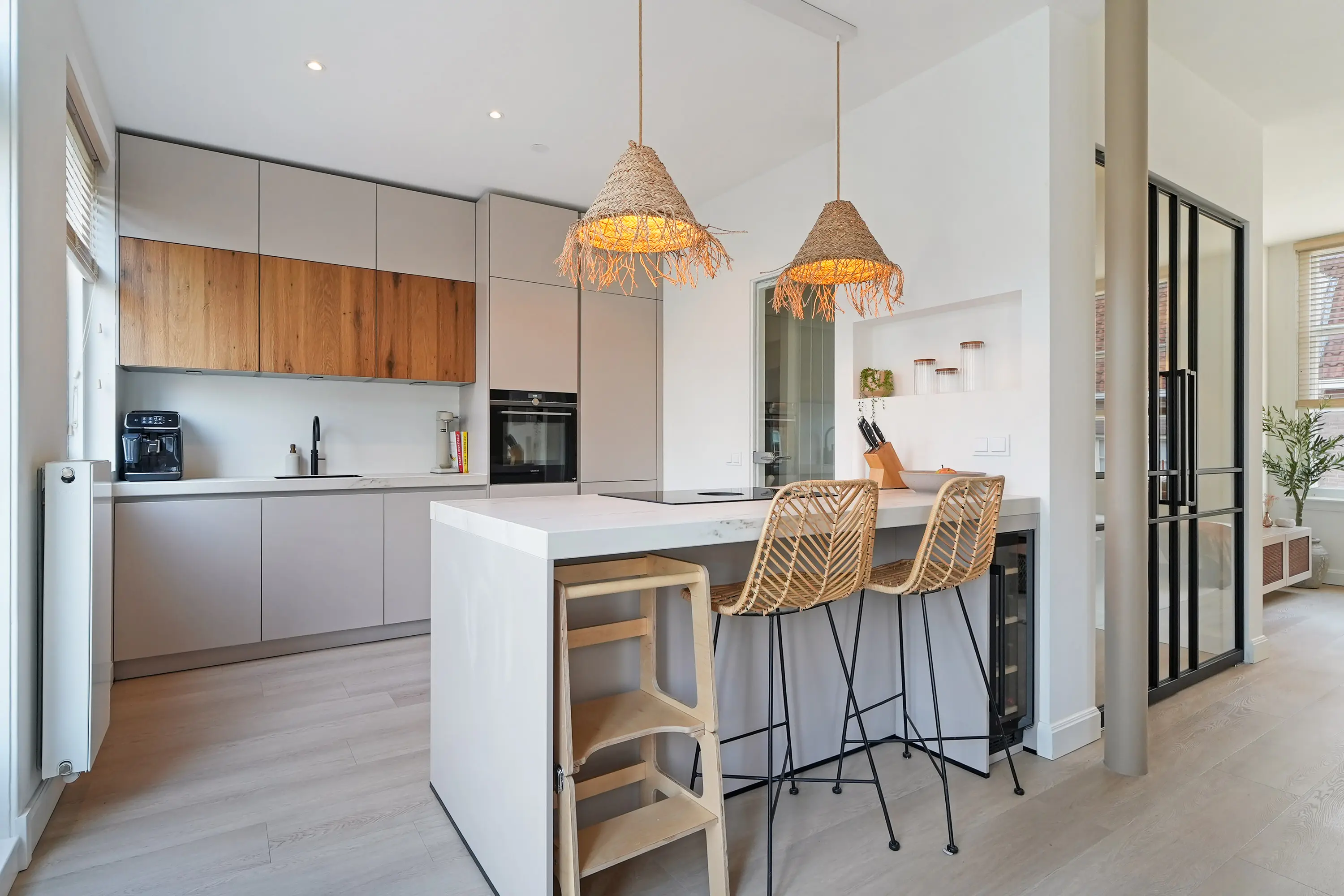 Via de riante trapopgang komt u op de chique overloop met openslaande taatsdeuren naar de woonkamer. Hier ervaart u direct de geweldige woonsfeer: zithoek aan de straatzijde, een vrijstaande houtkachel en een eethoek met open keuken aan de tuinzijde. De keuken is een echte blikvanger met kook-schiereiland, keramiek werkblad, kastenwand en hoogwaardige inbouwapparatuur zoals Bora-inductiekookplaat, Quooker en wijnkoeler. Vanuit de woonkamer en keuken bereikt u het ruime balkon met prachtig uitzicht over de binnenstad.