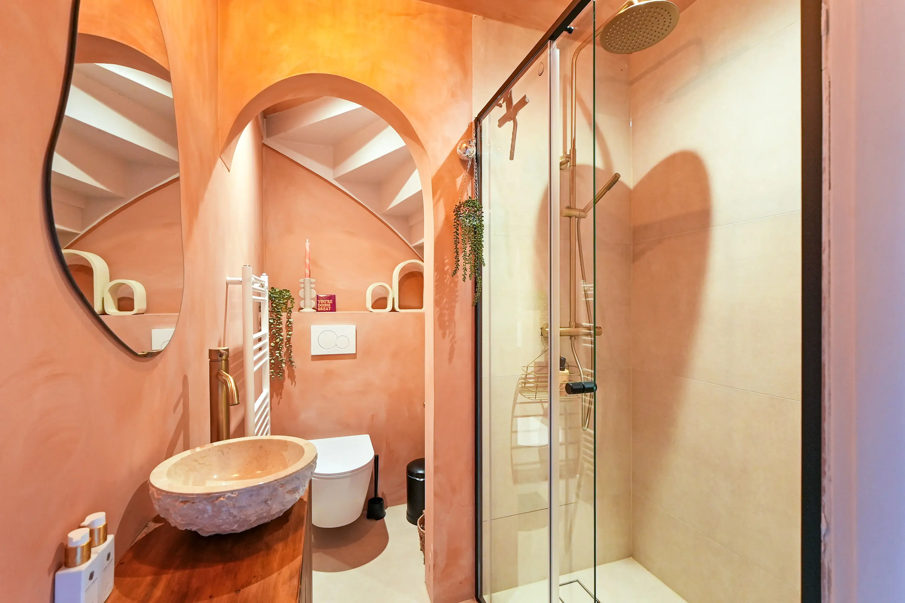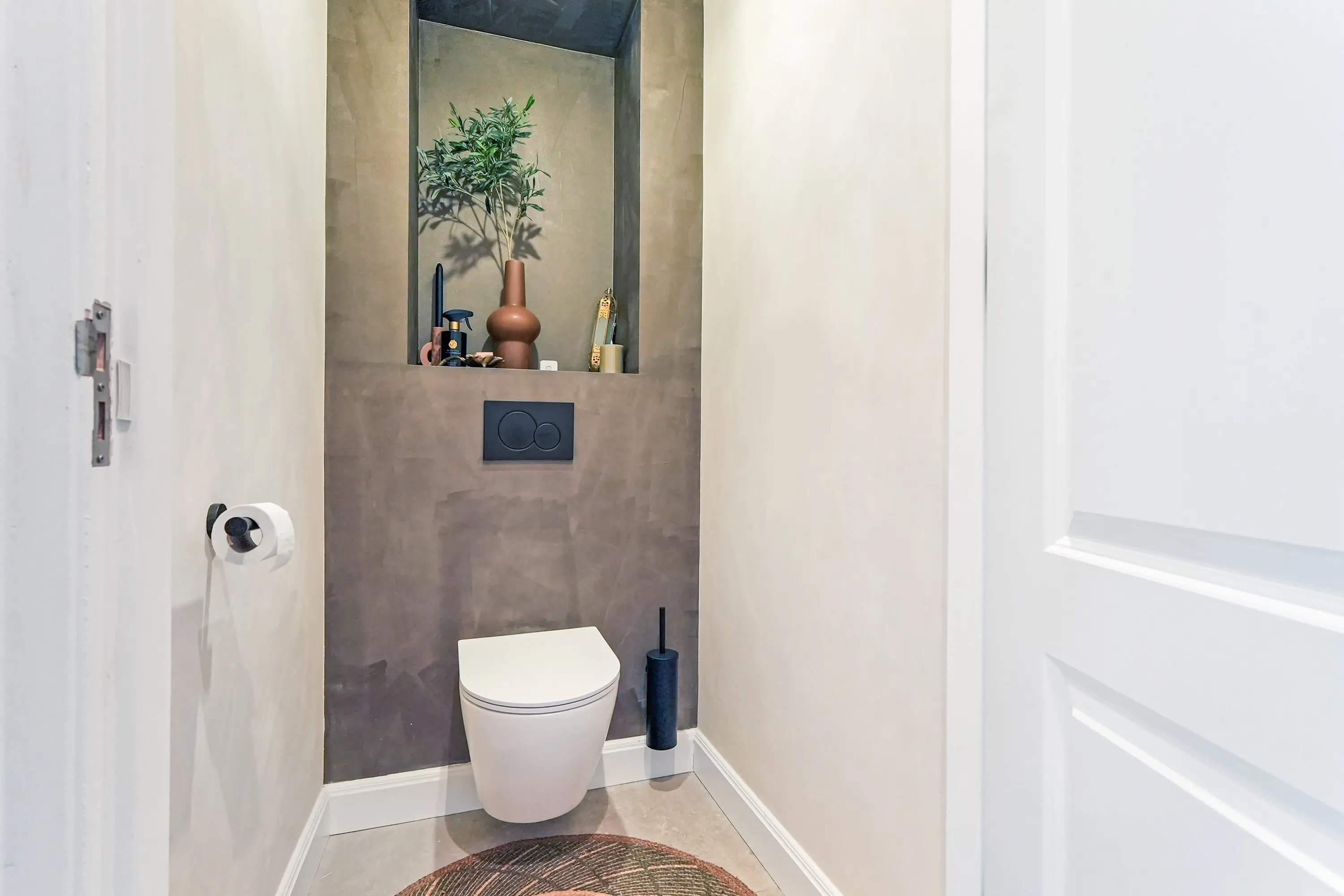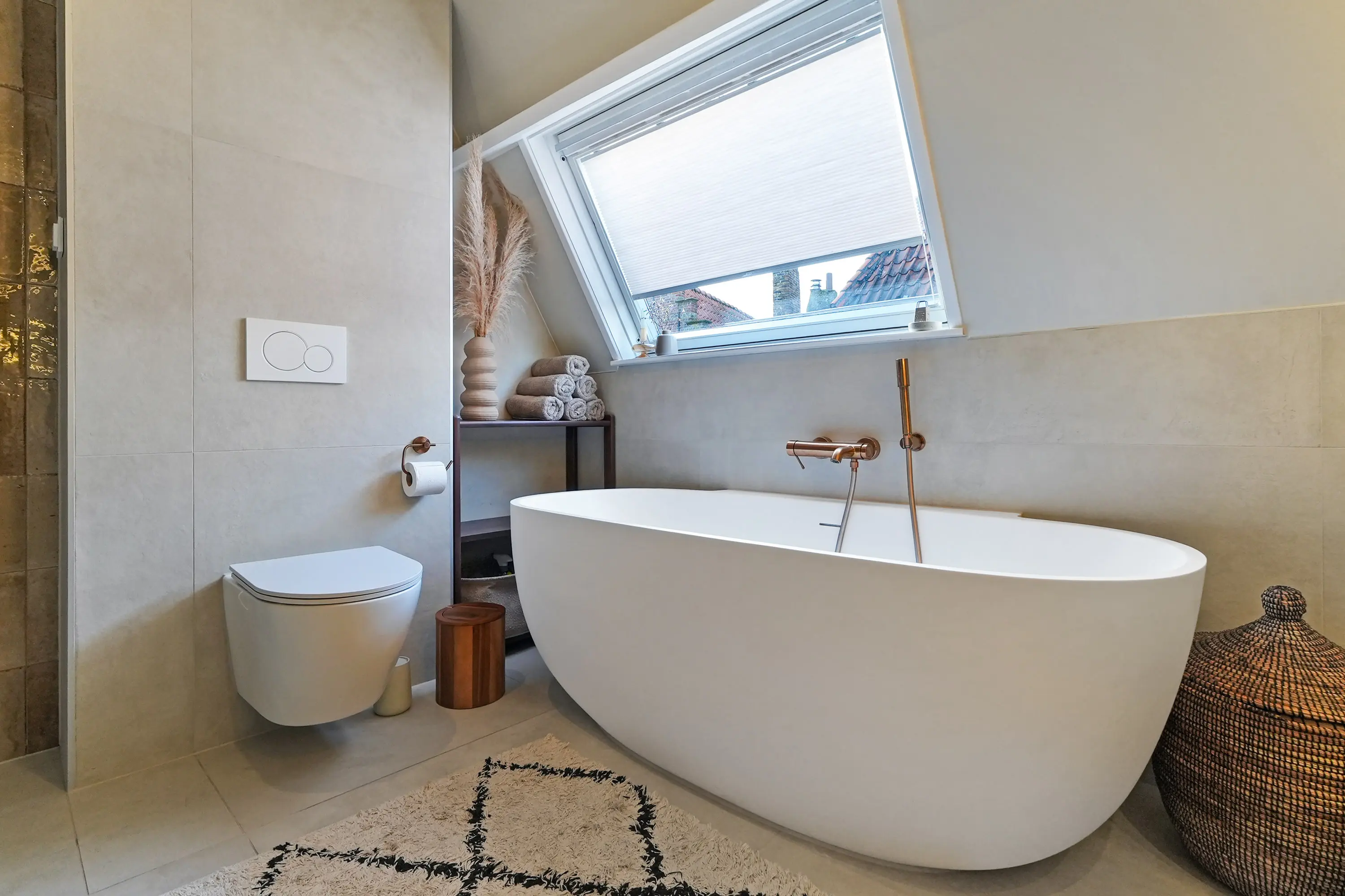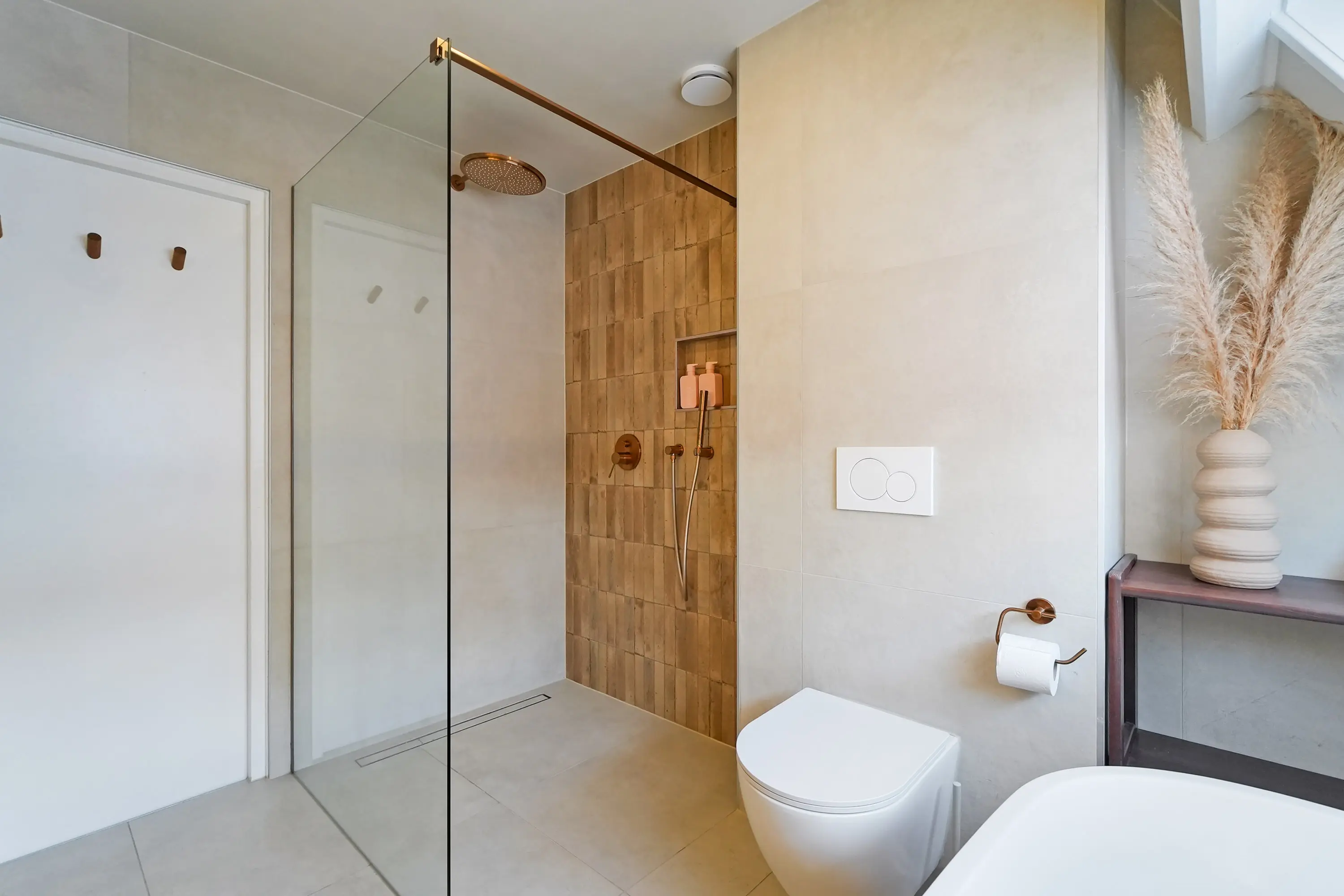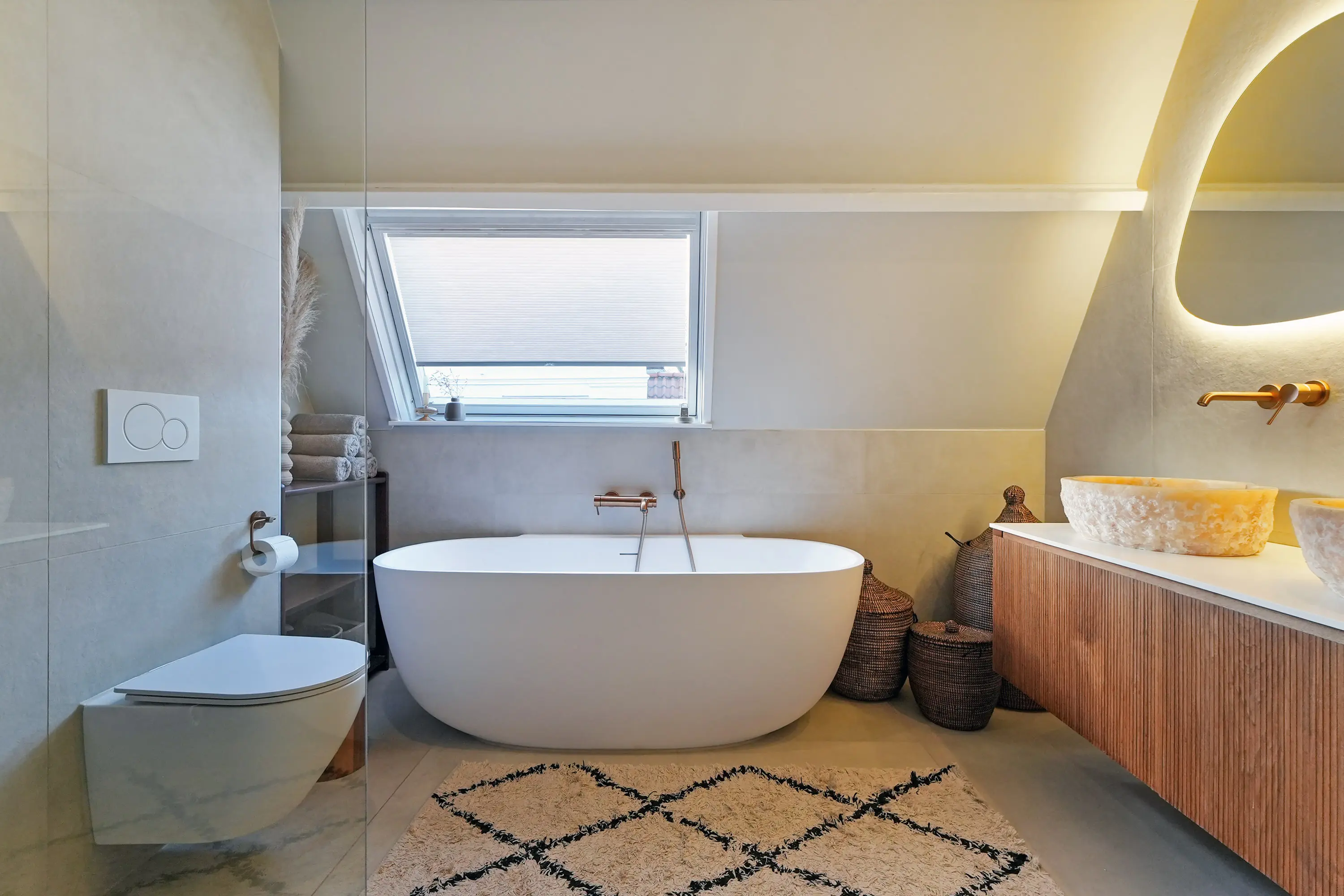 De badkamer vormt een absolute blikvanger: royaal van formaat, met een fantastisch ontwerp en hoogwaardige afwerking. Hier geniet u van een riante inloopdouche met glaswand, een half vrijstaand ligbad en een chic badmeubel met dubbele waskommen. Alles straalt luxe en comfort uit, tot in de kleinste details. Het geheel is met zoveel zorg en stijl gerealiseerd dat het voelt alsof u een designhotel binnenstapt – maar dan gewoon in uw eigen huis.