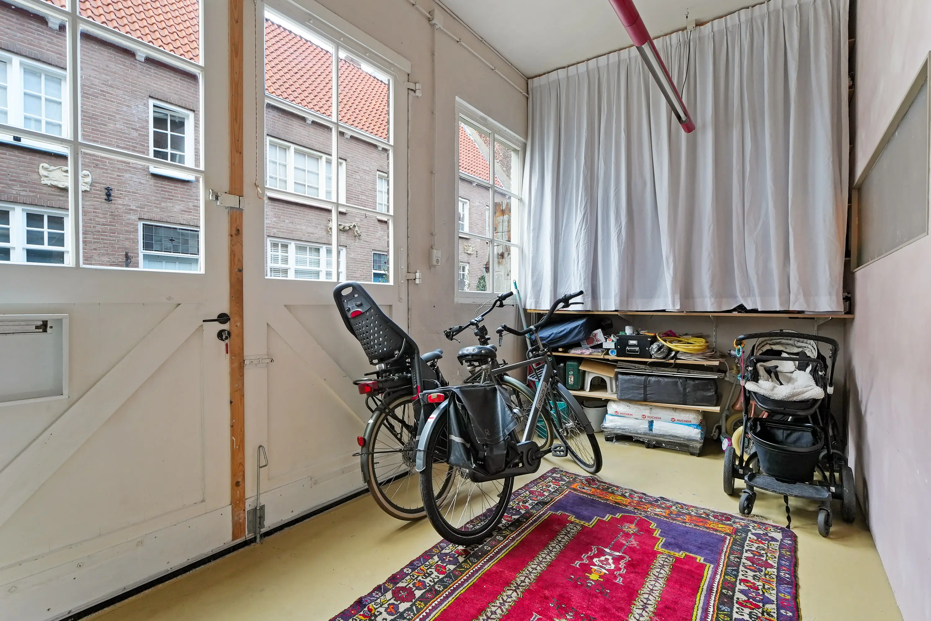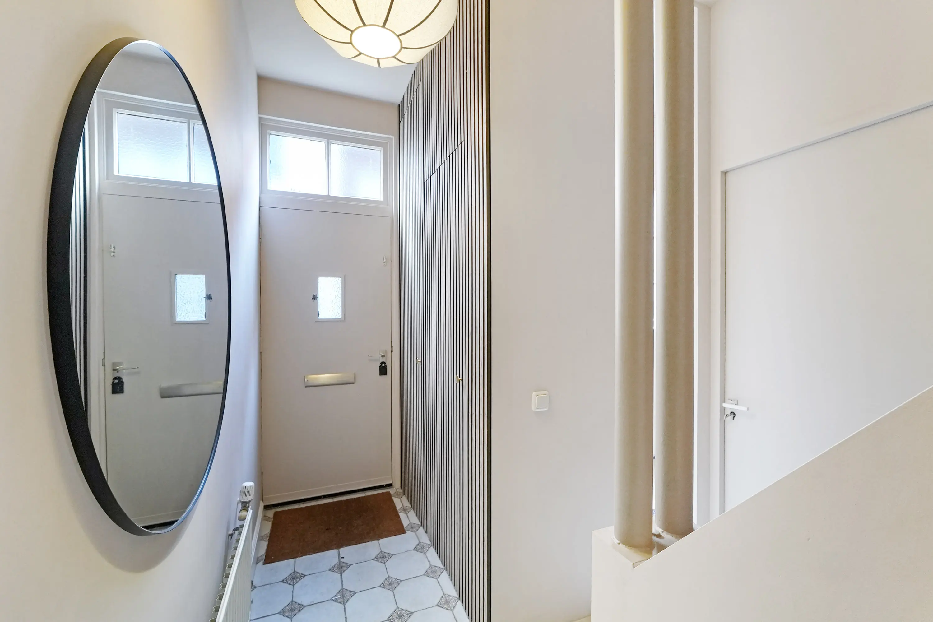 Entree met hal met vernieuwede meterkast, garderobe, trapopgang naar de 1e verdieping en doorgang naar de riante (fietsen)berging aan de straatzijde. Deze berging is vanaf de straat via 2 grote mendeuren te bereiken en dient dus ook als separate ingang voor het te verhuren beneden appartement.