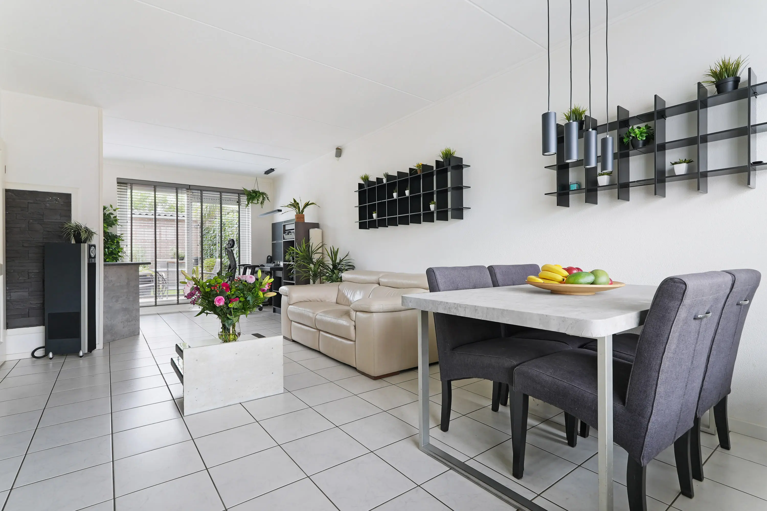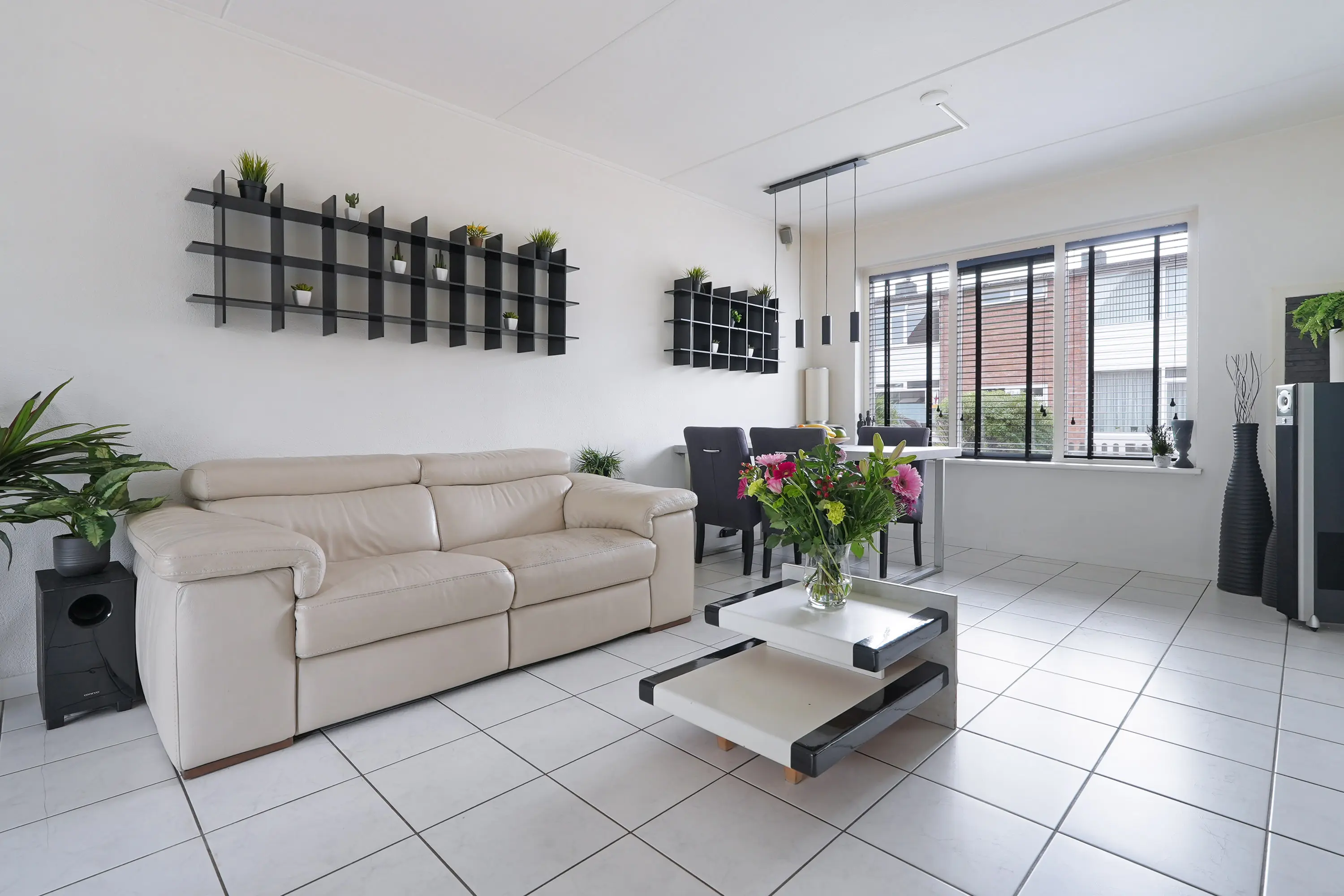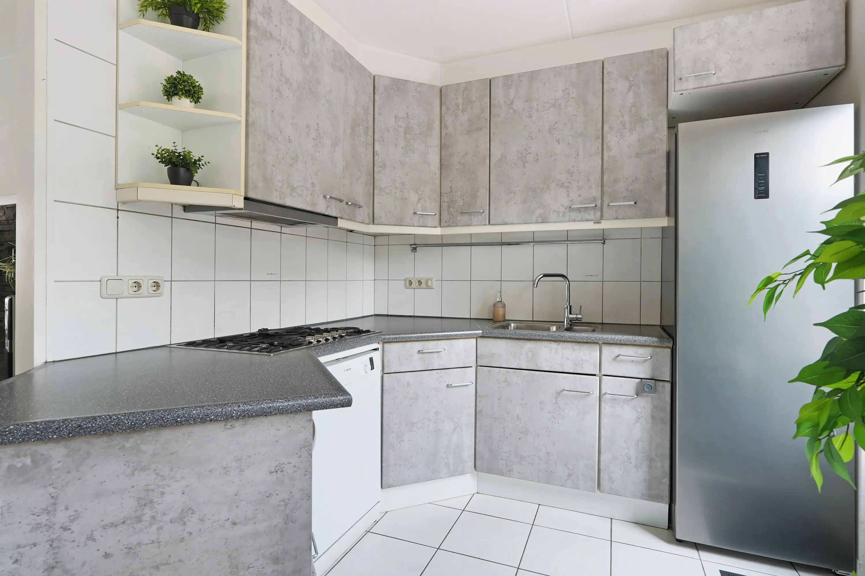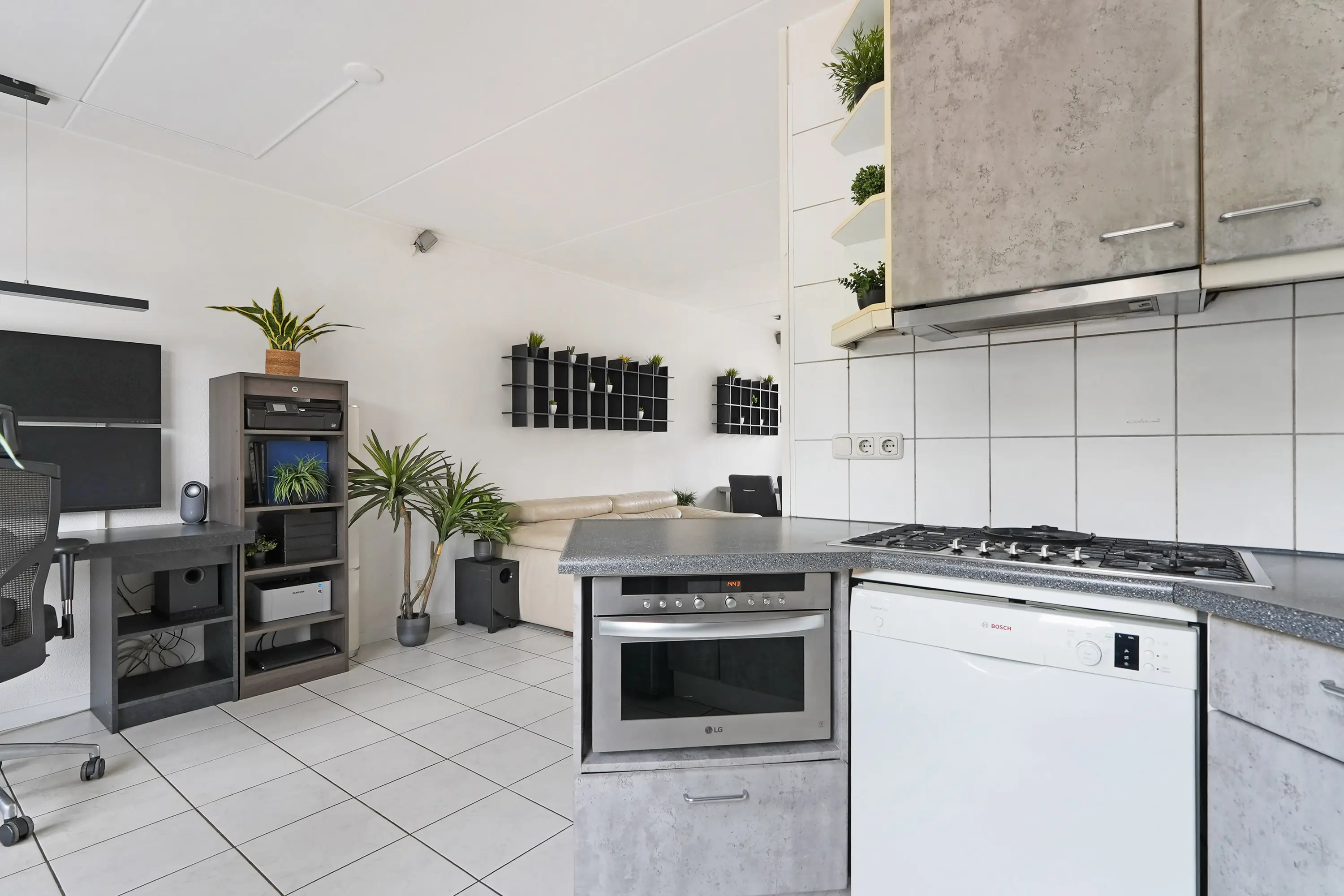 Binnenkomst in de hal met meterkast en toilet (met fonteintje). Vanuit de hal bereikt u de lichte eet- en woonkamer, praktisch ingedeeld en voorzien van veel daglicht dankzij de grote raampartijen. Aan de achterzijde vindt u een schuifpui én een loopdeur vanuit de keuken naar de tuin. De L-vormige keuken is uitgerust met diverse inbouwapparatuur.