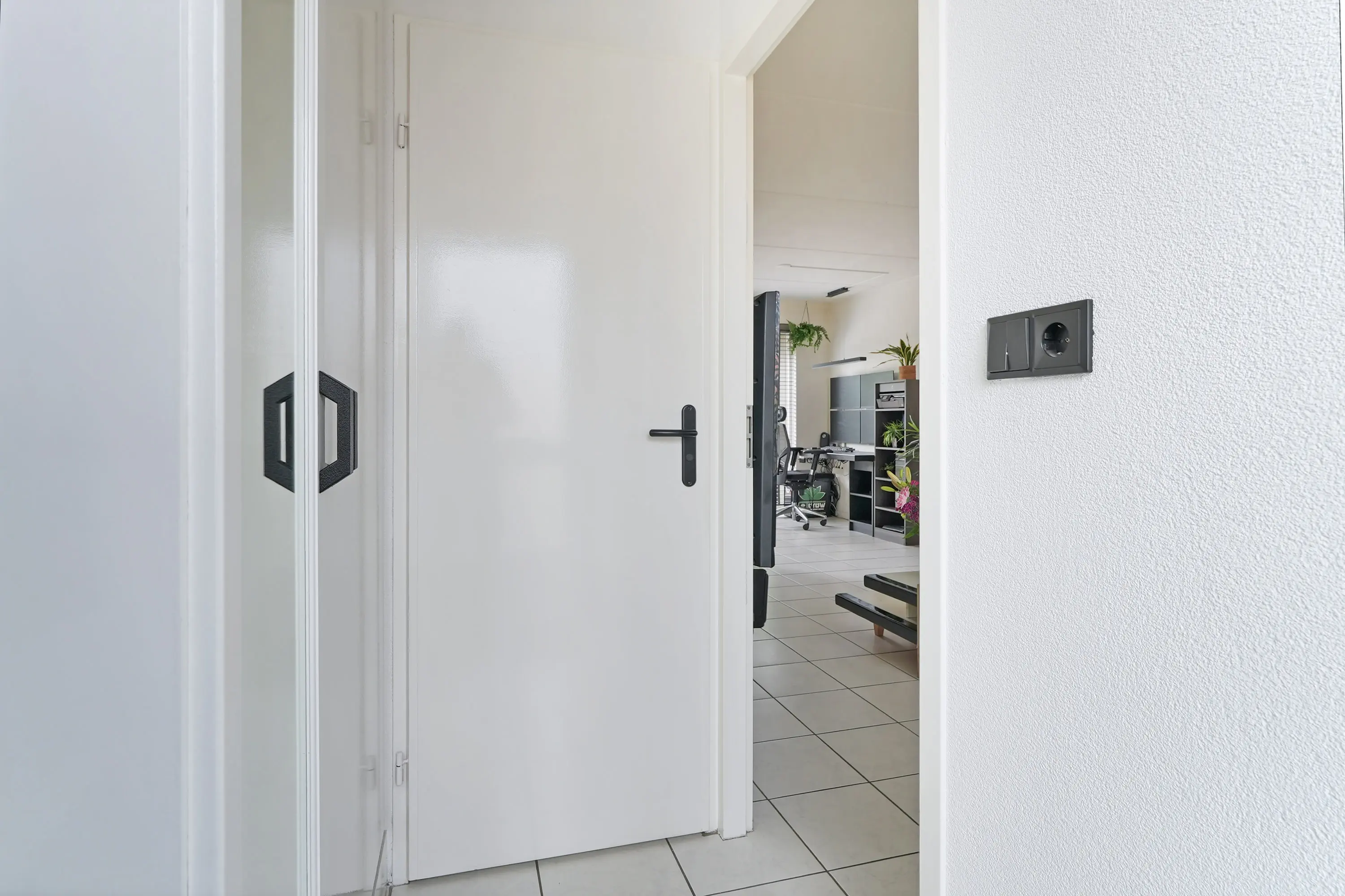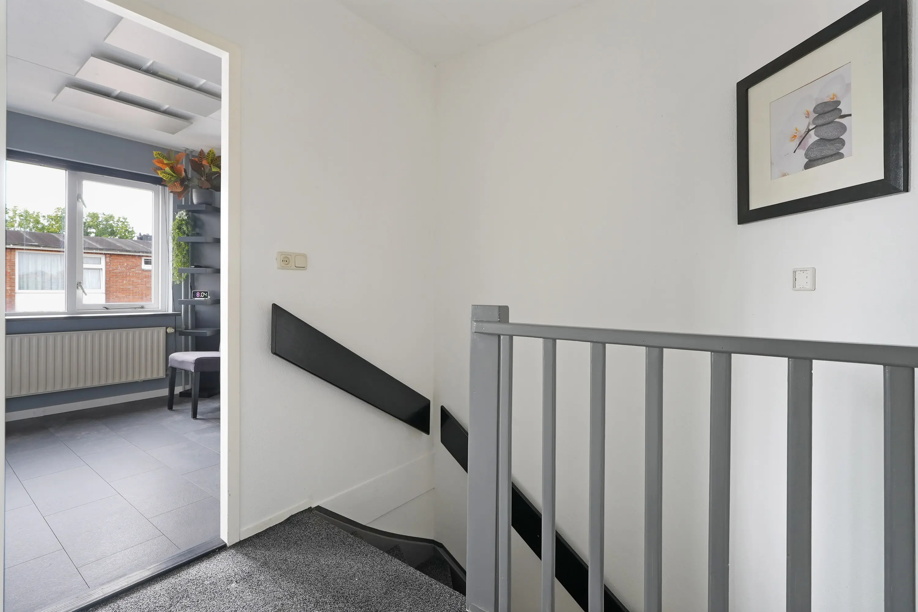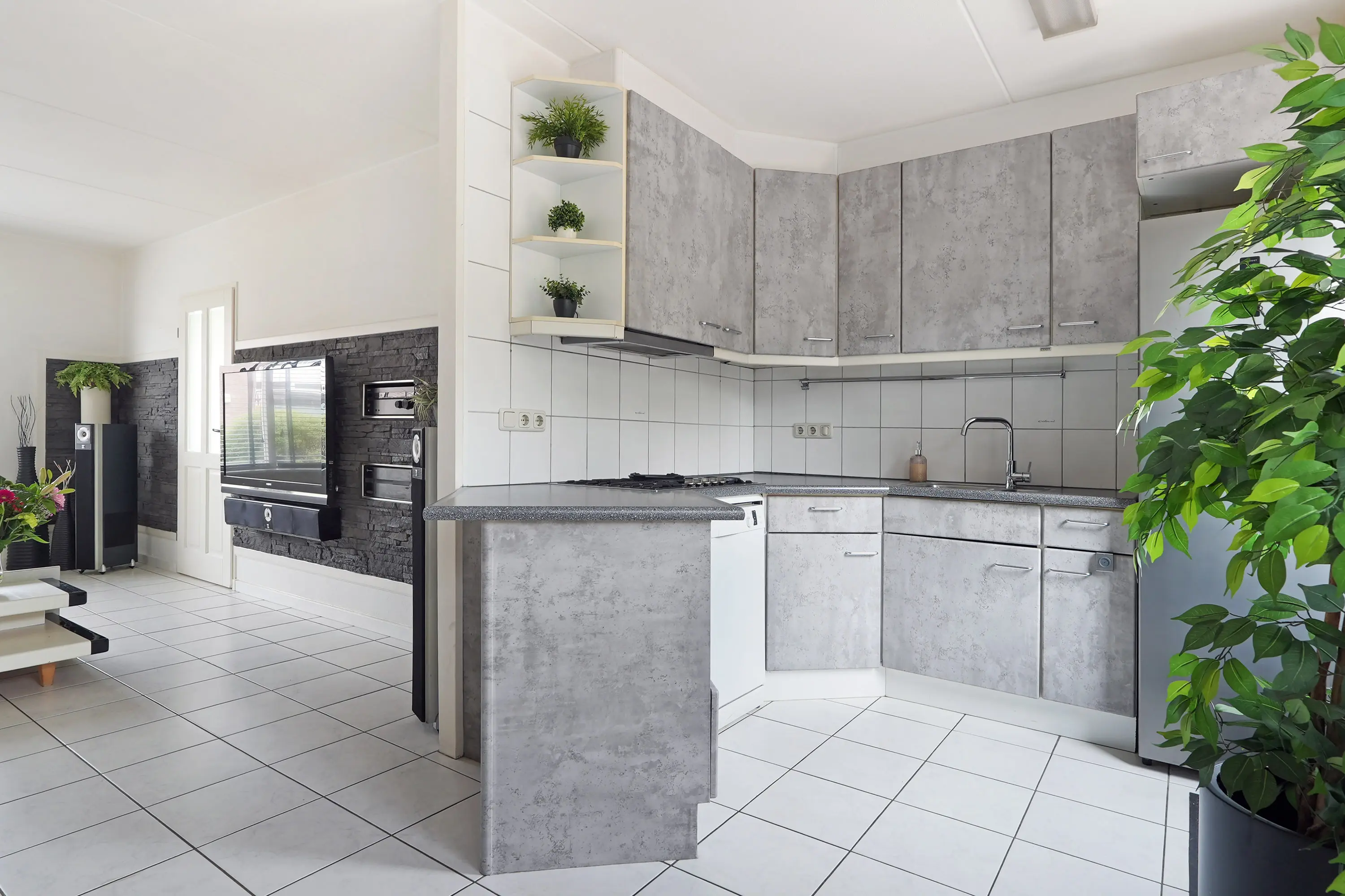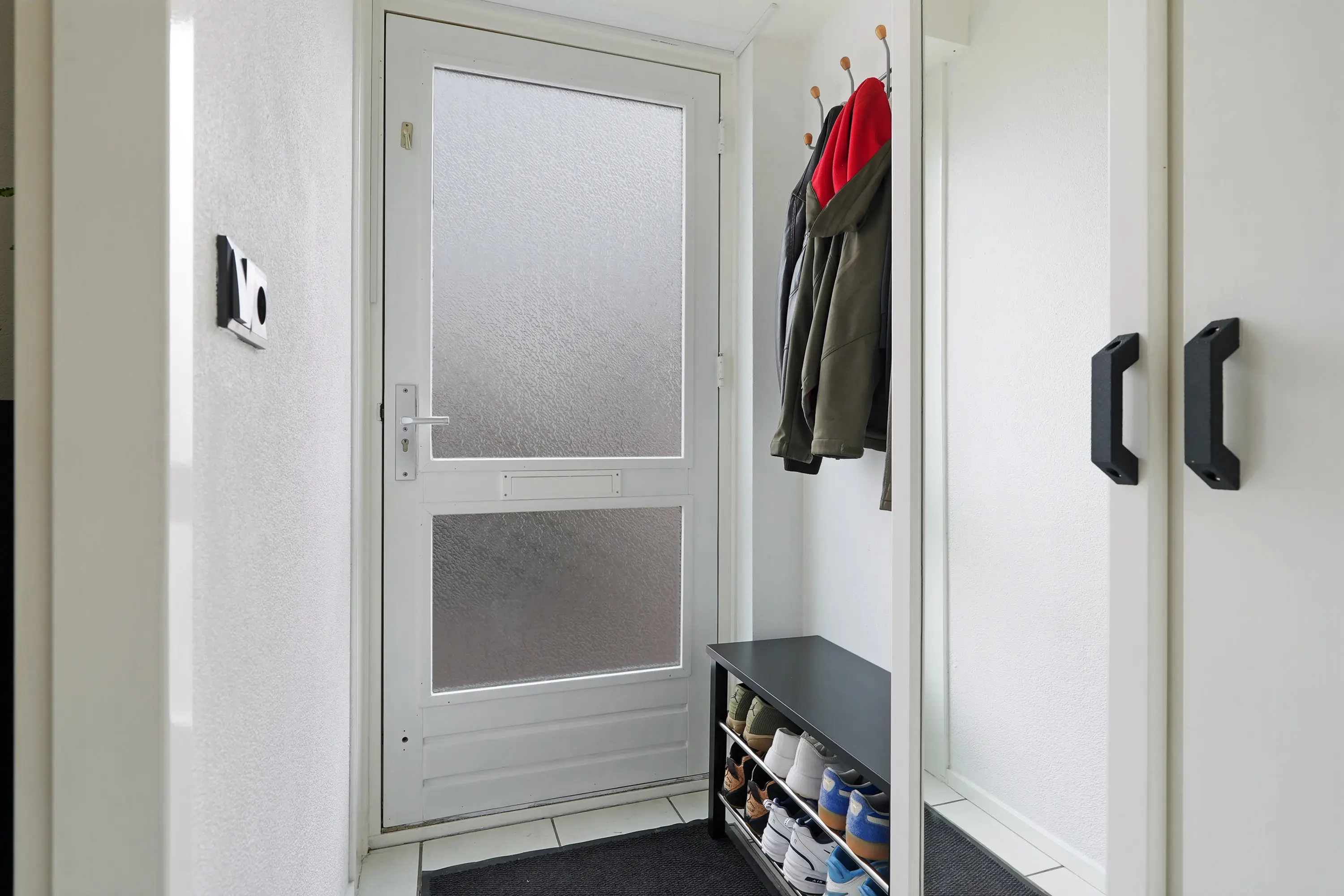 Binnenkomst in de hal met meterkast en toilet (met fonteintje). Vanuit de hal bereikt u de lichte eet- en woonkamer, praktisch ingedeeld en voorzien van veel daglicht dankzij de grote raampartijen. Aan de achterzijde vindt u een schuifpui én een loopdeur vanuit de keuken naar de tuin. De L-vormige keuken is uitgerust met diverse inbouwapparatuur.