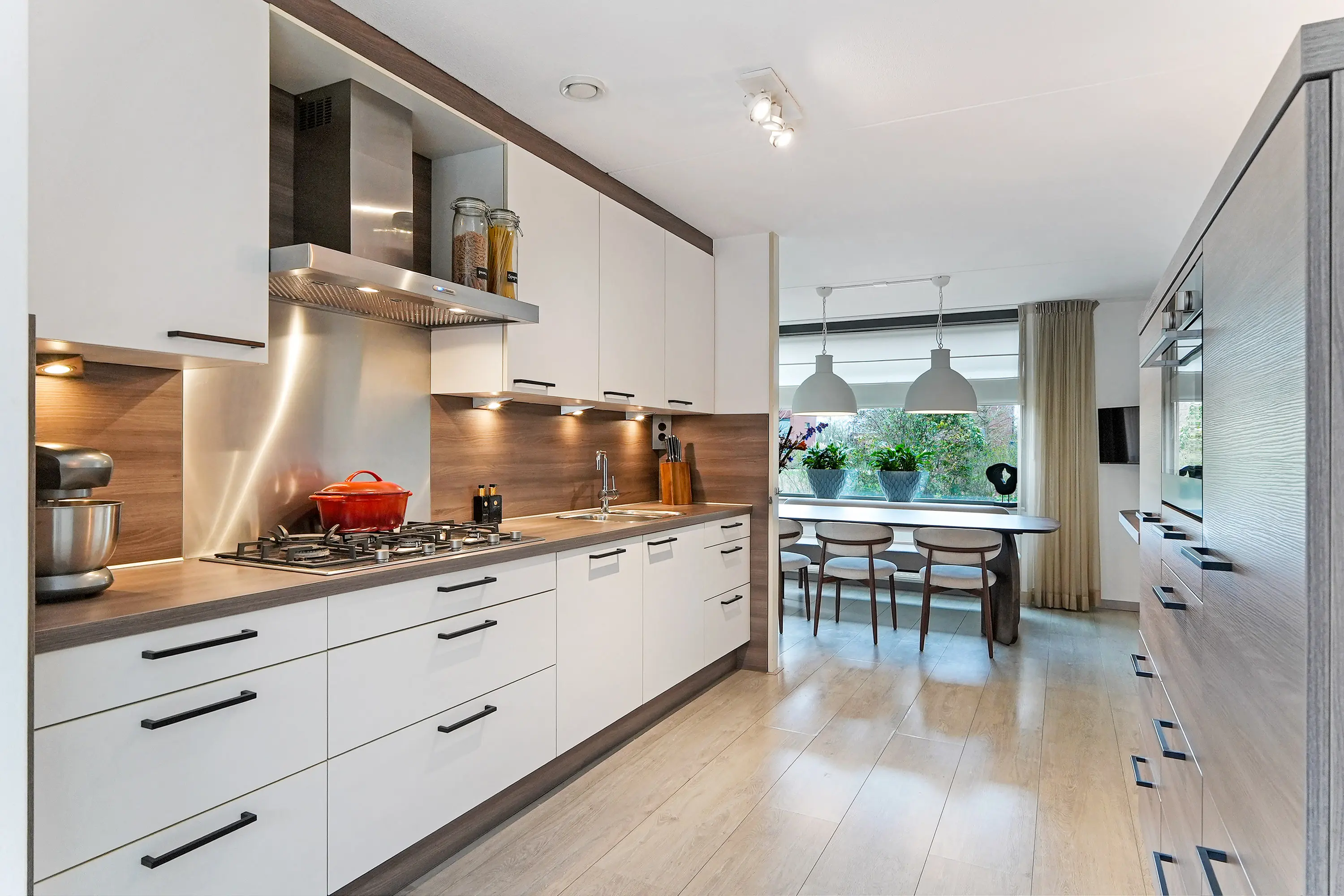 De open keuken bevindt zich in het midden van de woning. De keuken is modern uitgevoerd en voorzien van diverse inbouwapparatuur, waaronder een vaatwasser (2022) en een combimagnetron (2023) én veel kastruimte! Een prachtig totaalplaatje! Vanuit de keuken bereikt u de eetkamer aan de voorzijde. Een ideale en praktische zithoek. De neutrale en moderne vloer verbindt hier de ruimtes mooi met elkaar.