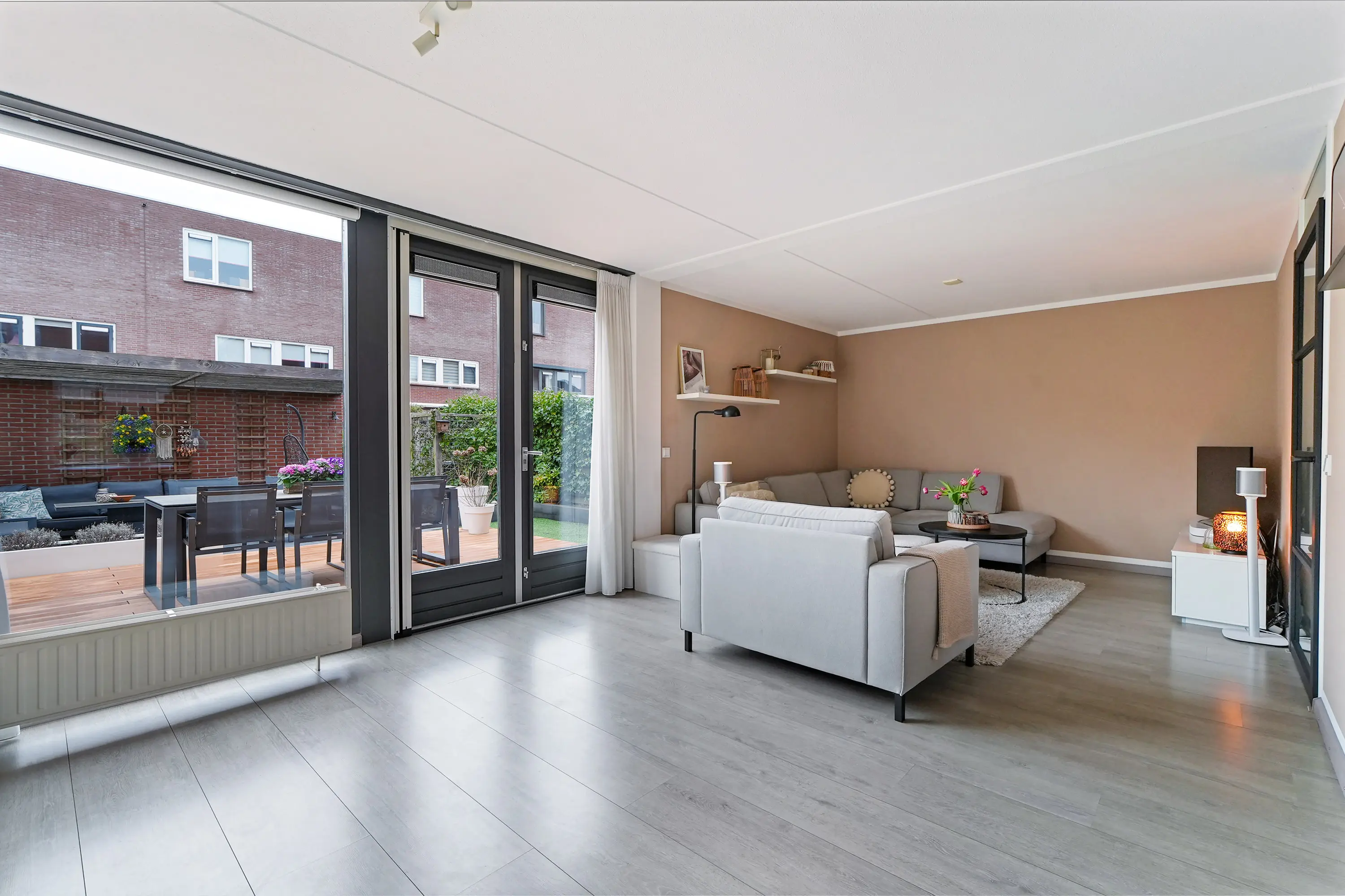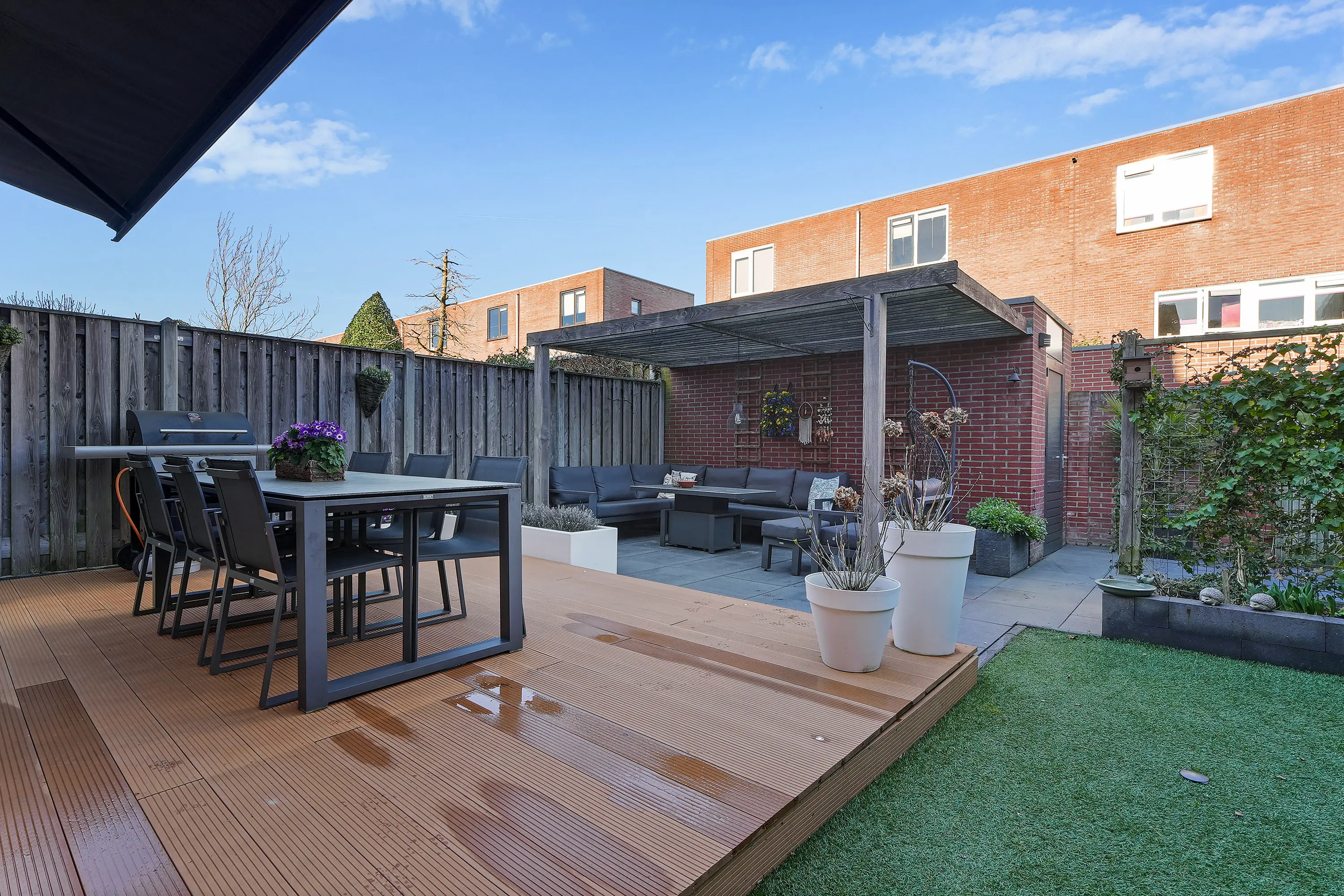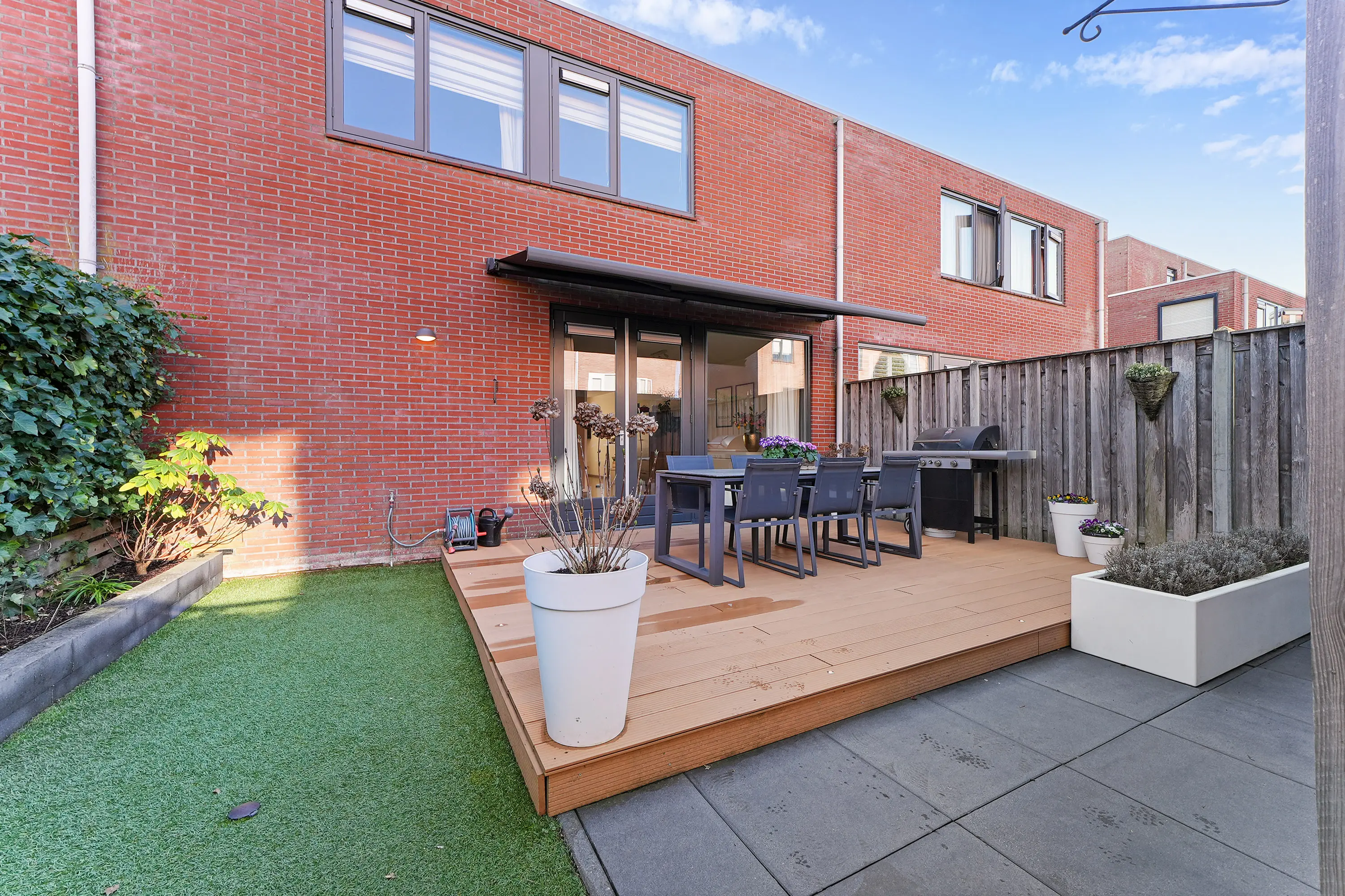 De recent nieuw aangelegde achtertuin vormt een absoluut pluspunt van deze woning. De tuin is stijlvol en onderhoudsvriendelijk ingericht en biedt meerdere zitmogelijkheden om optimaal van zon en privacy te genieten. Dankzij de achterom is de tuin praktisch bereikbaar, ideaal voor fietsen of tuinonderhoud.