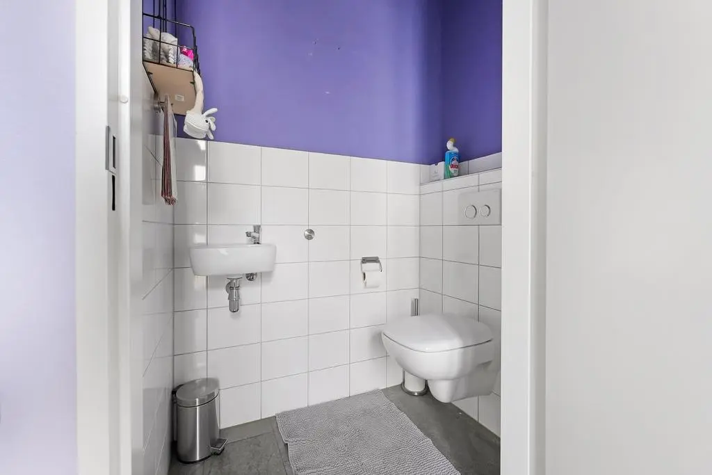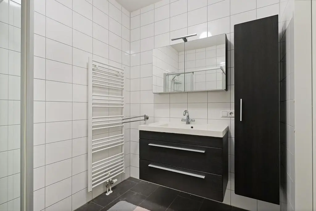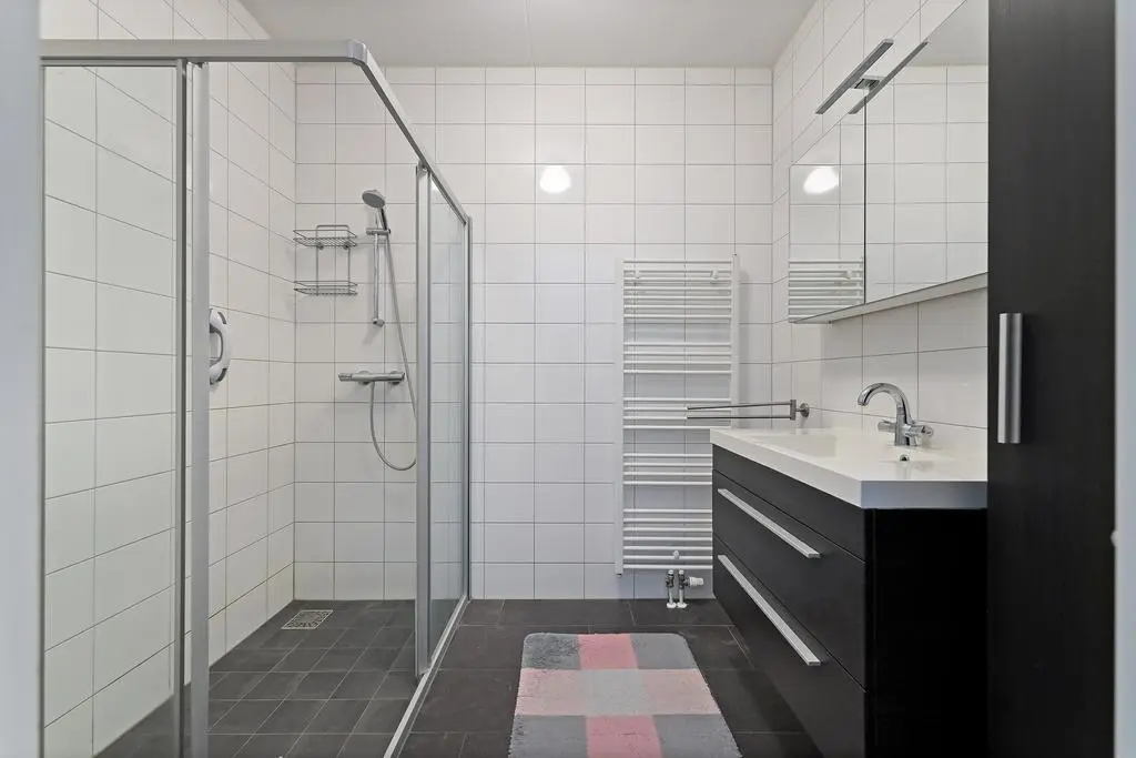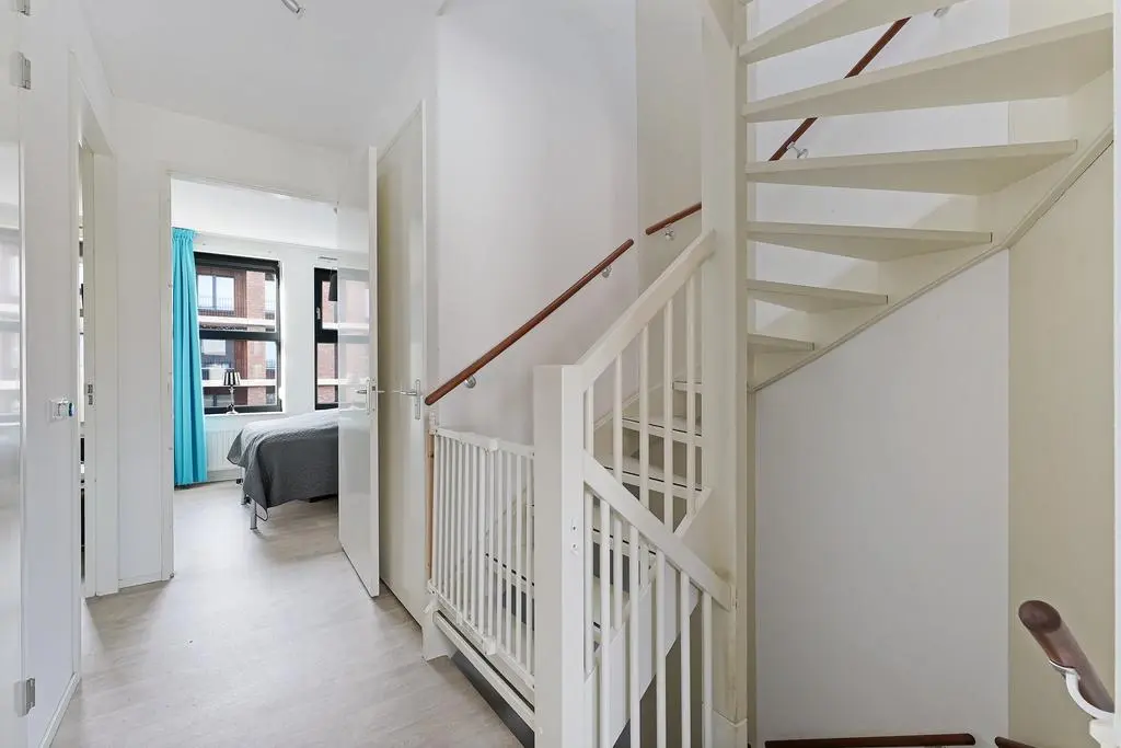 Overloop met vaste trap naar de 2e verdieping, drie mooie slaapkamers, waarvan twee met zonnescreen, volledig betegelde en moderne badkamer voorzien van douchecabine, wastafelmeubel en design-radiator en tenslotte een separaat toilet met fonteintje.