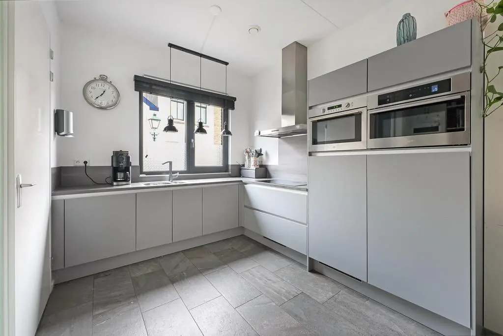 Hal, moderne toilet met fonteintje, open moderne keuken met de inrichting in een hoekopstelling en inbouwapparatuur: inductiekookplaat / wasemkap / 2x combi-magnetron / koelkast / vaatwasser, tuingerichte woonkamer met trapkast, toegang tot de deur naar de 1e verdieping en dubbele tuindeur.