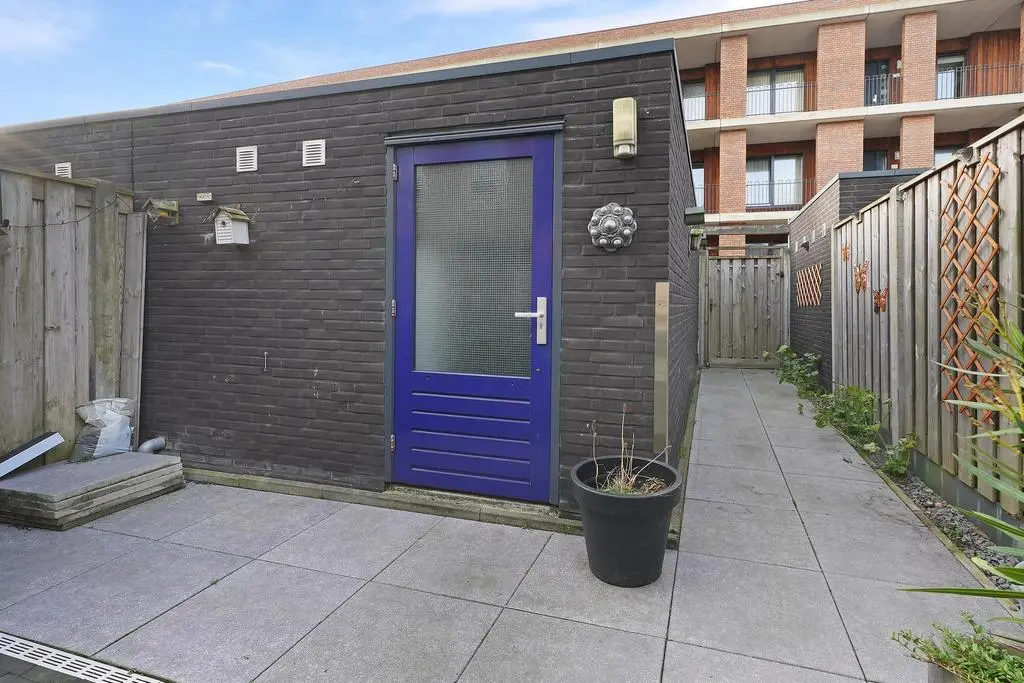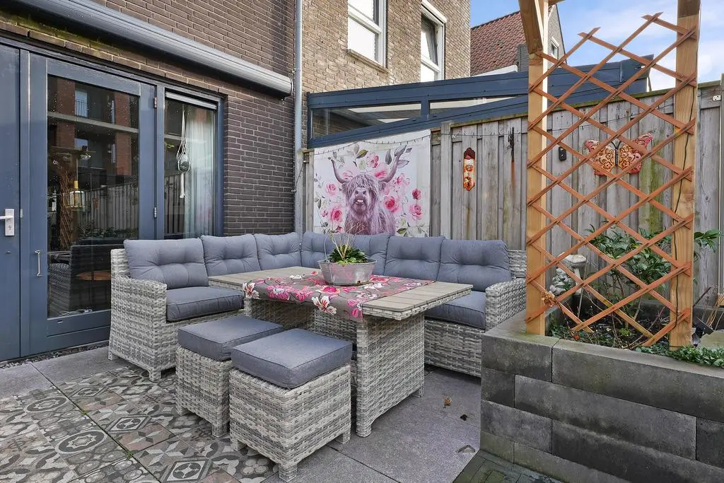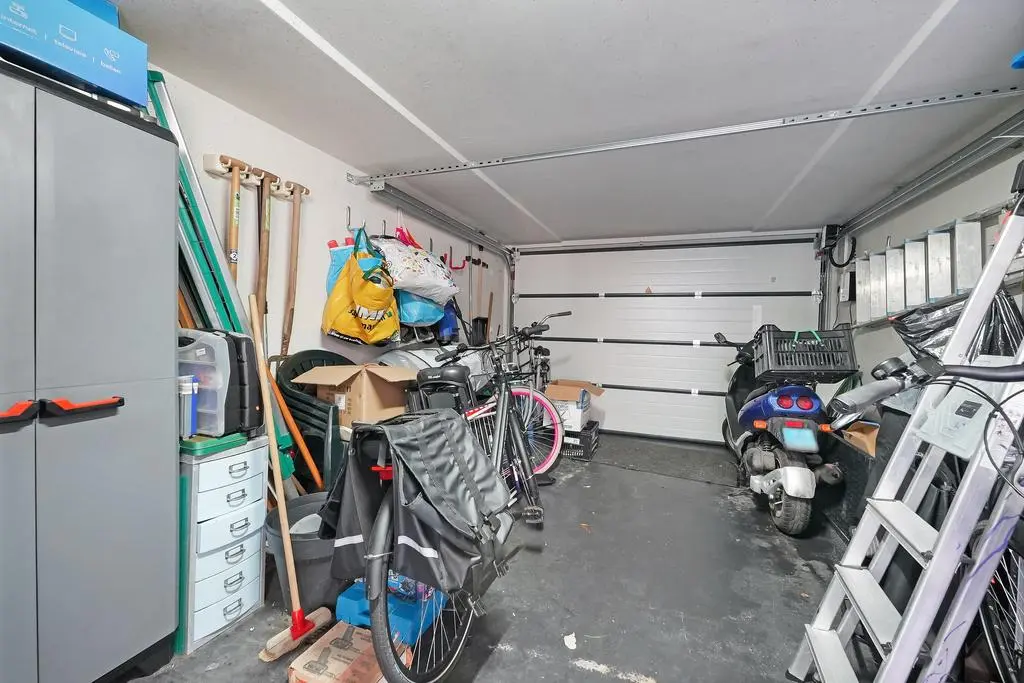 De zonnige achtertuin op het zuidwesten is voorzien van buitenkraan, achterom en halfvrijstaande betonnen garage met elektrisch bedienbare sectional deur, elektra en verlichting.