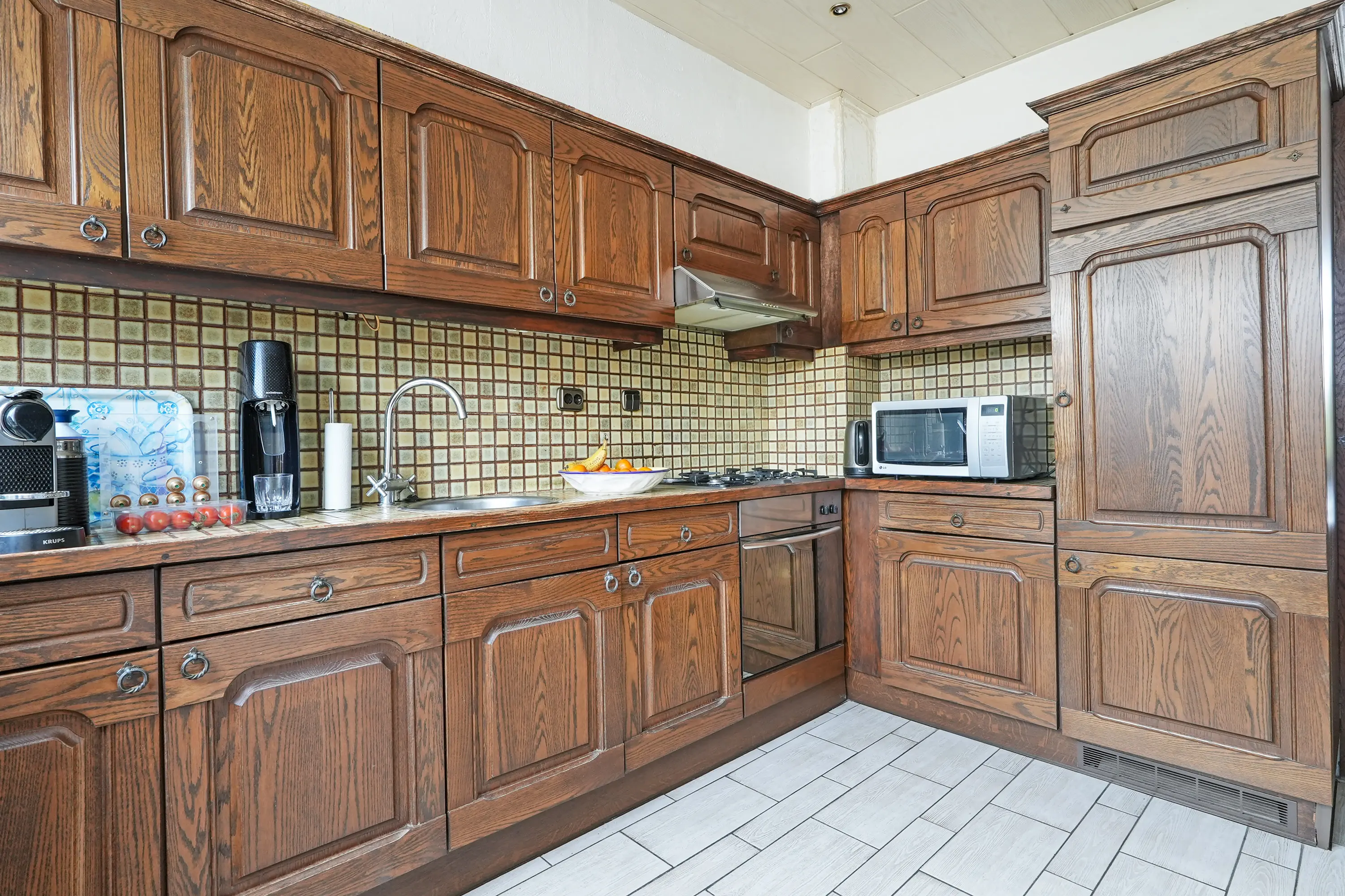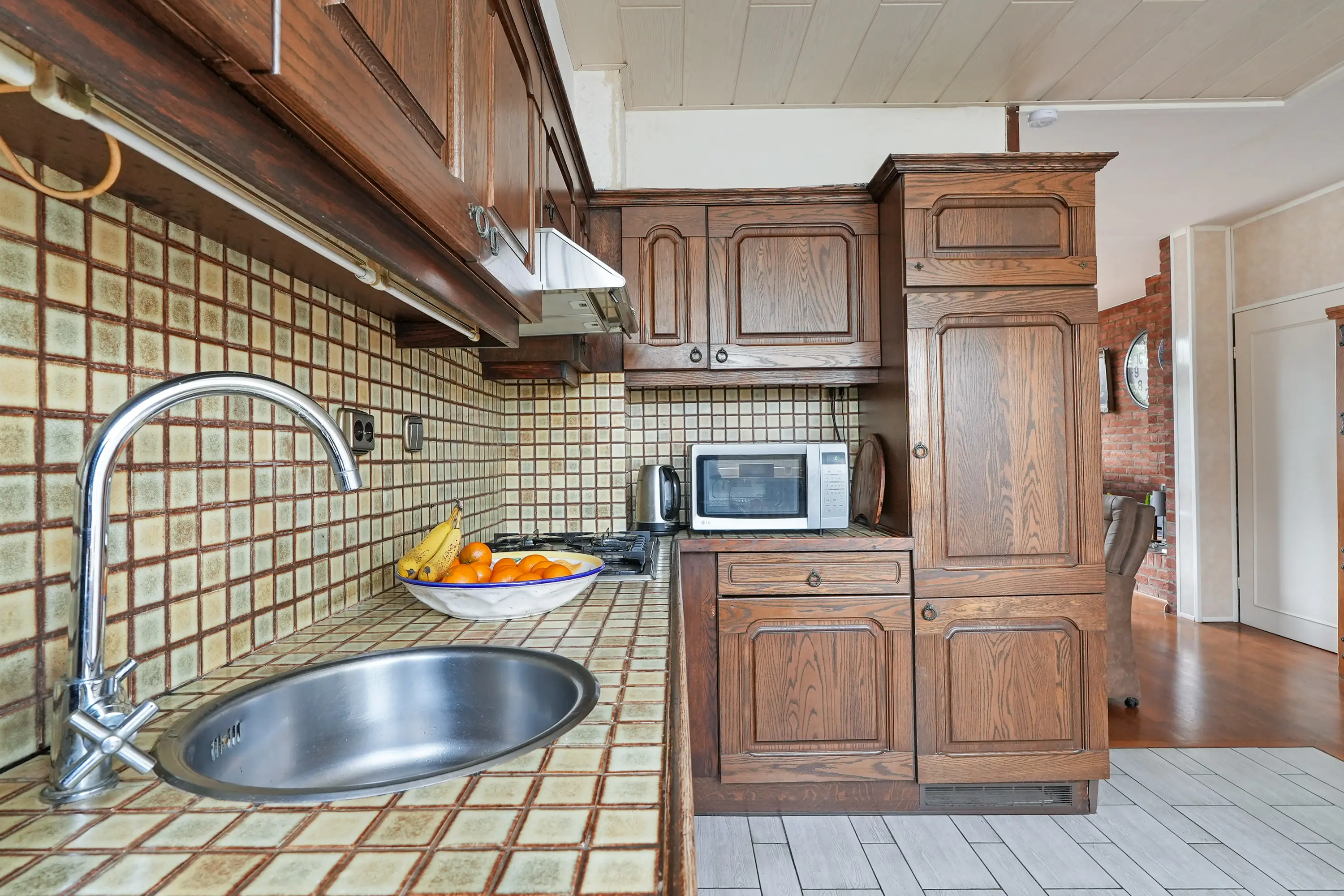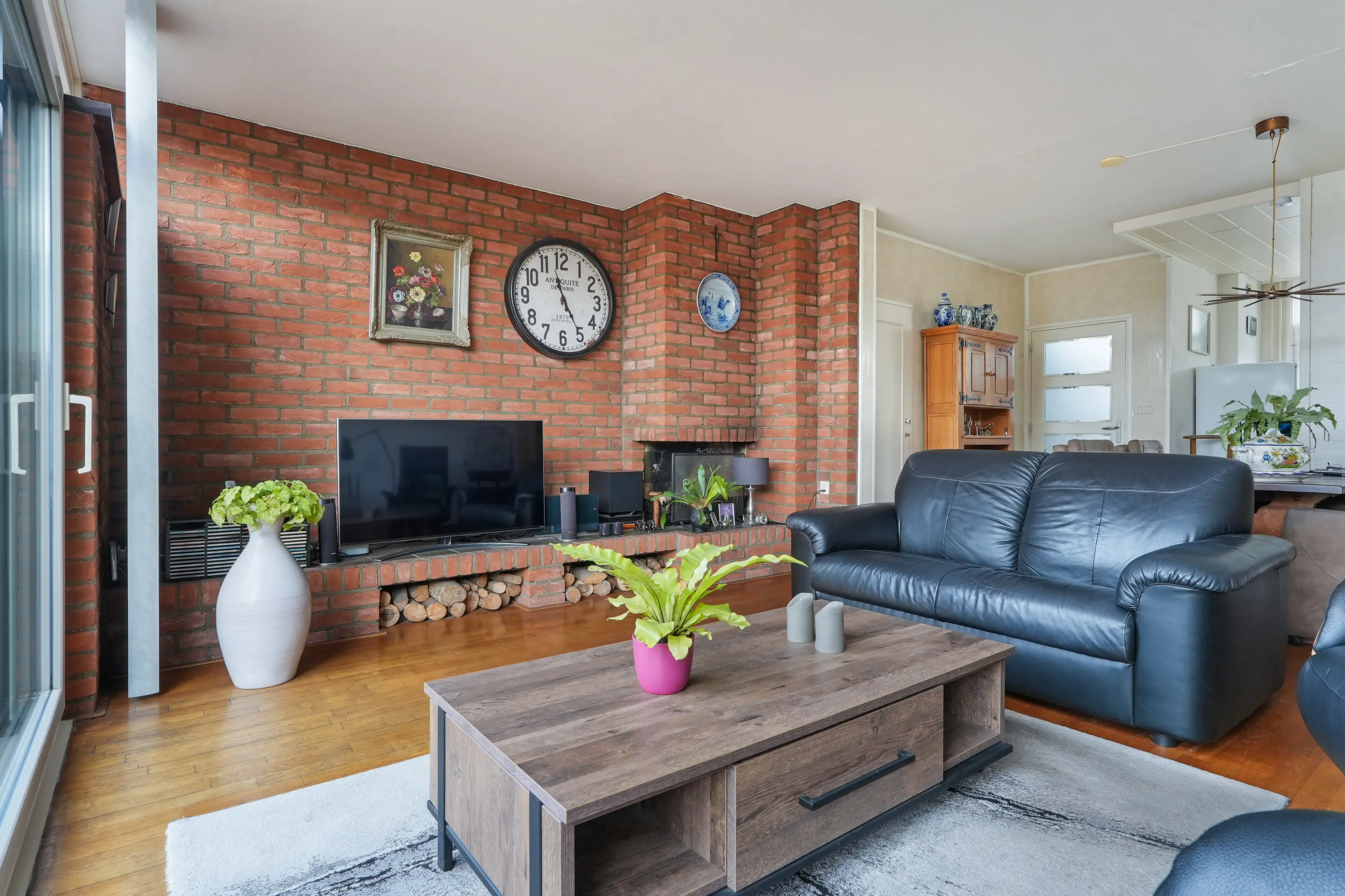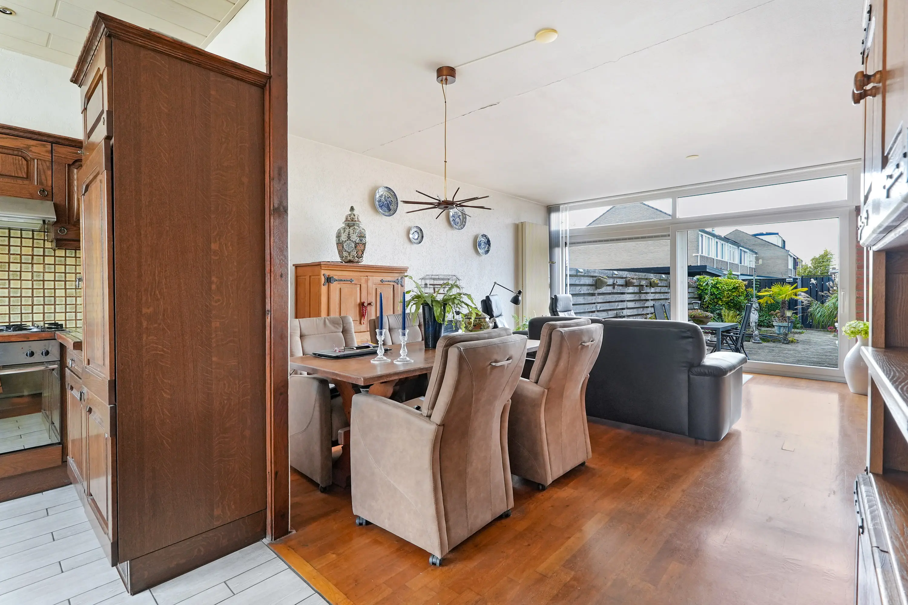 Hal, toilet met fonteintje, open keuken met de inrichting in een hoekopstelling, boven- en onderkasten en elektrisch bedienbaar rolluik en lichte, tuingerichte woonkamer met trapkast, open haard, elektrisch bedienbaar zonnescherm en schuifpui naar de zonnige tuin.