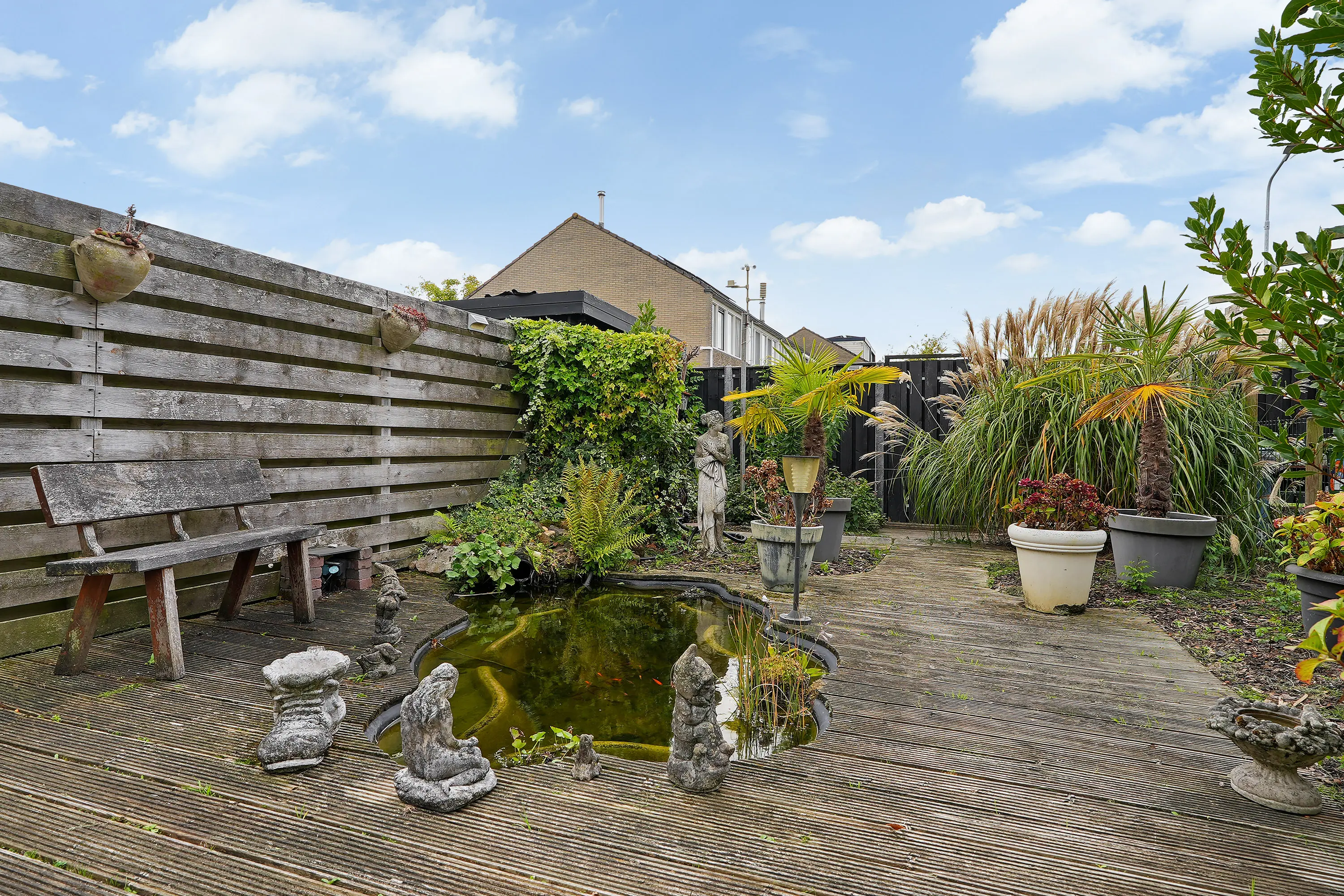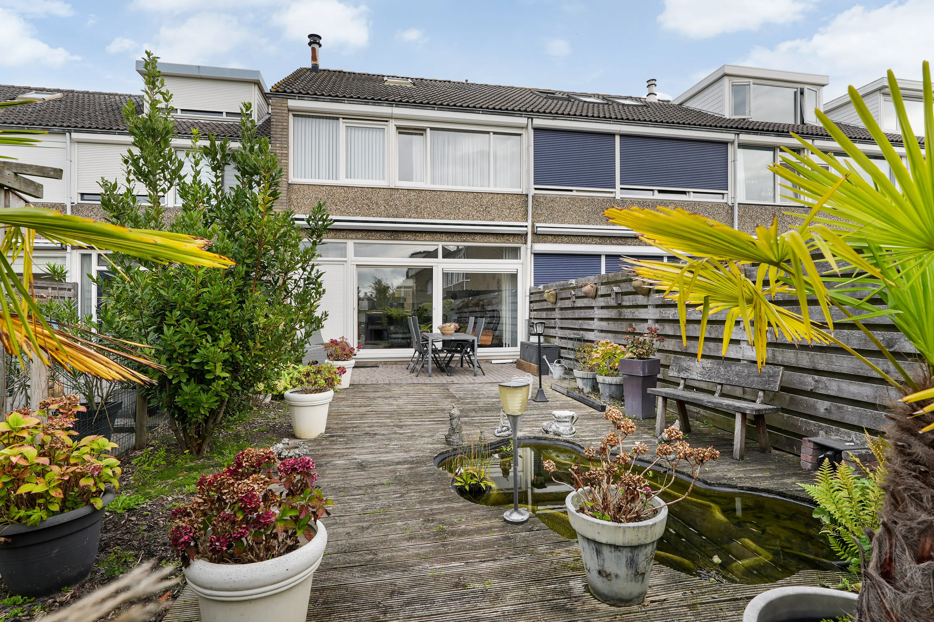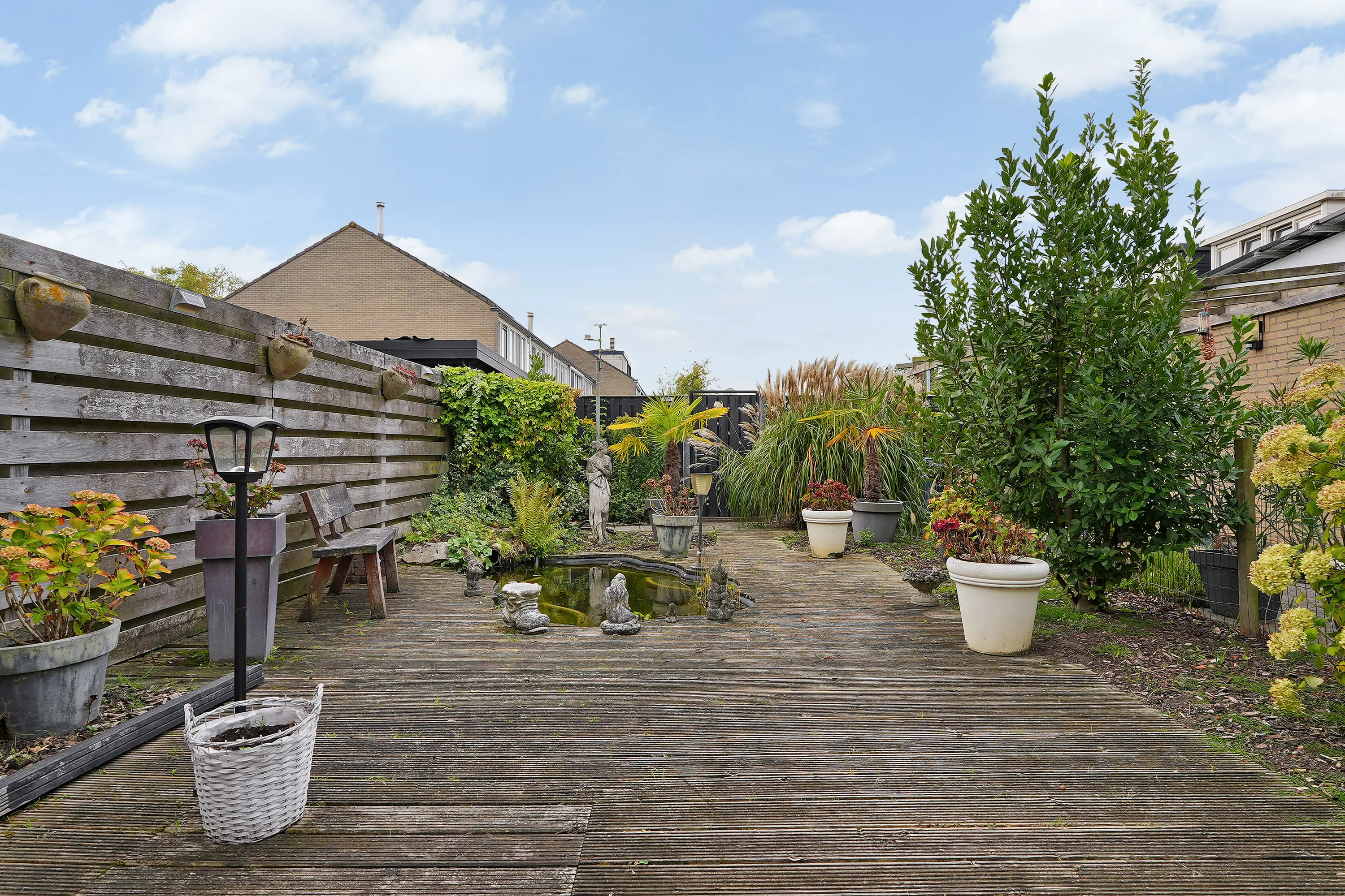 De zonnige achtertuin op het zuiden is voorzien van achterom en de diepe voortuin is voorzien van stenen berging met elektra en verlichting.