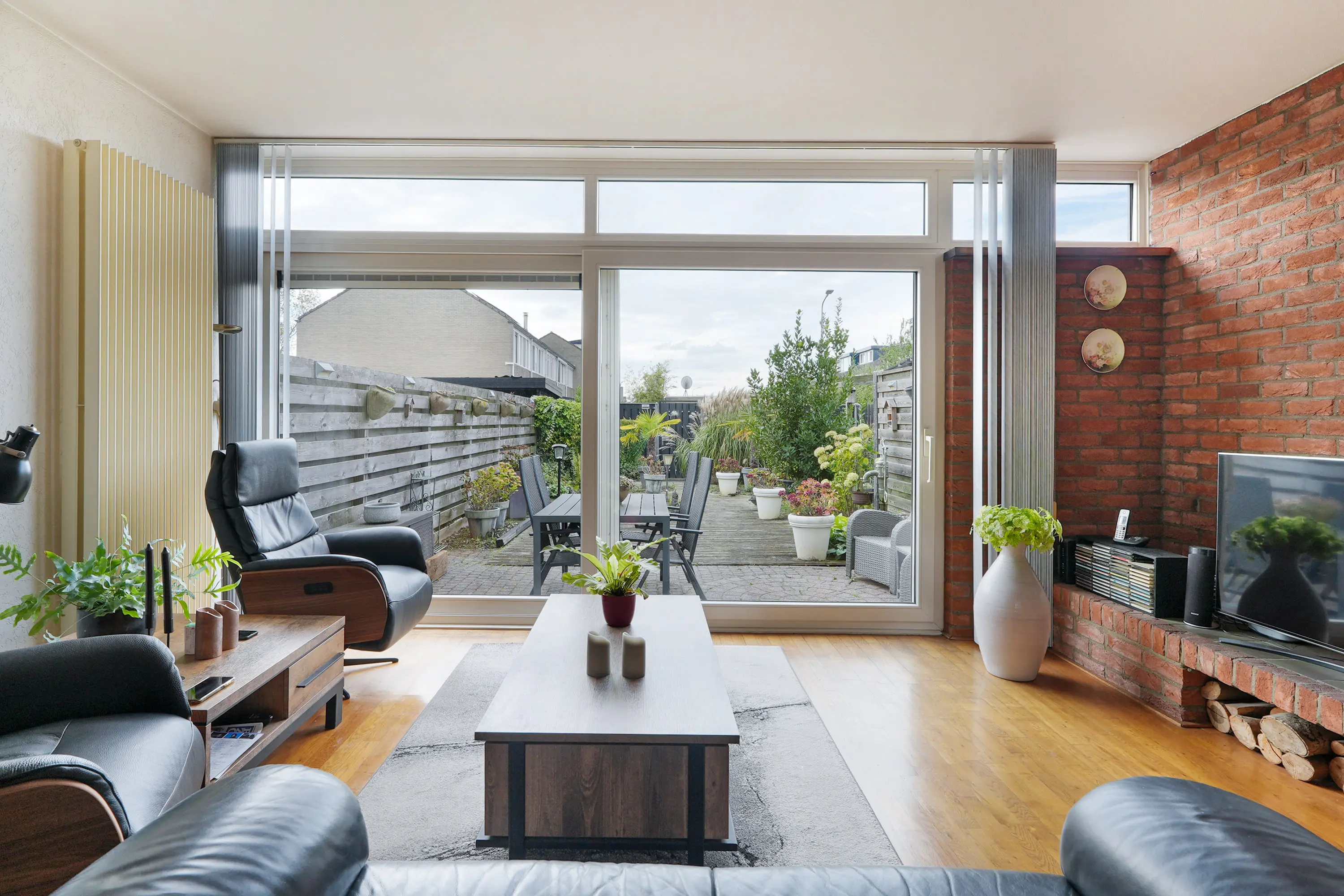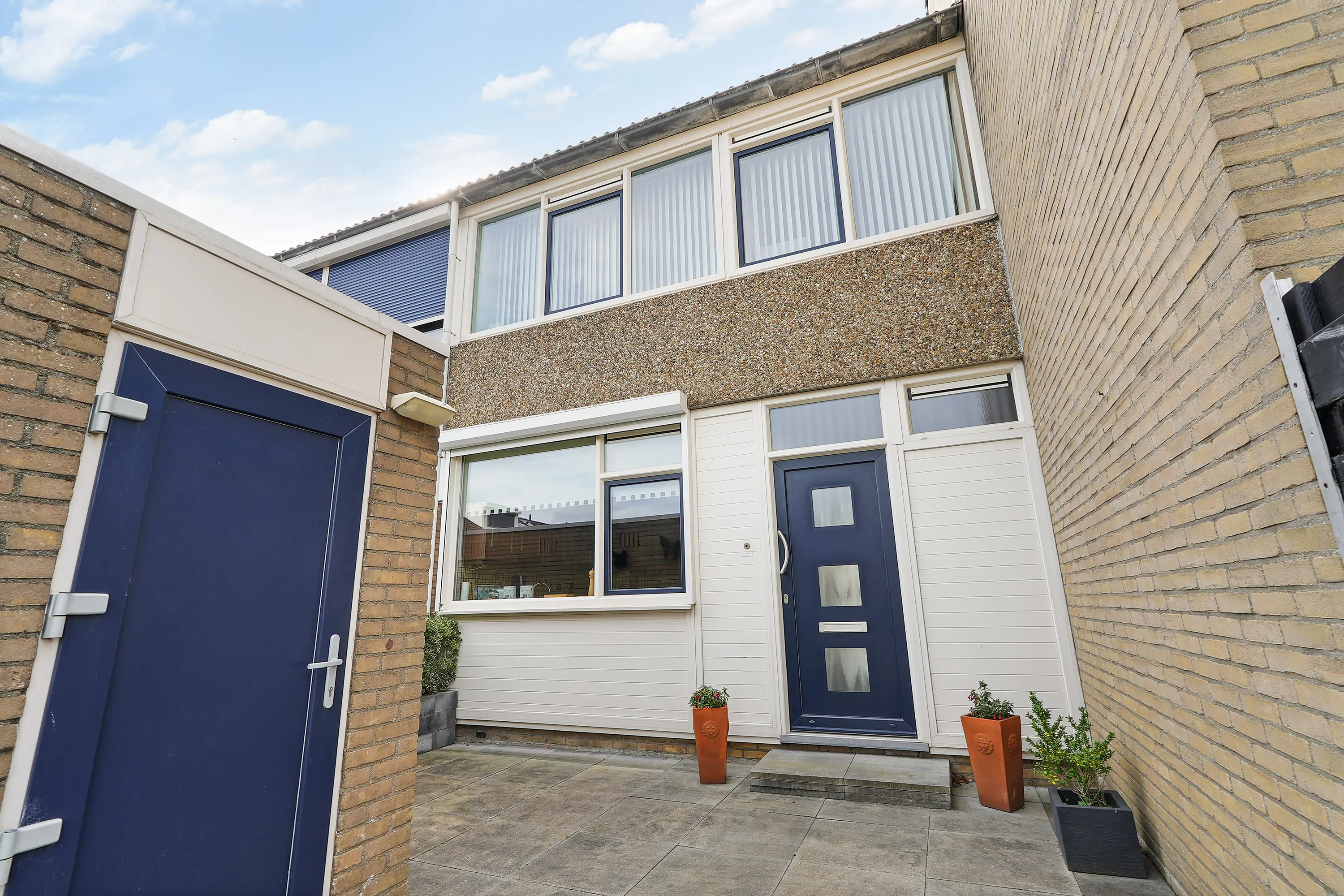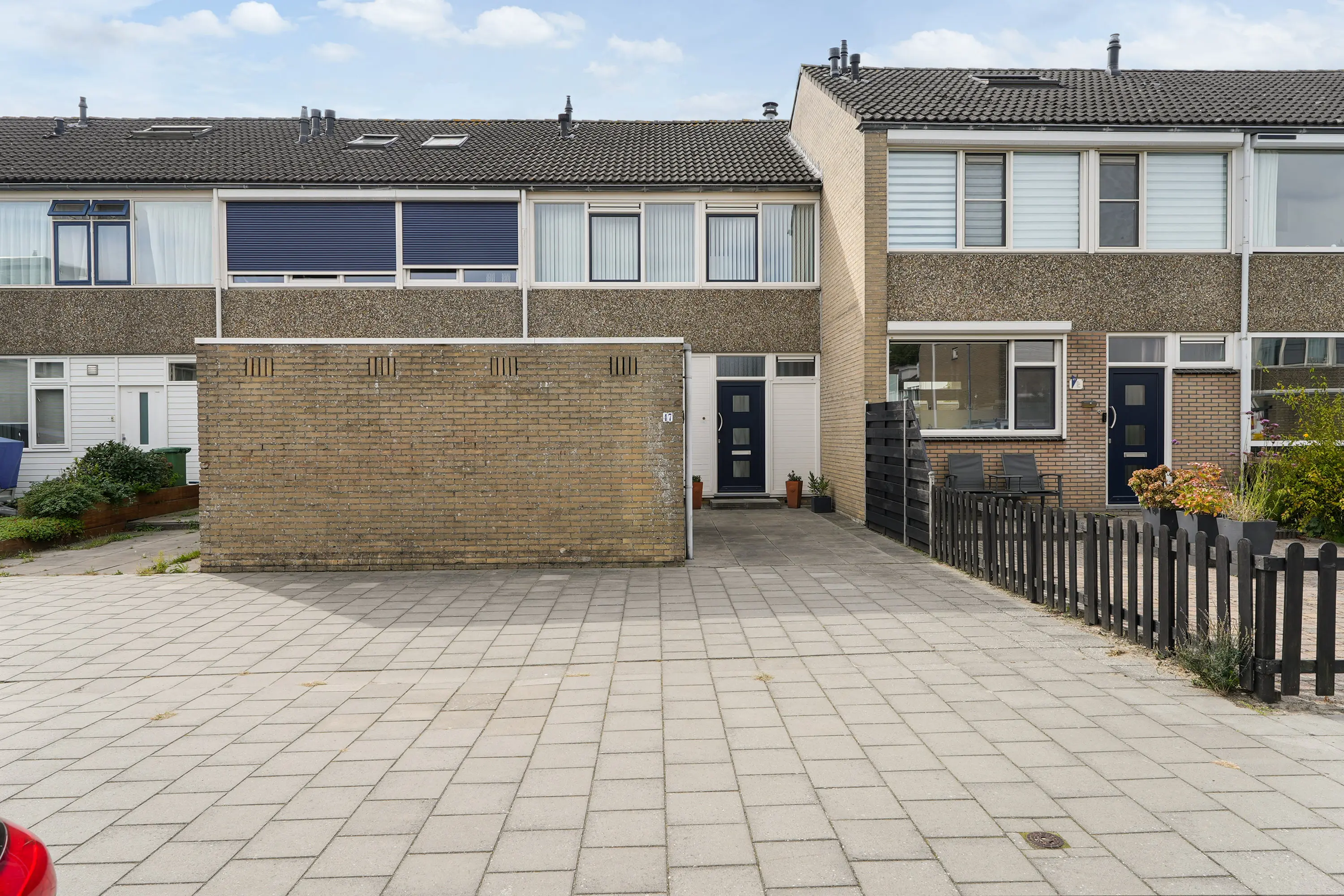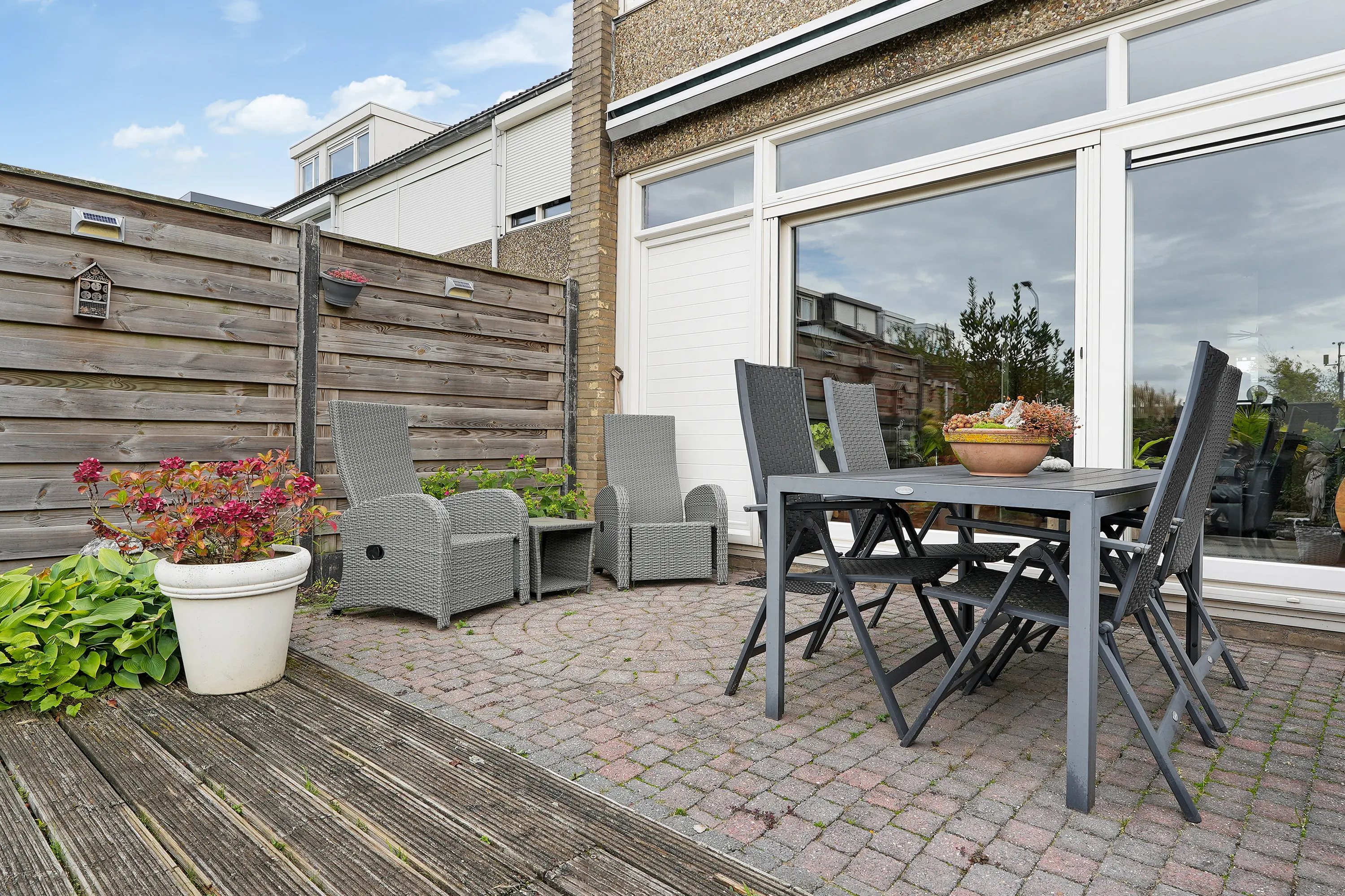 De zonnige achtertuin op het zuiden is voorzien van achterom en de diepe voortuin is voorzien van stenen berging met elektra en verlichting.