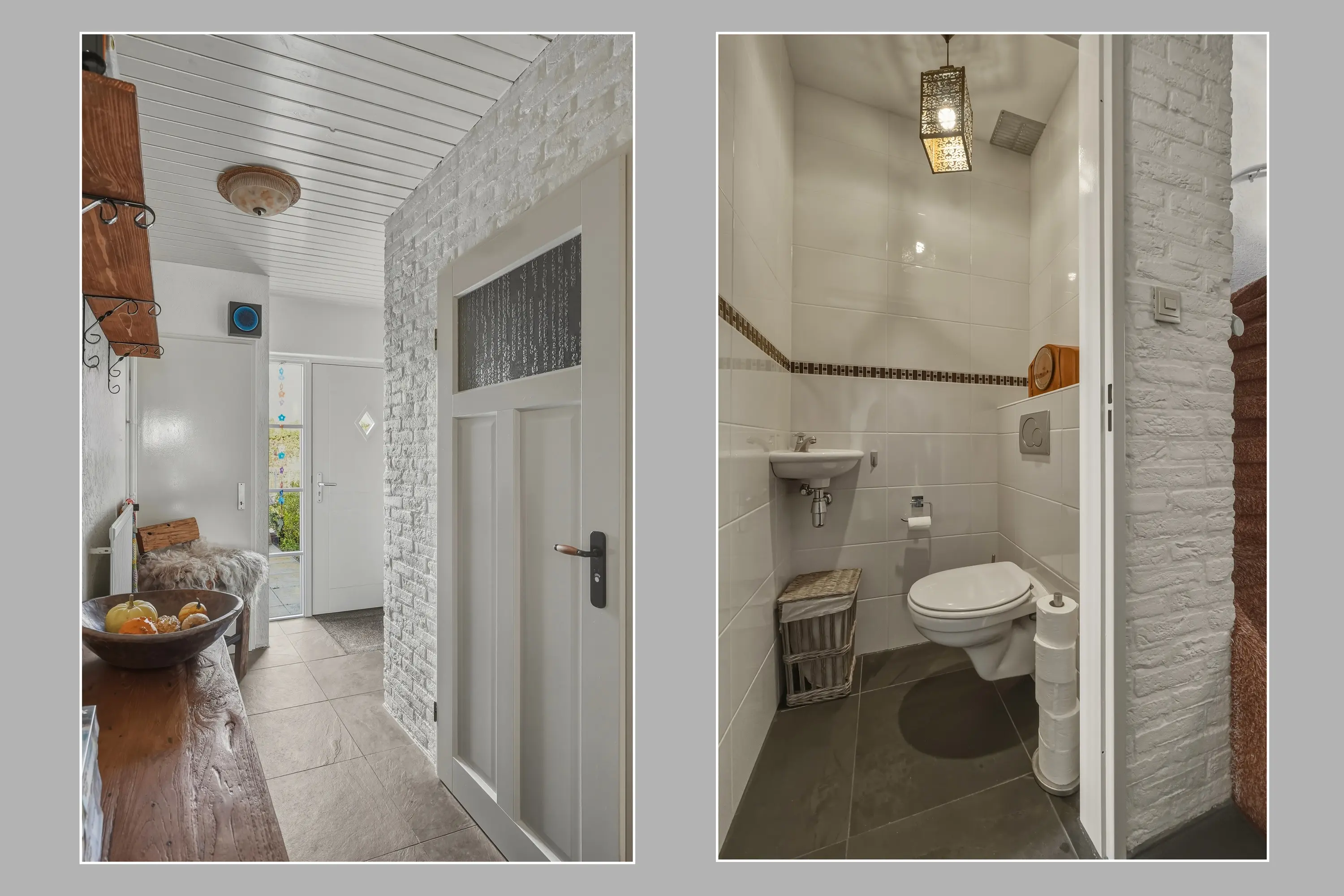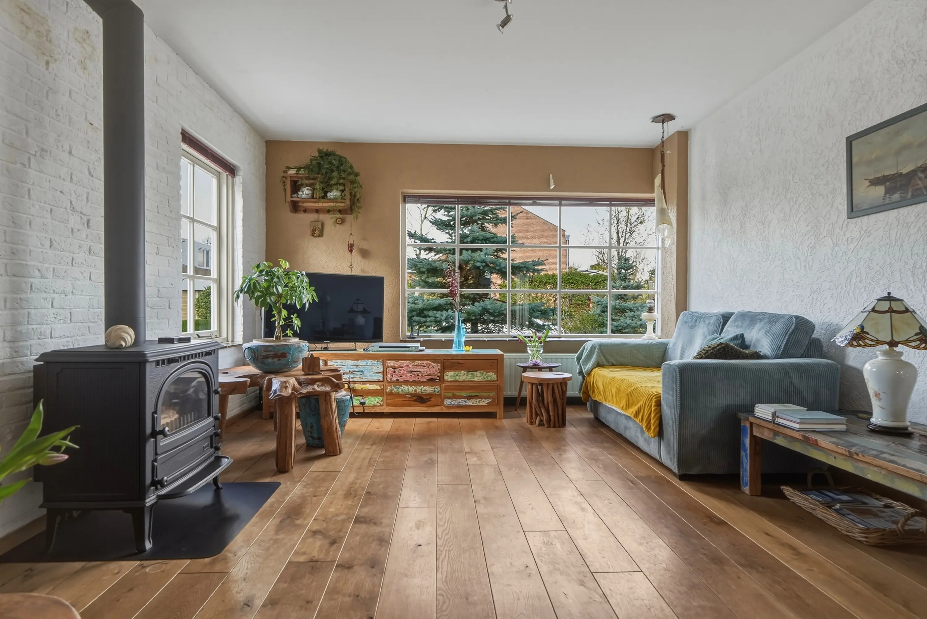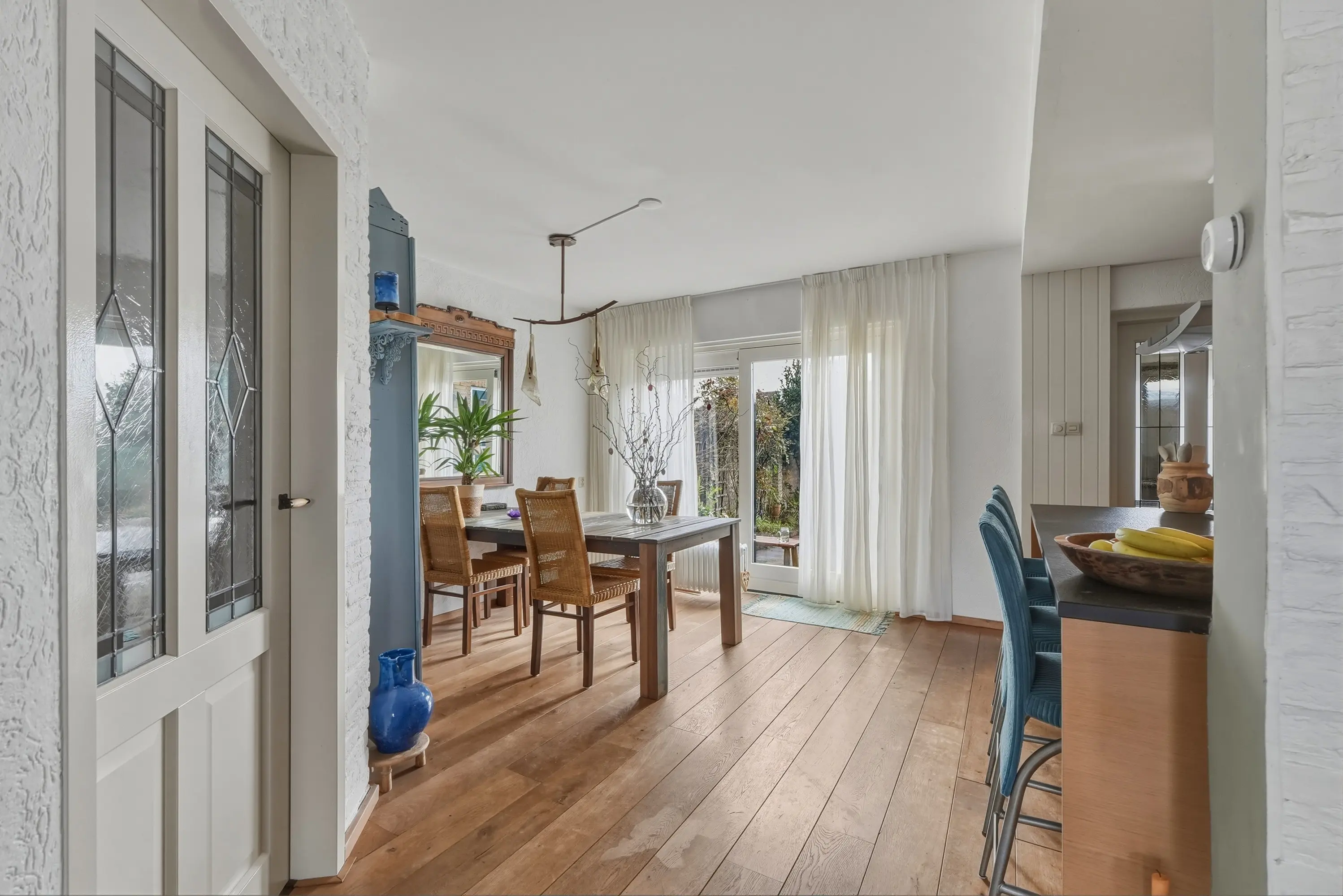 Via de entree komt u in de hal met meterkast (6 groepen), toilet en trapopgang. Vanuit hier bereikt u de woonkamer. De woonkamer is aan de voorzijde gelegen en geniet van veel daglicht dankzij de grote raampartijen. De speelse indeling en de open verbinding met de eetkamer en keuken met schiereiland zorgen voor een prettig geheel. In de woonkamer is een aansluiting voor een houtkachel aanwezig (de huidige houtkachel wordt door verkoper meegenomen). In de eetkamer bevindt zich een schuifpui, ideaal om direct toegang tot de tuin te hebben en te profiteren van extra lichtinval.