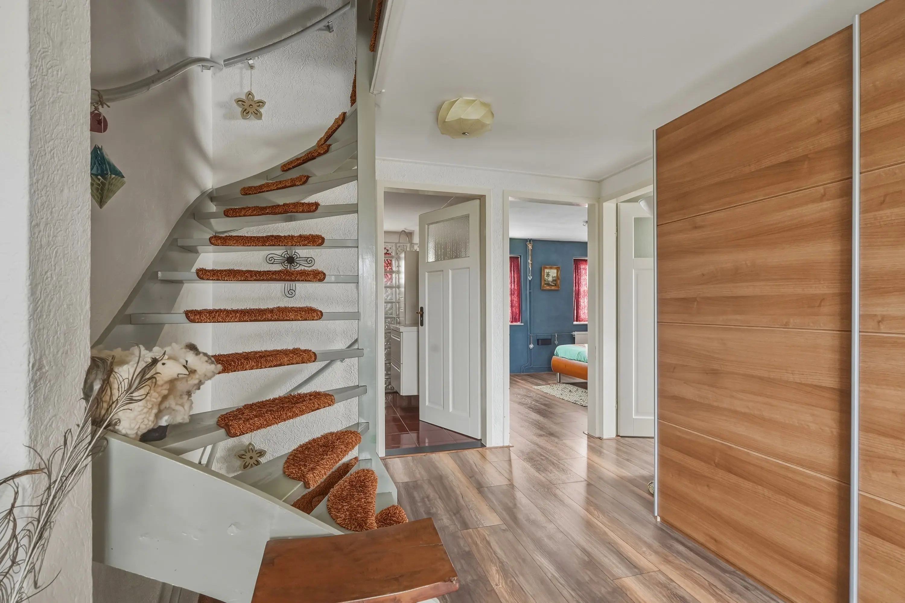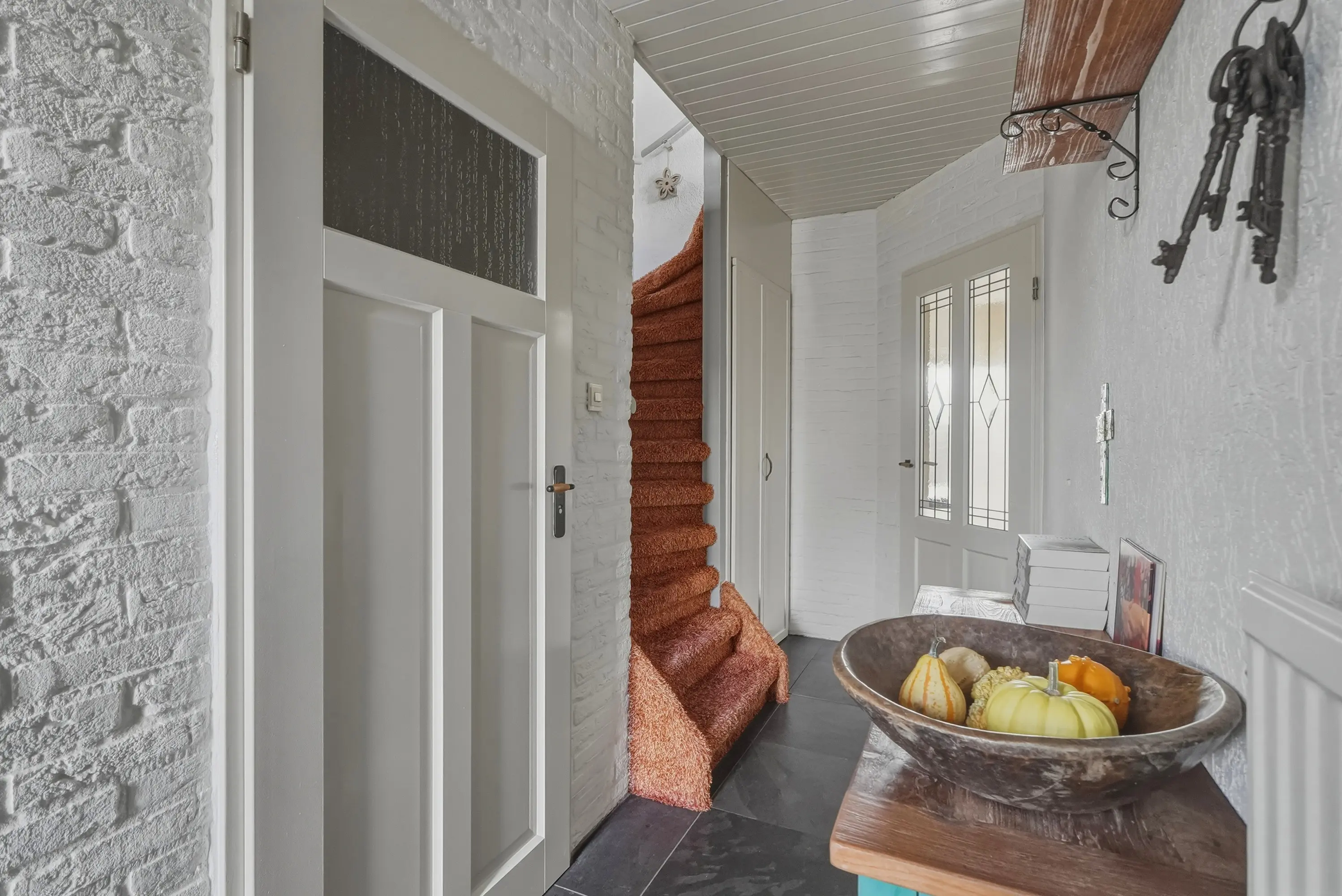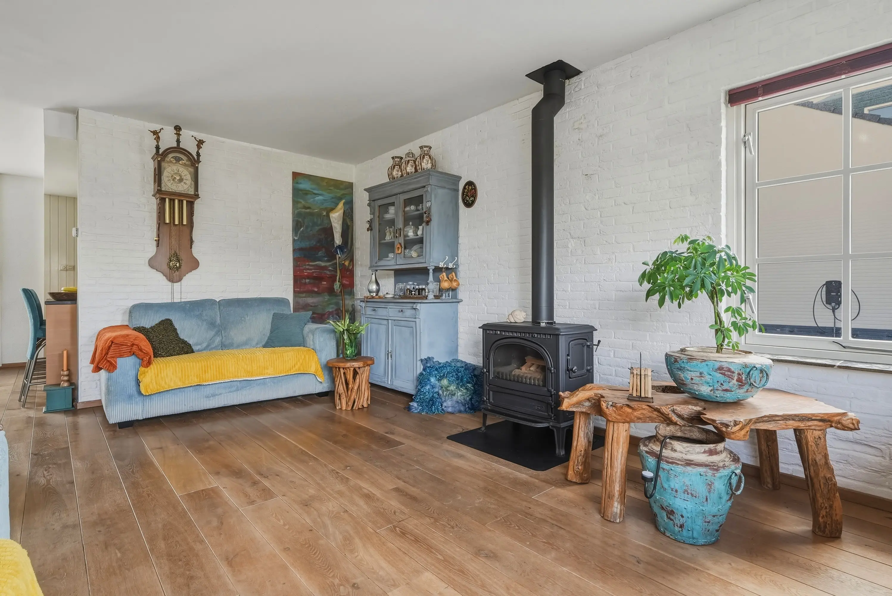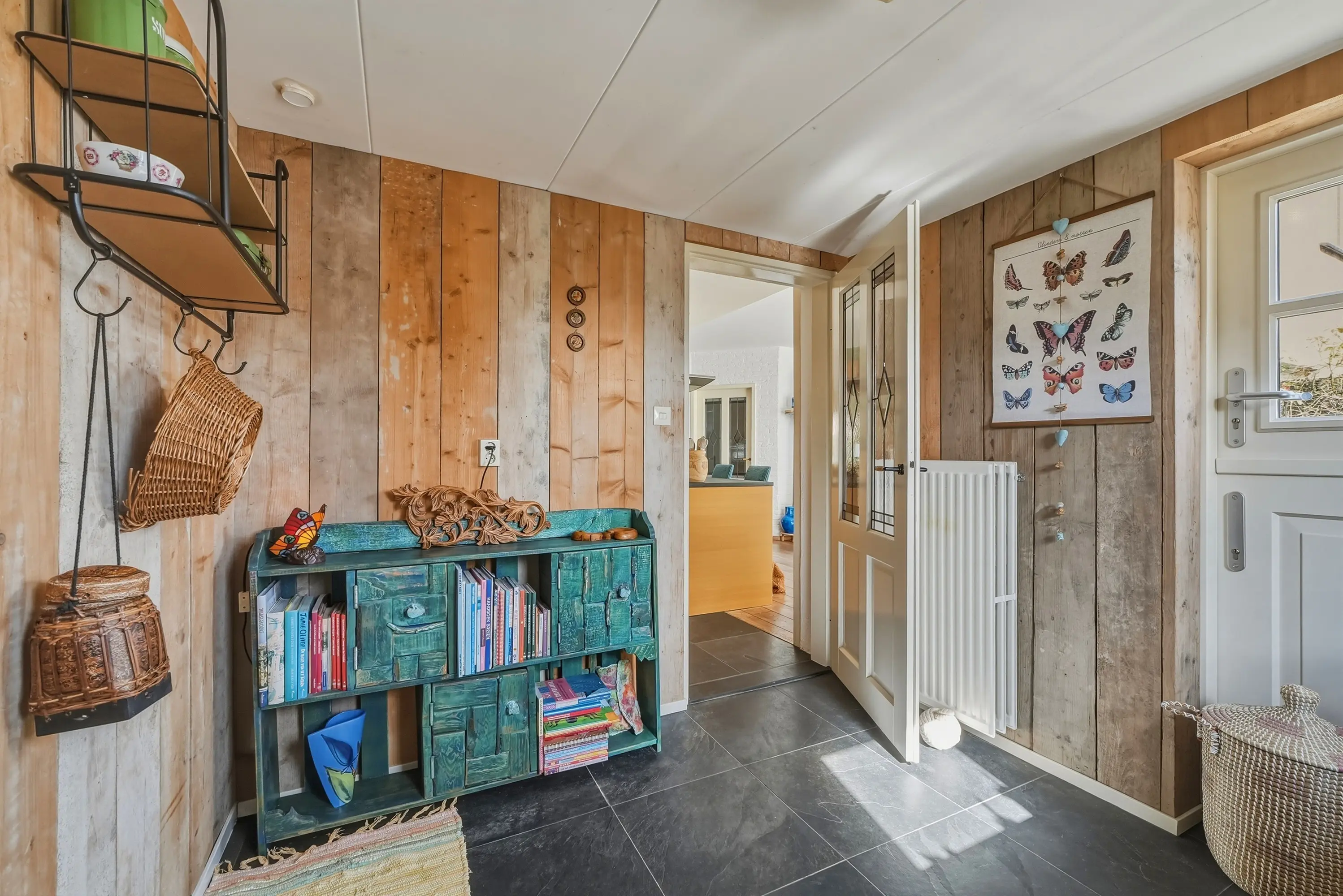 Via de entree komt u in de hal met meterkast (6 groepen), toilet en trapopgang. Vanuit hier bereikt u de woonkamer. De woonkamer is aan de voorzijde gelegen en geniet van veel daglicht dankzij de grote raampartijen. De speelse indeling en de open verbinding met de eetkamer en keuken met schiereiland zorgen voor een prettig geheel. In de woonkamer is een aansluiting voor een houtkachel aanwezig (de huidige houtkachel wordt door verkoper meegenomen). In de eetkamer bevindt zich een schuifpui, ideaal om direct toegang tot de tuin te hebben en te profiteren van extra lichtinval.