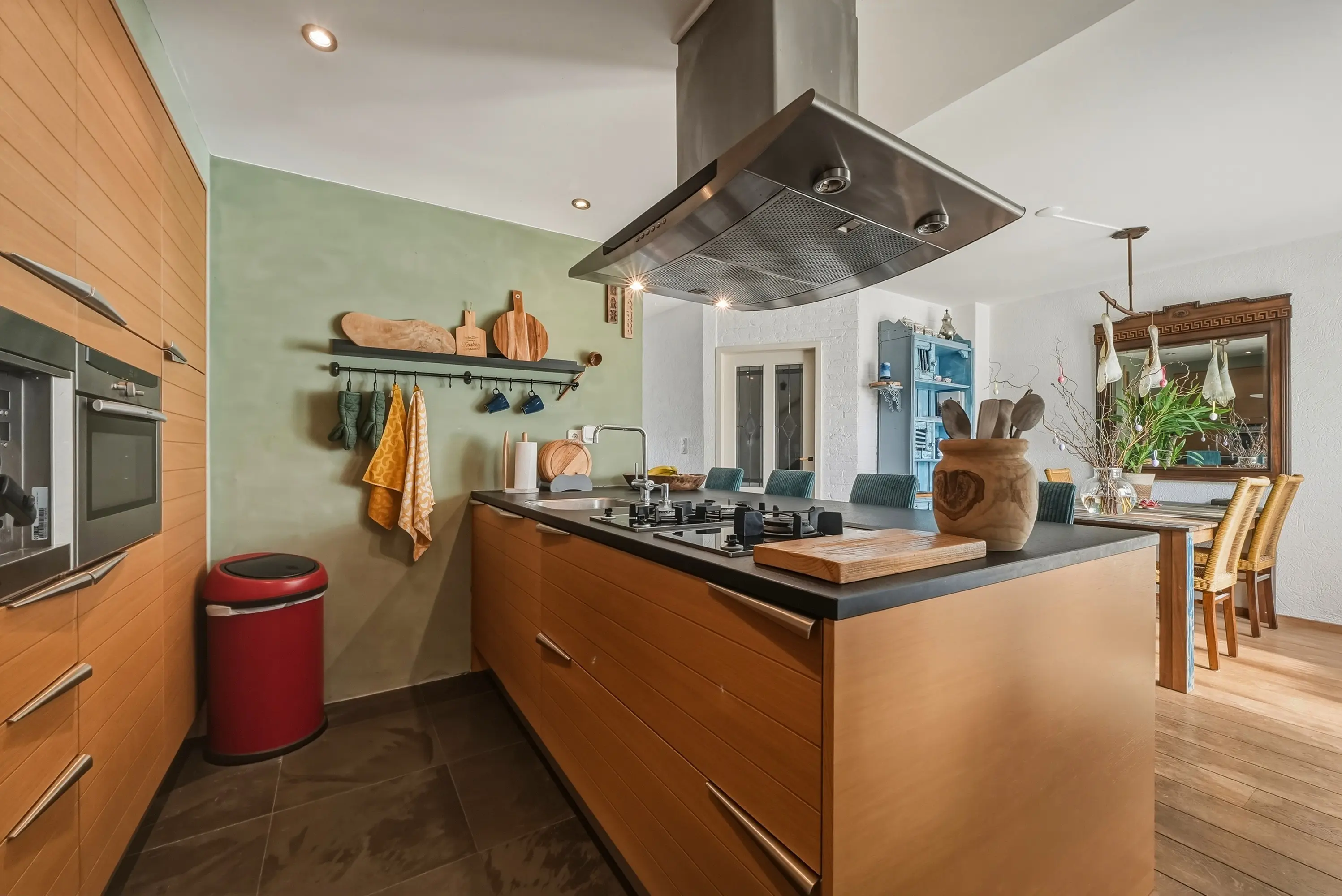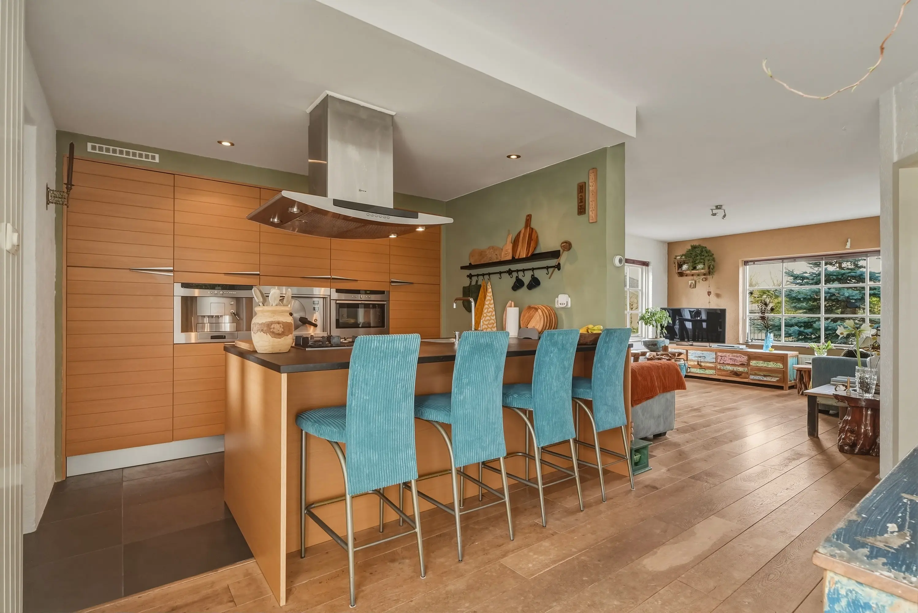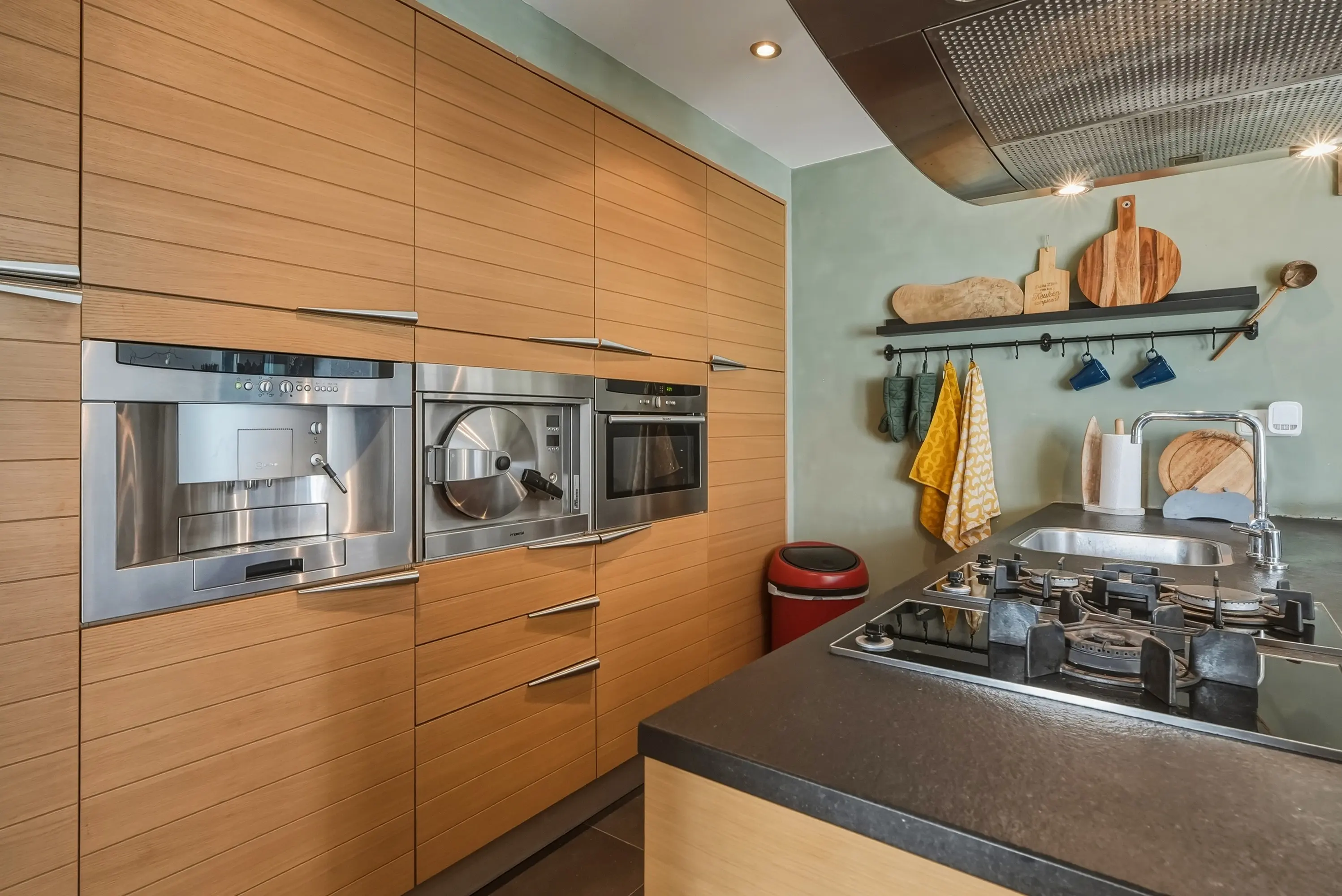 De keuken is ruim opgezet en voorzien van een schiereiland met veel werkruimte en een zitgedeelte. Tijdens het koken blijft u in contact met gezinsleden en/of gasten. De keuken beschikt over diverse inbouwapparatuur, waaronder een oven, stoomoven, vaatwasser, koelkast, kookplaat, afzuigkap en koffiezetapparaat.