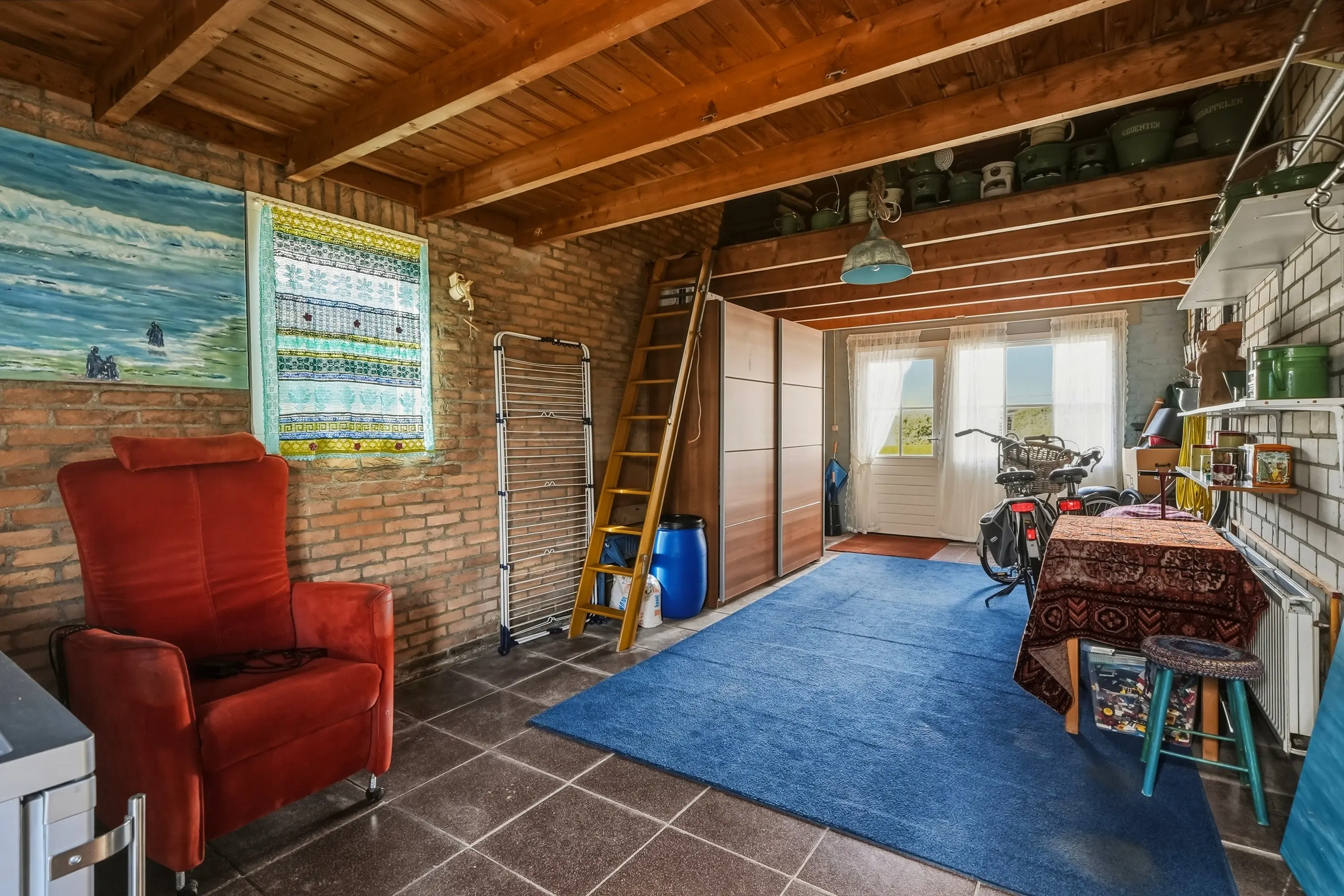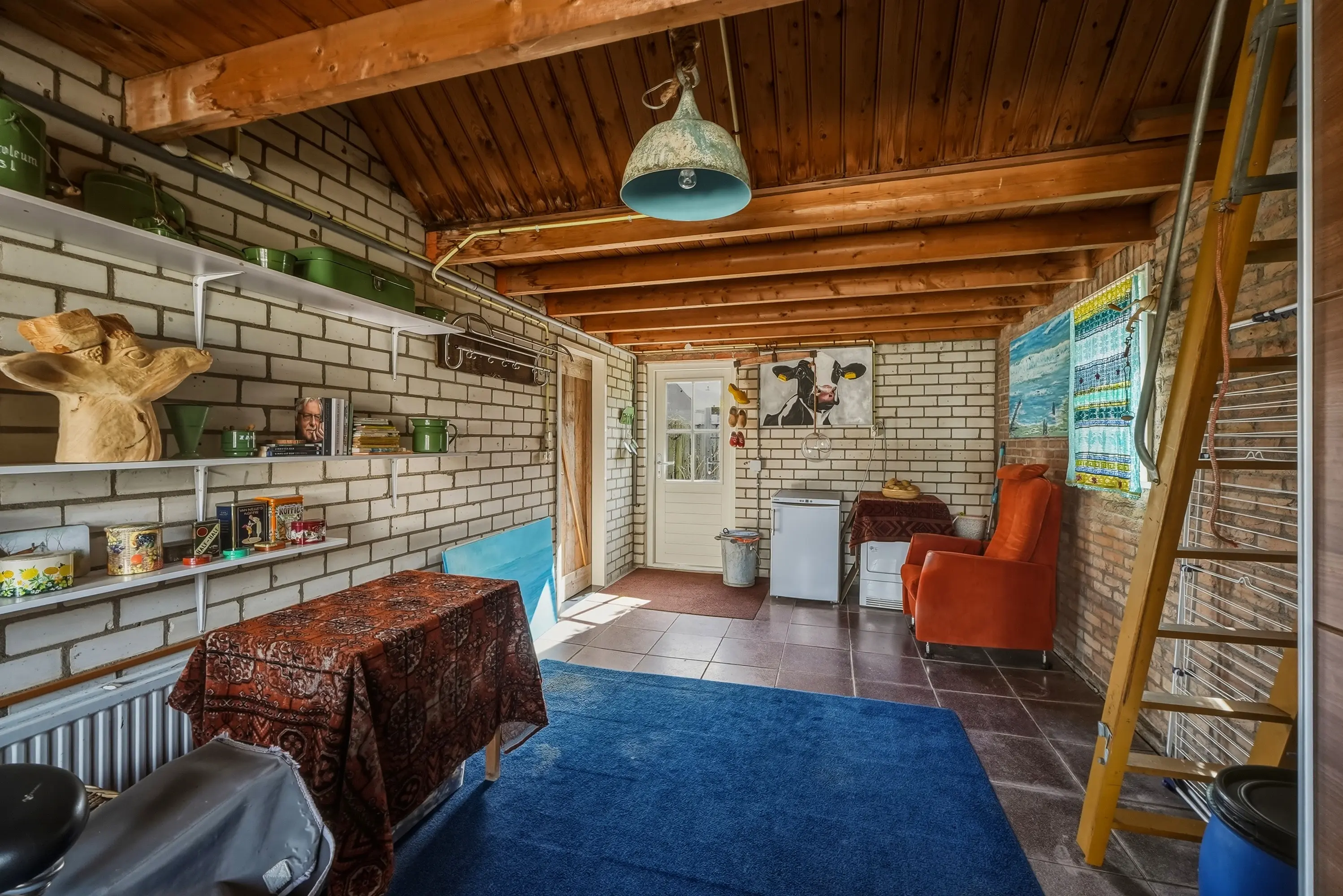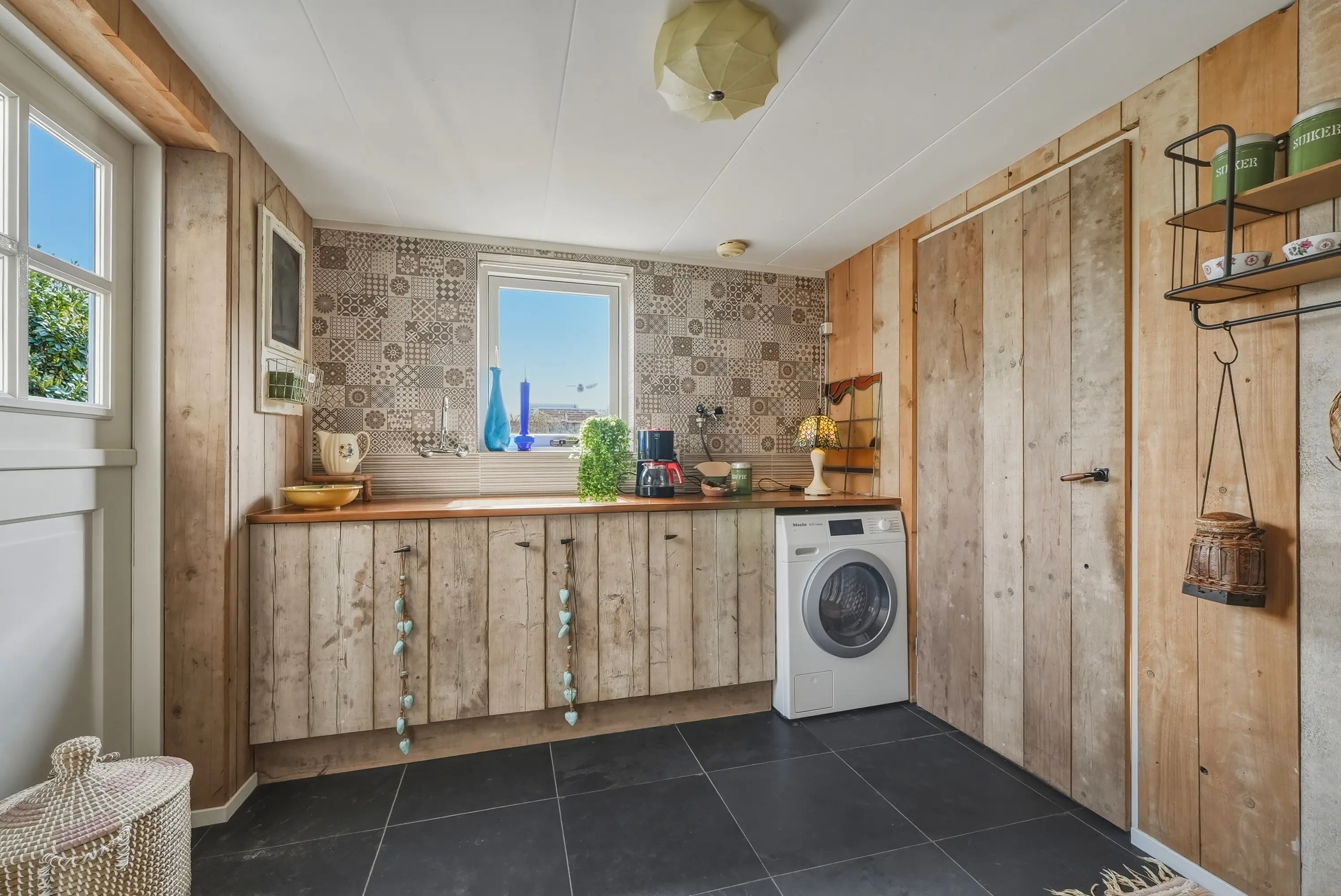 Aansluitend bevindt zich de bijkeuken, voorzien van witgoedaansluitingen, extra werkruimte en een grote spoelbak met warm en koud water. Vanuit de bijkeuken heeft u toegang tot zowel de achtertuin als de garage. De garage is ruim, voorzien van een nieuwe houten pui en uitgerust met een vliering, elektra, een gootsteen en verwarming. Ideaal voor hobby’s, het stallen van fietsen of motoren en met volop bergruimte.