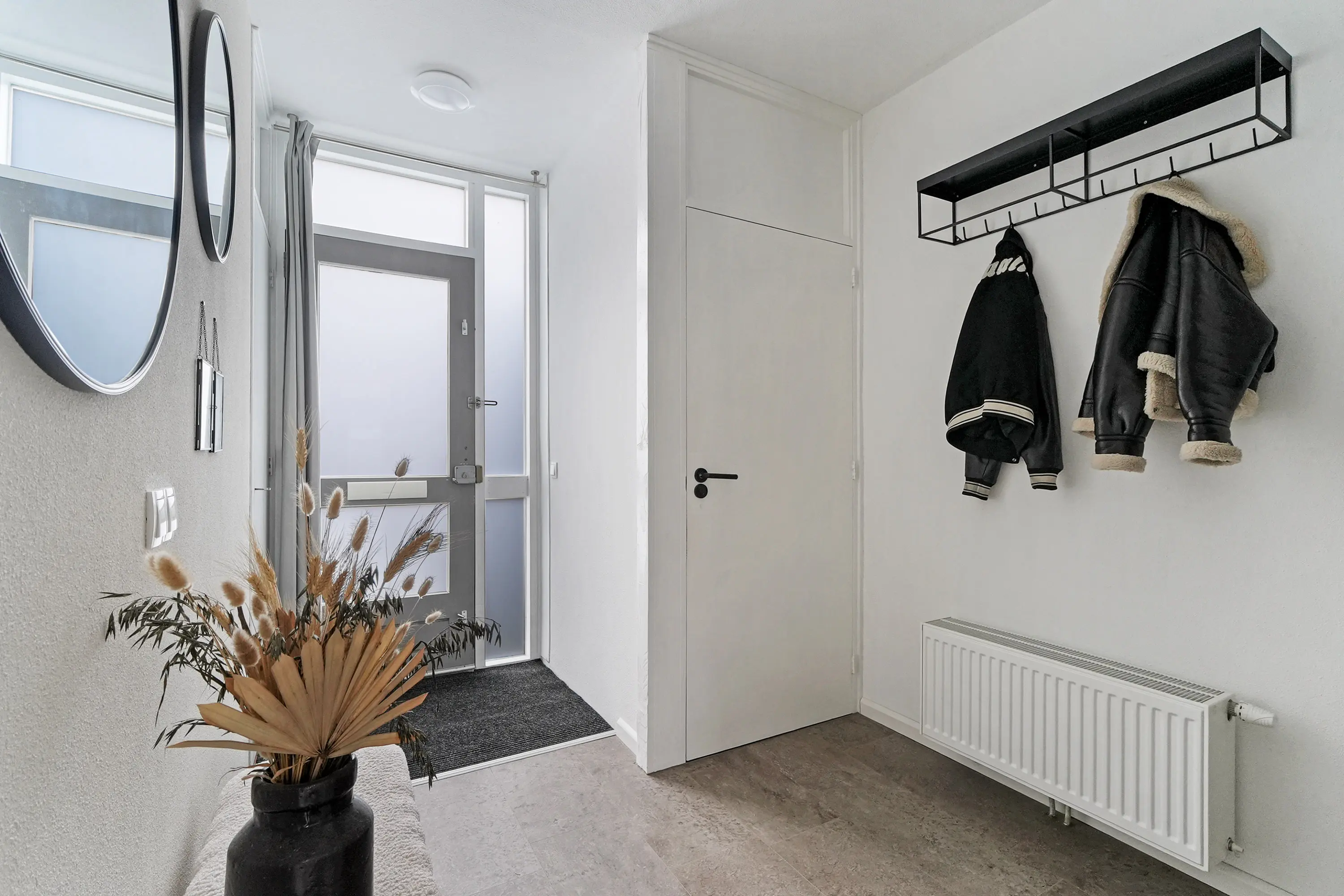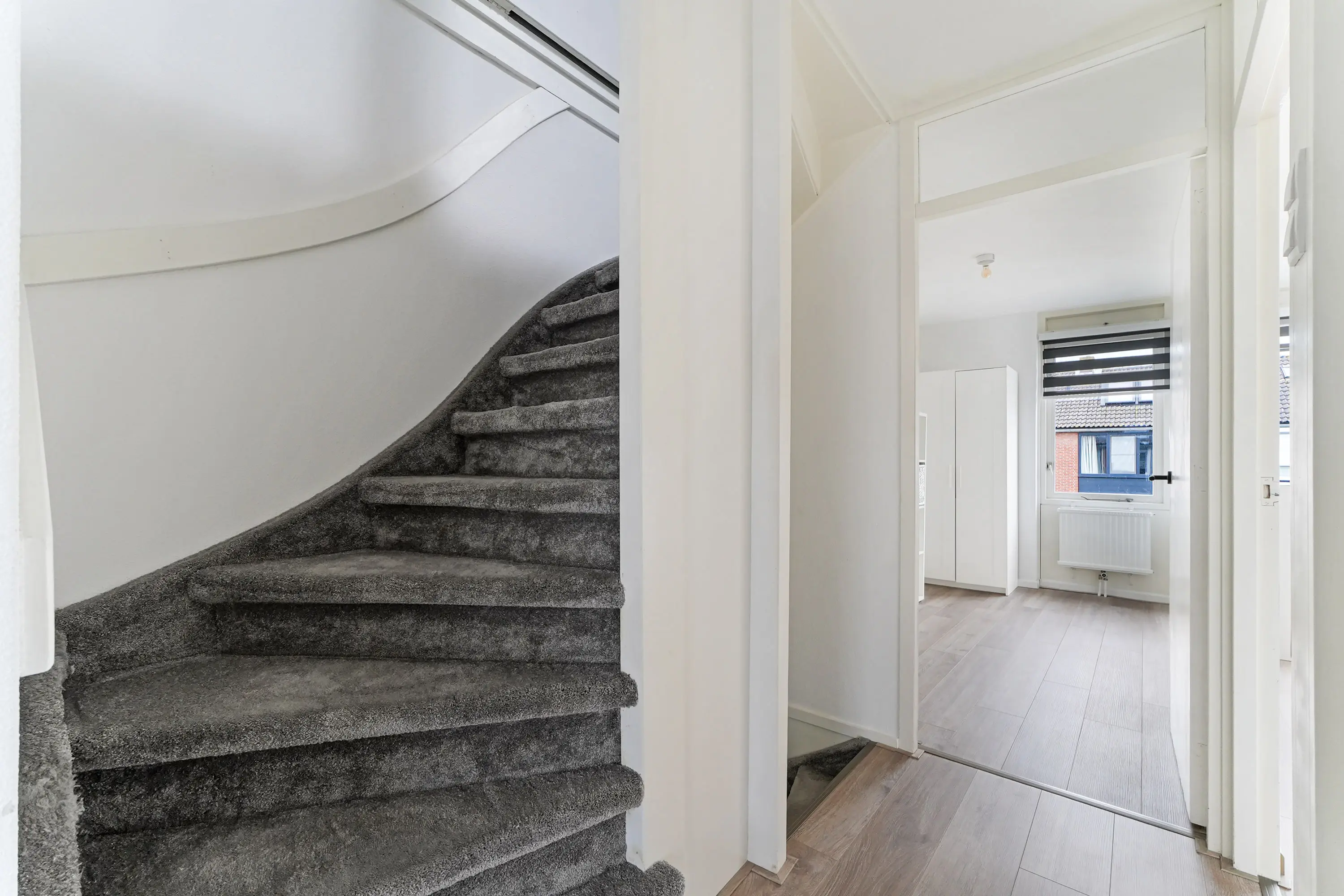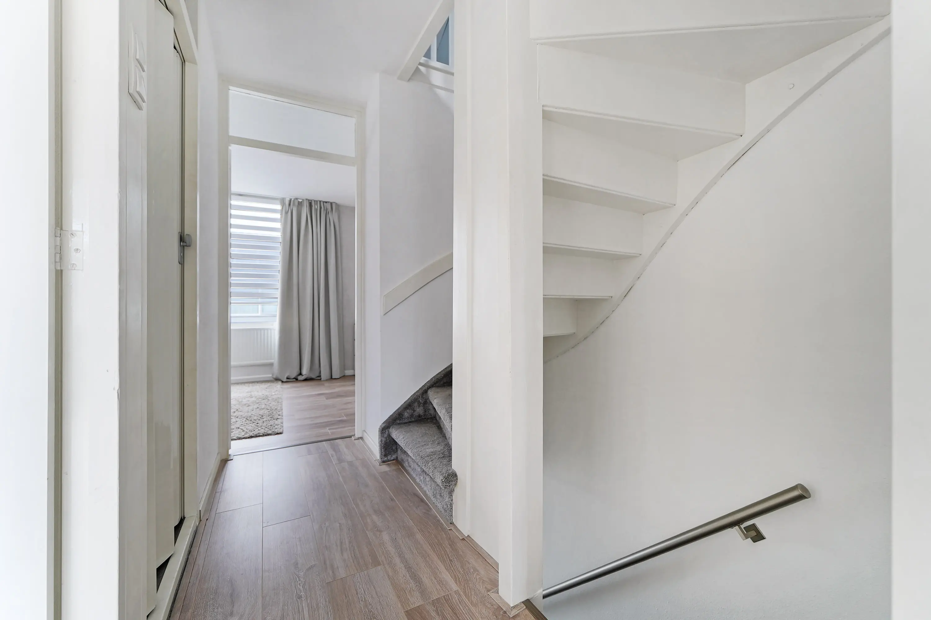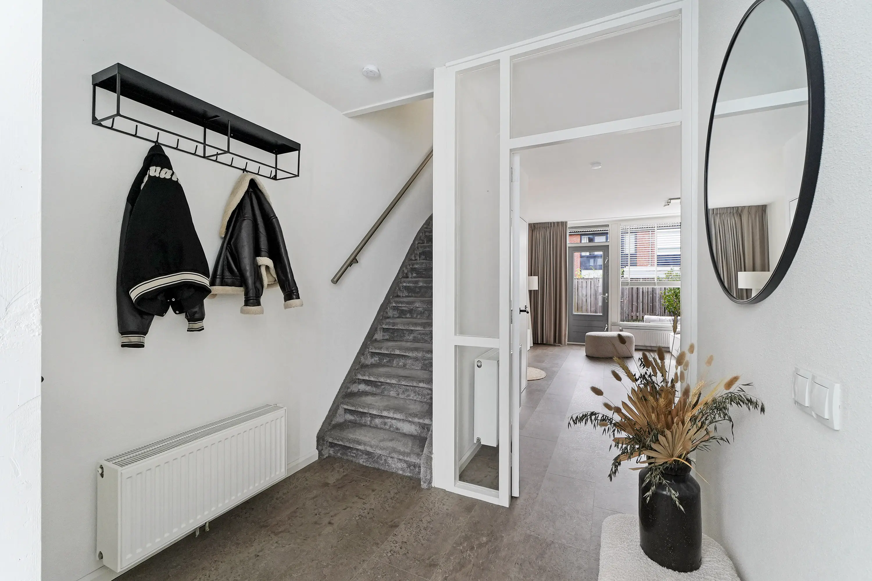 Via de hal betreedt u de woning. Hier vindt u de meterkast, het toilet met fontein (vernieuwd in 2018) en de trapopgang. Vanuit de hal heeft u toegang tot de eet- en woonkamer, die ruim is opgezet en door de grote ramen geniet van veel natuurlijk licht. In de woonkamer vindt u een trapkast, ideaal voor het opbergen van huishoudelijke spullen of voorraad. Vanuit de woonkamer bereikt u de achtertuin.