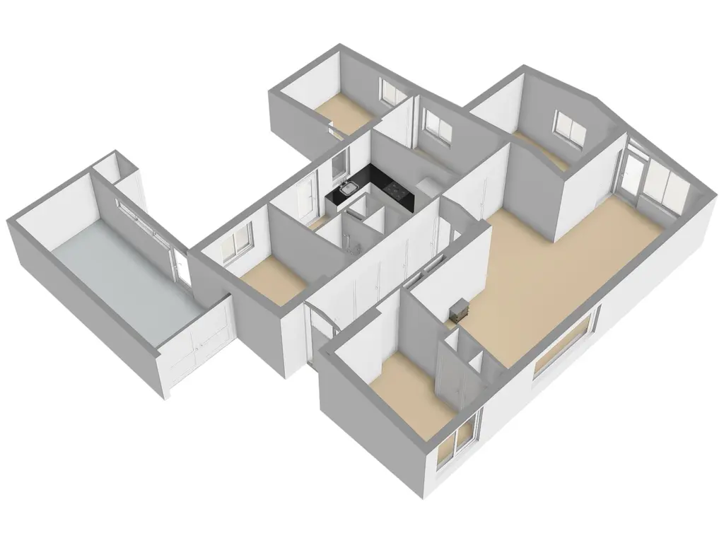 Vanuit de hal bereikt u 2 slaapkamers en de badkamer, terwijl de overige 2 slaapkamers vanuit de woonkamer toegankelijk zijn. In het verleden is de bungalow tweemaal uitgebouwd, waardoor de totale woonoppervlakte aanzienlijk is vergroot en alle slaapkamers van een prettig formaat zijn. Aan de tuinzijde treft de slaapkamer die is verlengd met een inloopkast. de bergzolder is toegankelijk met ladder vanuit de hal.