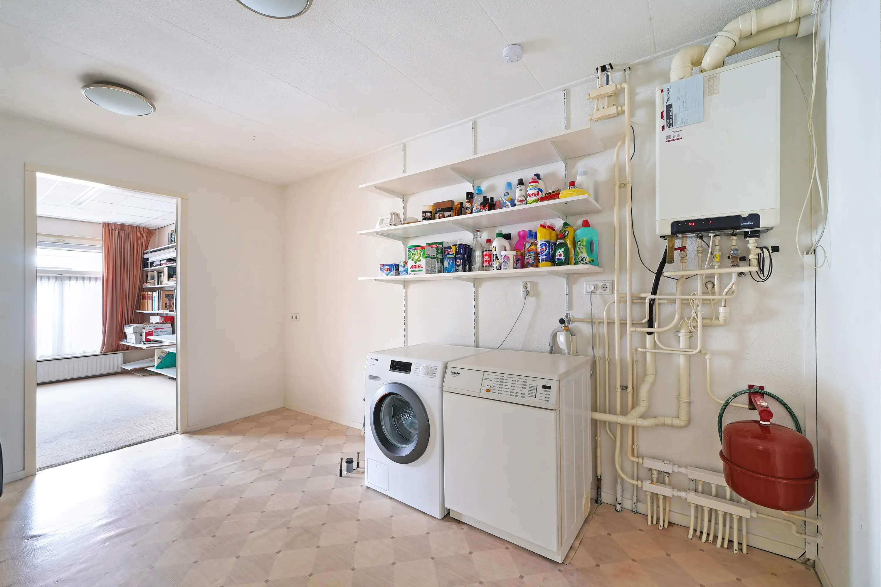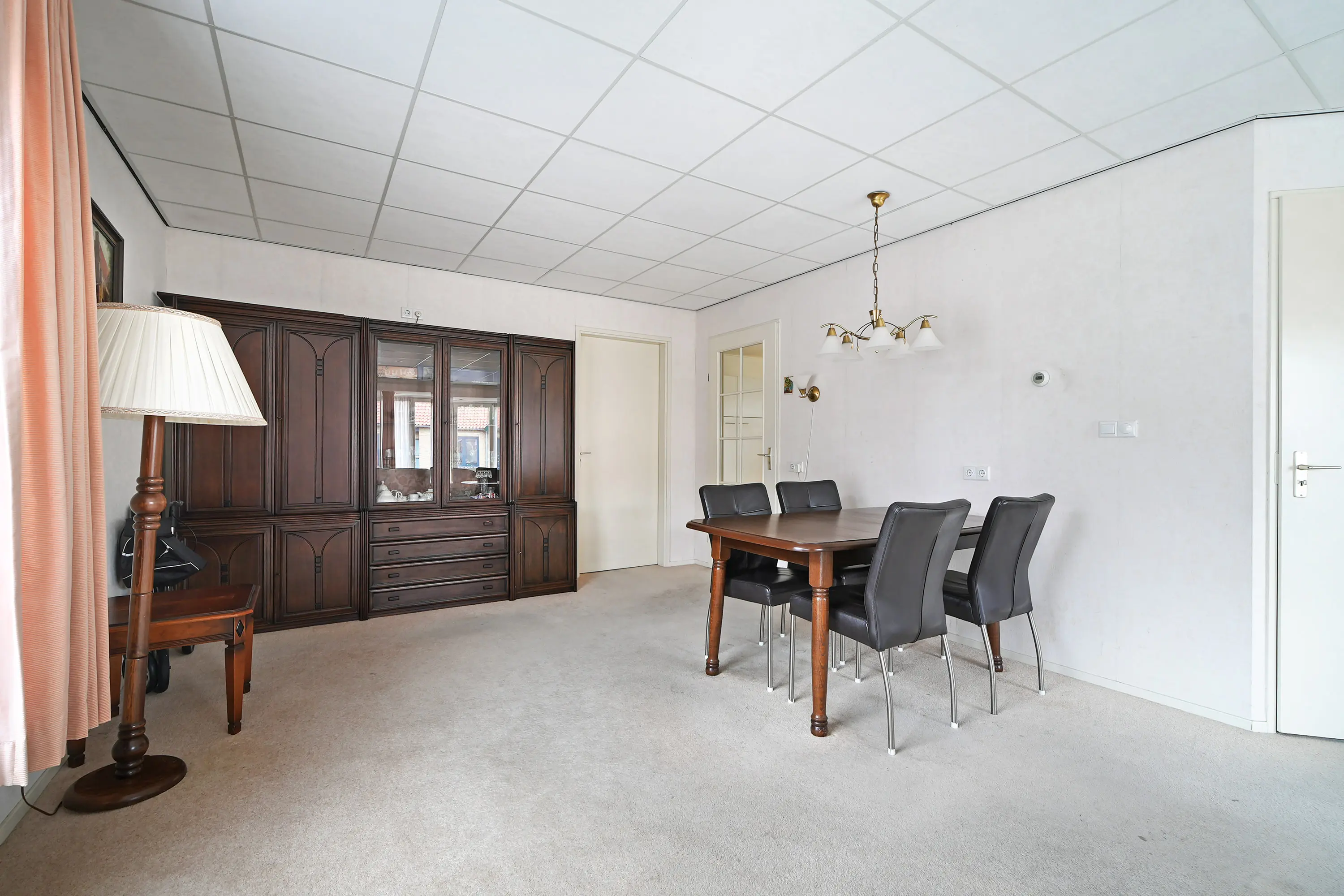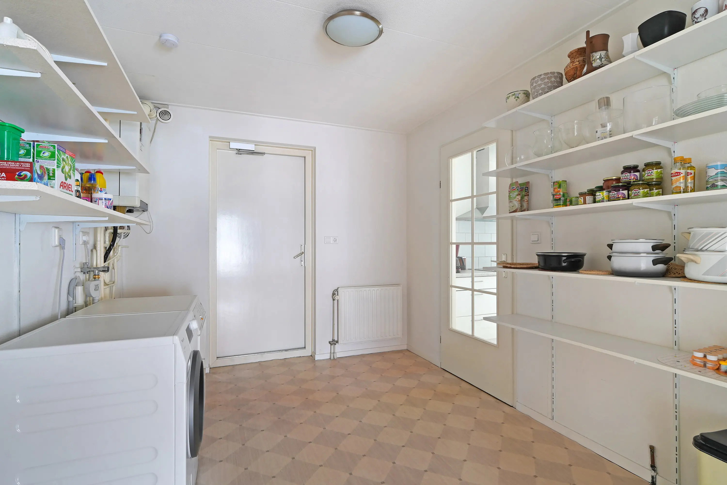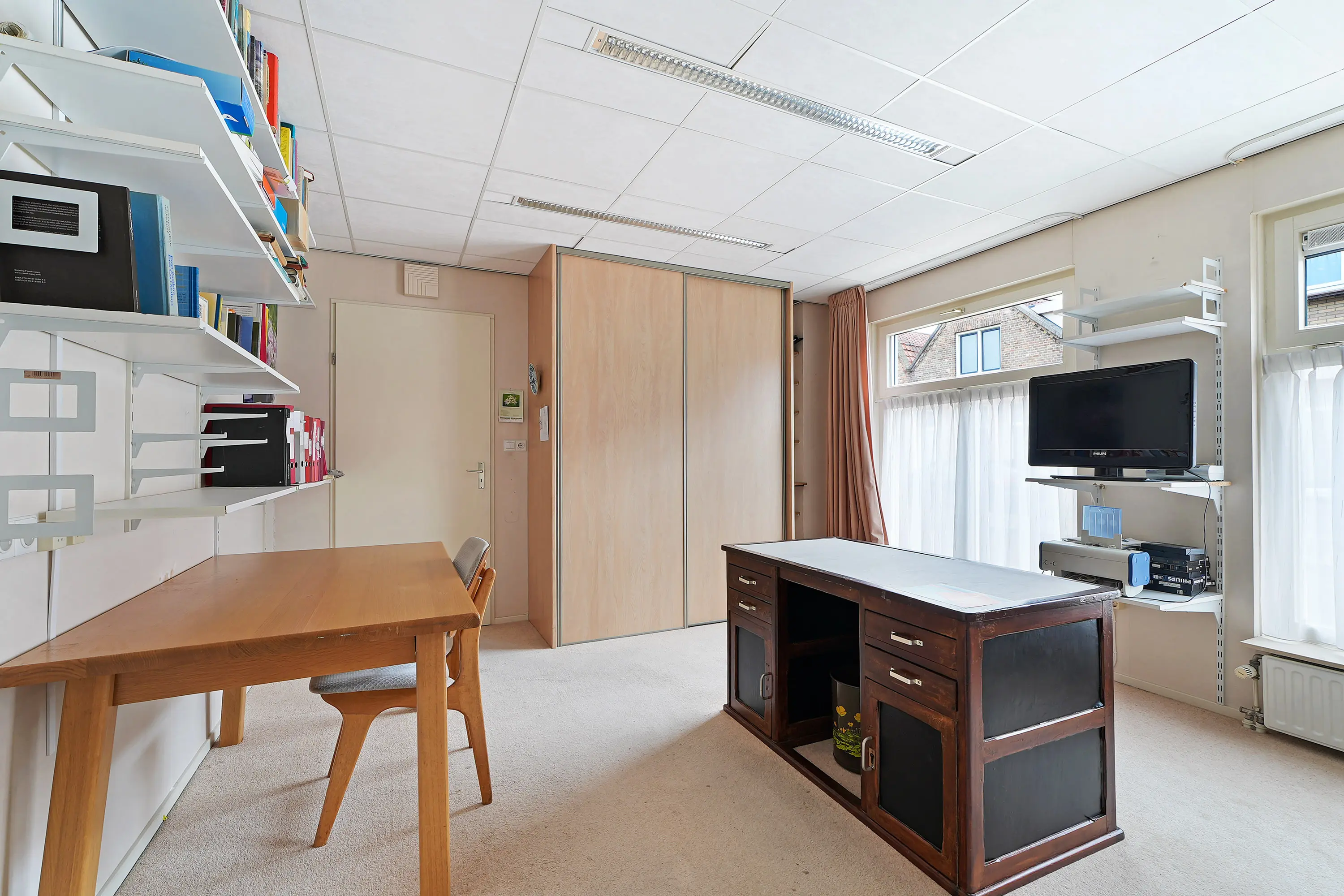 De woonkamer is uitgevoerd in een L-vorm, royaal van opzet en praktisch in te delen. Dankzij de vele en grote ramen geniet u hier van een prettige natuurlijke lichtinval. Vanuit de woonkamer heeft u toegang tot de keuken en de kantoorruimte. Deze kantoorkamer is uitstekend te gebruiken als slaapkamer. De aangrenzende bijkeuken leent zich bij uitstek voor het splitsen in een badkamer en bijkeuken; de benodigde aansluitingen voor water, afvoer e.d. zijn reeds aanwezig.