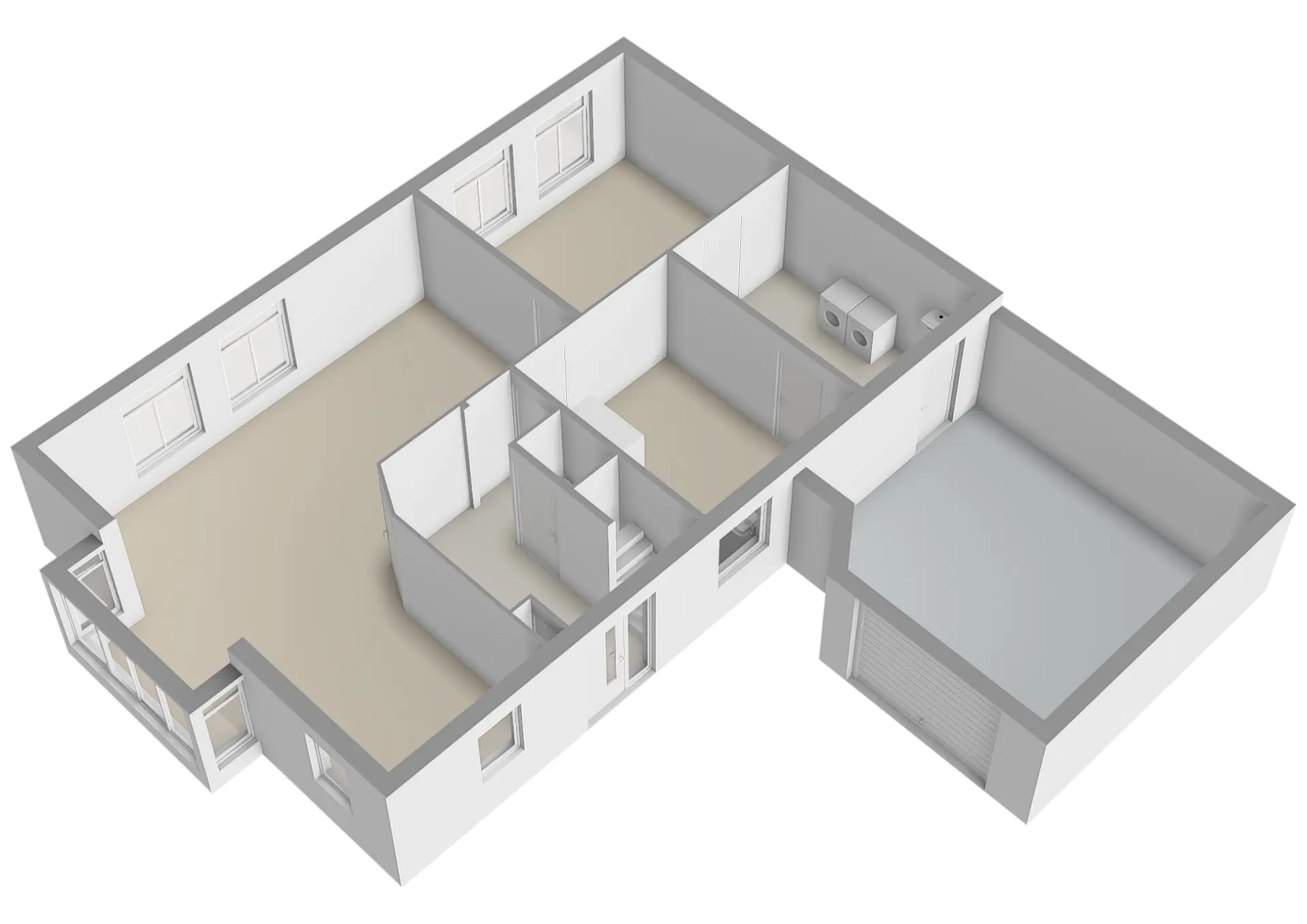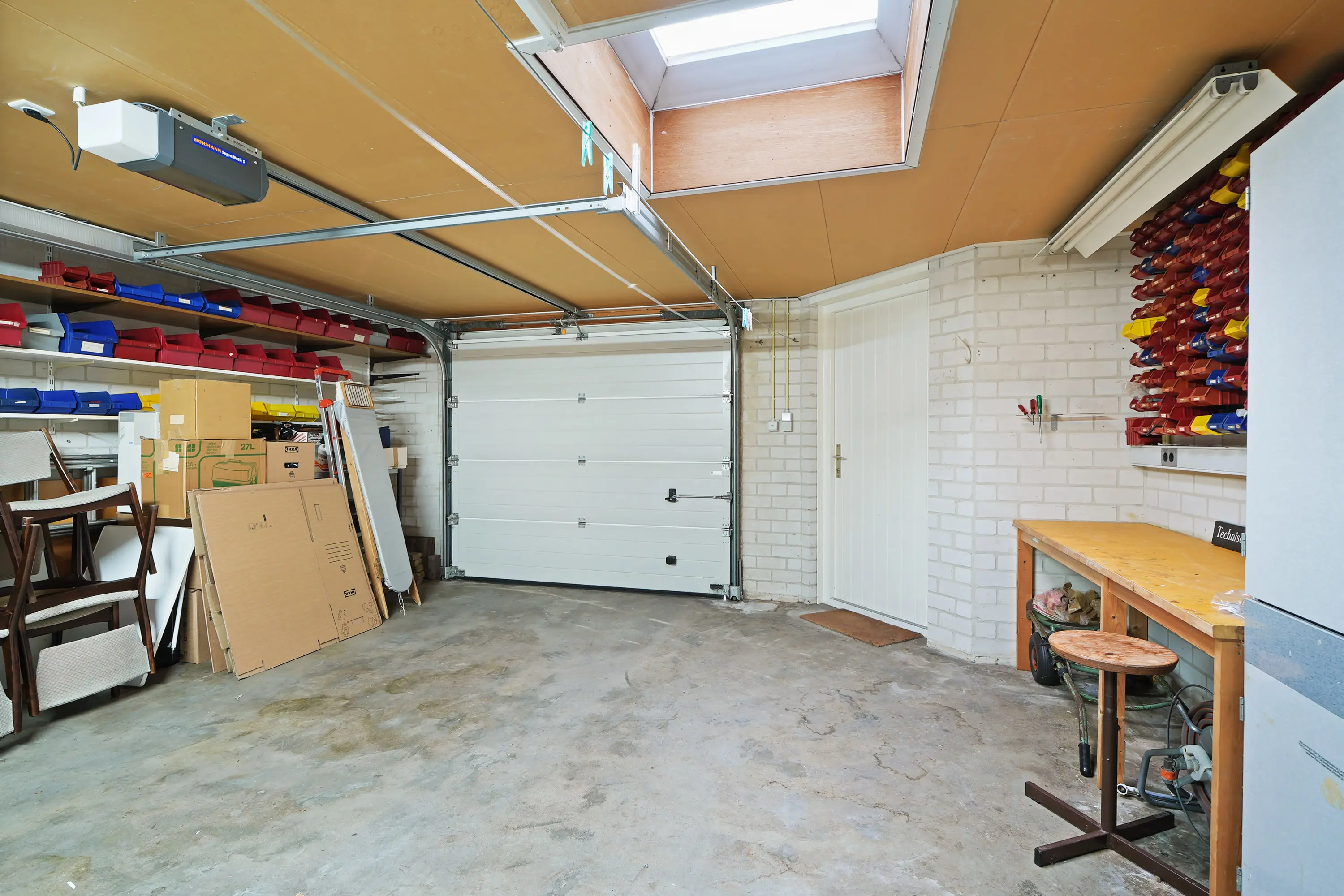 Vanuit de bijkeuken bereikt u de garage. Deze is eveneens ruim van opzet en voorzien van een elektrische overheaddeur, een loopdeur en een lichtkoepel. Daarnaast zijn elektra, water en isolatie aanwezig.
