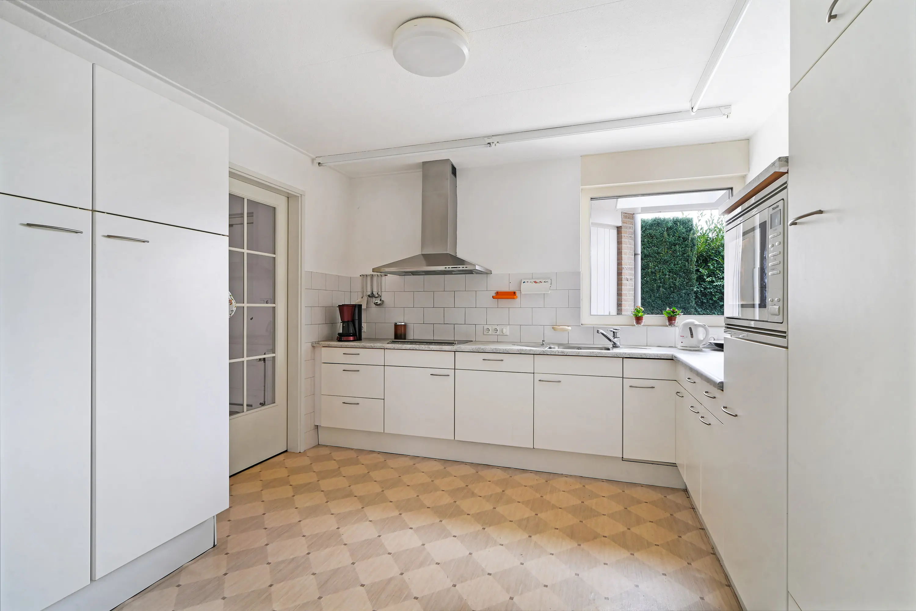 De keuken is ruim, functioneel ingericht en uitgevoerd in een L-opstelling met inbouwapparatuur.