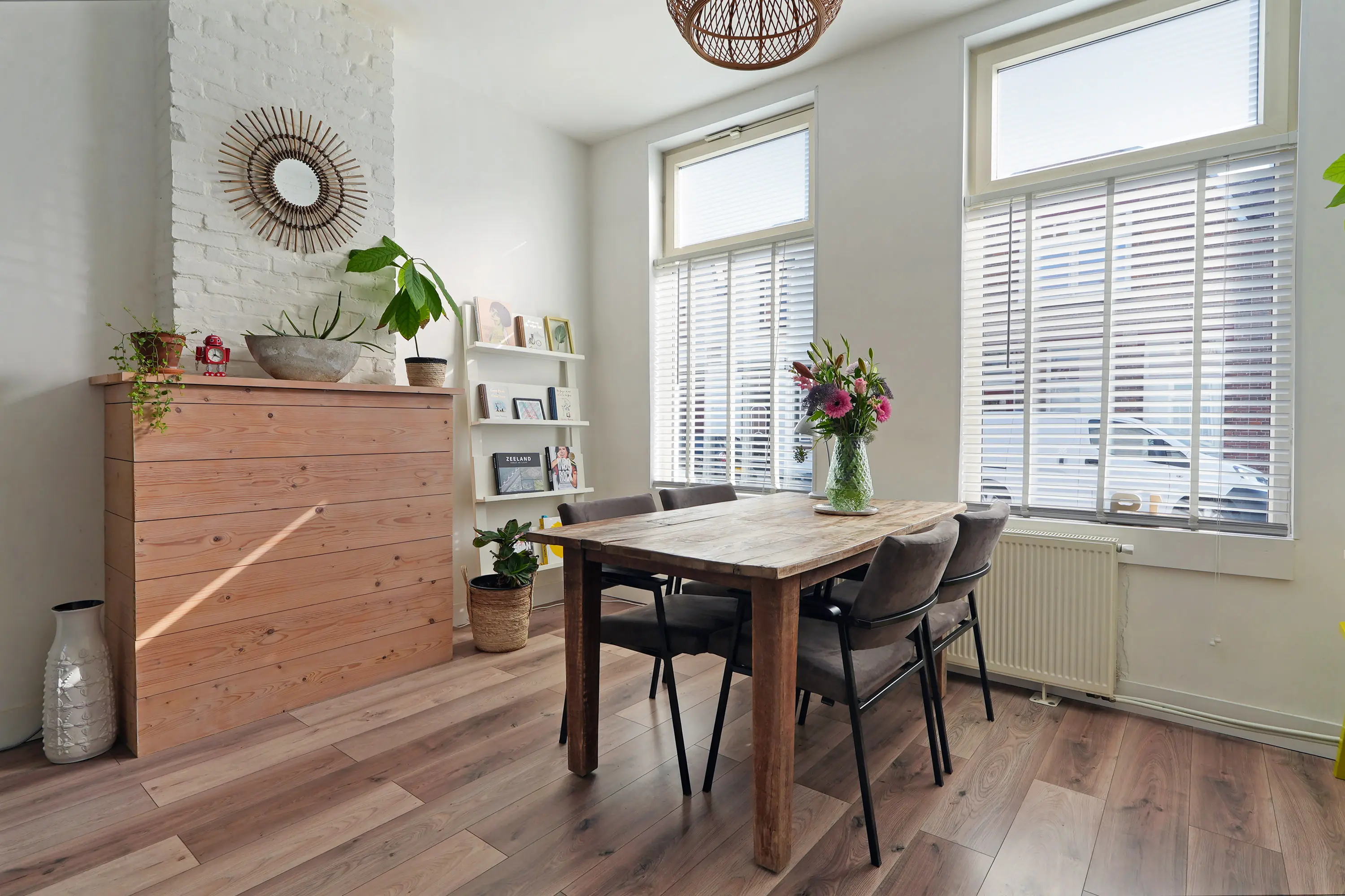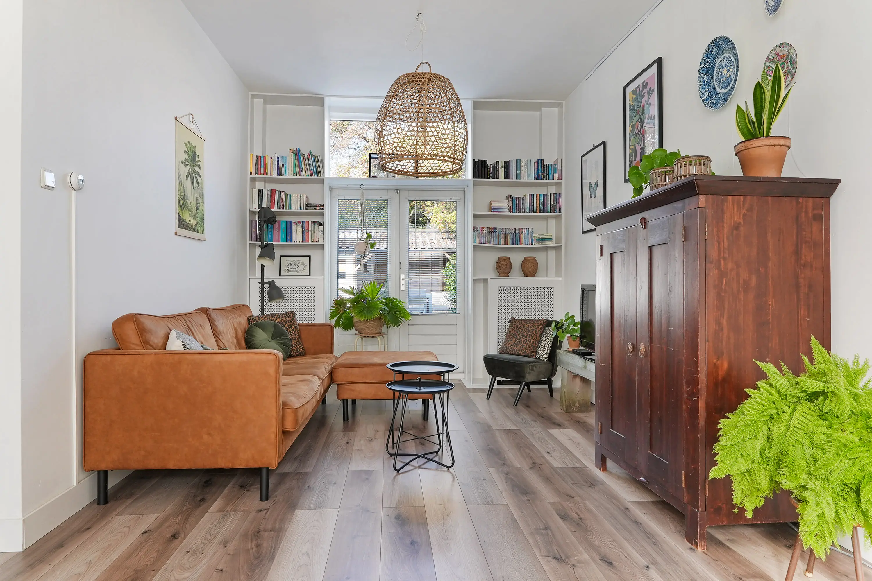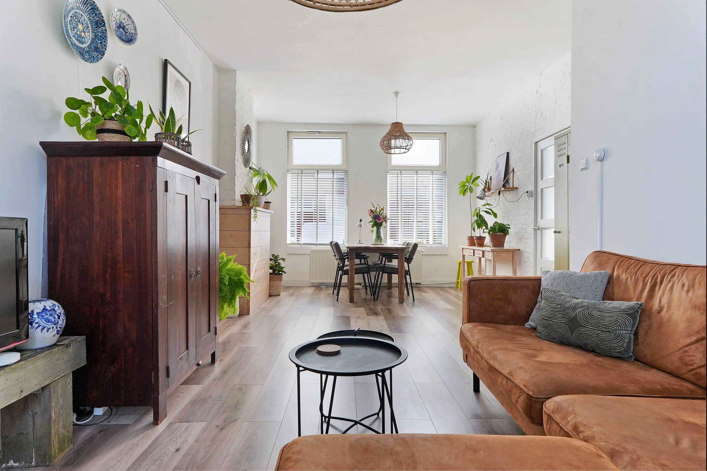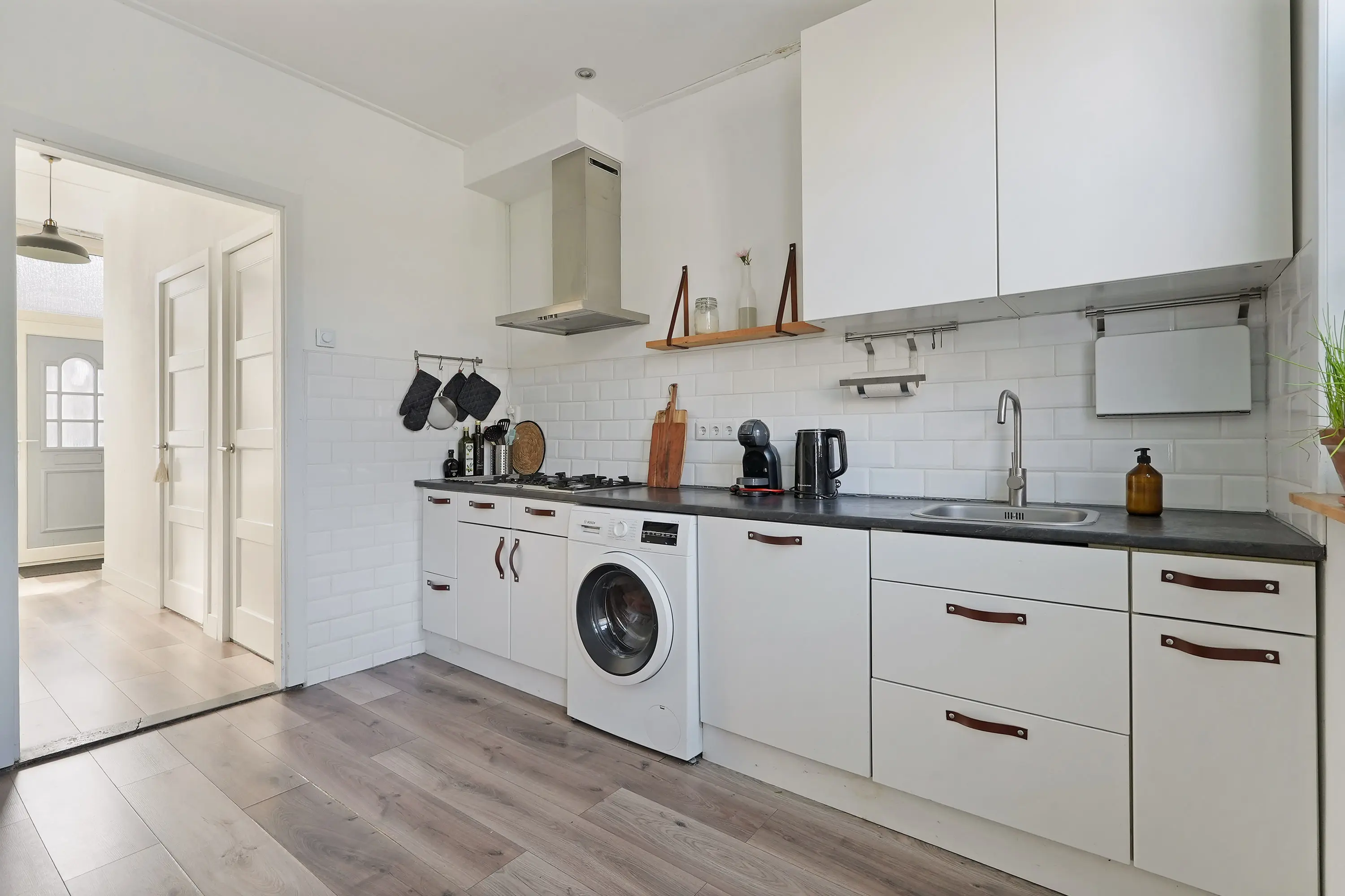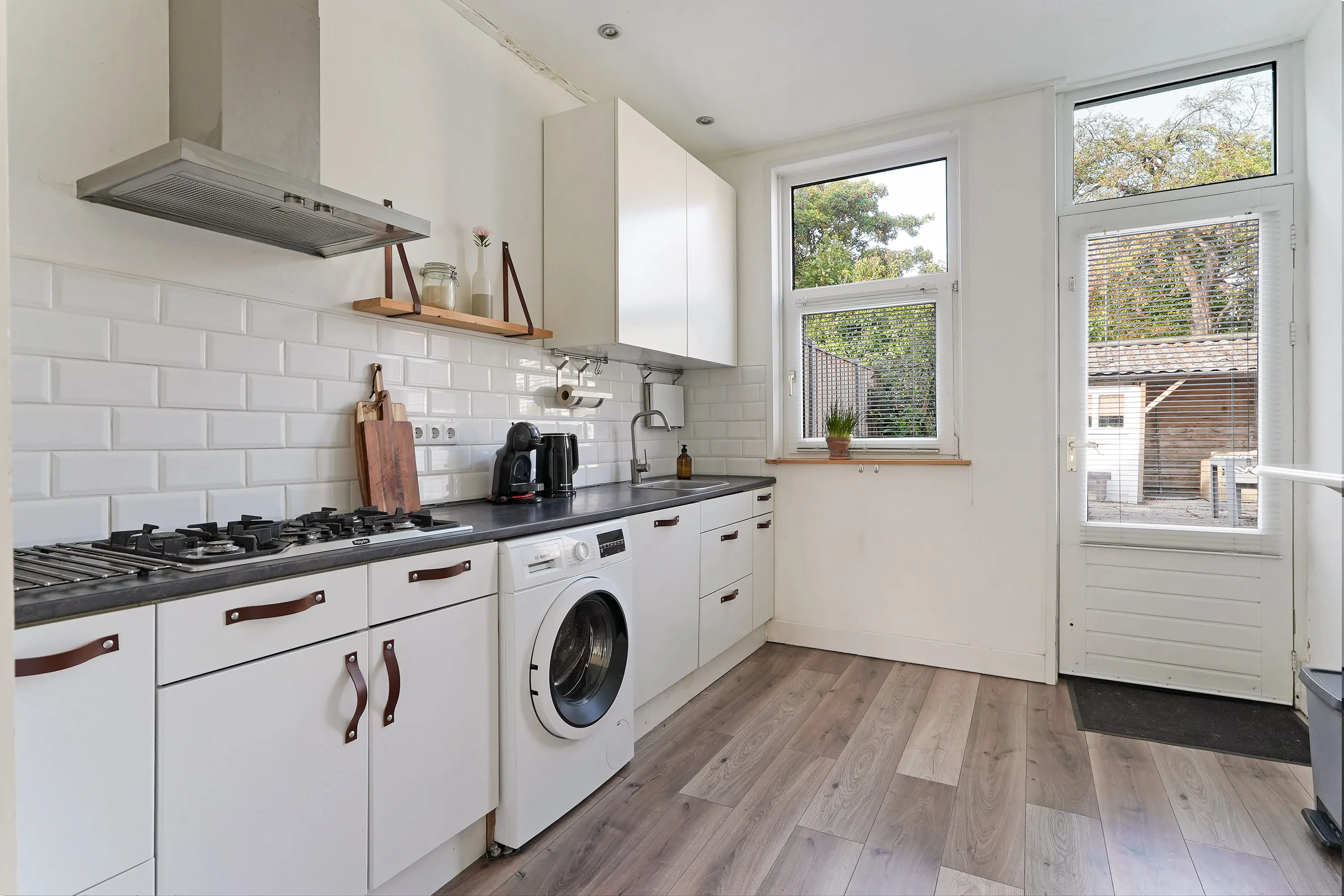 Hal met trap naar de 1e verdieping en trapkast, net toilet met fonteintje, halfopen ruime keuken (2019) met wasmachineaansluiting, tuindeur en inbouwapparatuur: vaatwasser / combi-magnetron / koelkast / 5-pitsgaskookplaat / wasemkap en gezellige doorzon woonkamer met dubbele tuindeur.