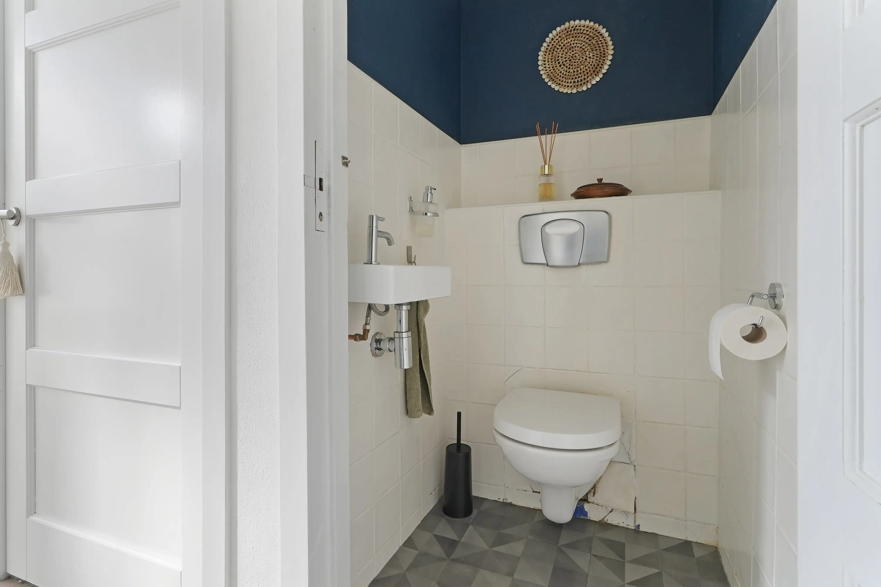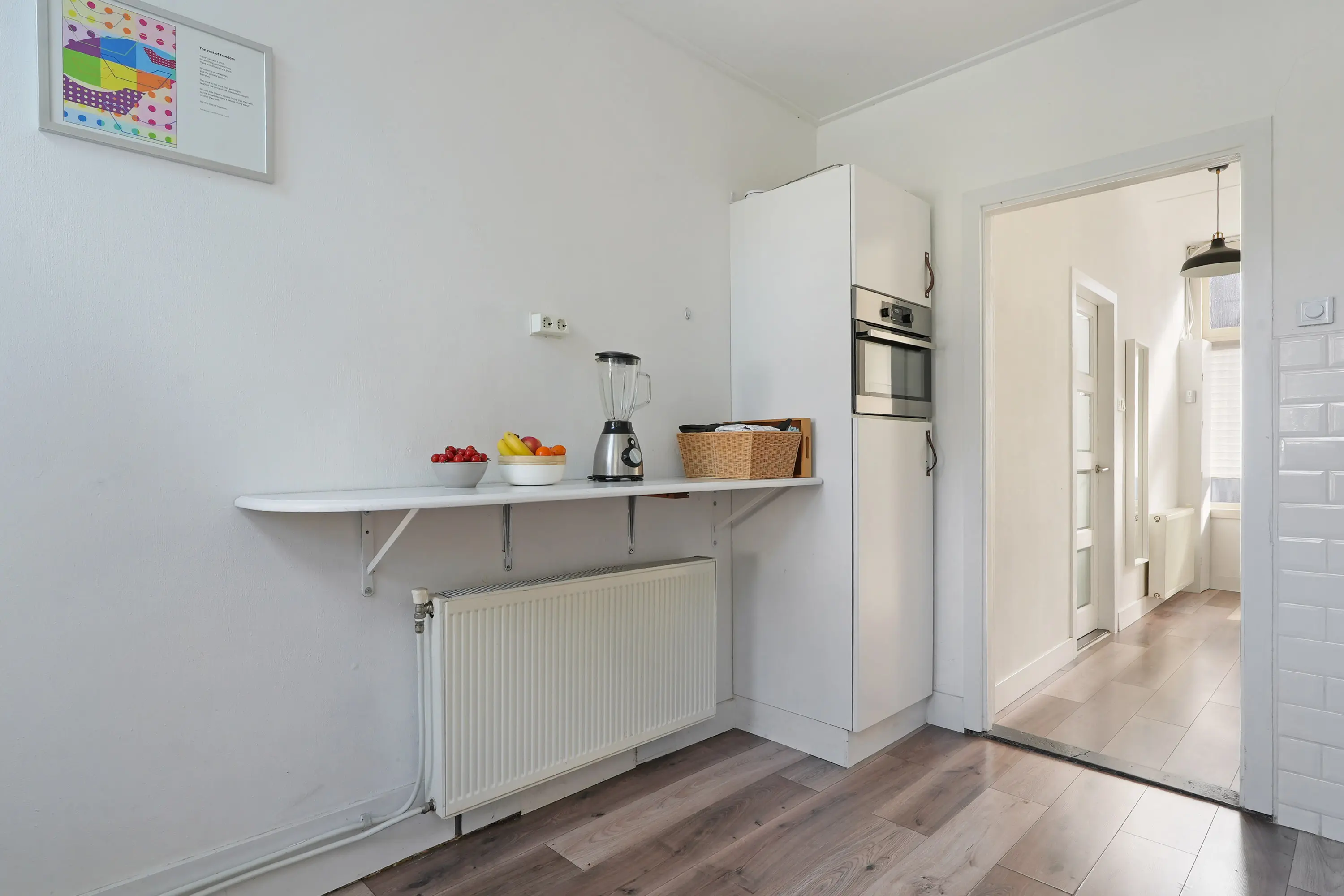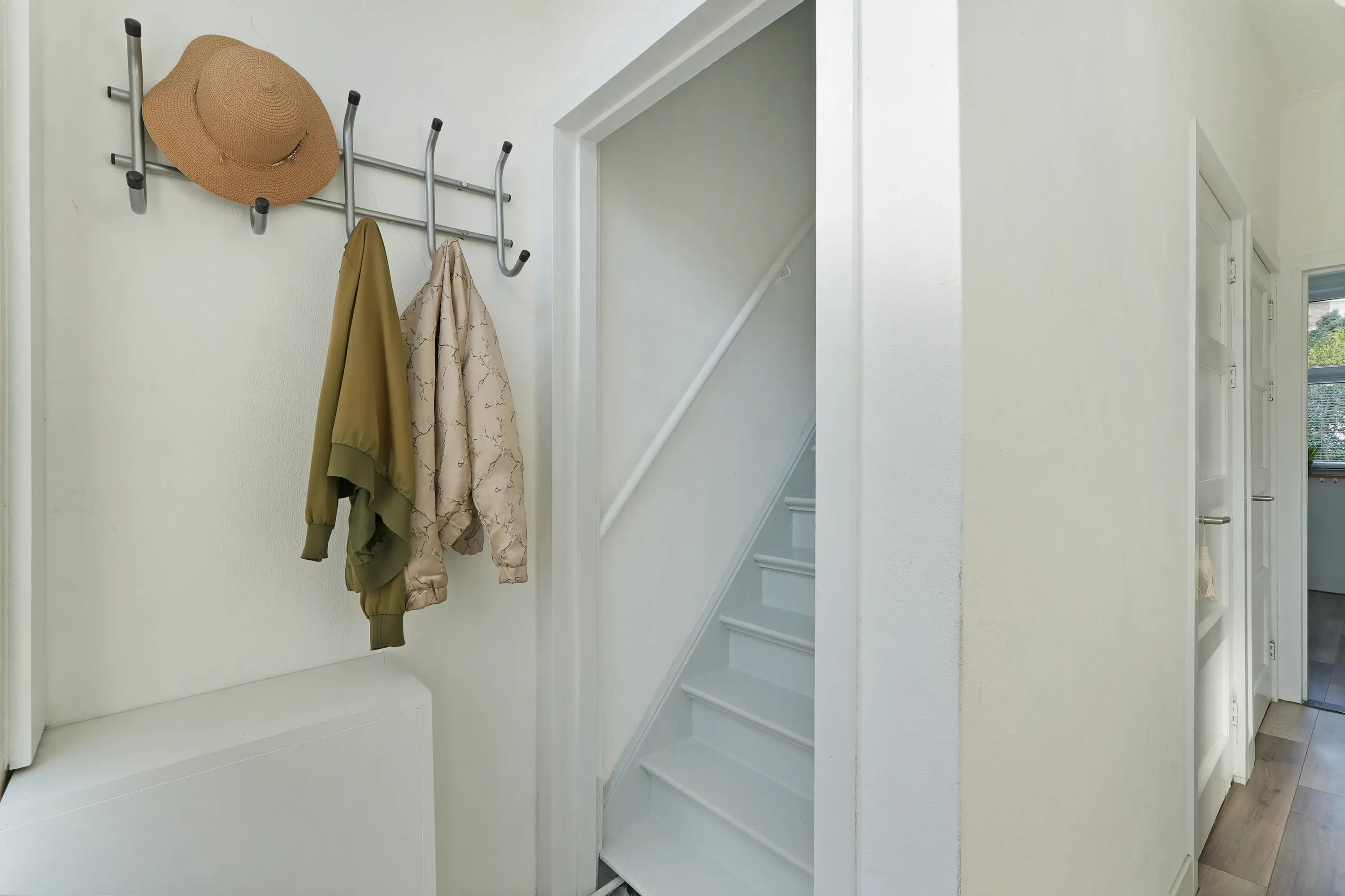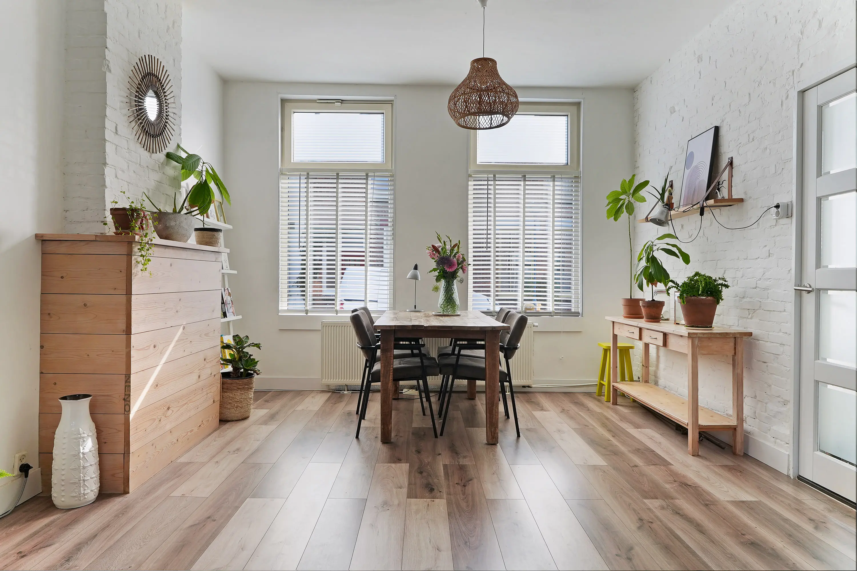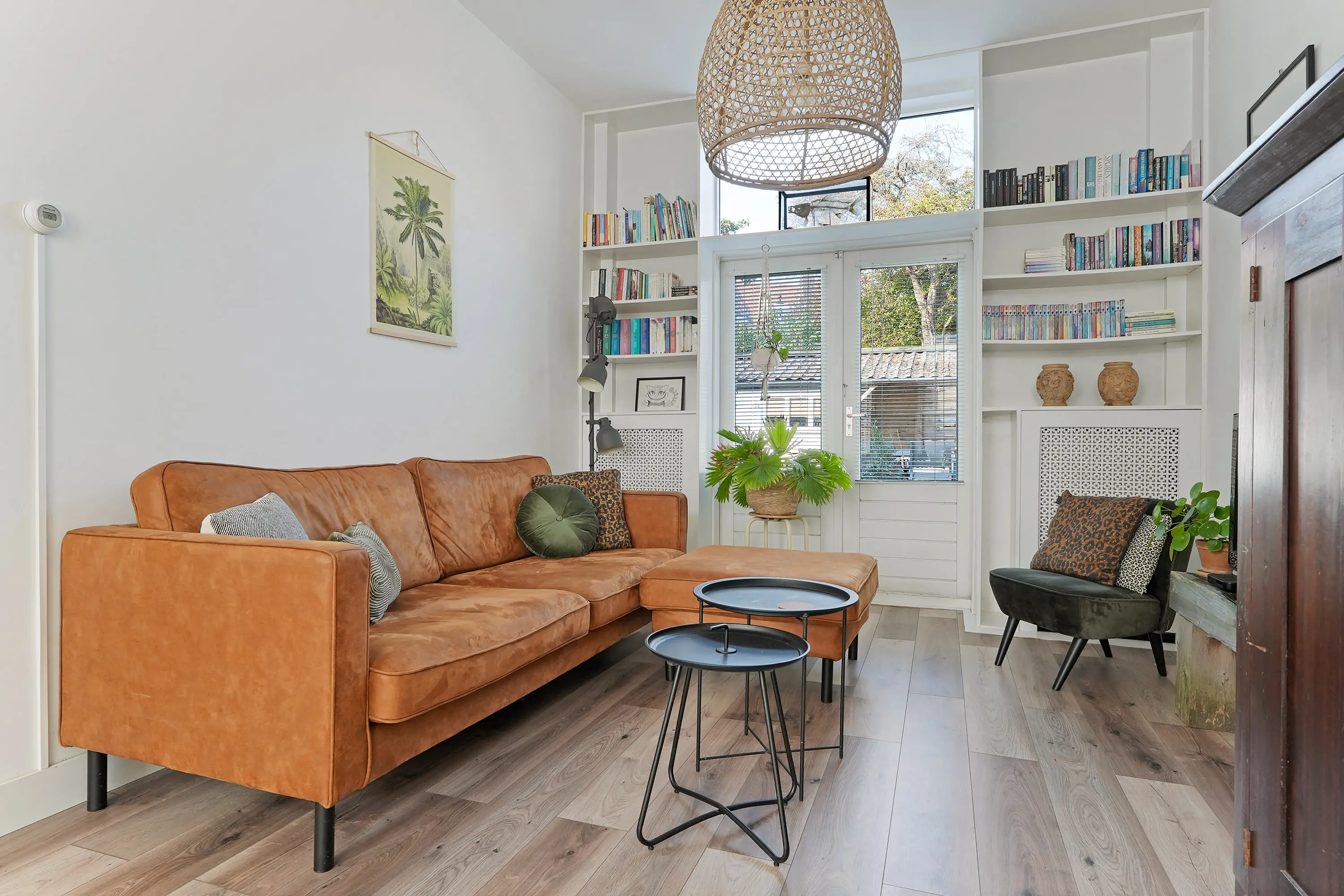 Hal met trap naar de 1e verdieping en trapkast, net toilet met fonteintje, halfopen ruime keuken (2019) met wasmachineaansluiting, tuindeur en inbouwapparatuur: vaatwasser / combi-magnetron / koelkast / 5-pitsgaskookplaat / wasemkap en gezellige doorzon woonkamer met dubbele tuindeur.