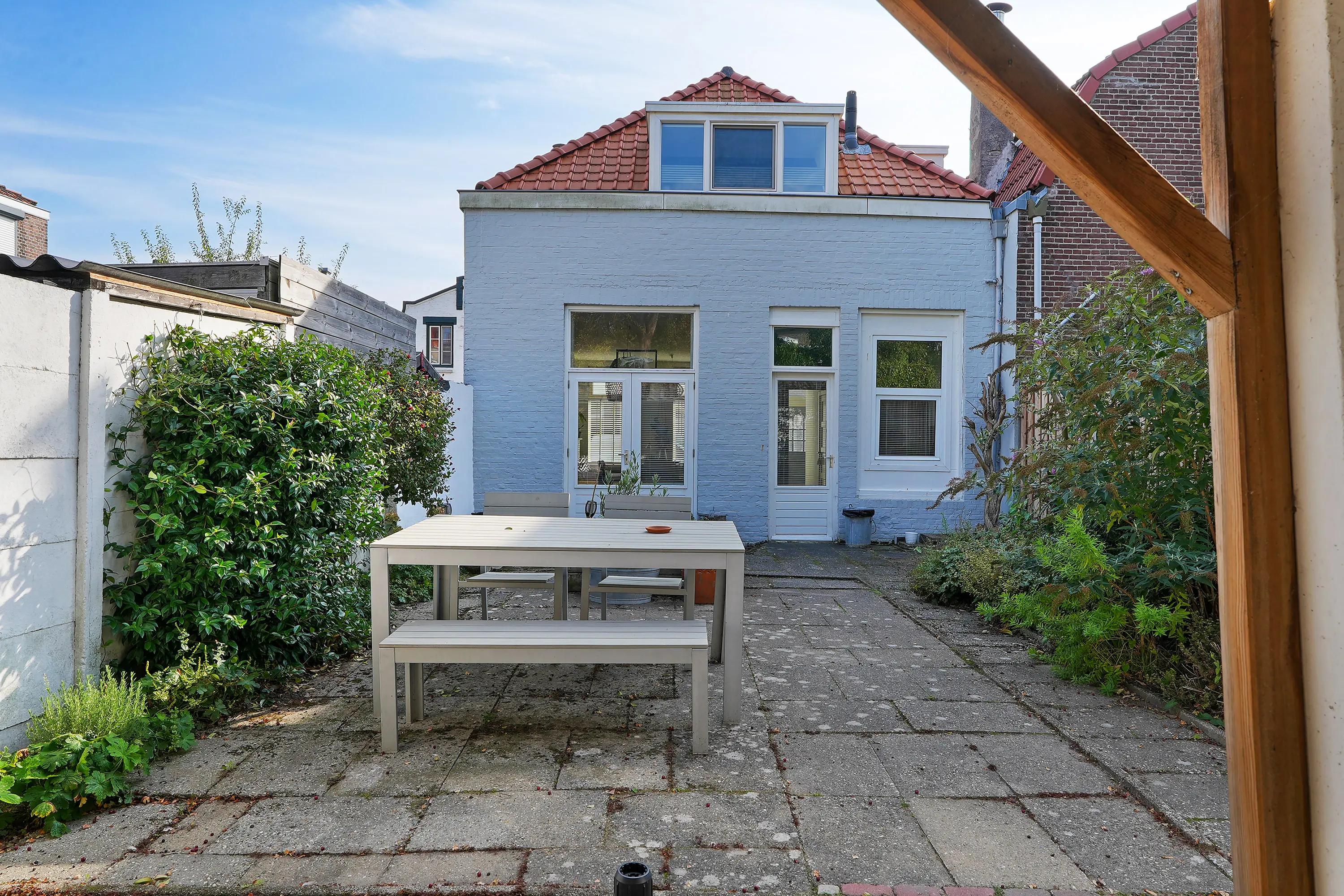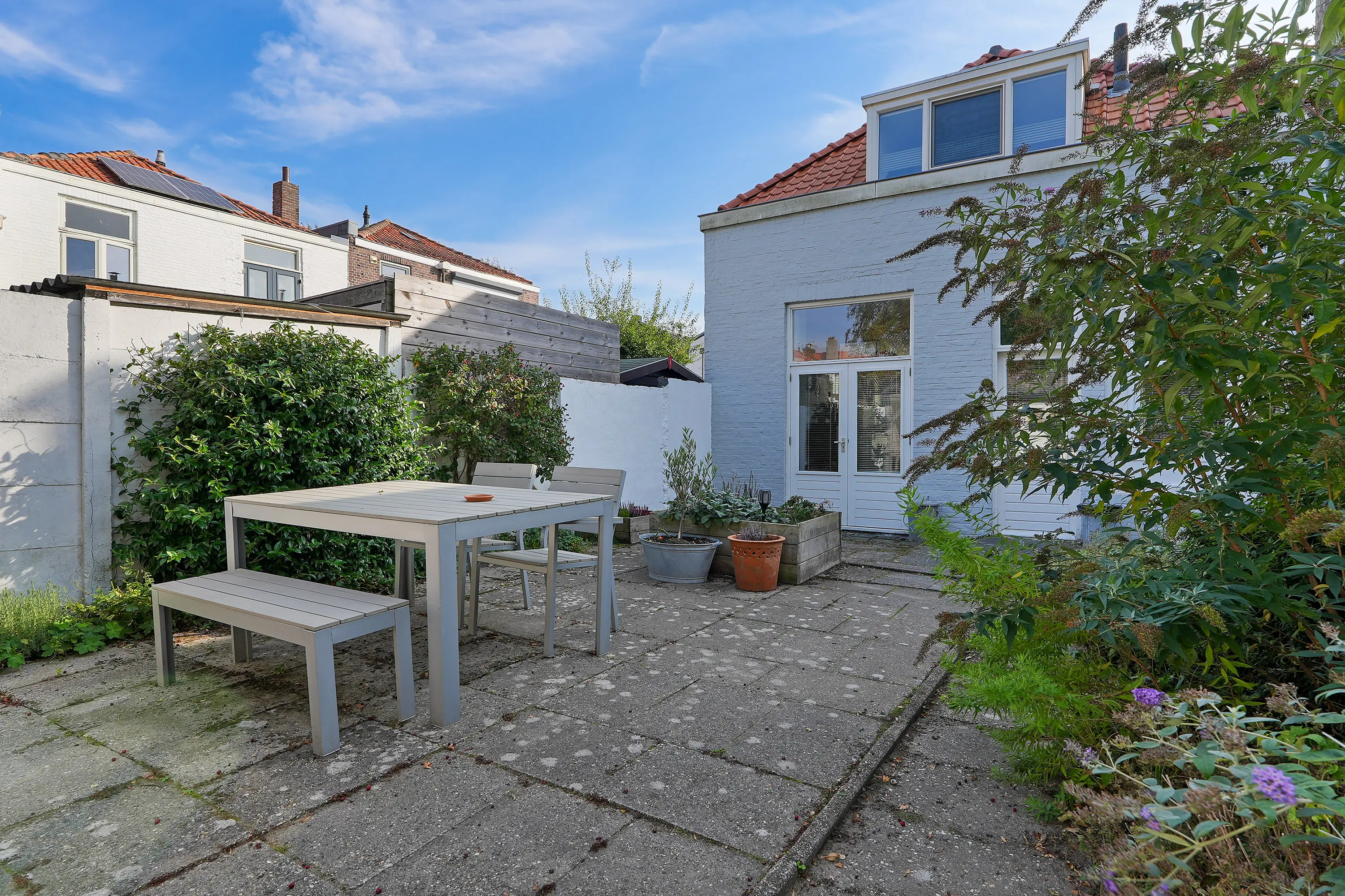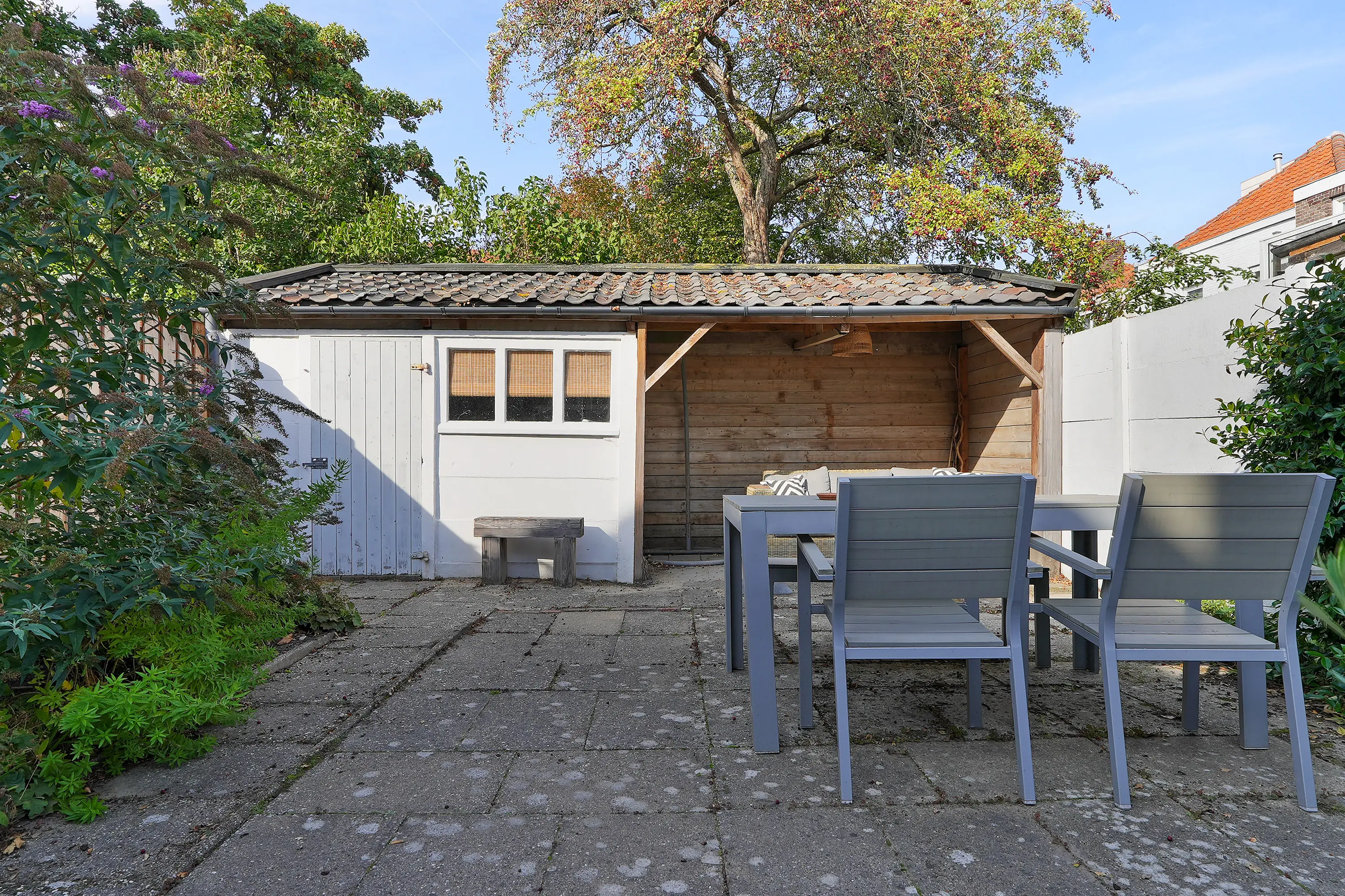 De verzorgde achtertuin is voorzien van diverse terrassen, betonnen berging met elektra en verlichting en gezellige overkapping.