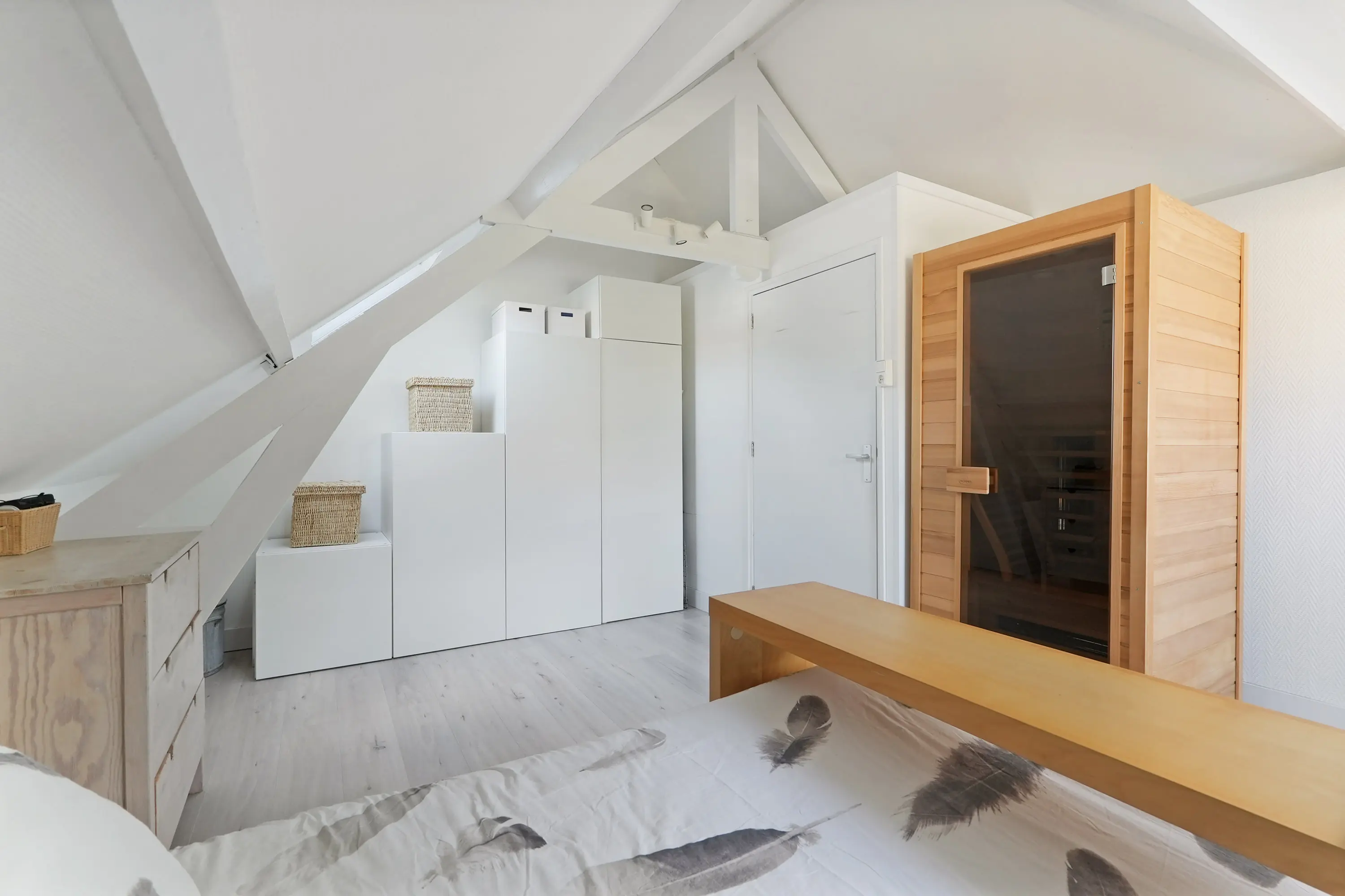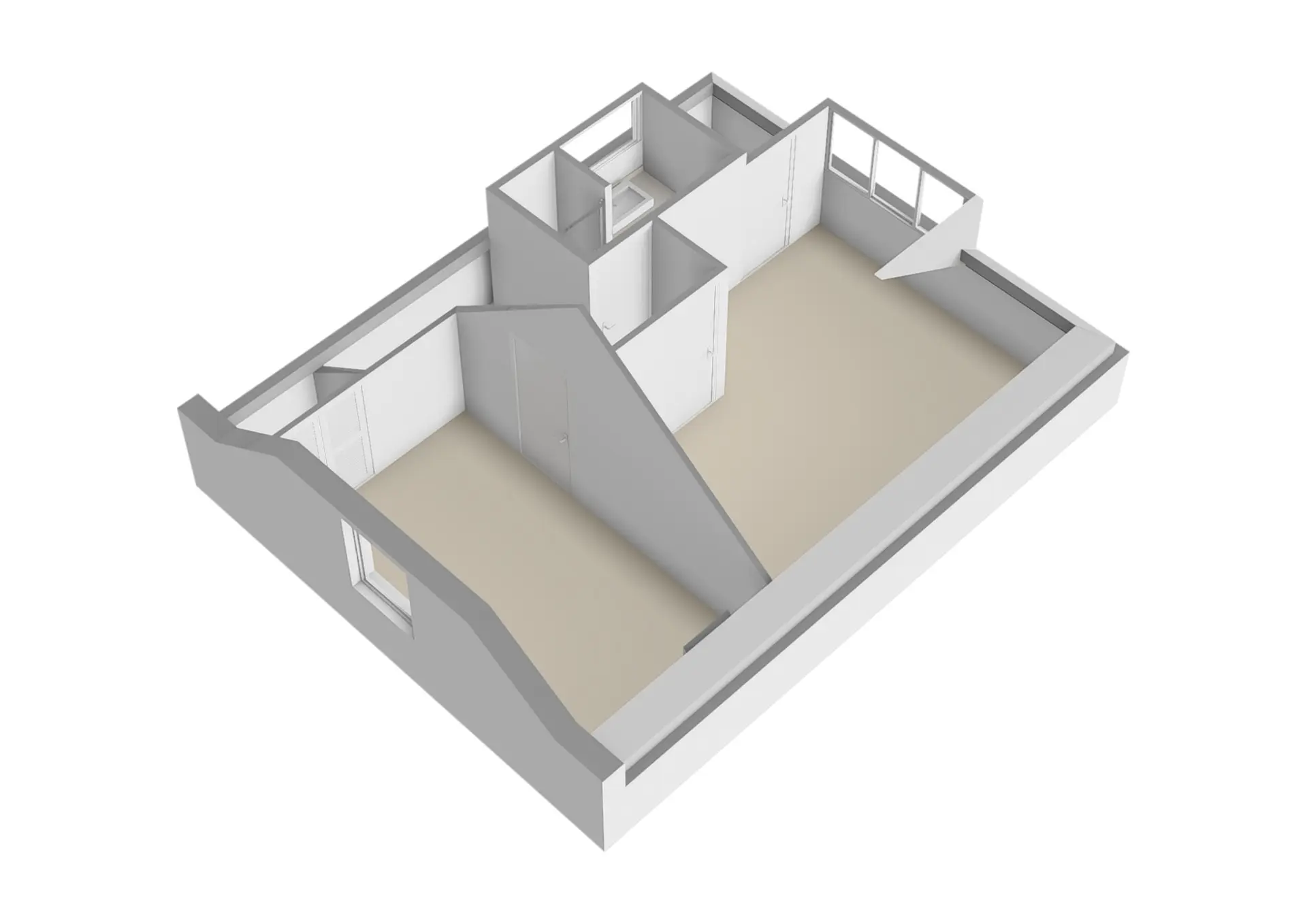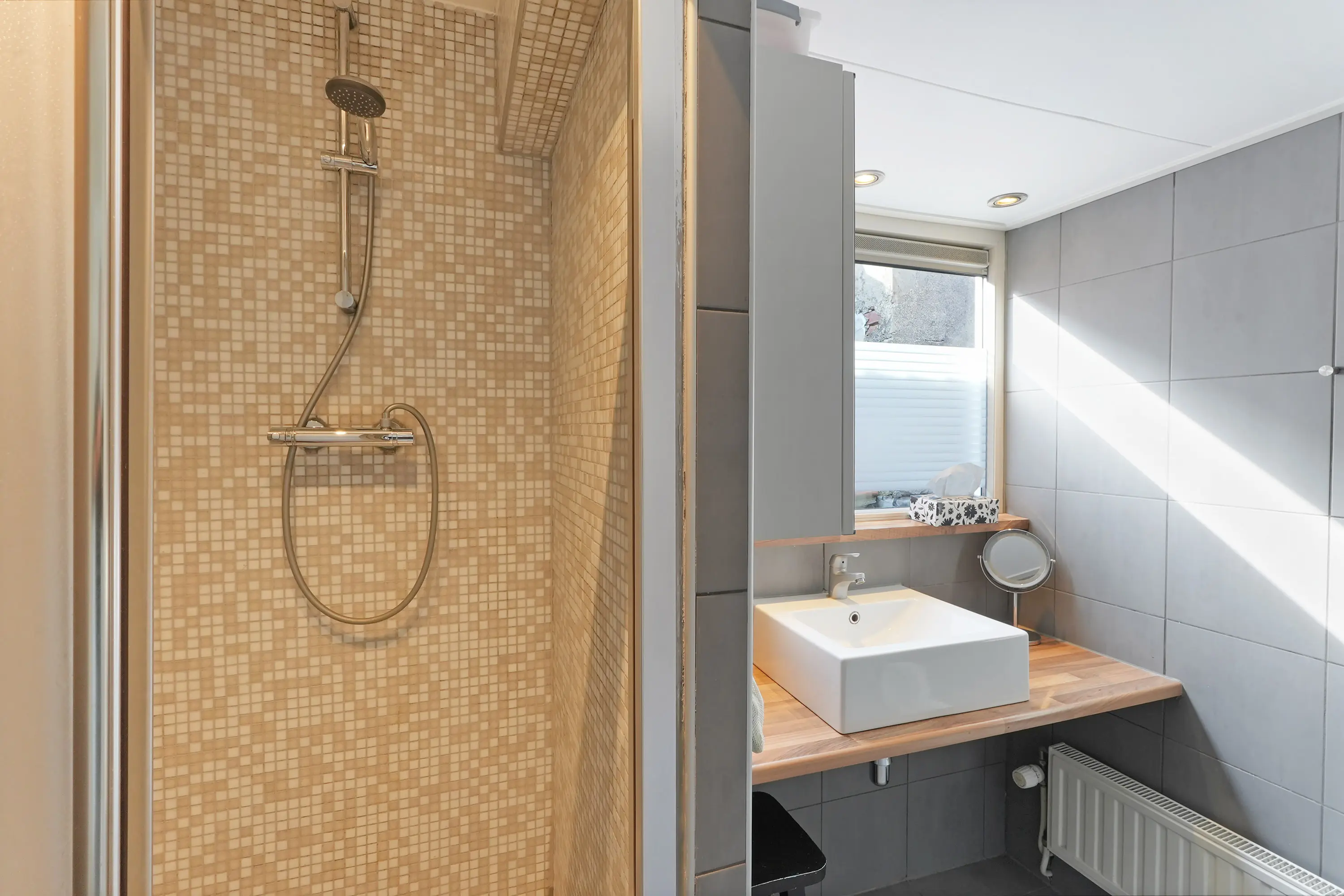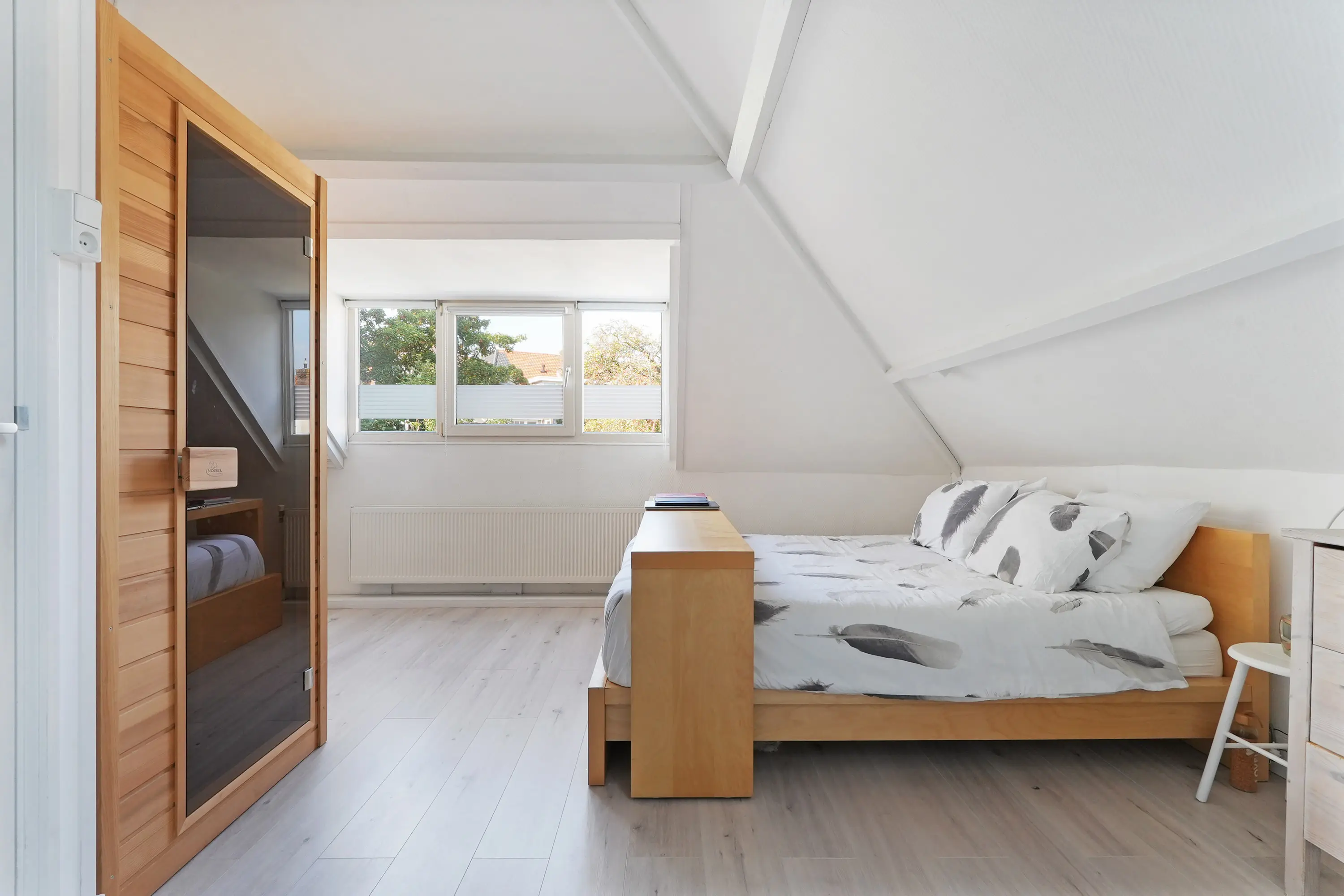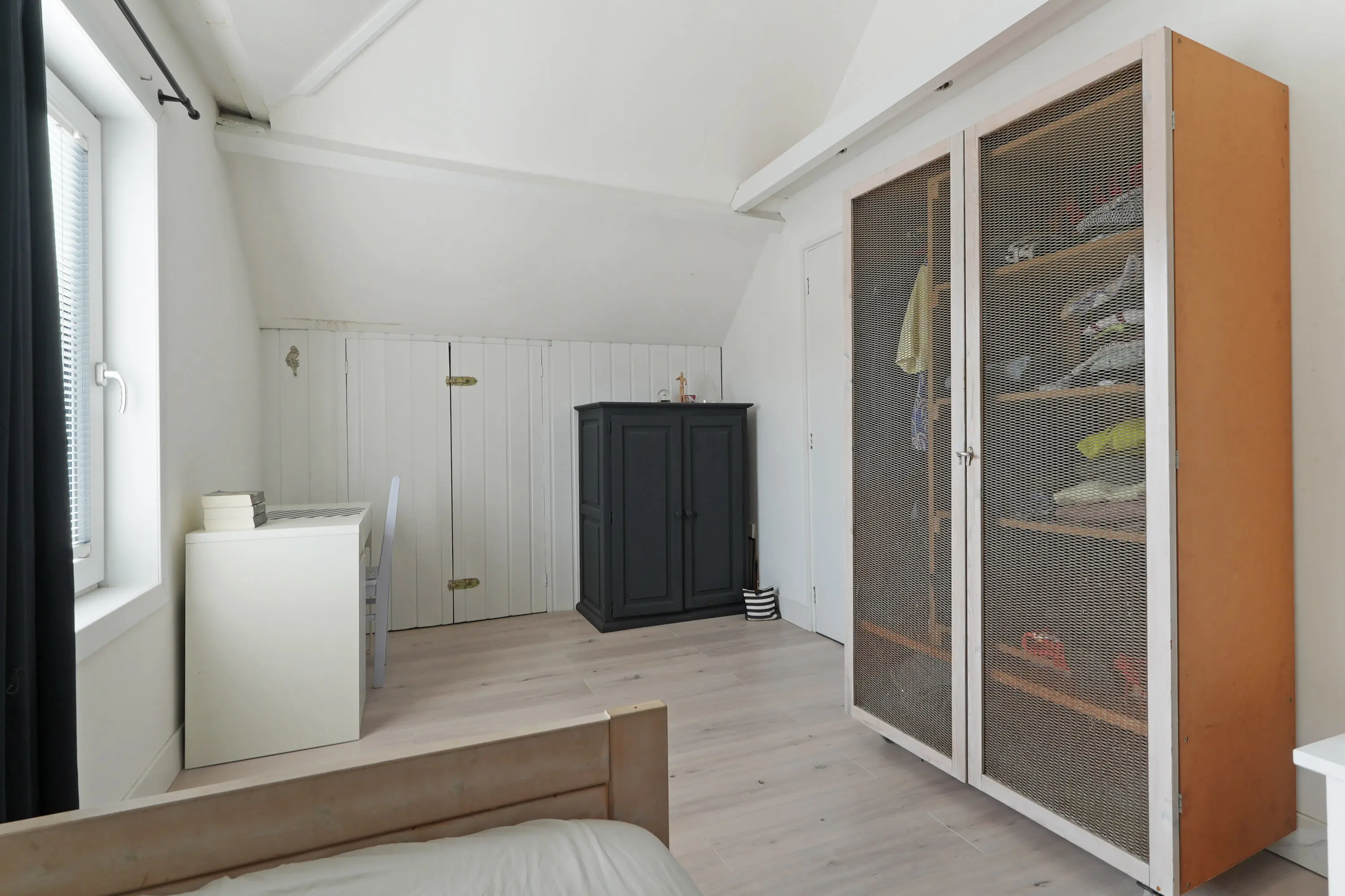 Overloop, twee mooie slaapkamers waarvan één met bergruimte en één met dakraam, dakkapel en c.v.-kast en tenslotte een nette volledig betegelde badkamer voorzien van douche en wastafel.