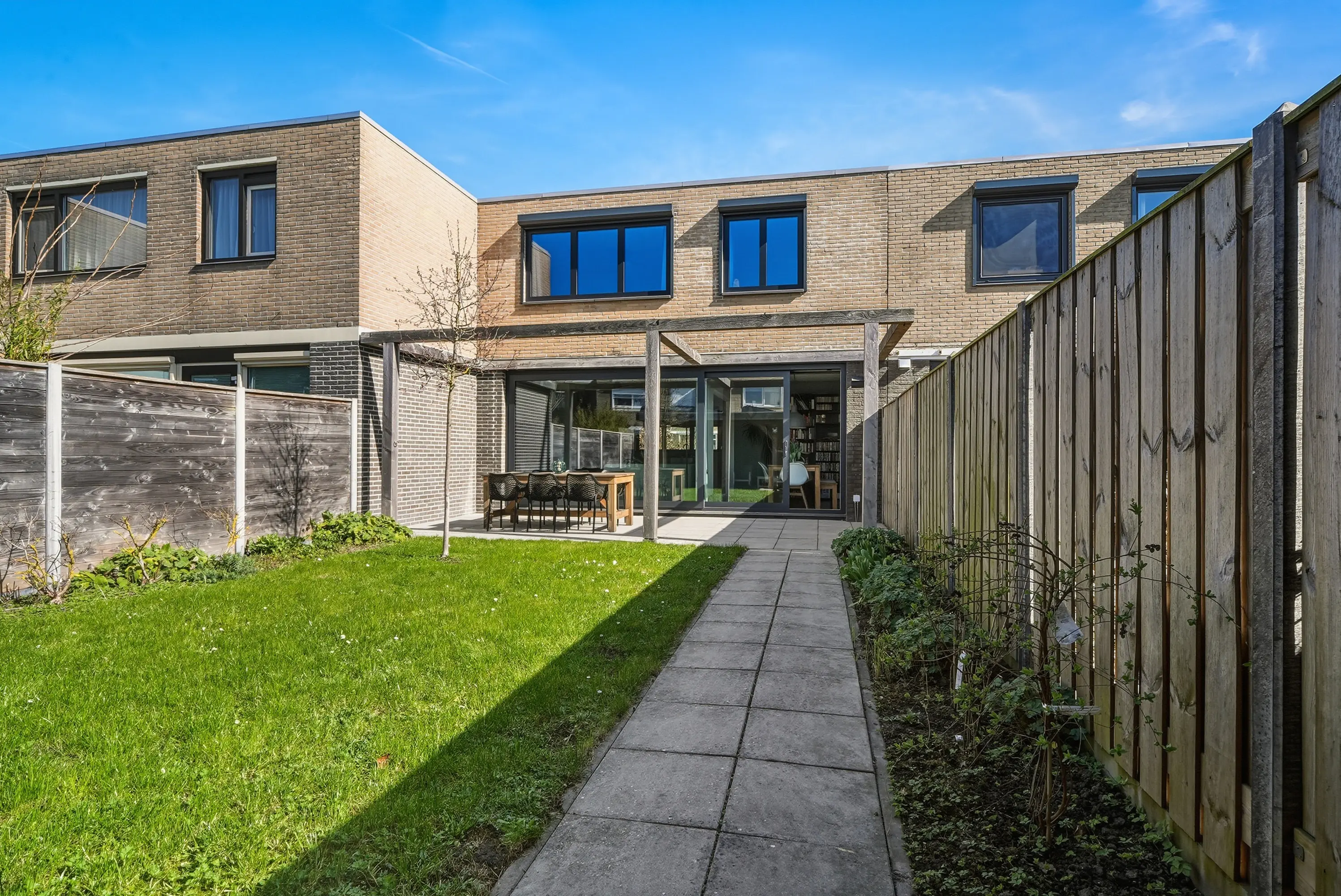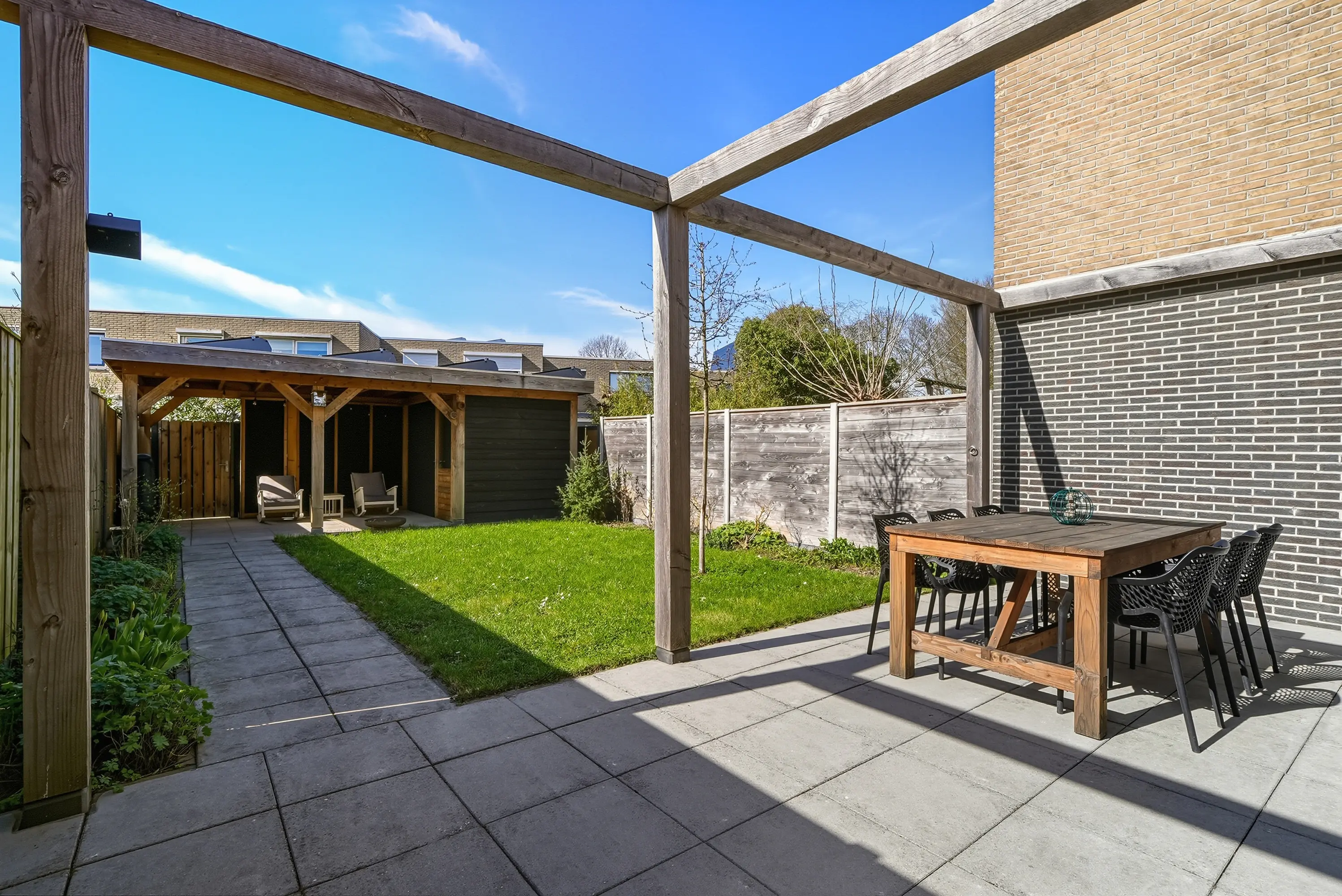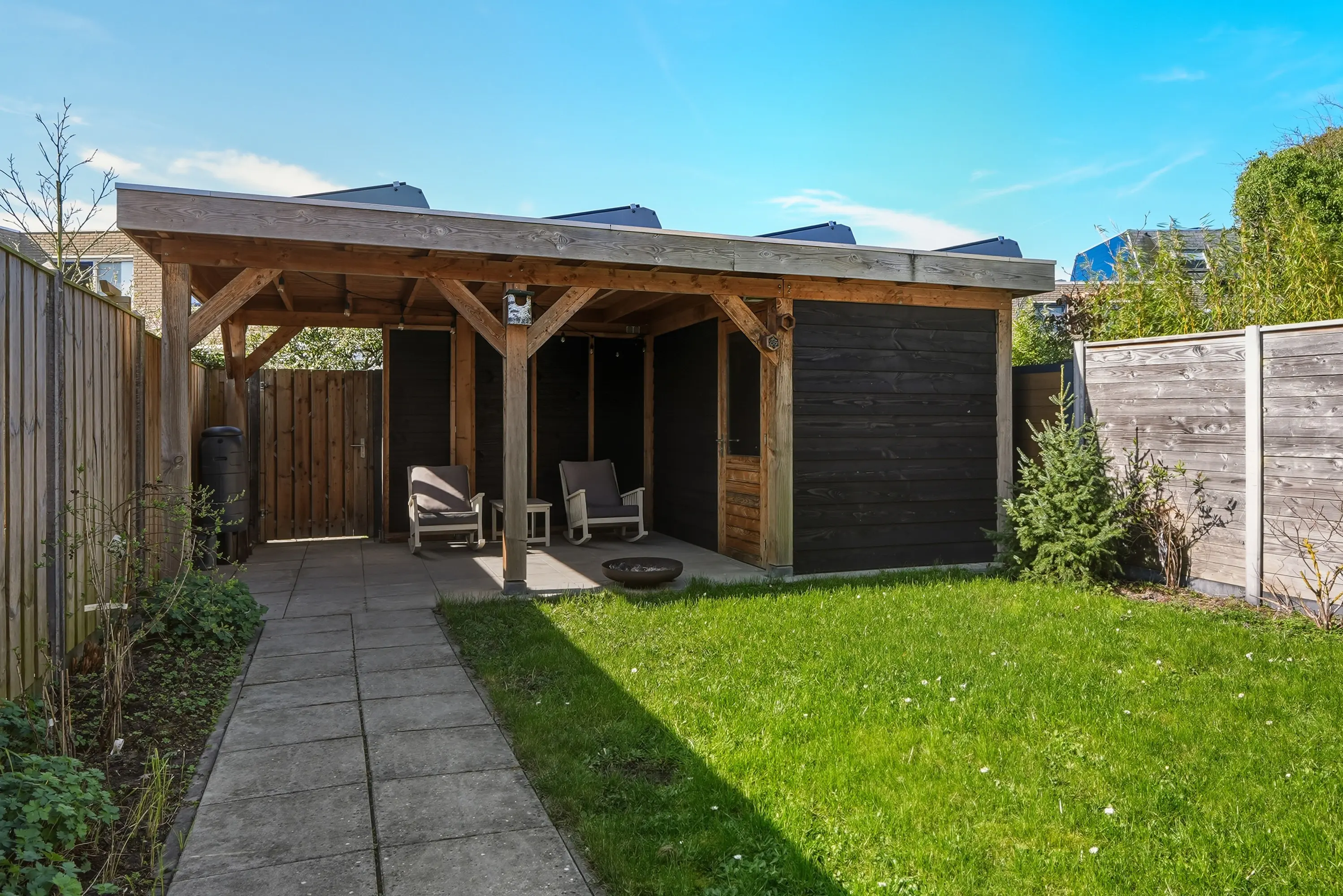 Veel aandacht is besteed de achtertuin! De achtertuin is bijzonder, heerlijk zonnig en keurig aangelegd met een ruim terras, groot gazon en een geweldig mooie Douglas overkapping. Tegen de achtergevel bevindt zich een grote pergola waar u indien gewenst op eenvoudige wijze een schaduwdoek kunt ophangen. Naast de overkapping treft u de ruime schuur met elektra. Verder is de tuin uiteraard voorzien van een vrije achterom.