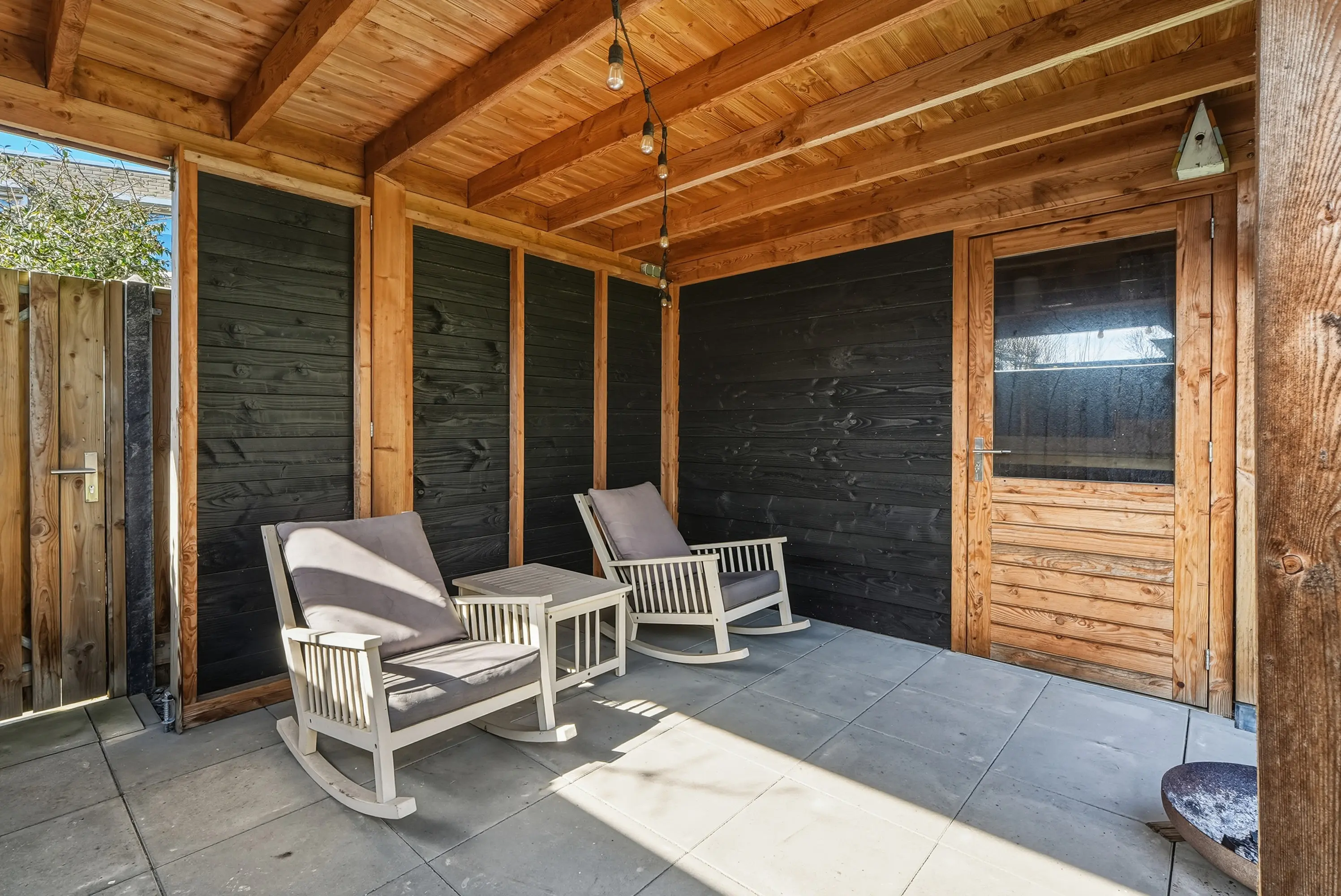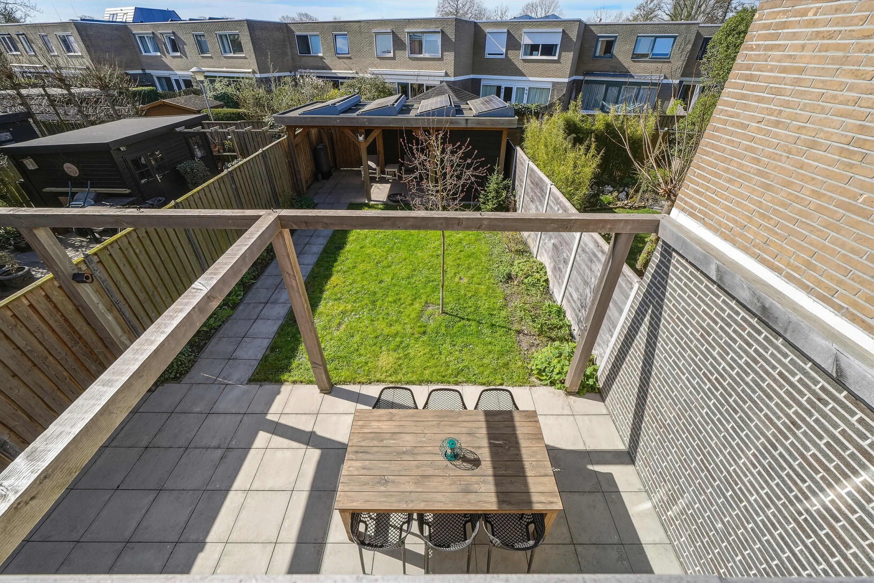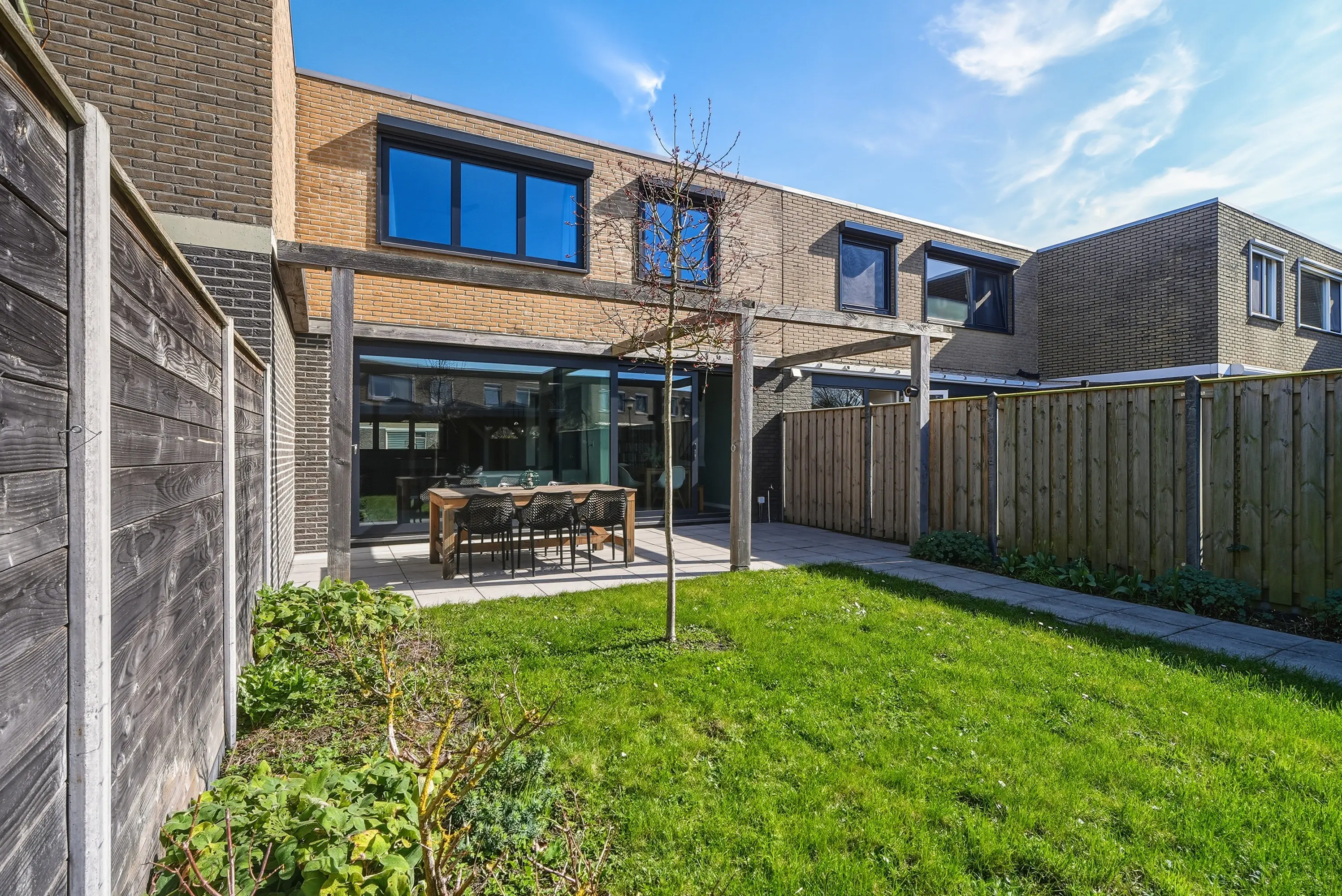 Veel aandacht is besteed de achtertuin! De achtertuin is bijzonder, heerlijk zonnig en keurig aangelegd met een ruim terras, groot gazon en een geweldig mooie Douglas overkapping. Tegen de achtergevel bevindt zich een grote pergola waar u indien gewenst op eenvoudige wijze een schaduwdoek kunt ophangen. Naast de overkapping treft u de ruime schuur met elektra. Verder is de tuin uiteraard voorzien van een vrije achterom.