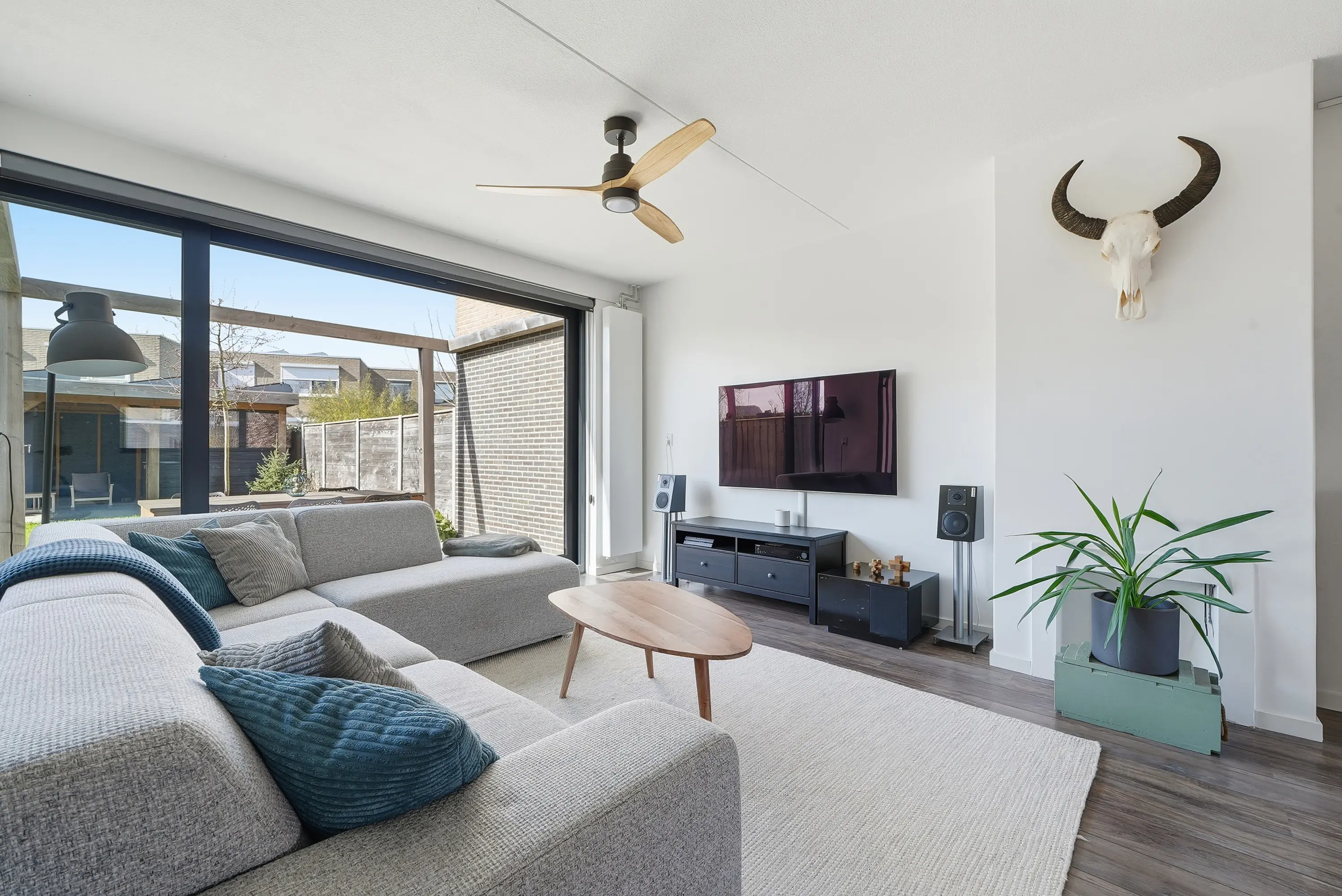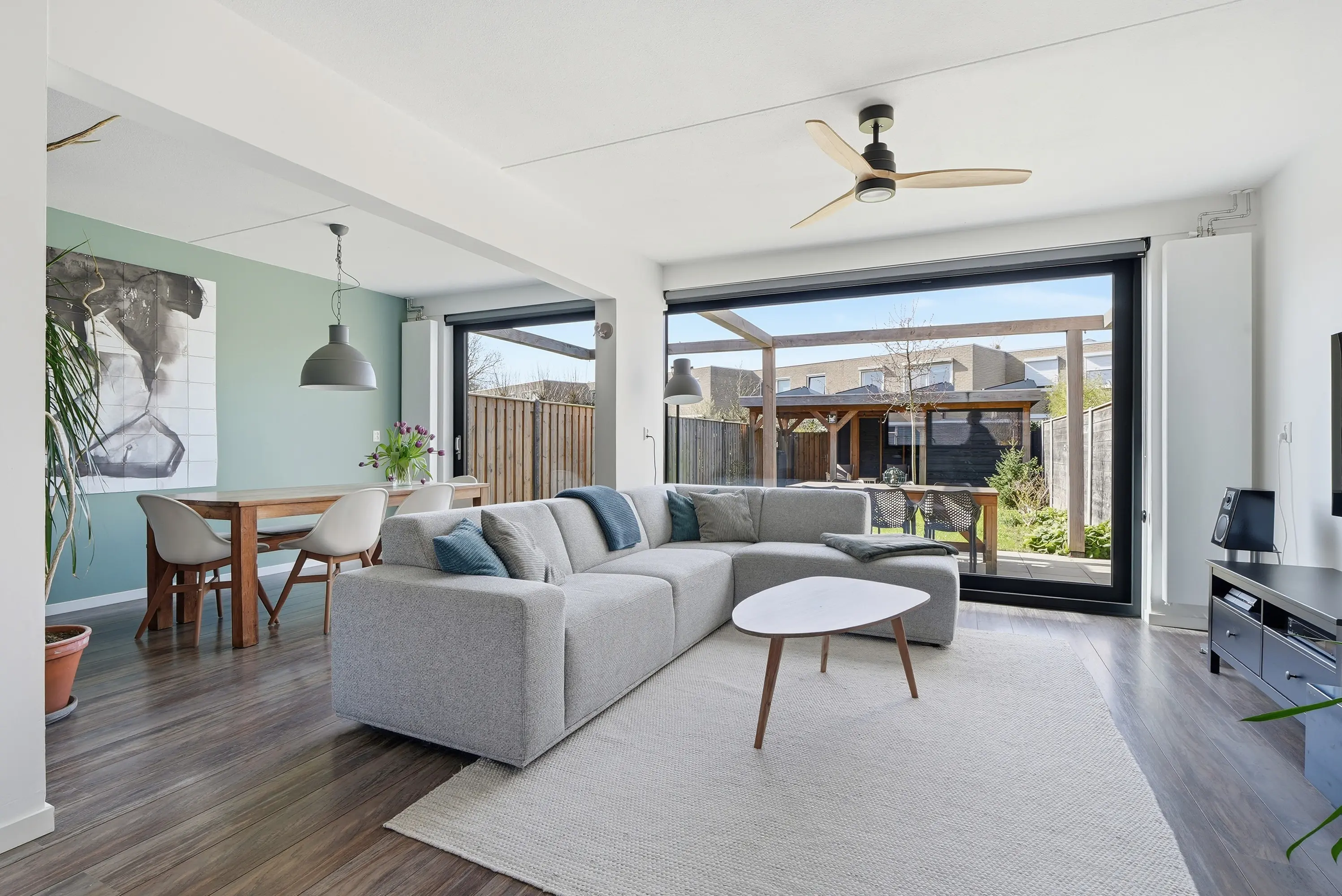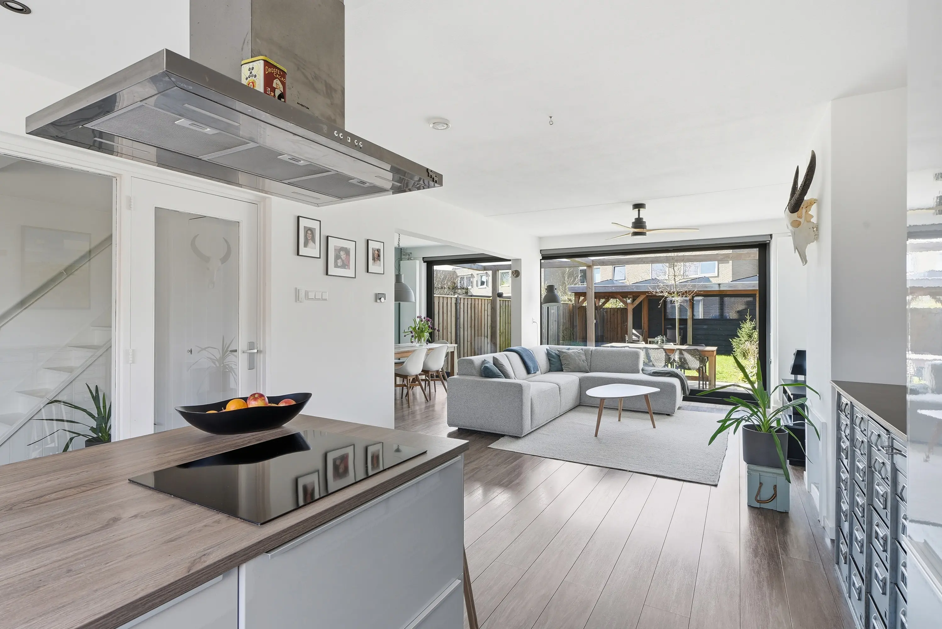 De hal geeft u toegang tot de vernieuwde meterkast, modern toilet en een handige trapkast, trap naar de 1e verdieping en doorgang naar de woonkamer. Bij binnenkomst in de woonkamer ervaart u direct de ruimtelijke en lichte woonbeleving met een bijzonder grote aluminium gevel pui aan de tuinzijde. Deze schuifpui strekt zich over de volledige breedte van de woning, echt waanzinnig! De zit- en eethoek zijn gericht op de tuin, waardoor binnen en buiten mooi in elkaar overlopen. De prachtige keuken, uitgevoerd met kook- spoeleiland bevindt zich aan de voorzijde en sluit naadloos aan op het geheel waardoor de ruime één voelt. Een heerlijke plek om te koken en samen te komen. Vanuit de woonkamer stap je via de schuifpui zo de zonnige achtertuin in.