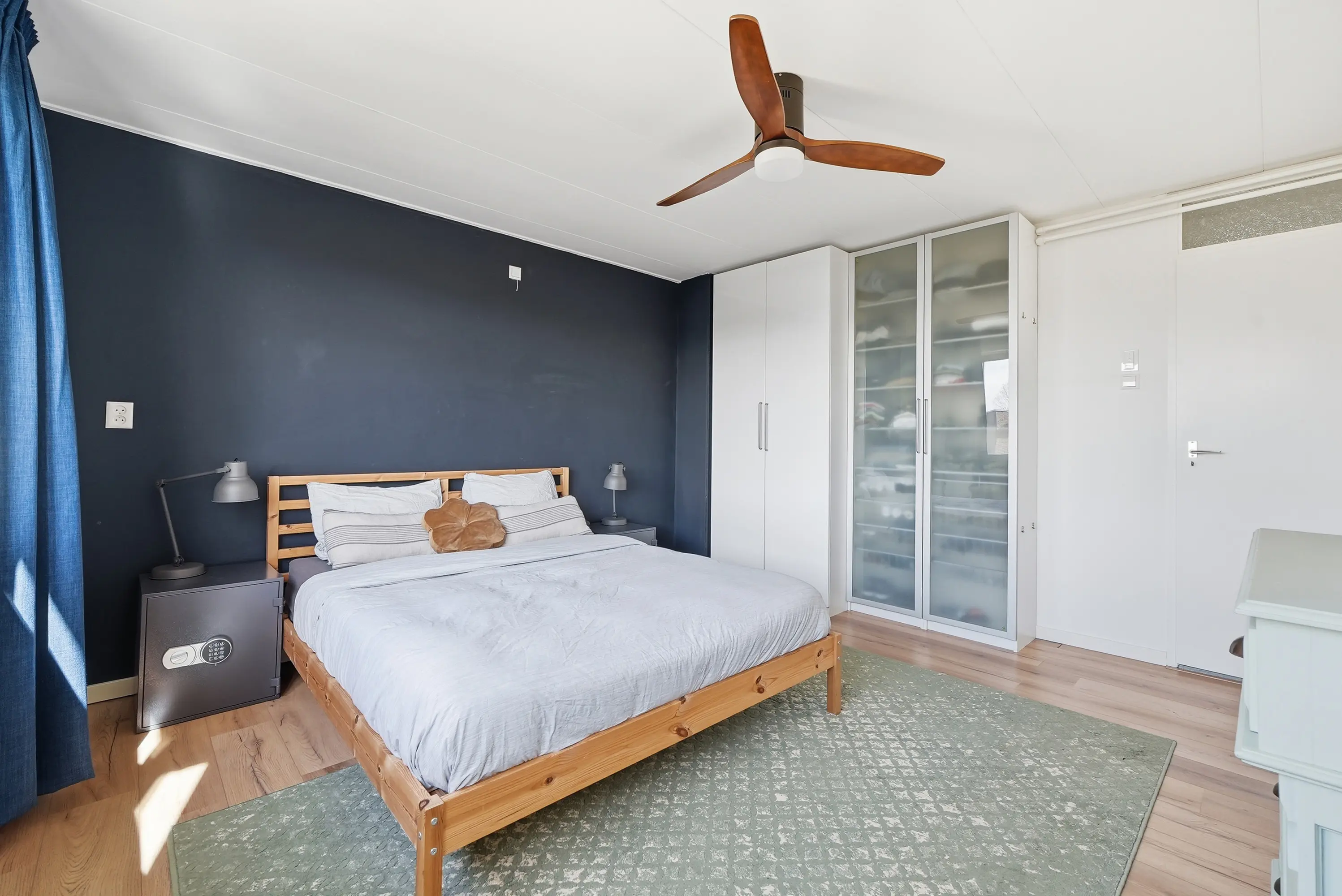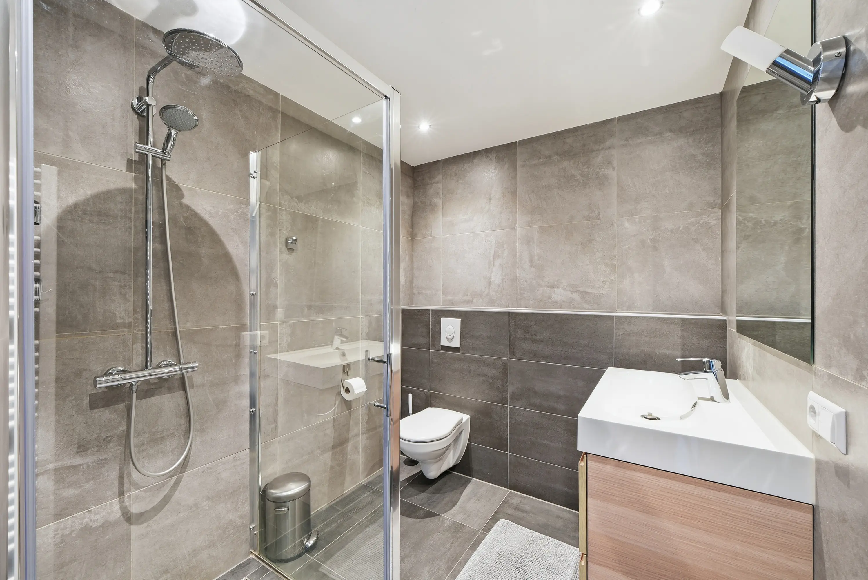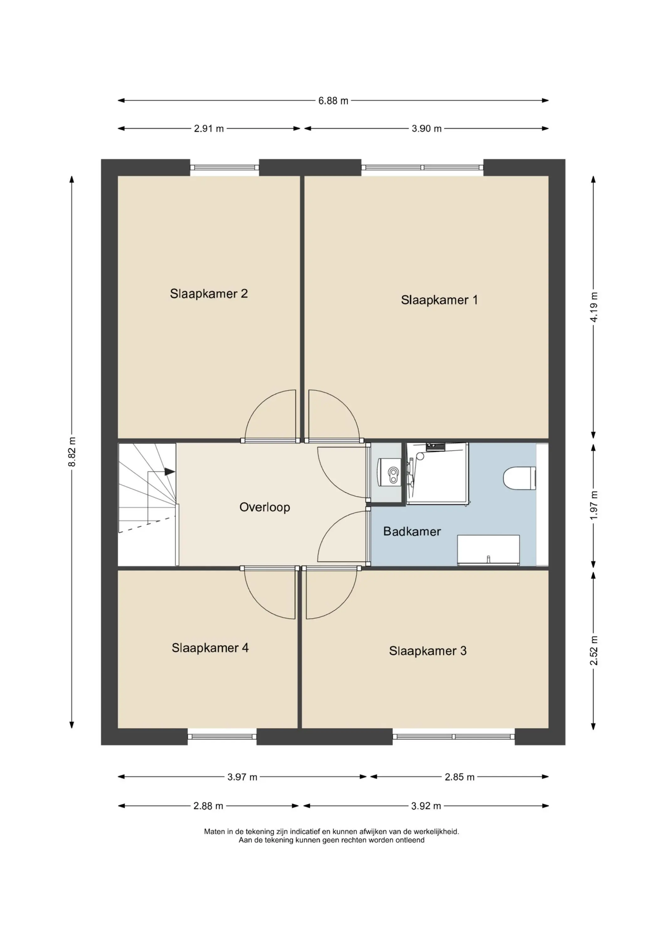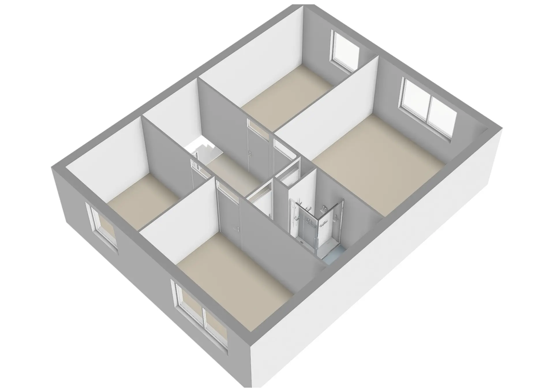 De overloop geeft toegang tot vier ruime slaapkamers, waaronder een royale ouderslaapkamer aan de tuinzijde. Alle kamers zijn uitgerust met elektrische rolluiken aan de tuinzijde. De badkamer is modern ingericht met een ruime inloopdouche, afgesloten met glazenwanden, een tweede toilet en een keurig wastafelmeubel. Ook boven is de woning strak en verzorgd afgewerkt.