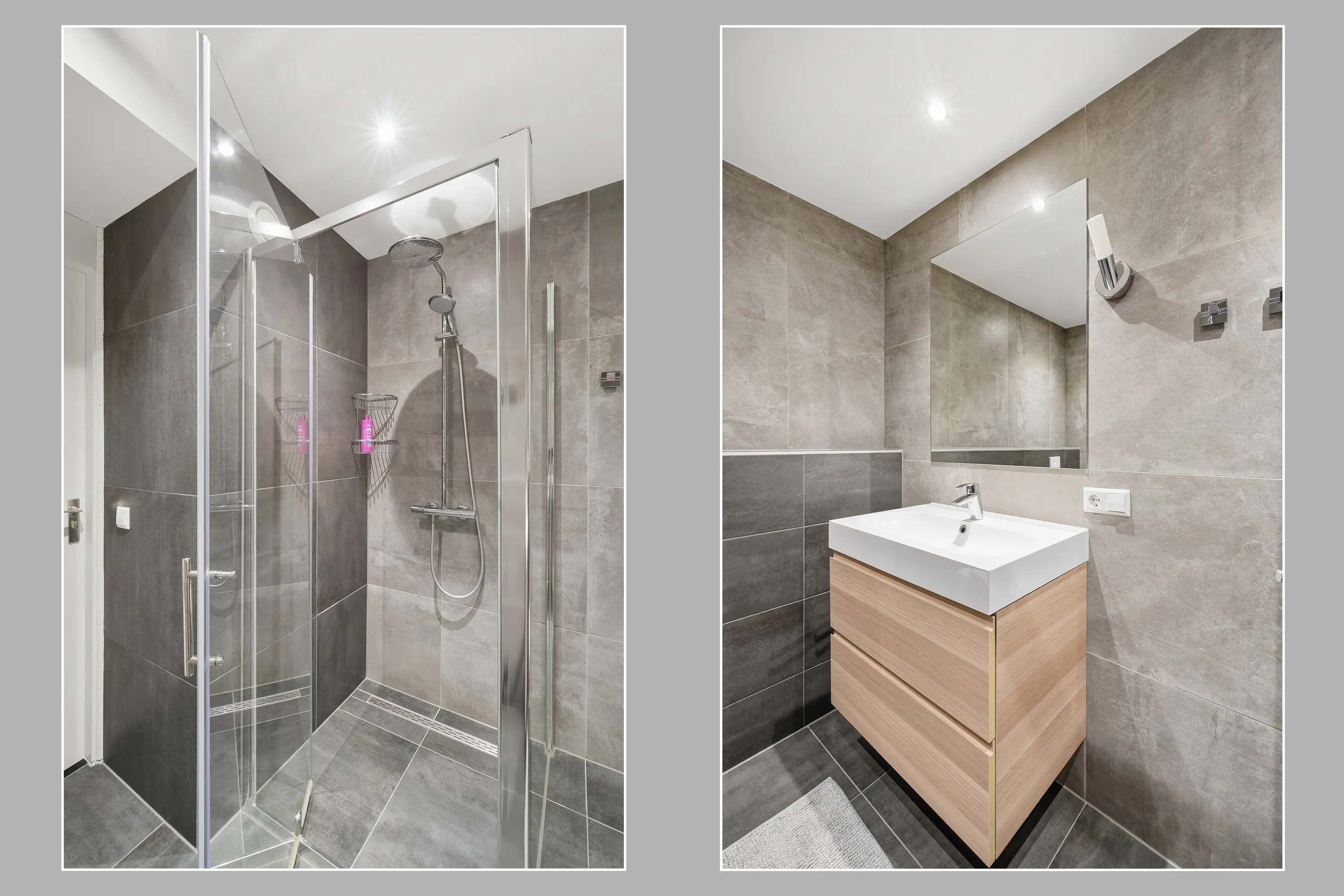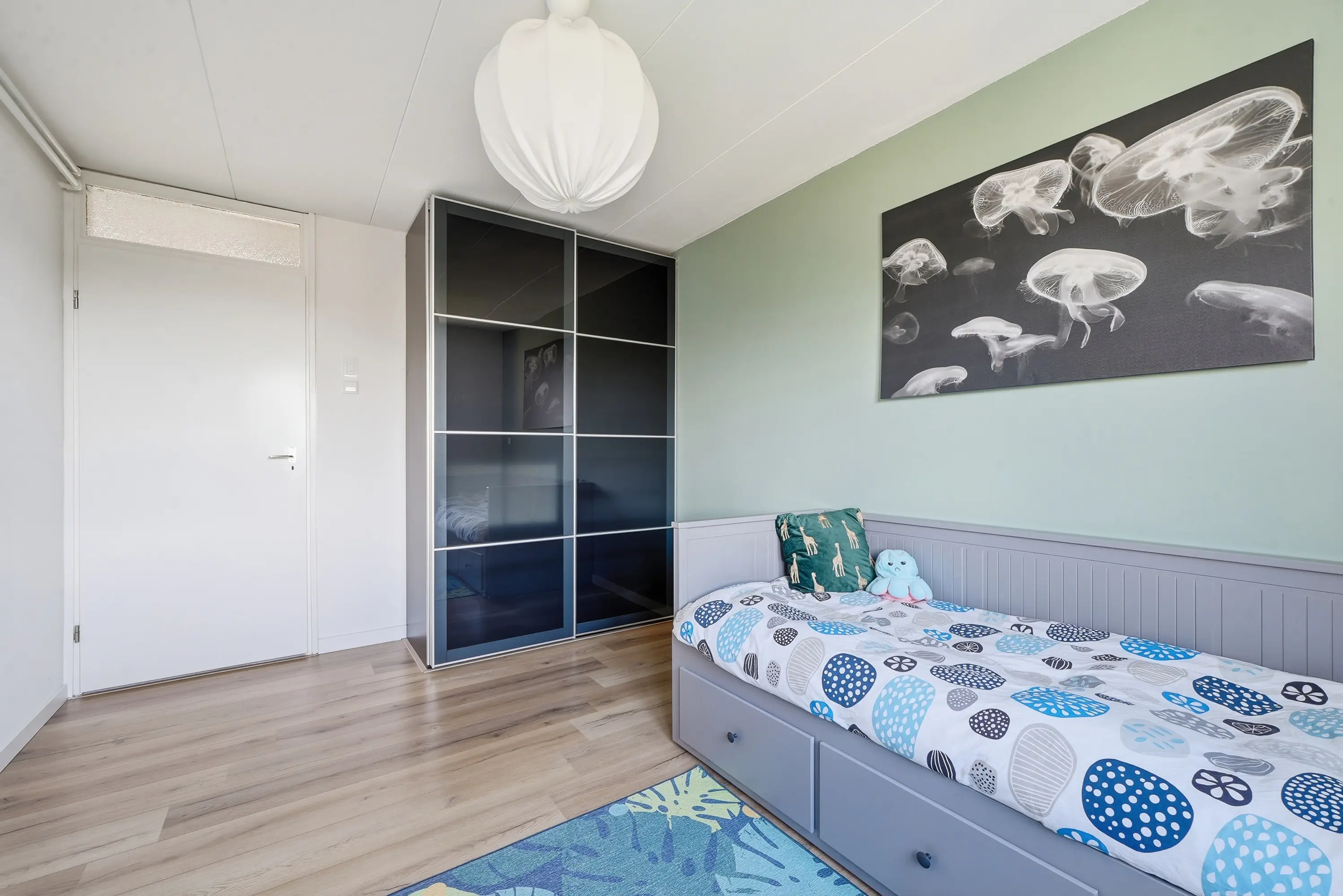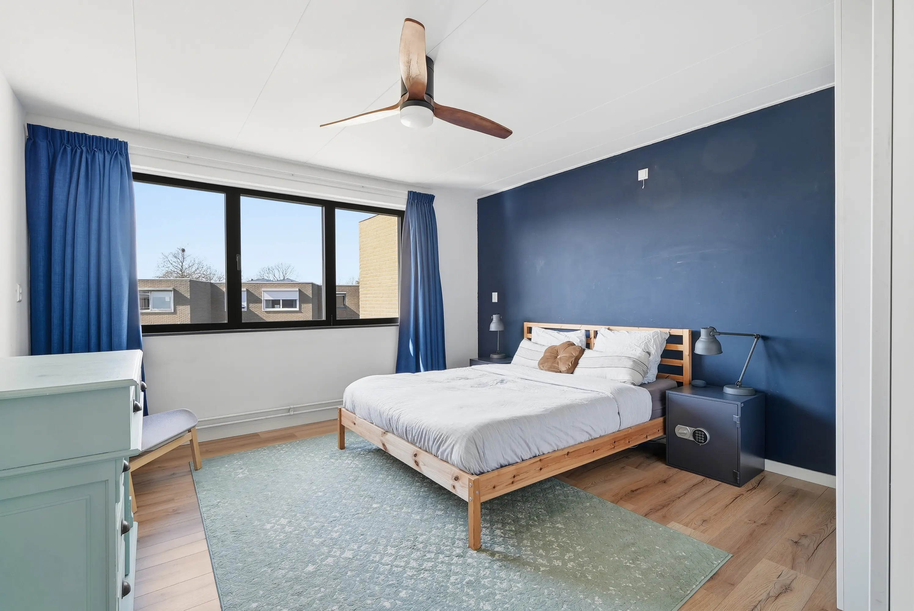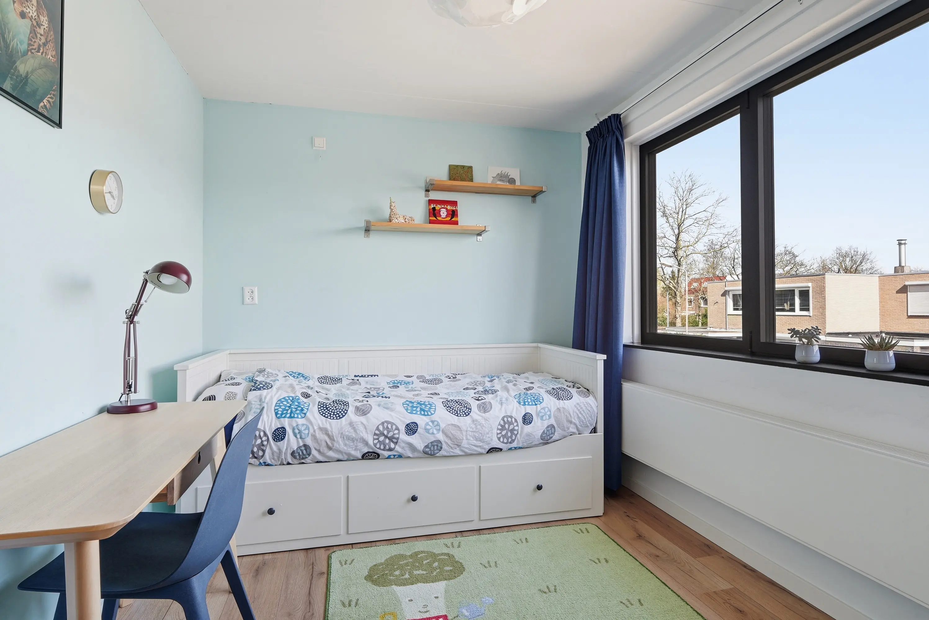 De overloop geeft toegang tot vier ruime slaapkamers, waaronder een royale ouderslaapkamer aan de tuinzijde. Alle kamers zijn uitgerust met elektrische rolluiken aan de tuinzijde. De badkamer is modern ingericht met een ruime inloopdouche, afgesloten met glazenwanden, een tweede toilet en een keurig wastafelmeubel. Ook boven is de woning strak en verzorgd afgewerkt.