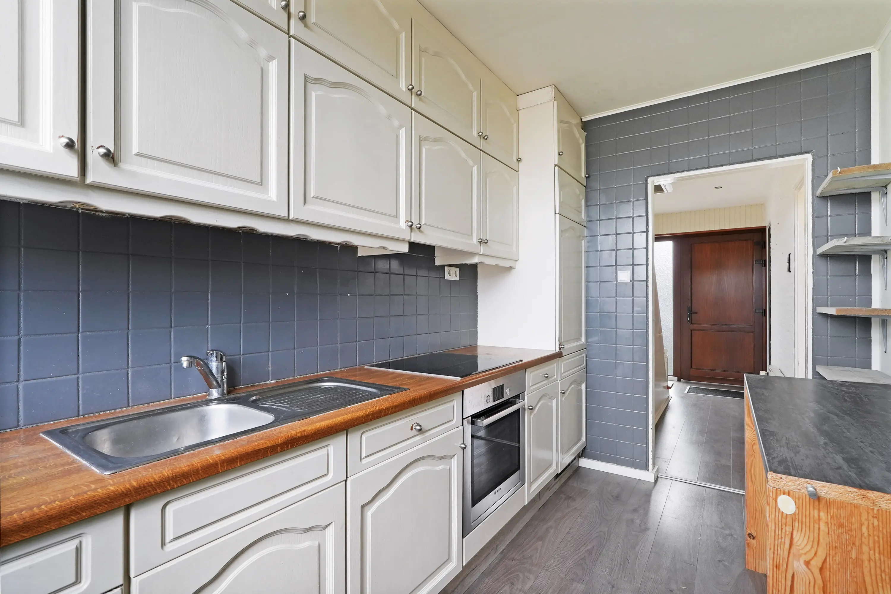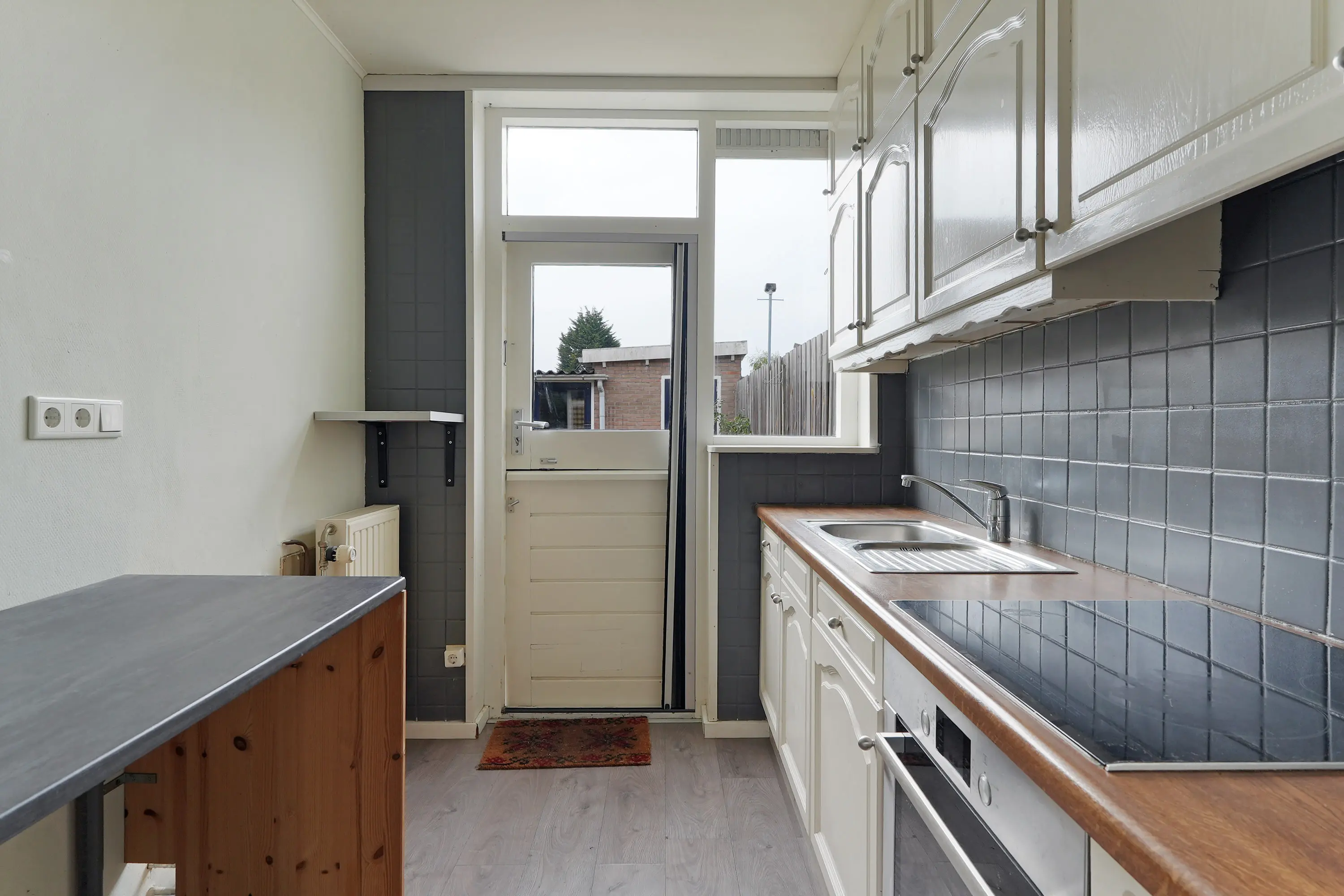 De keuken is gelegen aan de achterzijde en eenvoudig van opzet, maar voorzien van de nodige inbouwapparatuur zoals een oven, inductiekookplaat, afzuigkap, koelkast, vriezer en een close-in-boiler. Vanuit de keuken loopt u rechtstreeks de zonnige achtertuin in.