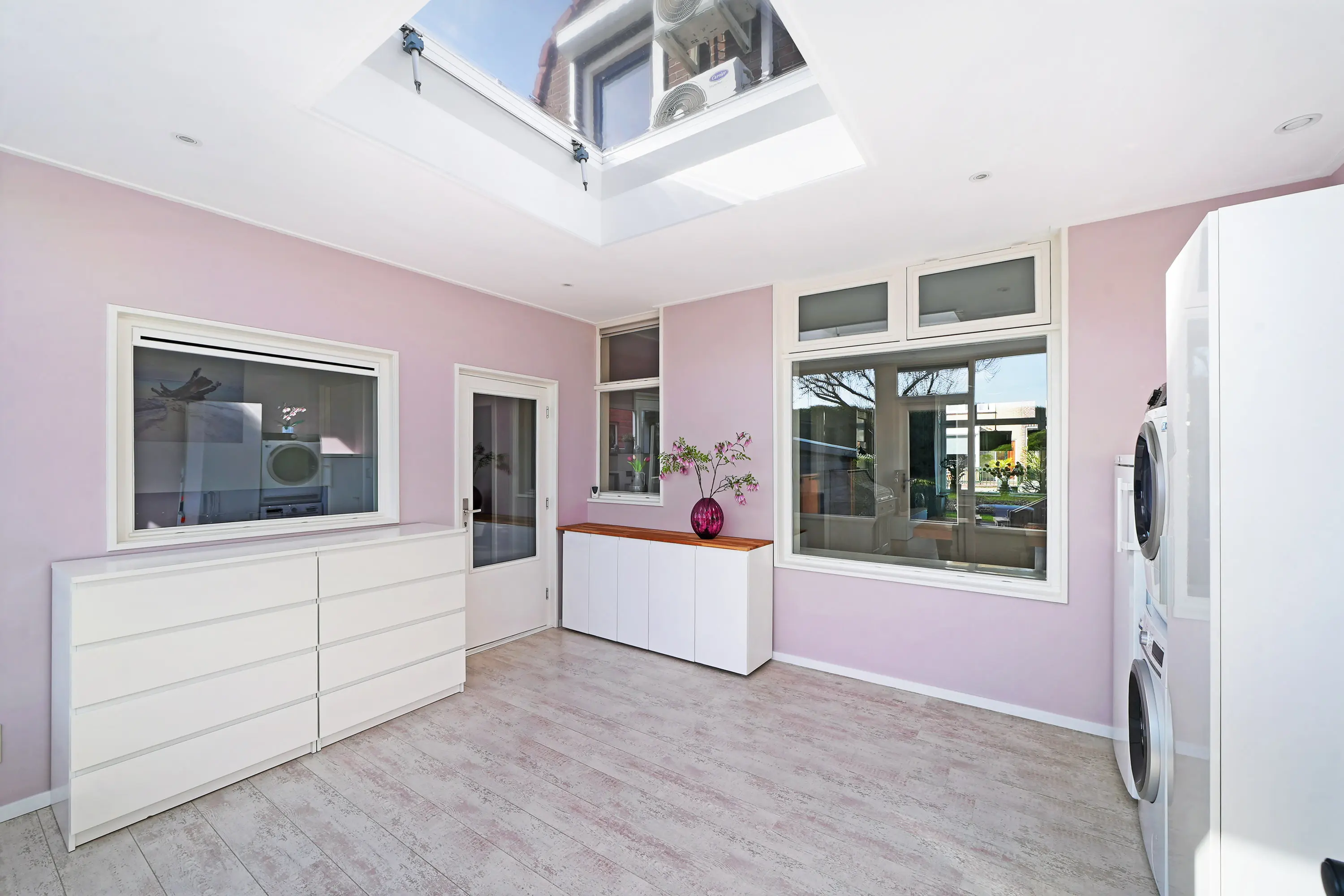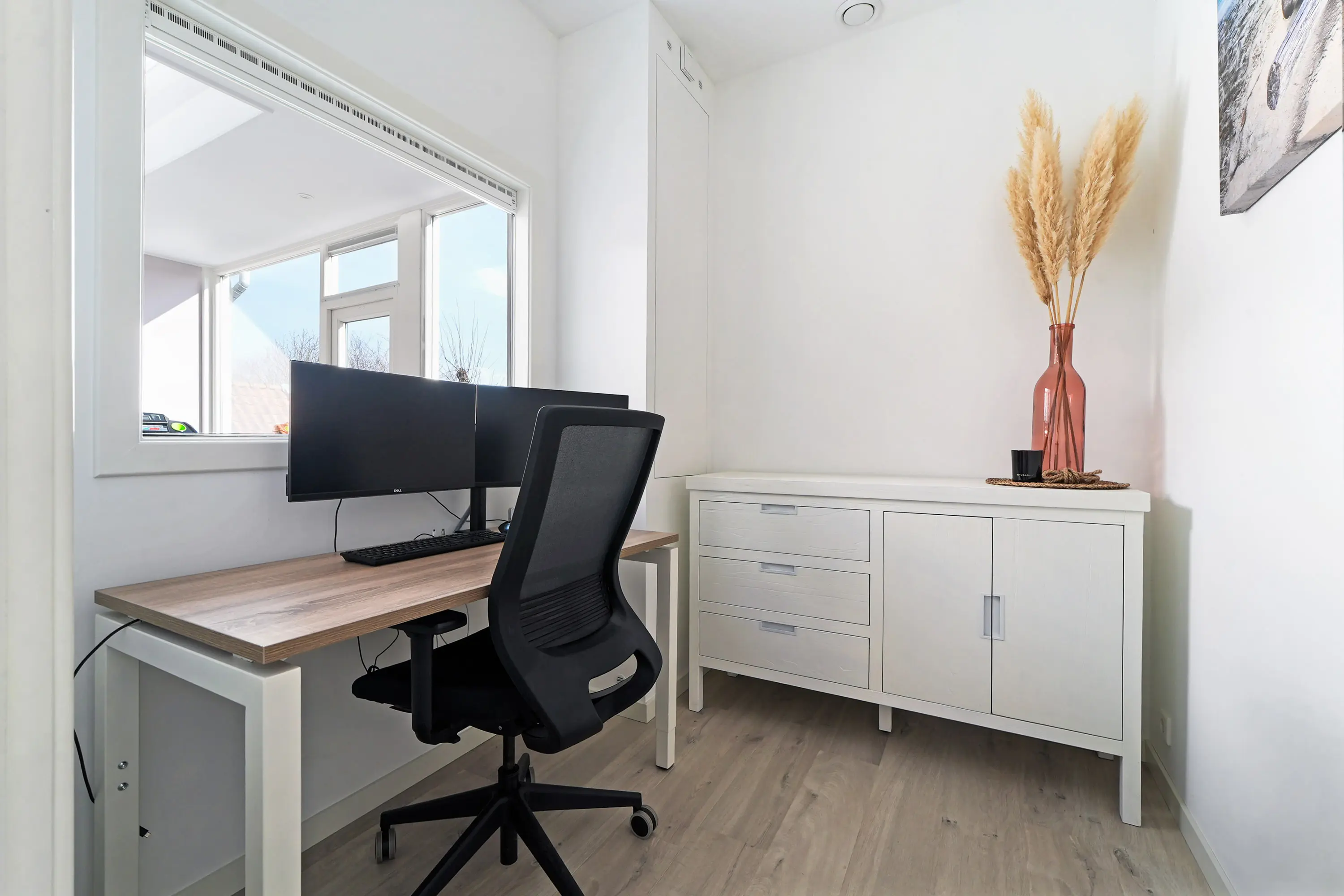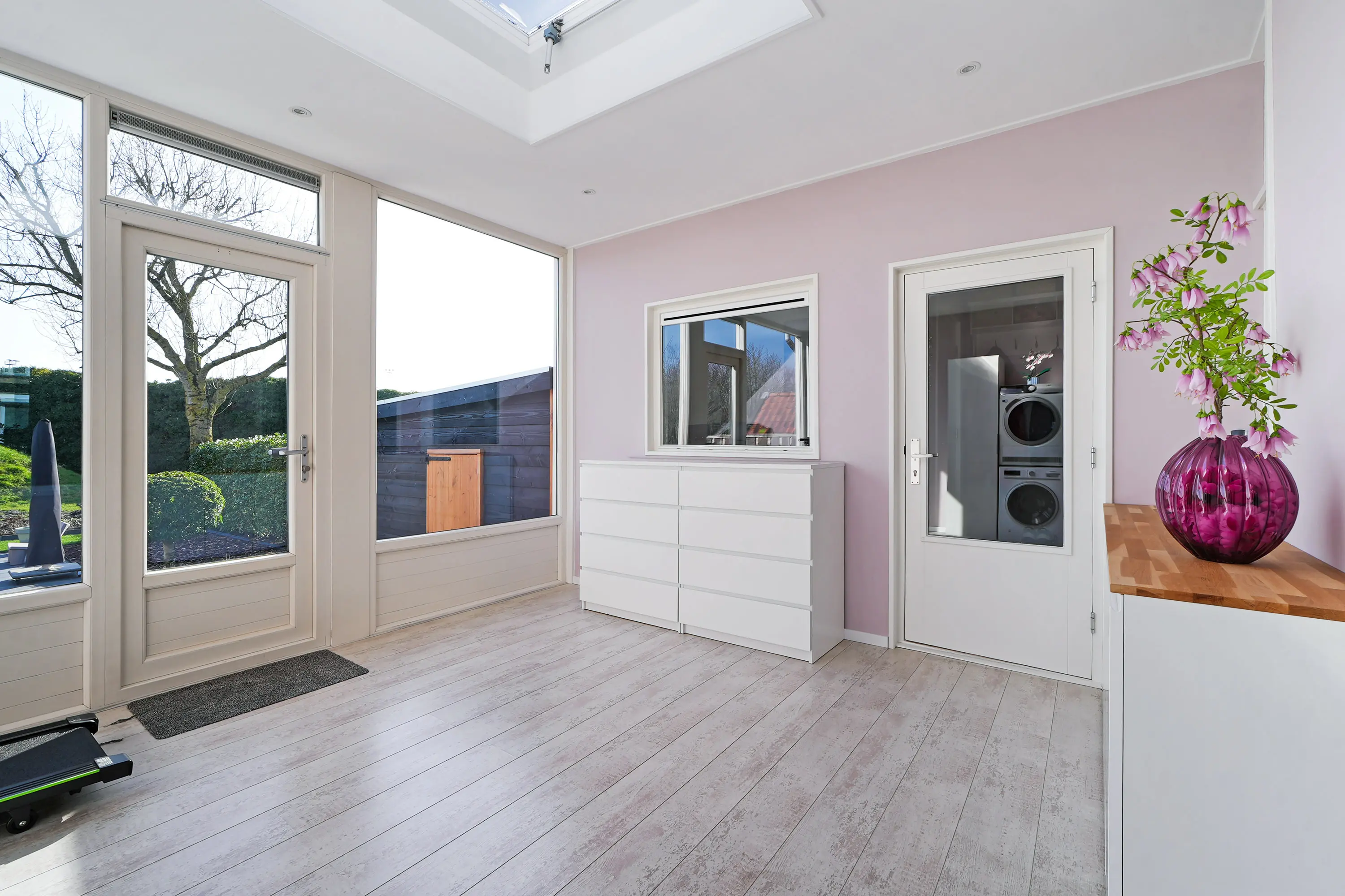 Vanuit de keuken komt u in het tussenportaal, waar u toegang heeft tot de werkkamer op de begane grond (gerealiseerd in 2020), ideaal voor thuiswerken of een hobbyruimte. Aansluitend bevindt zich de prachtige tuinkamer/serre (2010), een heerlijke lichte ruimte met mooi zicht op de tuin en directe toegang naar buiten.